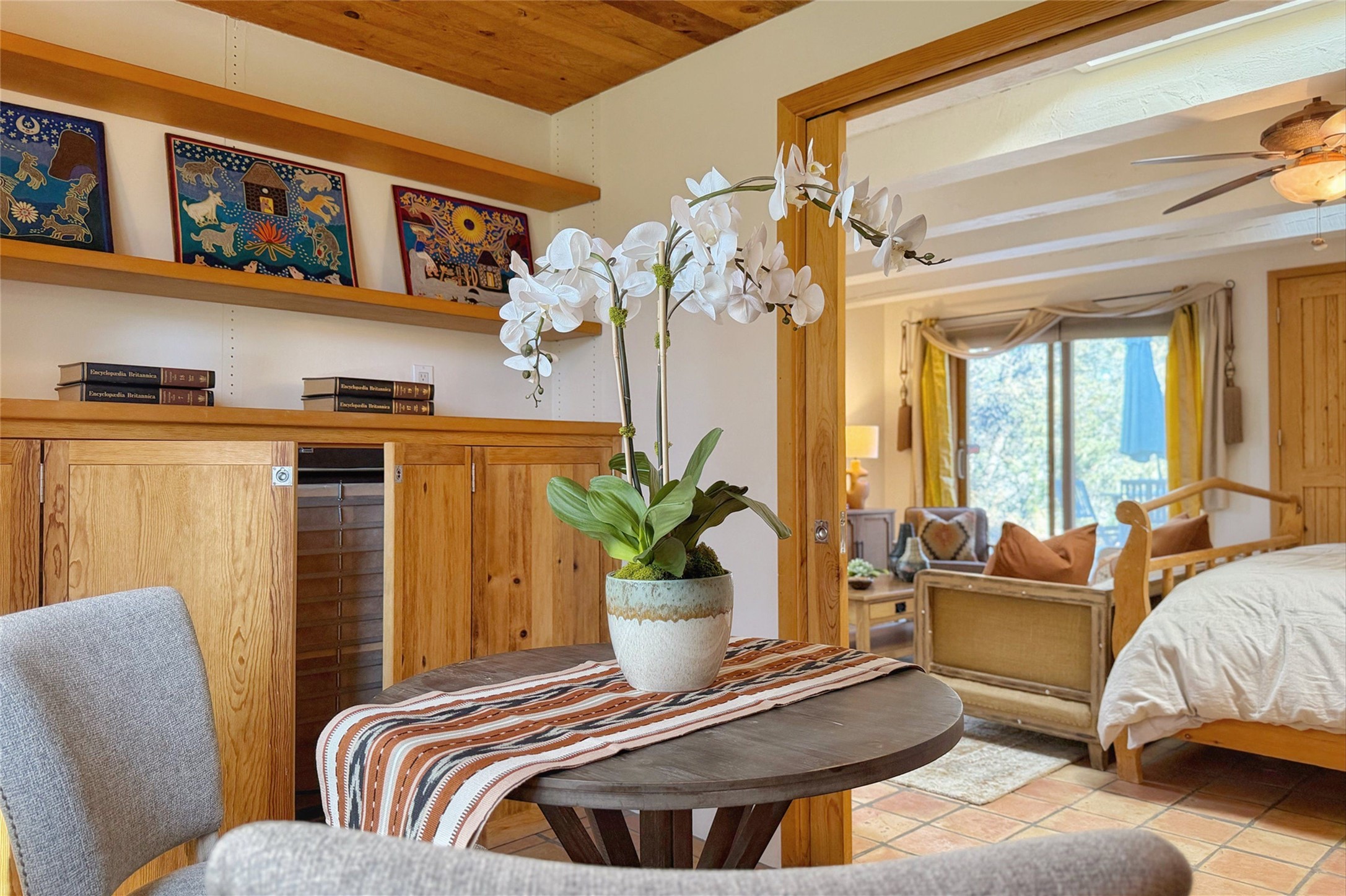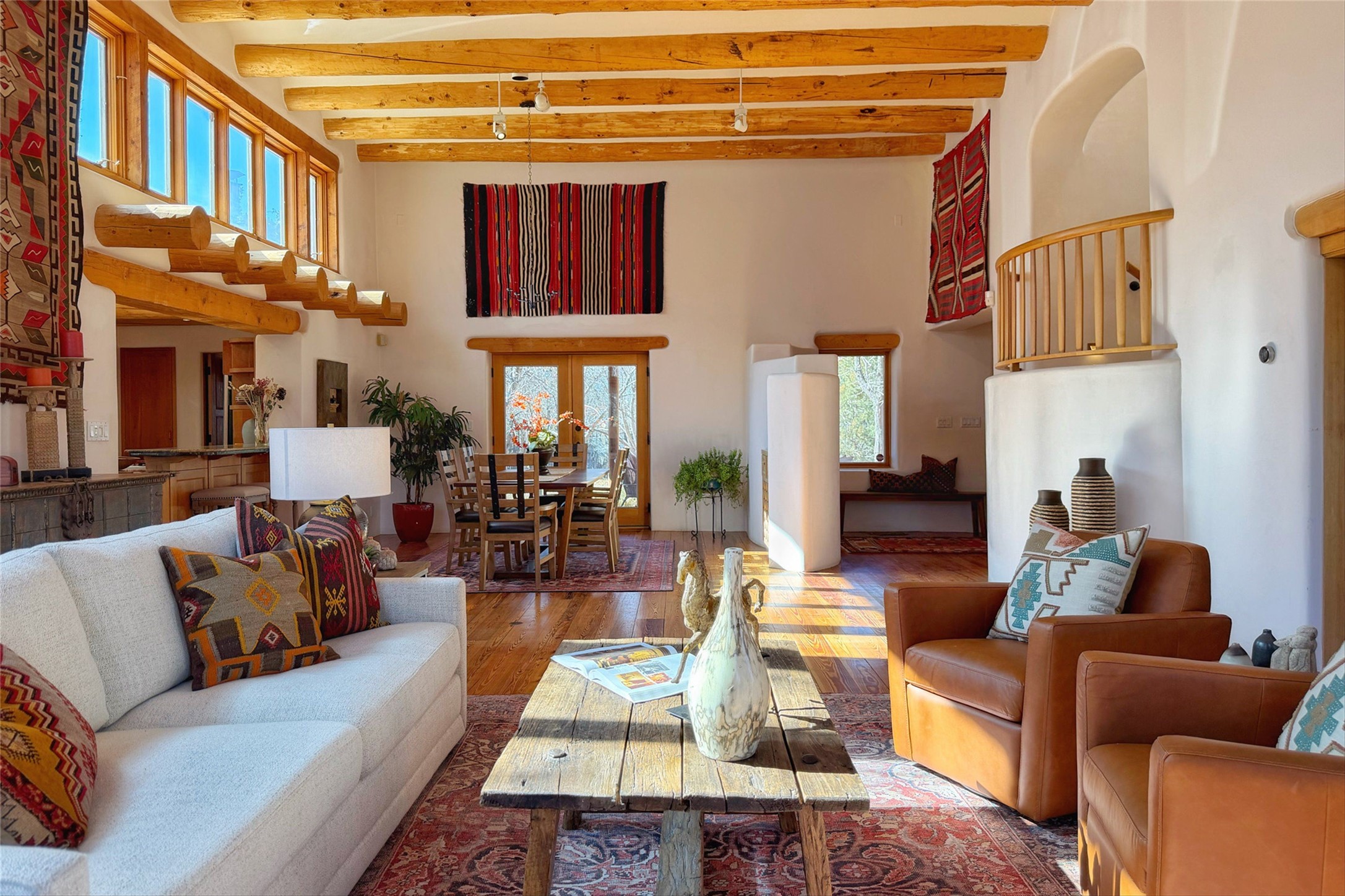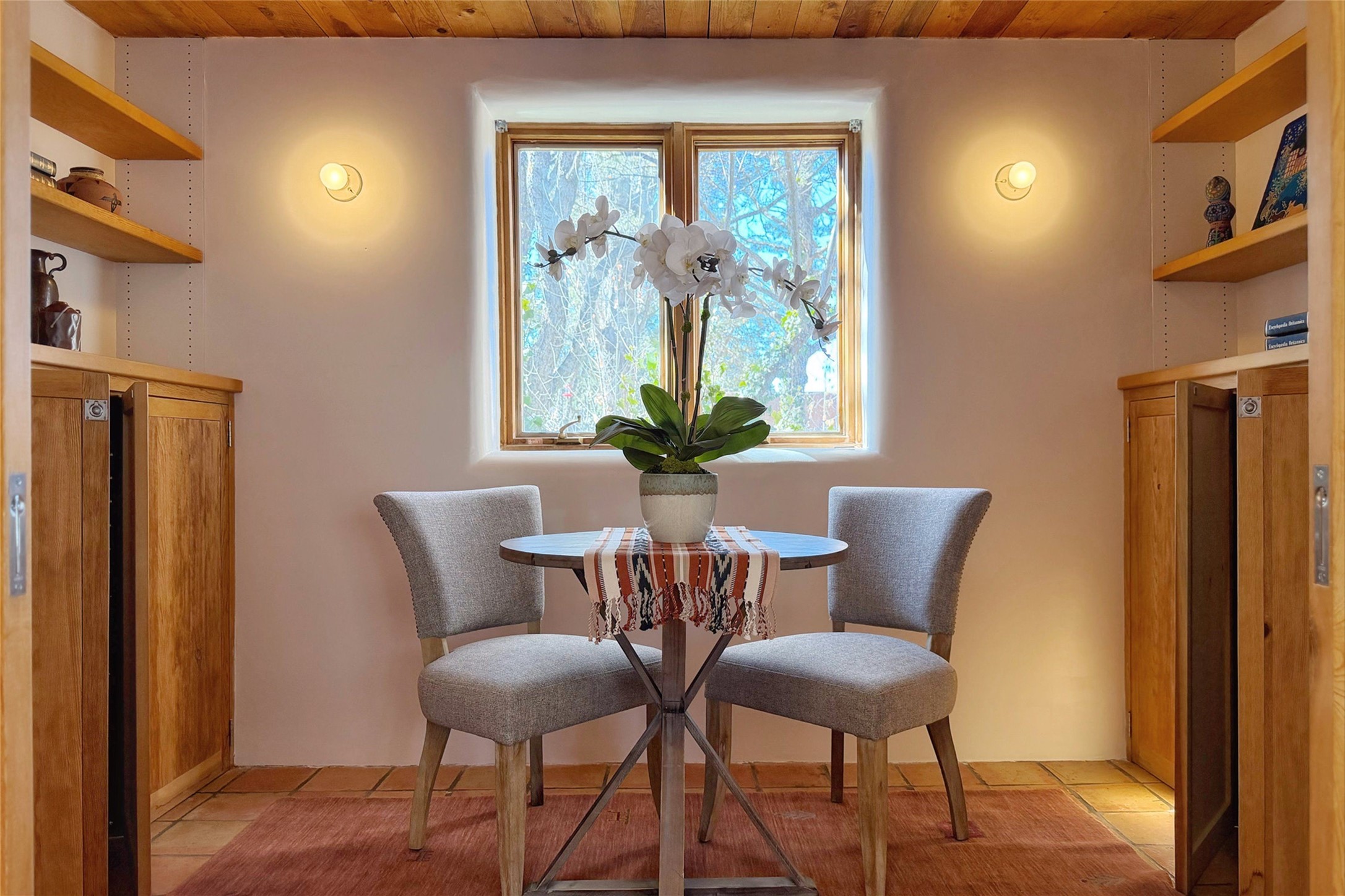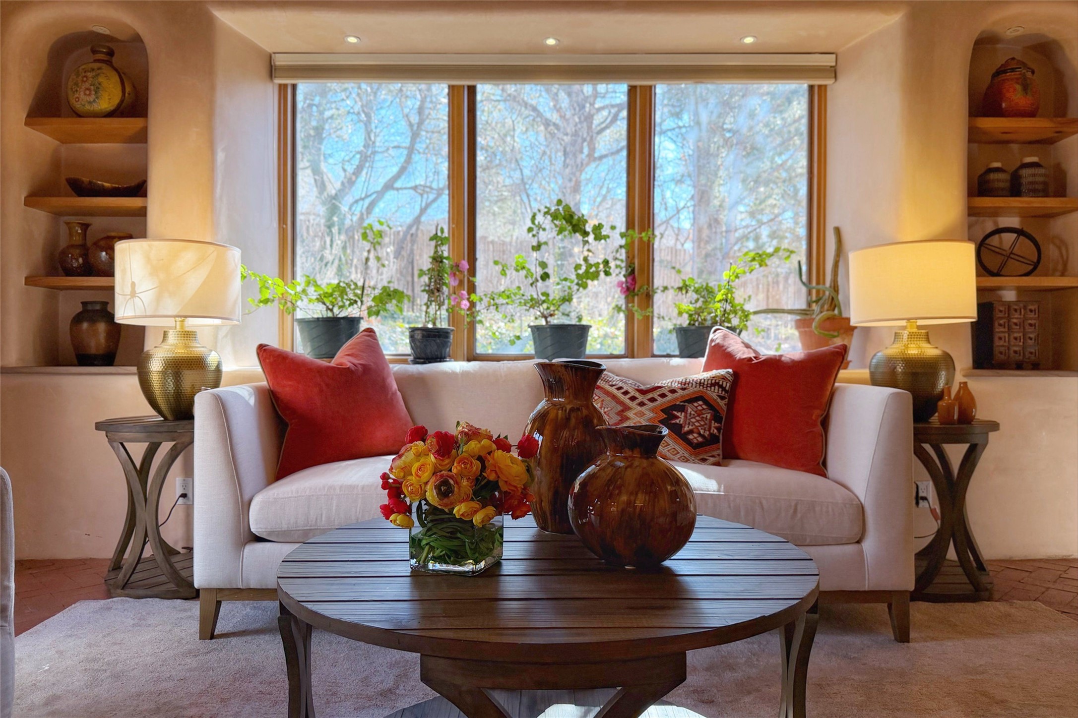 A rare opportunity to own an adobe compound priced $550,000 below a recent appraisal. This compound off exclusive Upper Canyon Road with casita and studio offers views, and lush grounds. Discretely hidden behind gates on a quiet cul-de-sac in Santa Fe's historic East Side, this adobe compound offers privacy, protected views, and access to nature. Set on 1.14 acres, the fully fenced and landscaped property enjoys vistas of the Sangre de Cristo and Jemez Mountains. Designed by architect Paula Baker, author of Healthy Home, the custom residence was thoughtfully built in the early 1990s. The main house has four bedrooms, four baths, and multiple living areas. The open-concept living area connects kitchen, dining, and living spaces with easy access to private quarters. A detached guest casita includes two bedrooms, a bath, and a kitchenette. A separate studio, office, or gym provides flexible space. The primary suite features private patios with sweeping views, an office, multiple closets, and a spa-style bath. Architectural highlights include six fireplaces, vigas, latillas, antique doors, wood and brick floors, and abundant natural light. Heating includes ductless mini-splits, radiant flooring, and forced air. A detached two-car garage completes the residence. Outdoor living includes a front portal, multiple patios, a stream, and waterfall celebrated in the book Secret Gardens of Santa Fe. Private access across the road to protected hiking trails that connects to the Dorothy Stewart trail and Dale Ball Trail system. This is a rare opportunity to own a private, thoughtfully designed adobe compound in one of Santa Fe's most desirable East Side locations.