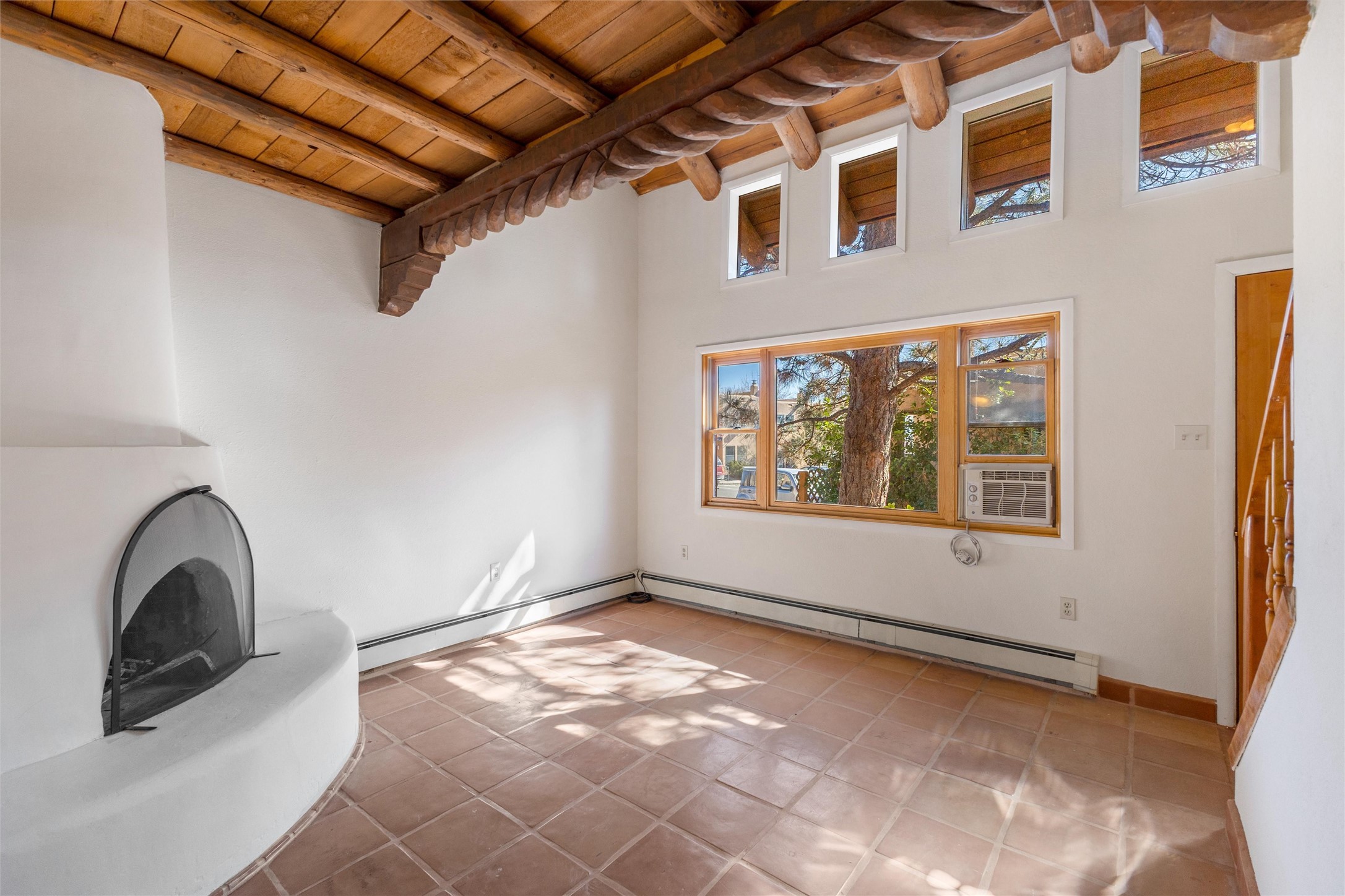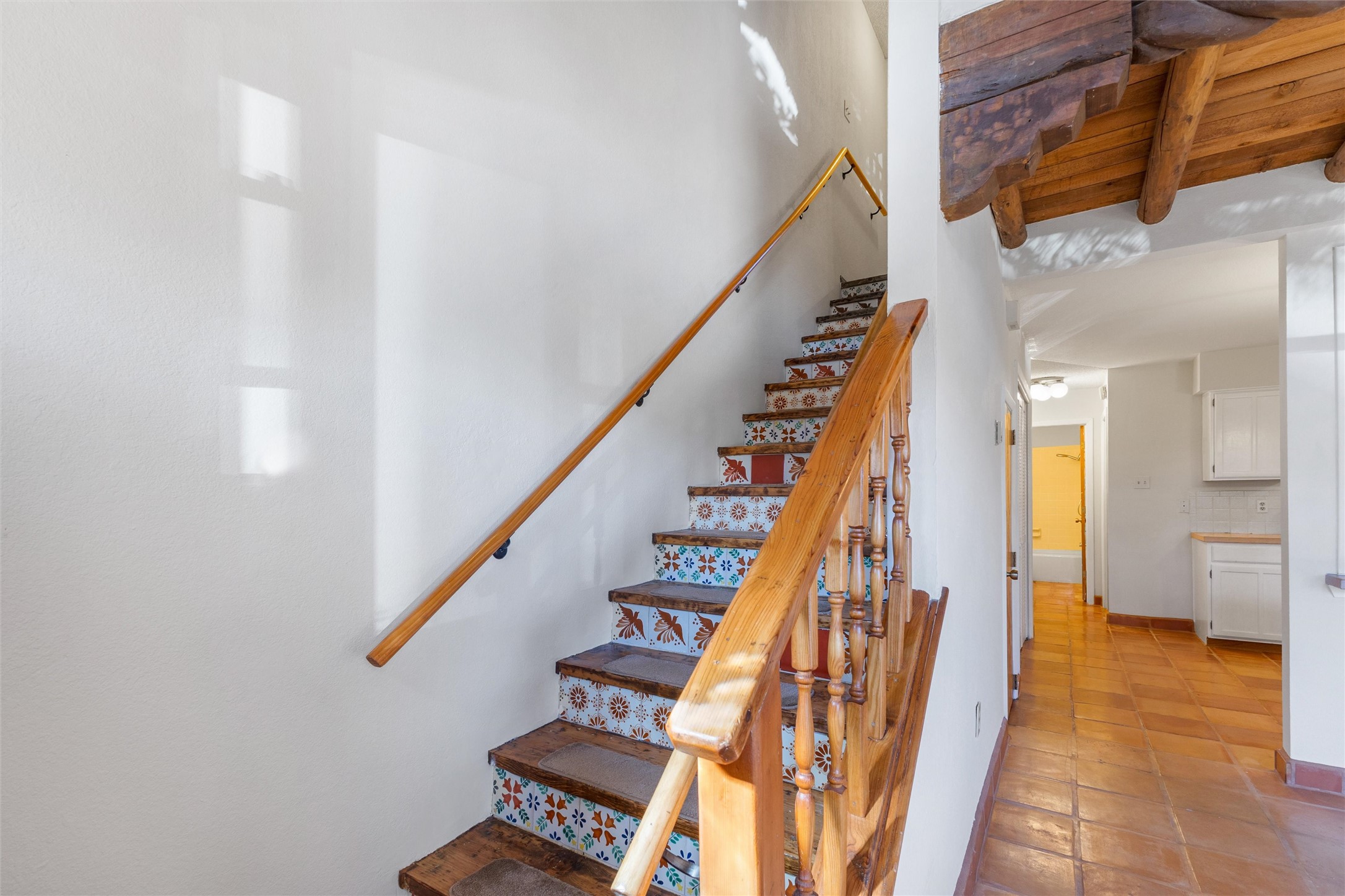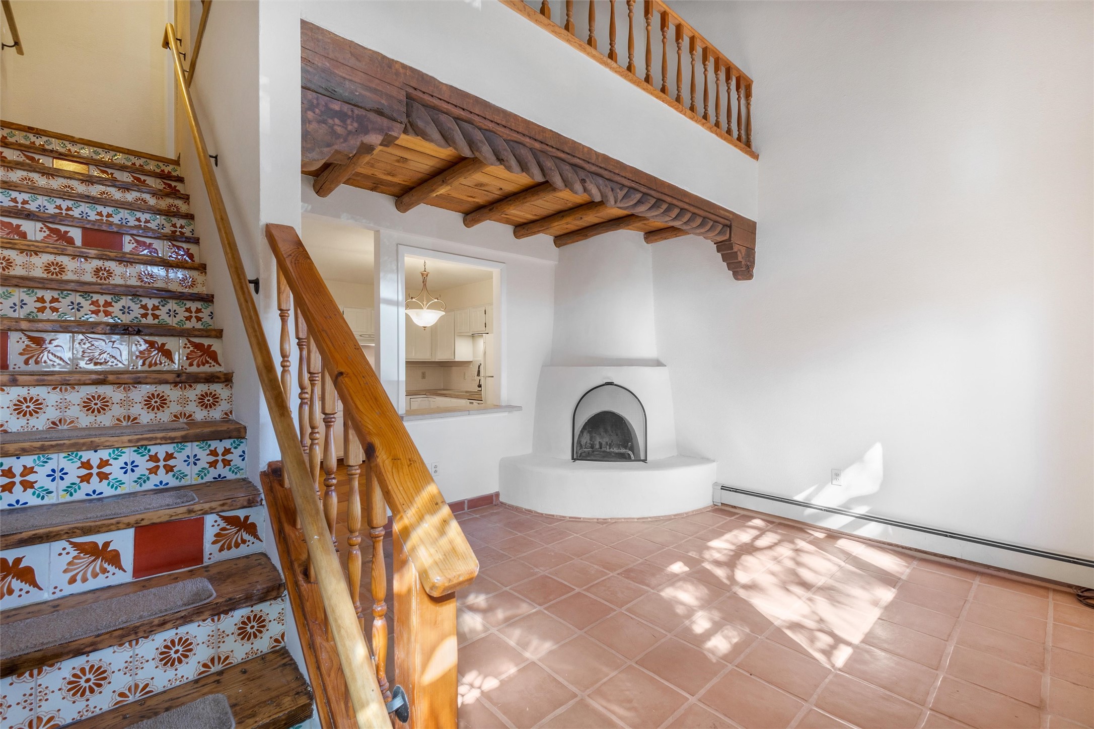This inviting 2-bedroom, 2-bath residence at Avenida de las Americas blends classic Santa Fe style with thoughtful updates and a comfortable, well-designed floor plan. Upon entry, the home feels open and spacious, enhanced by clerestory windows that fill the living area with natural light. Traditional Southwest details include vigas, a kiva-style fireplace, Saltillo tile flooring, and a charming loft that adds character and flexible living space.The living room serves as the heart of the home, offering warm morning light, a cozy fireplace, and an easy flow for everyday living. A full bedroom and bathroom on the lower level provide convenience for guests or main-level living, while the large primary bedroom and bathroom upstairs offers privacy and comfort. The back yard extends the living space outdoors, featuring mature landscaping, gardens, and a flagstone patio ideal for relaxing or entertaining.Recent improvements include fresh interior paint completed in January 2026, Saltillo tile installed throughout the lower level and upstairs bathroom, a remodeled stairway with natural wood and Mexican tile, an updated kitchen sink and faucet, and added security doors at the rear of the home. Ample storage, including generous space beneath the stairway, adds everyday functionality.Las Americas offers a quiet, community-oriented setting with a strong sense of privacy, while remaining close to shopping, dining, and entertainment. With well-lit parking and a peaceful atmosphere, this home offers comfort, charm, and convenient Santa Fe living. It also includes two designated parking spaces labeled 1559.
