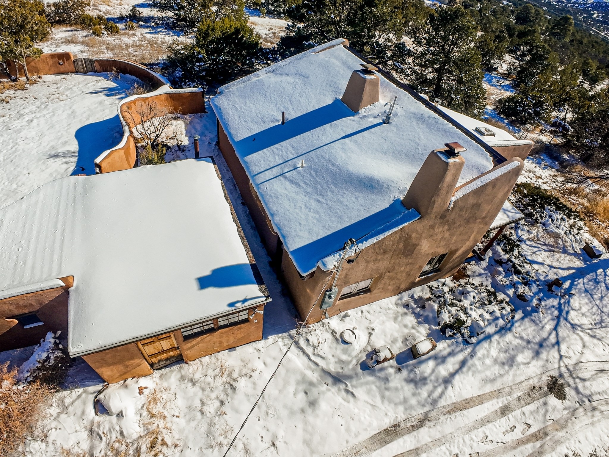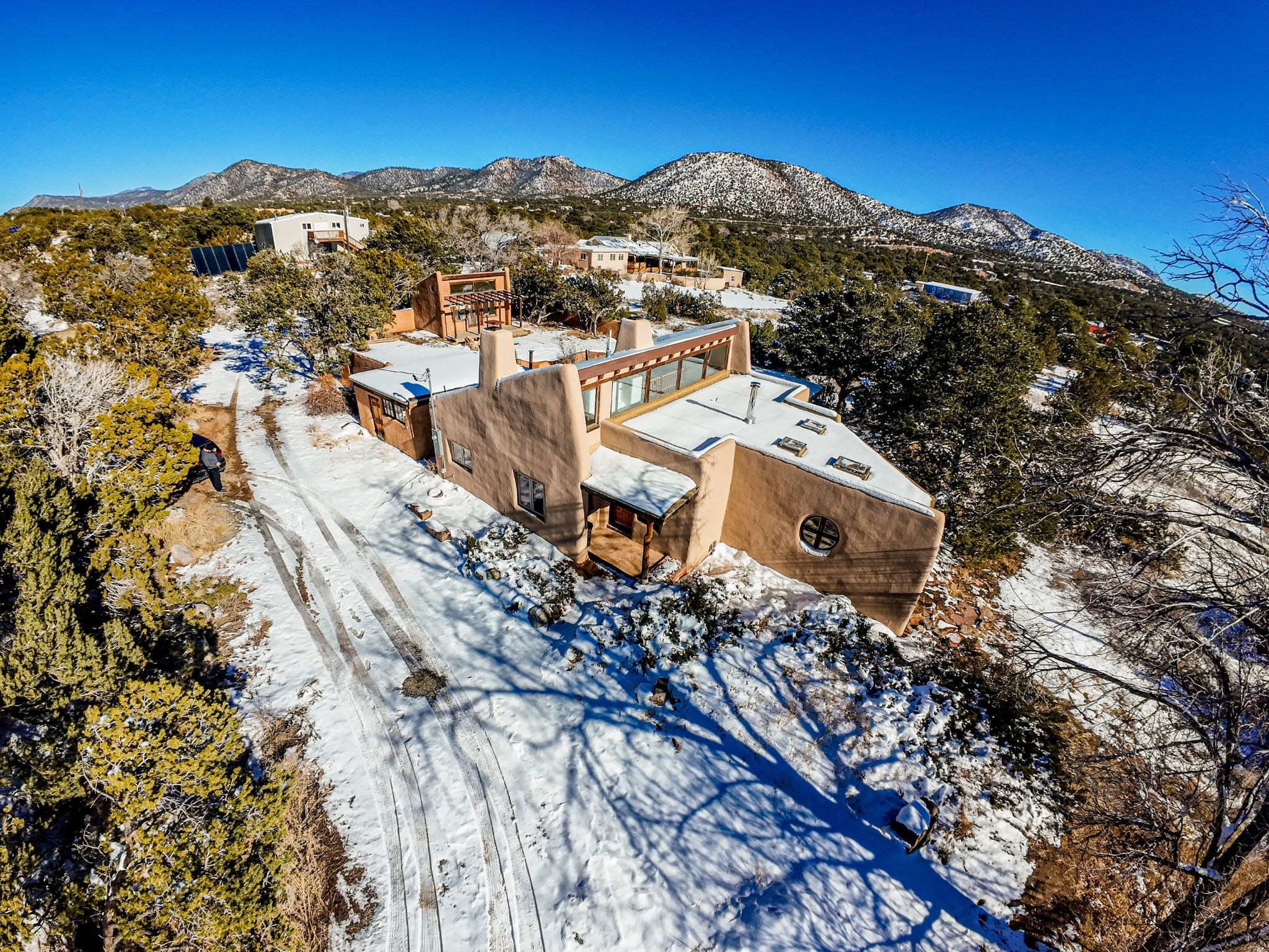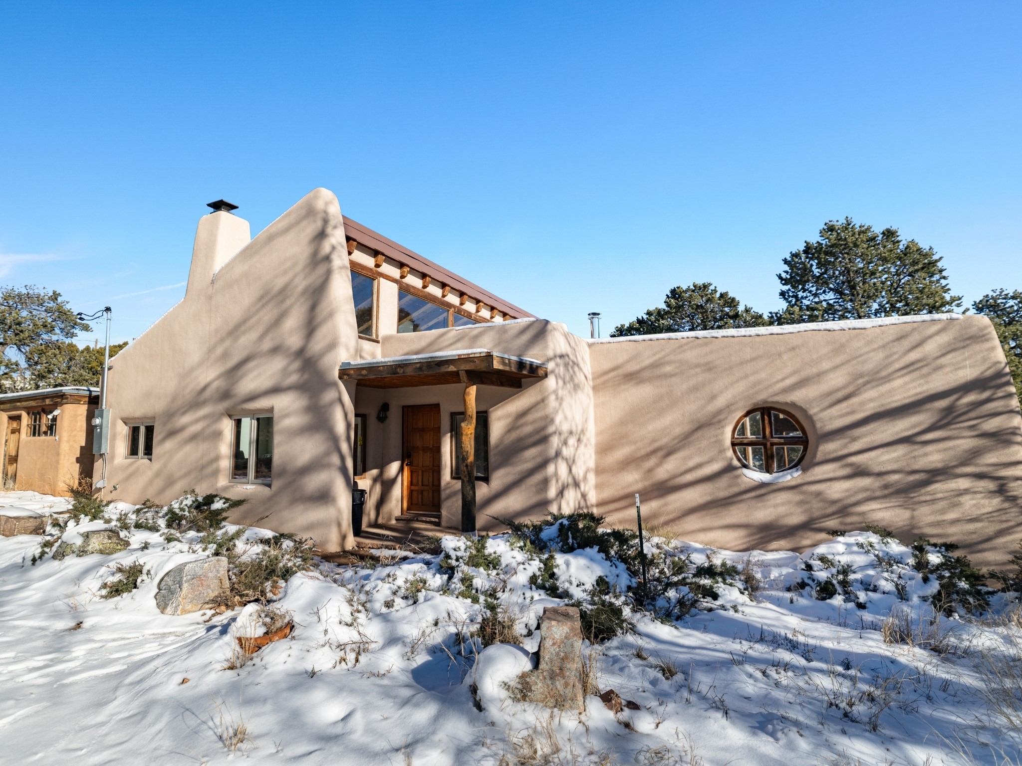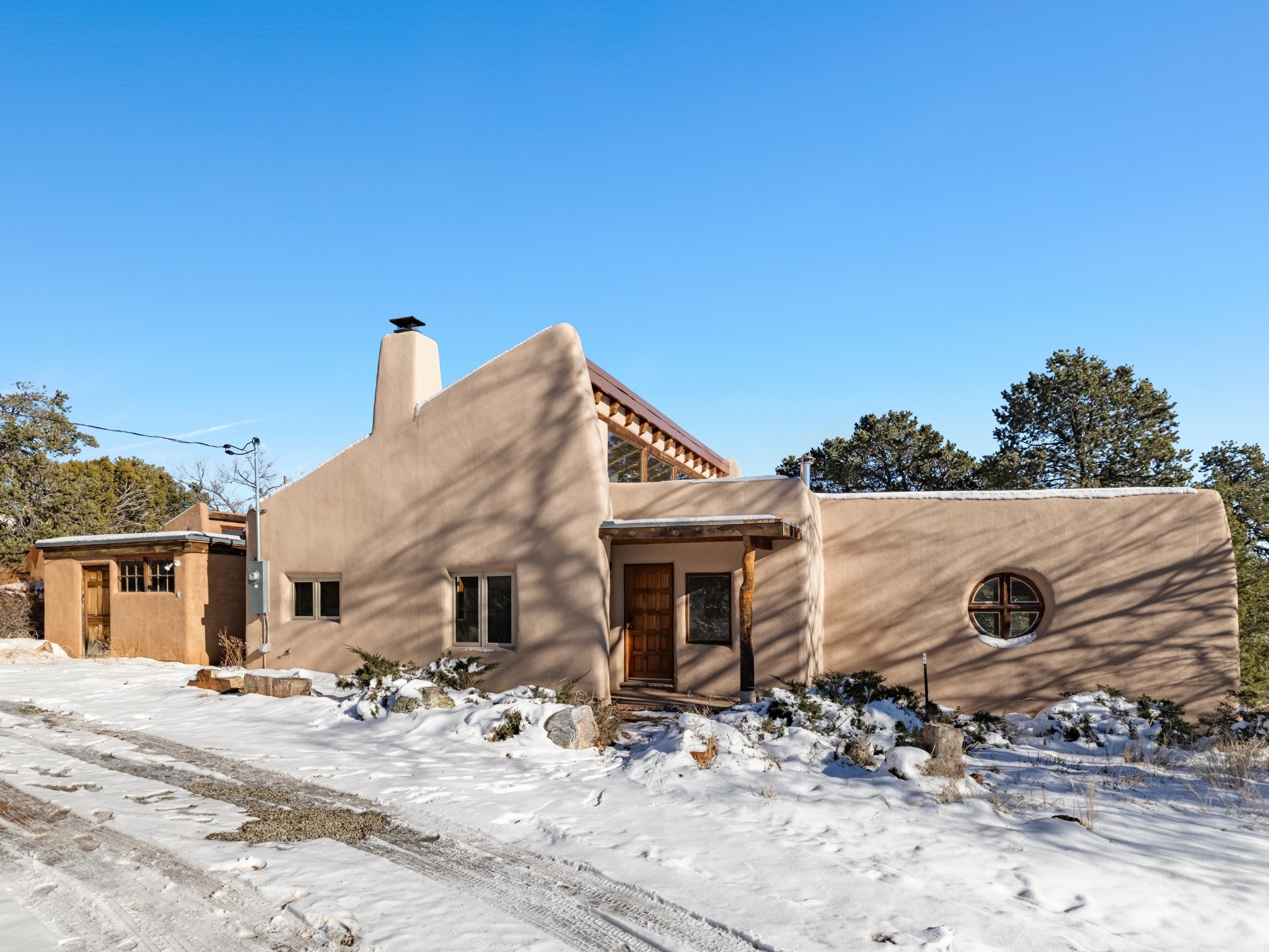 Nestled on 5 quiet, wooded acres, this 1523 sq. ft. passive solar home is bathed in natural light. A circular driveway makes coming and going a breeze. Inside you will find plenty of character, from the high clerestory windows to the rustic flagstone floors. Cozy up on chilly nights by the fireplace or the wood stove and read a book in the sun room in the afternoons. Primary bedroom features a loft, perfect for storage while a flexible den or hobby room could easily serve as a bedroom with addition of a closet. Creatives and artists will love the 240 sq. ft. separate studio and workshop area, both surrounded by a beautiful adobe wall.
