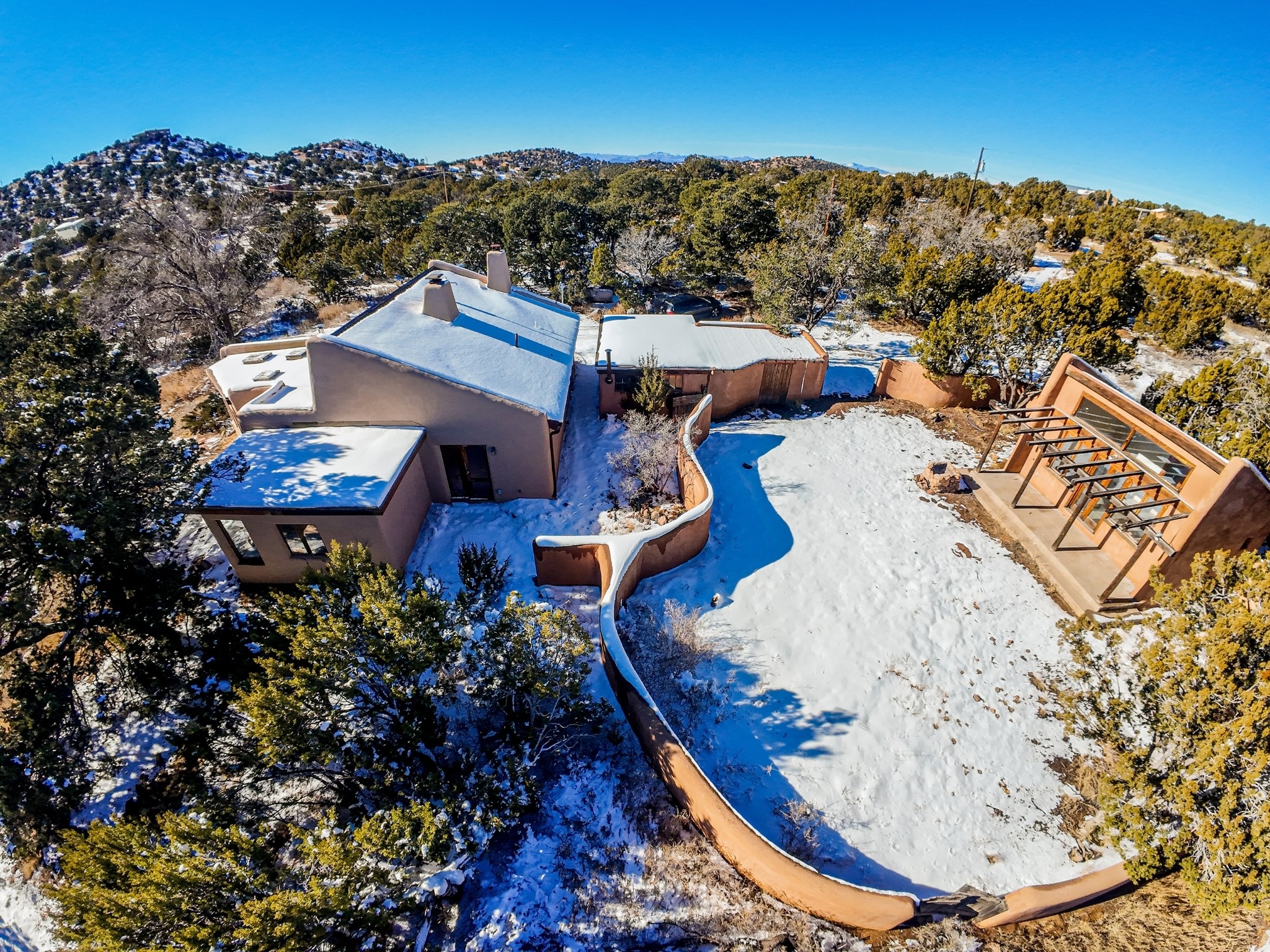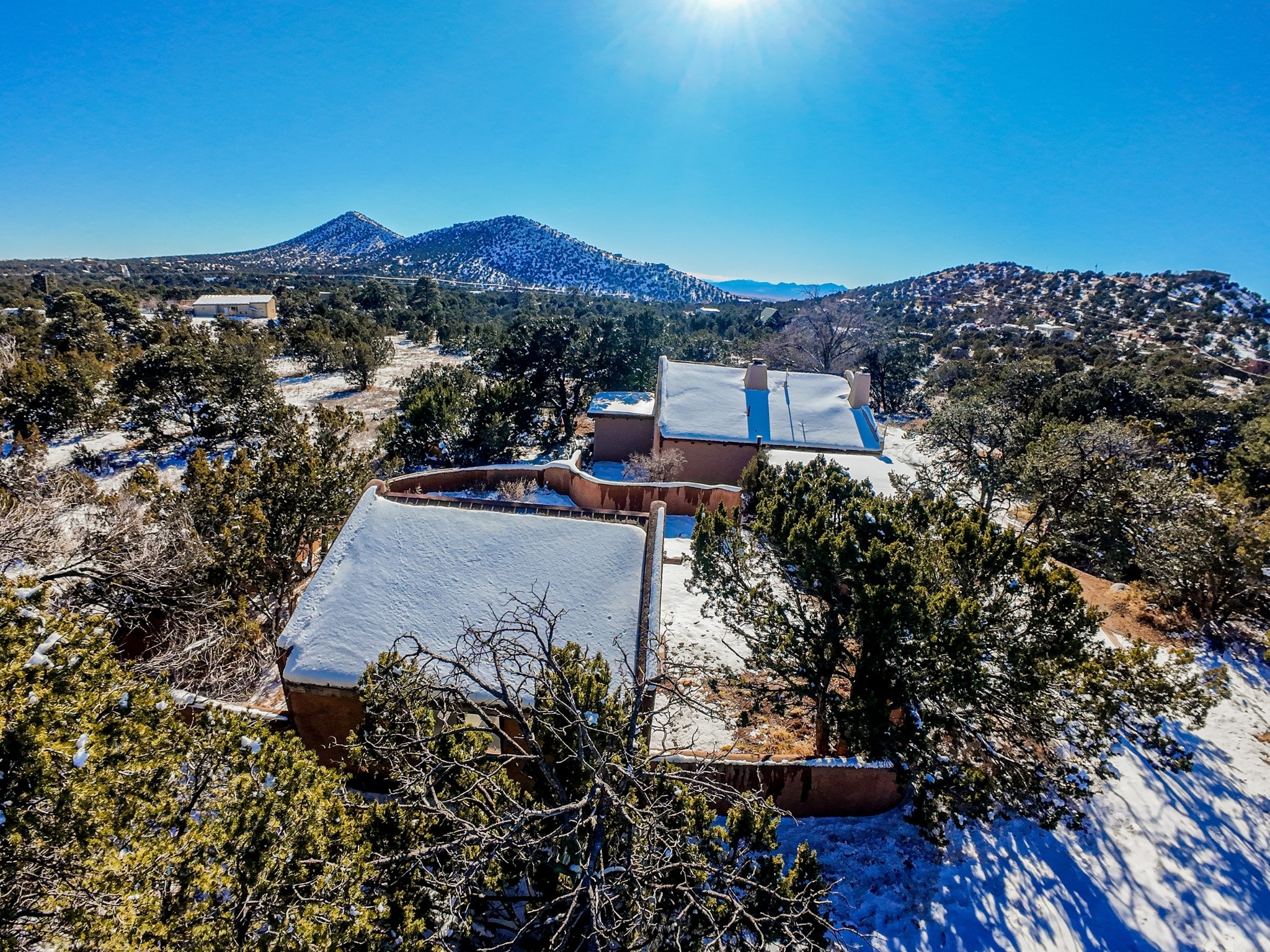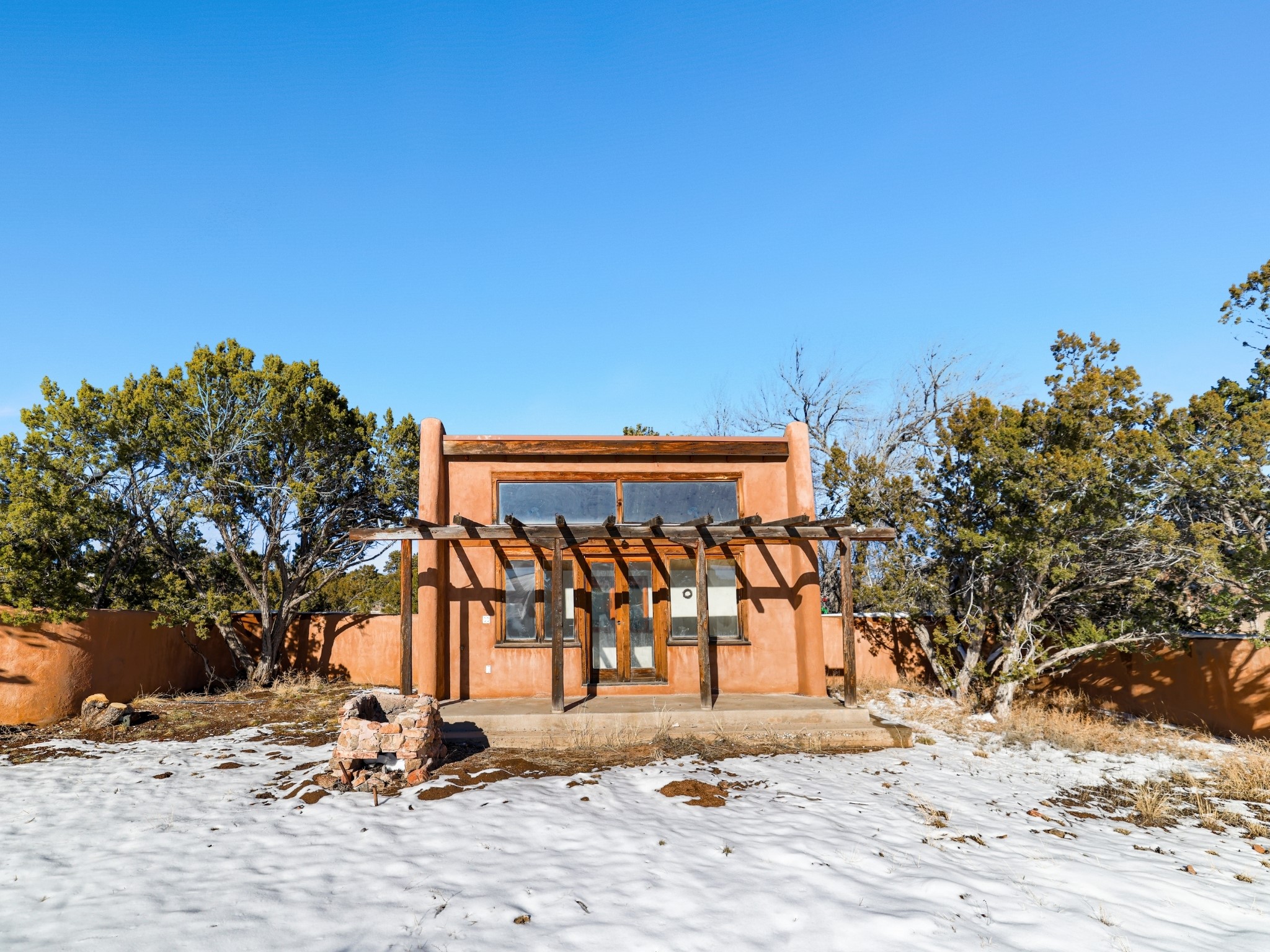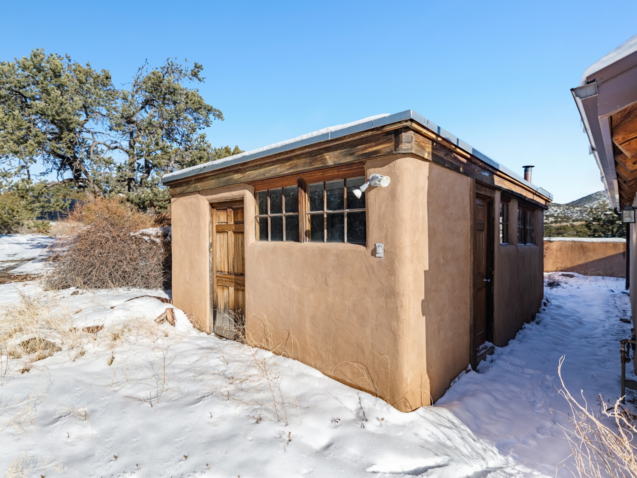 Nestled on 5 quiet, wooded acres, this 1523 sq. ft. passive solar home is bathed in natural light. A circular driveway makes coming and going a breeze. Inside you will find plenty of character, from the high clerestory windows to the rustic flagstone floors. Cozy up on chilly nights by the fireplace or the wood stove and read a book in the sun room in the afternoons. Primary bedroom features a loft, perfect for storage while a flexible den or hobby room could easily serve as a bedroom with addition of a closet. Creatives and artists will love the 240 sq. ft. separate studio and workshop area, both surrounded by a beautiful adobe wall.