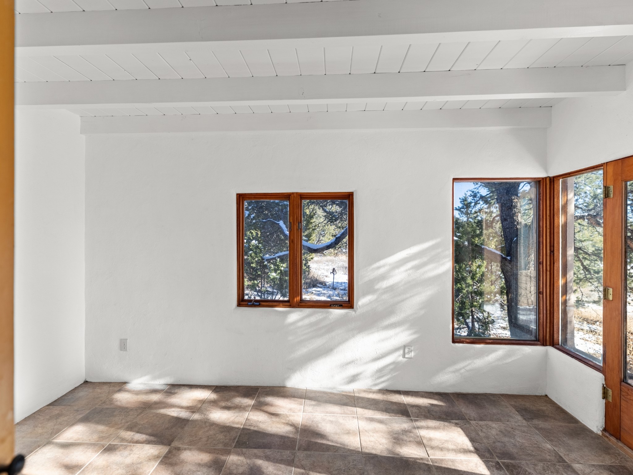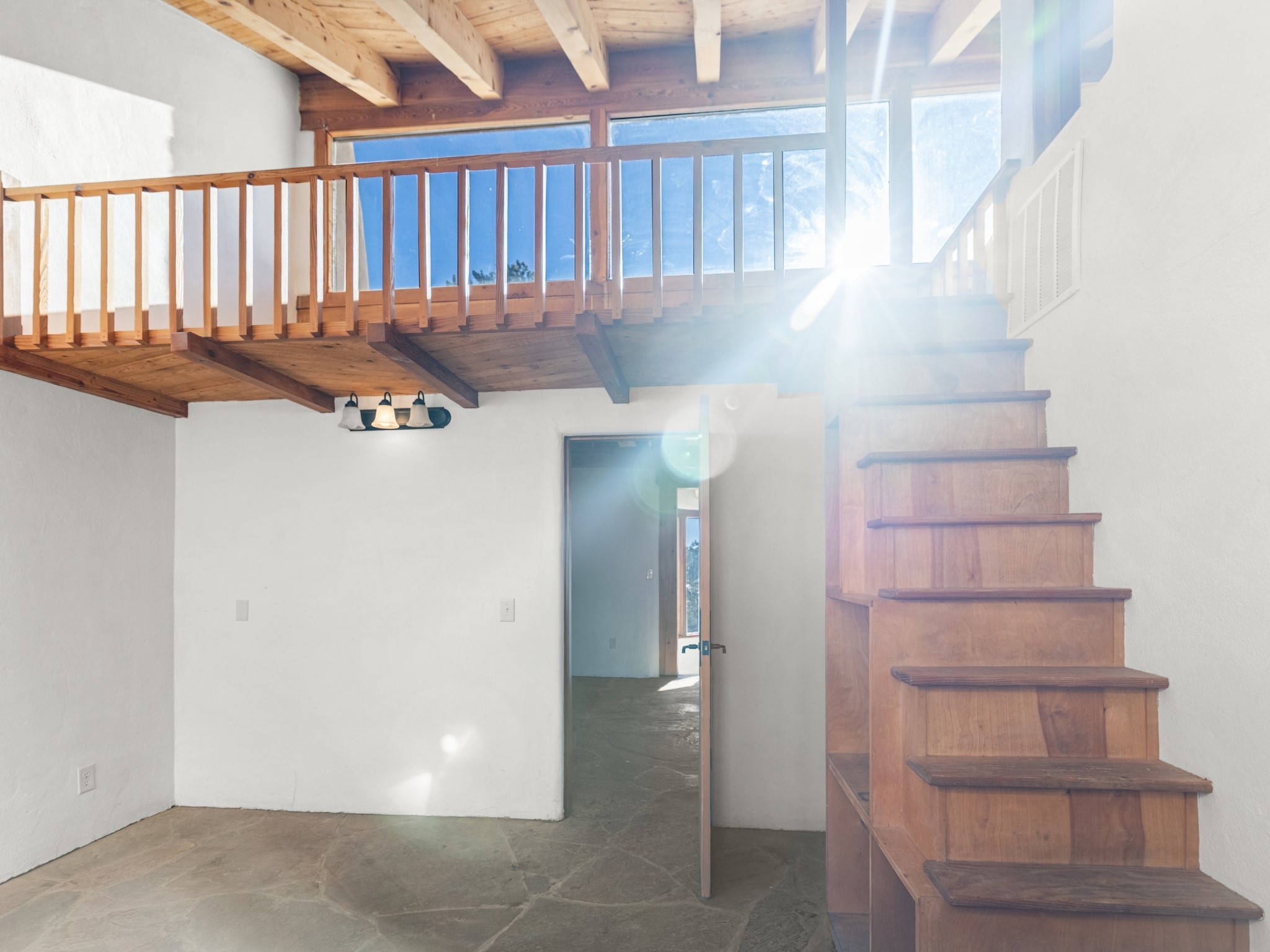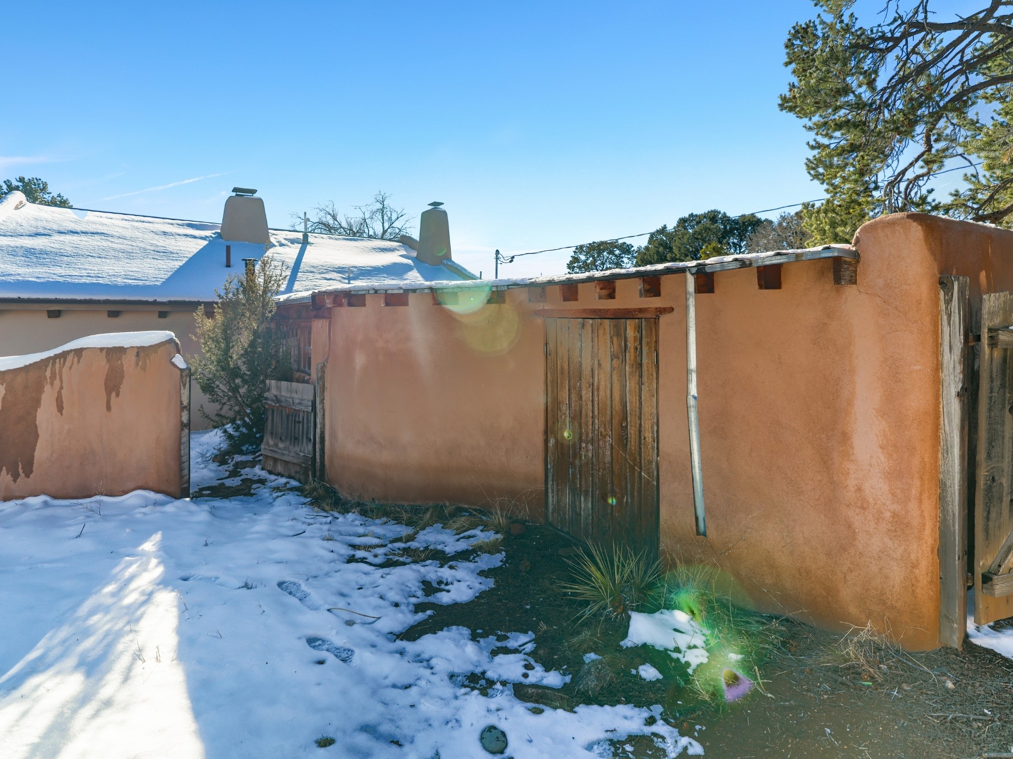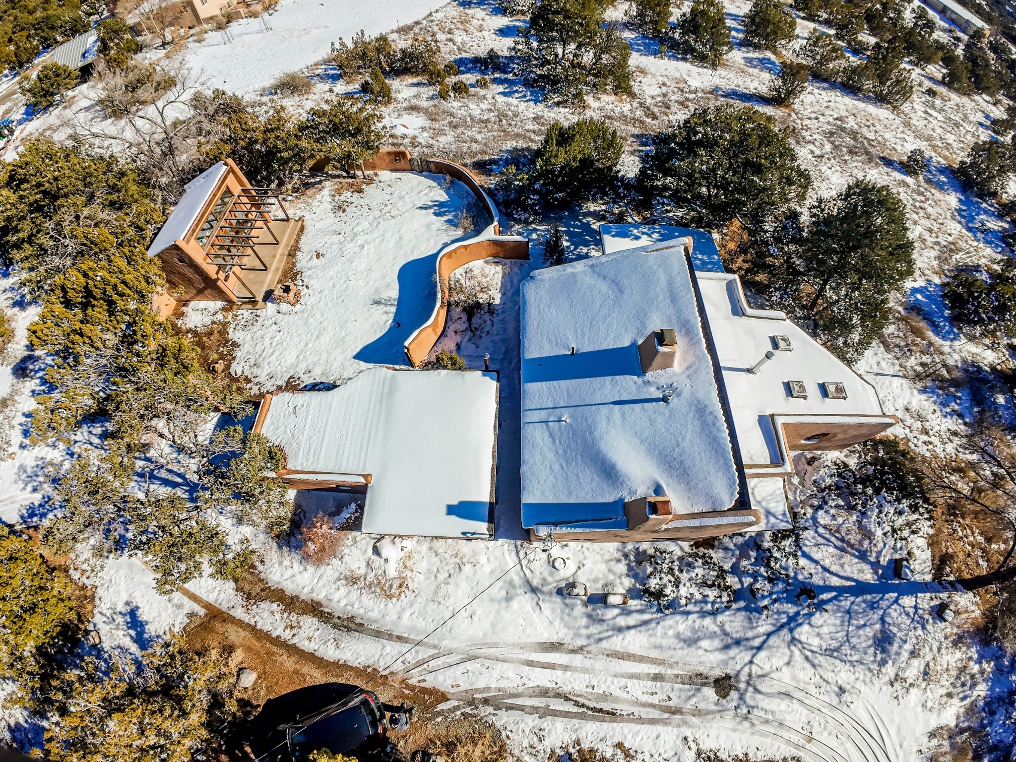 Nestled on 5 quiet, wooded acres, this 1523 sq. ft. passive solar home is bathed in natural light. A circular driveway makes coming and going a breeze. Inside you will find plenty of character, from the high clerestory windows to the rustic flagstone floors. Cozy up on chilly nights by the fireplace or the wood stove and read a book in the sun room in the afternoons. Primary bedroom features a loft, perfect for storage while a flexible den or hobby room could easily serve as a bedroom with addition of a closet. Creatives and artists will love the 240 sq. ft. separate studio and workshop area, both surrounded by a beautiful adobe wall.