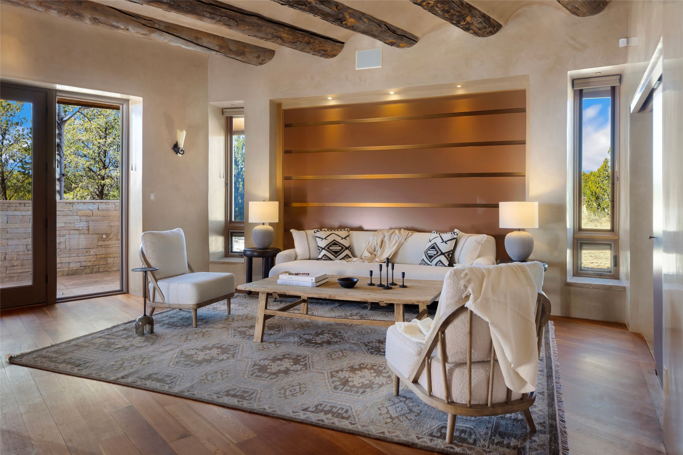 Welcome to 5 Penasco Circle, one of the most exciting estates in Santa Fe, this captivating estate impresses with commanding architecture, majestic mountain views and superior craftsmanship. Privately sited on a premiere 2.3-acre homesite within the famed Las Campanas community, this tour de force home by Turner Lechner & Romero, perfectly blends contemporary design with Northern New Mexico high desert luxury. The gallery-like formal living room stuns and welcomes as a grand centerpiece, flowing into a dining room encased in sheets of glass beneath an iconic hogan-style ceiling, framing surreal Jemez Mountain sunsets. At the heart of the home lies a professional-grade chef's kitchen, an epicurean sanctuary featuring high-performance luxury appliances, walk-in pantry, butler's pantry, and a breakfast bar that anchors the home's casual living and breakfast areas. The primary wing is a sanctuary of refined comfort, offering dual bedroom options with ensuite baths, two private offices, and stone-surround fireplaces--all opening to secluded courtyard living spaces. Three total walk-in closets ensure ample storage for the most discerning homeowner. Guests enjoy ultimate privacy in a dedicated wing featuring a spacious ensuite bedroom, plus two additional guest suites with private entrances. Additional design features include a separate media room/den with its own bath and an attached heated studio. Exceptional craftsmanship is showcased throughout the single-level interior, from quality plaster walls and rare massive vigas to curated natural stone and hardwood flooring. The outdoor experience is unrivaled, featuring vast entertaining areas, deep covered portals, and two covered entry portcacheres. A welcoming front courtyard leads to a rooftop deck providing 360-degree vistas of the high-desert landscape. With extensive guest parking and a tranquil, park-like setting, this estate represents the ultimate Santa Fe and Las Campanas lifestyle.