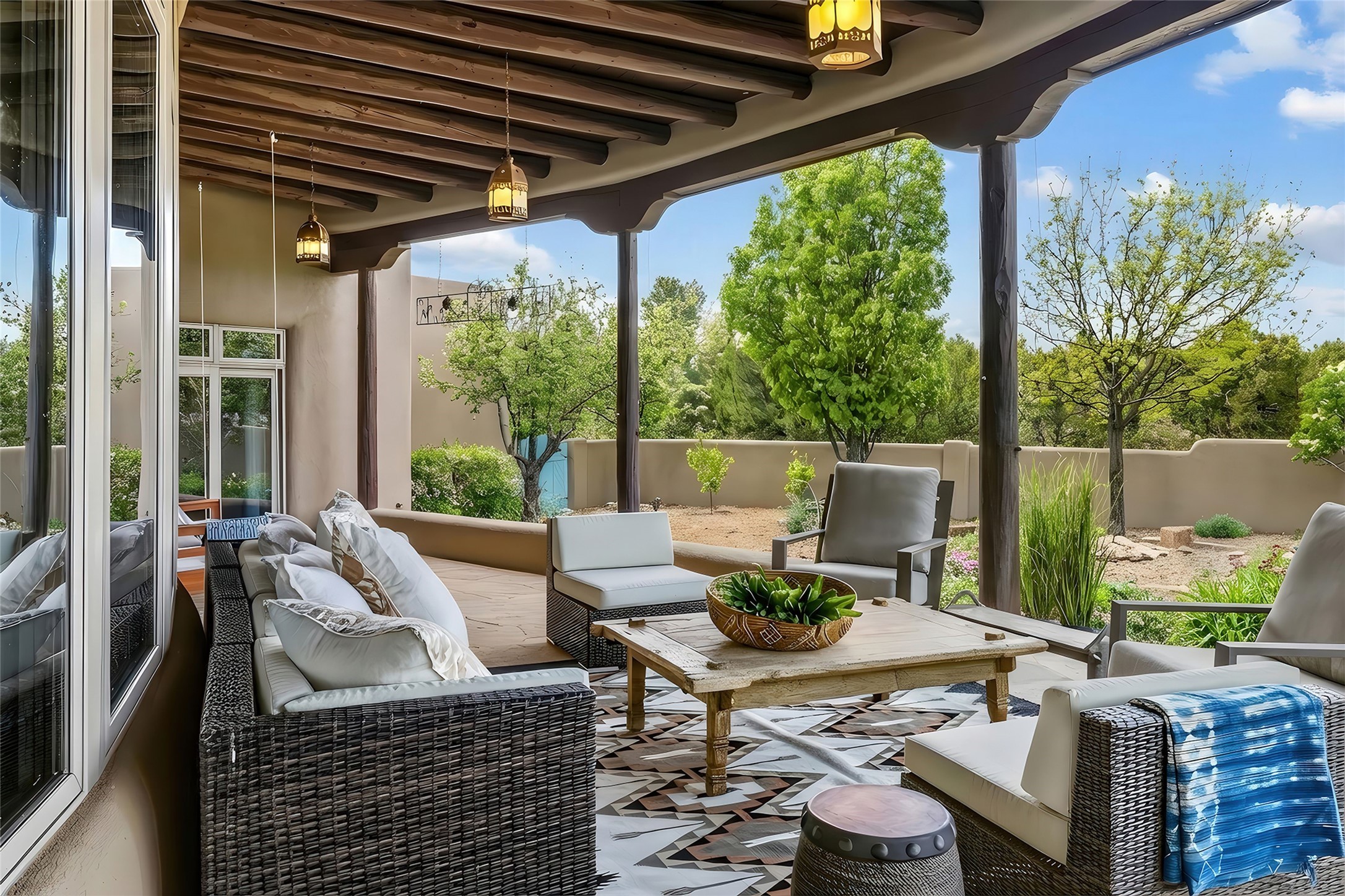 Welcome to 19 Falling Star, wherehigh desert luxury and sophistication is celebrated with this reimagined estate, where the quintessential Santa Fe lifestyle is realized through a seamless blend of soft contemporary design and Pueblo Revival elegance. Positioned at the end of a private cul-de-sac, this exceptional home offers an elevated living experience which excites with front row stunning views of the Sangre De Cristo and Jemez Mountain. Located within the famed communityofLas Campanas, this beautifully updated home impressesin scale with an intimate feel. The dramatic great room--characterized by architectural vigas, a centered fireplace, grand proportions, and a curve wall of view windows--serves as both a sophisticated art gallery and a tranquil retreat. The spacious chef's kitchen and grand dining area cater to the art of gracious entertaining, complete with high end appliances and a massive walk-in pantry. The owner's suite offers the ultimate luxury experience withprivate access to both the east sunrise patio and enclosed west gardens, a cozy kiva fireplace with a seating area, dual walk-in closets and a glamorous spa-like bath. Adjacent to the owner's suite is an ideal media room, grand office or guest bedroom with western, sunset views. Located off the main entrance is a generous, ensuite bedroom with a well-appointed full bath. An additional bonus room located off the main living area, offers a ideal over-flow guest room or exercise room option complete with an adjacent bathBeyond the interior, the home transitions into the ultimate outdoor retreat; a gated front courtyard with a granite water feature provides a serene arrival, while the expansive west portal frames thelegendary sunsets and mountain vistas. Complete with a versatile studio/workshop, this move-in-ready estate with new stucco in 2025, captures the soul of the Southwest with a modern, sophisticated edge.