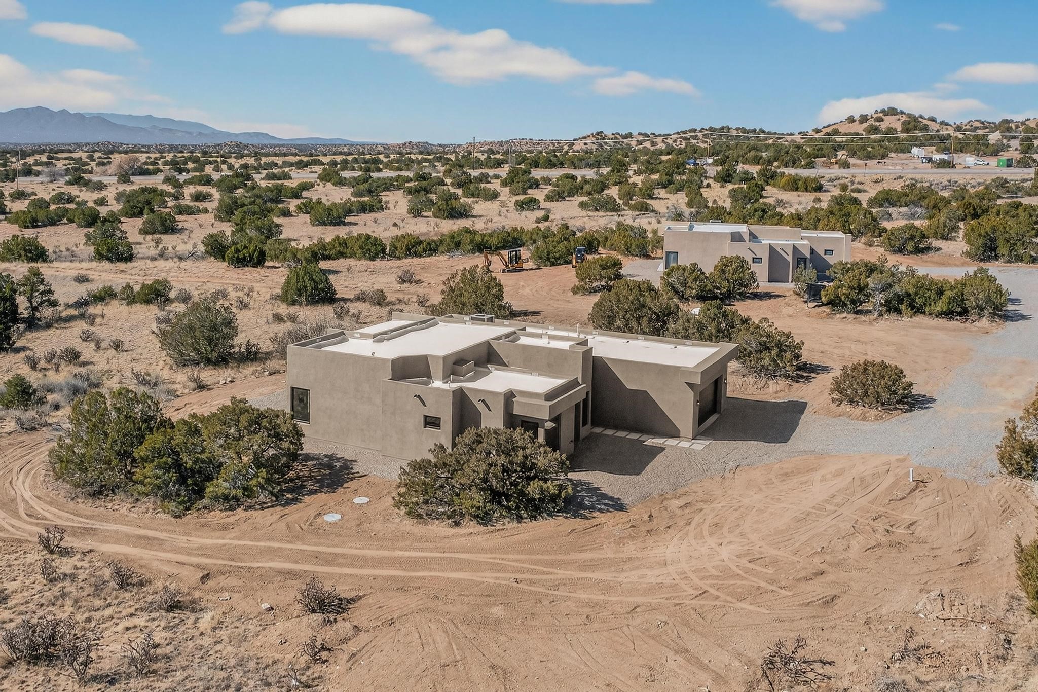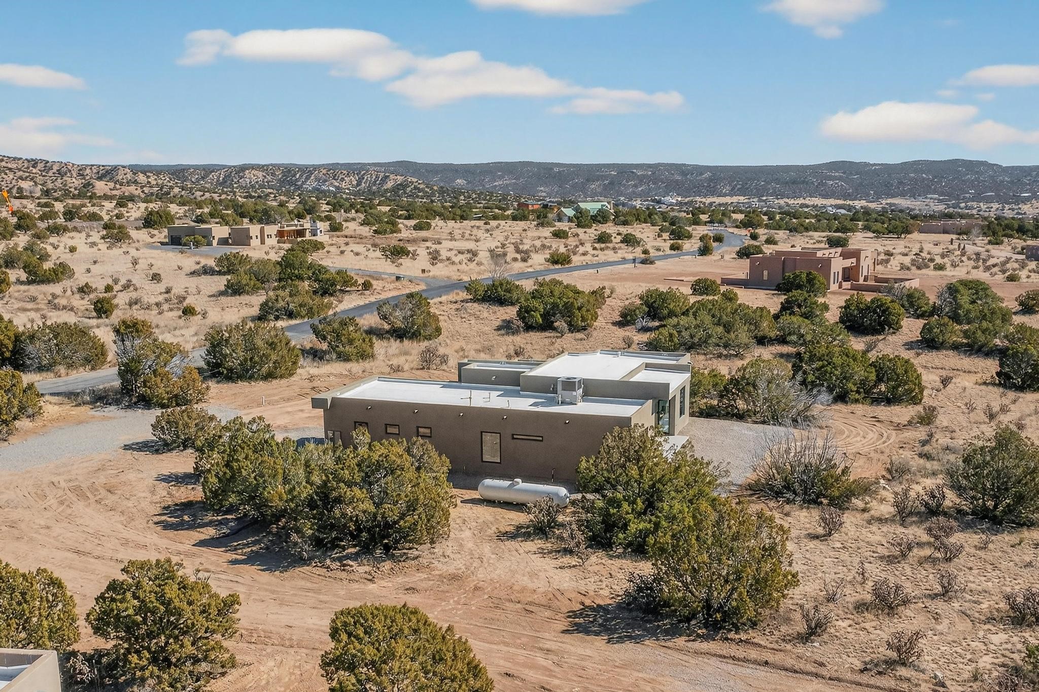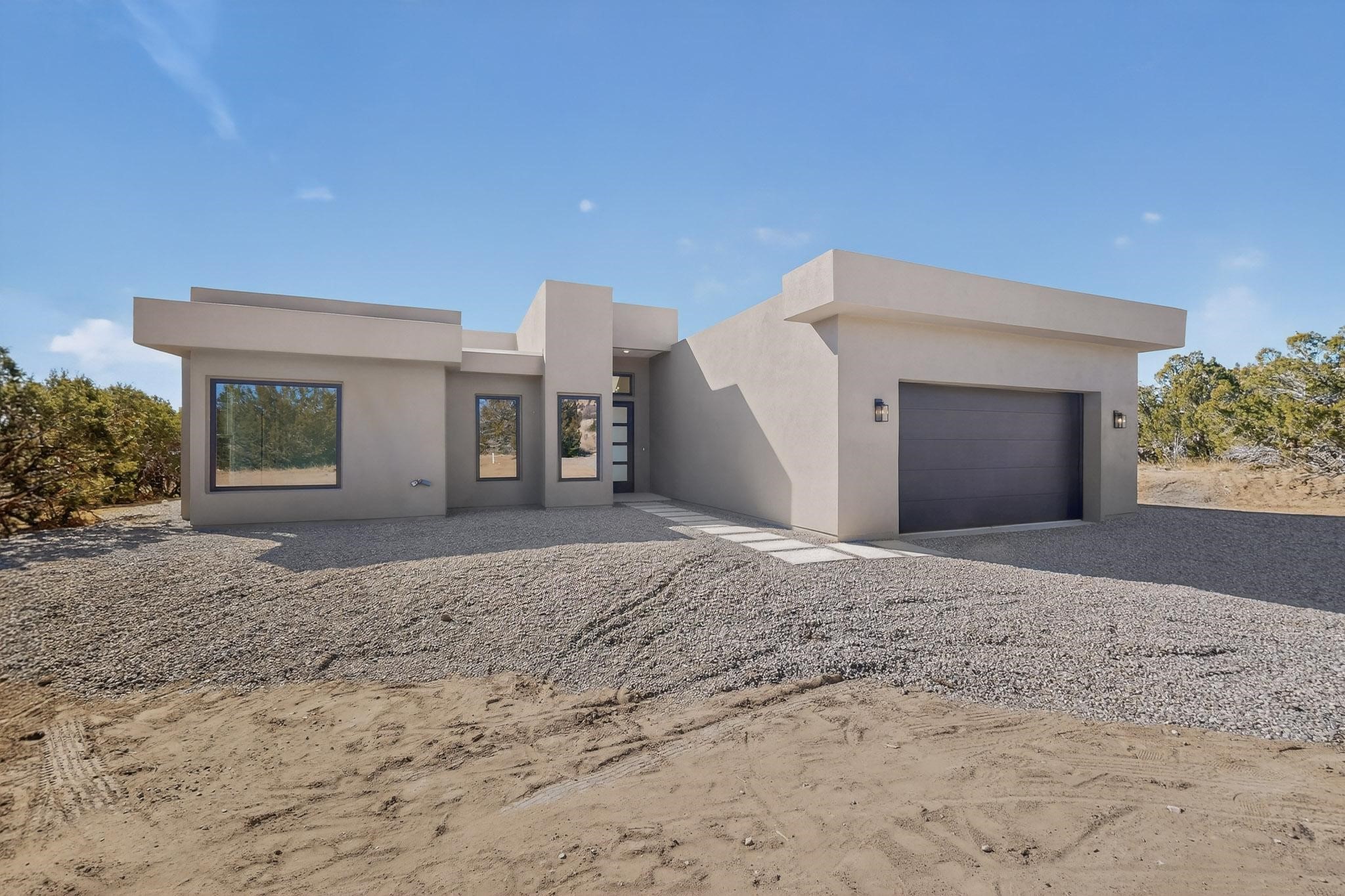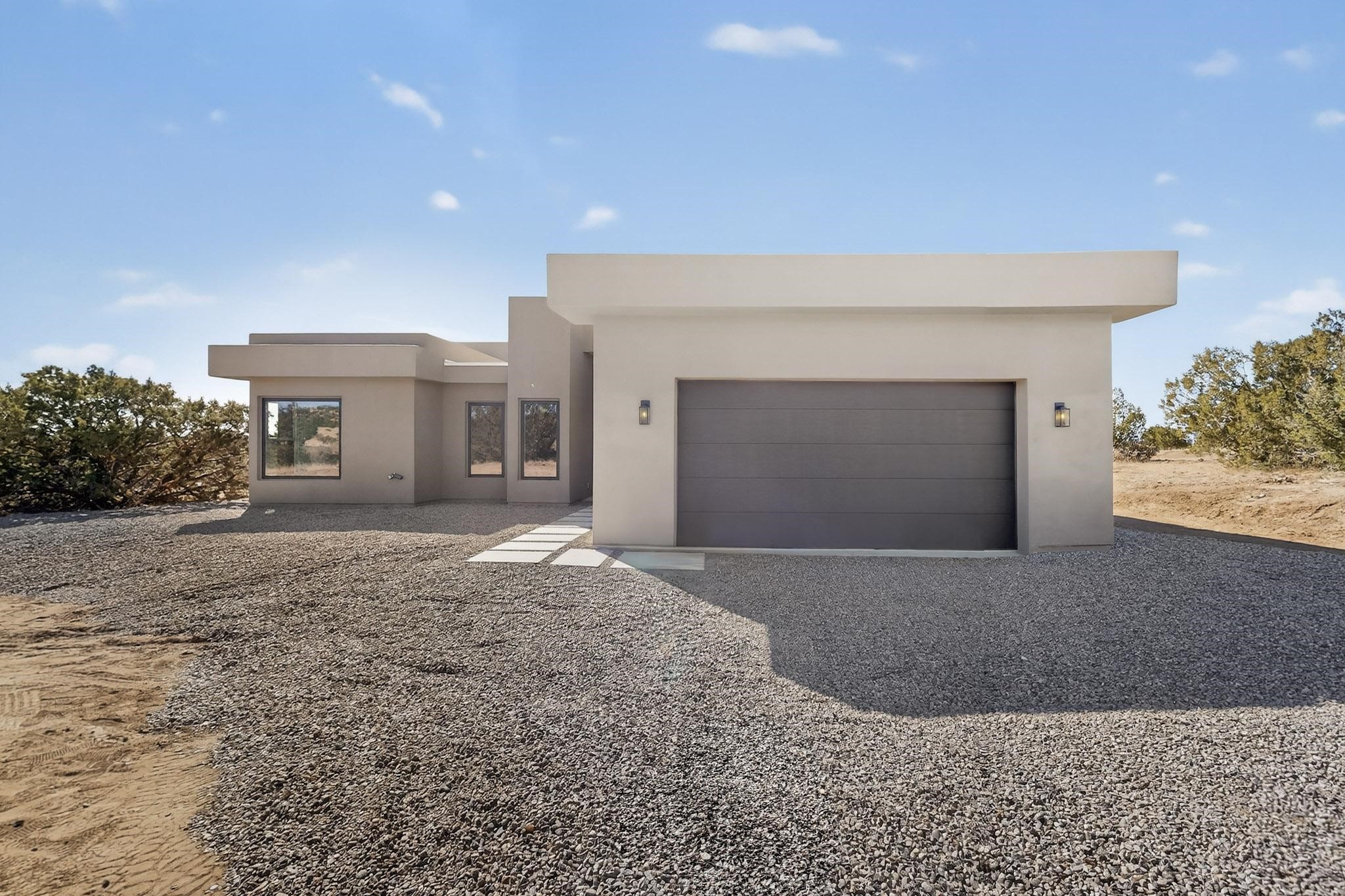 Welcome home! This stunning newly constructed contemporary-modern style home is perfectly positioned on 3.10 acres with stunning views of the Sandia Mountains and the Galisteo Basin. This 2,000 sq ft home has been designed to maximize the natural light and space, featuring high ceilings with contemporary style vigas, an open floor plan great for entertaining or keeping an eye on kids; with walls of windows taking full advantage of the expansive views!The modern kitchen includes a beautiful large granite island, large walk-in pantry, that flows beautifully into the living and dining areas, very functional and ideal for entertaining. Oversized windows and sliding glass doors invite abundant natural light and creates a seamless connection between indoor comfort and outdoor enjoyment; meanwhile framing the surrounding landscape like living artwork. The primary suite offers a peaceful escape with a luxurious spa inspired stand-alone bathtub, dual vanities, walk-in-shower with dual rain heads, and a spacious walk-in closet. Two additional bedrooms and a second full bath provide comfortable accommodations for family or guests.Enjoy the freedom of no HOA, space for horses, and the tranquility of rural living - while remaining just 20 minutes from downtown Santa Fe, close to nearby restaurants, shopping and outdoor activities. Brand new, beautifully designed, and ready to be lived in!