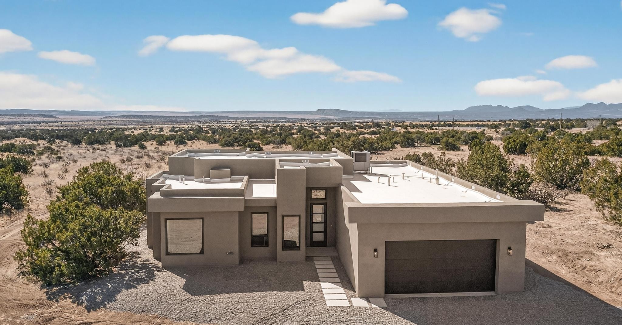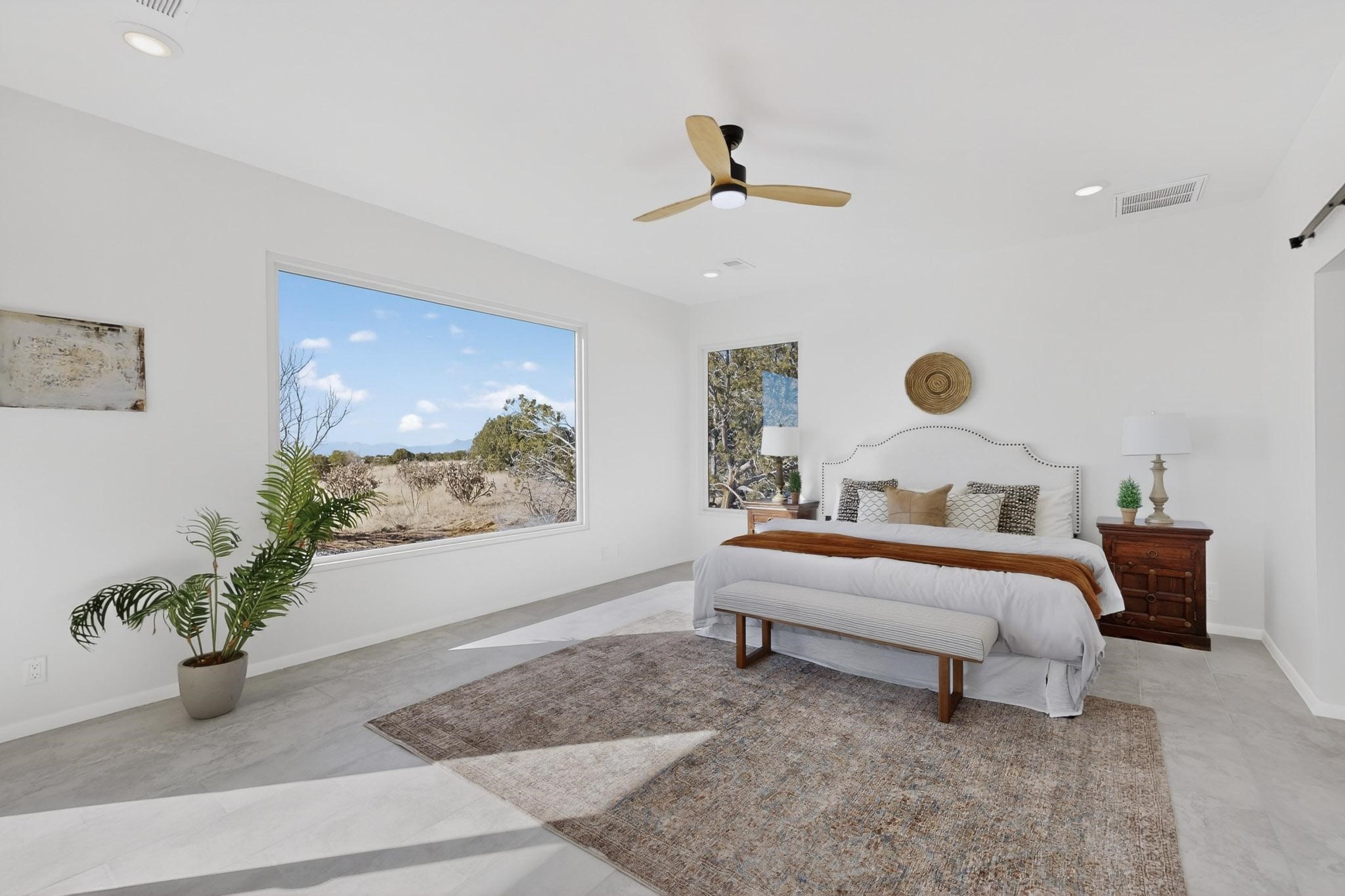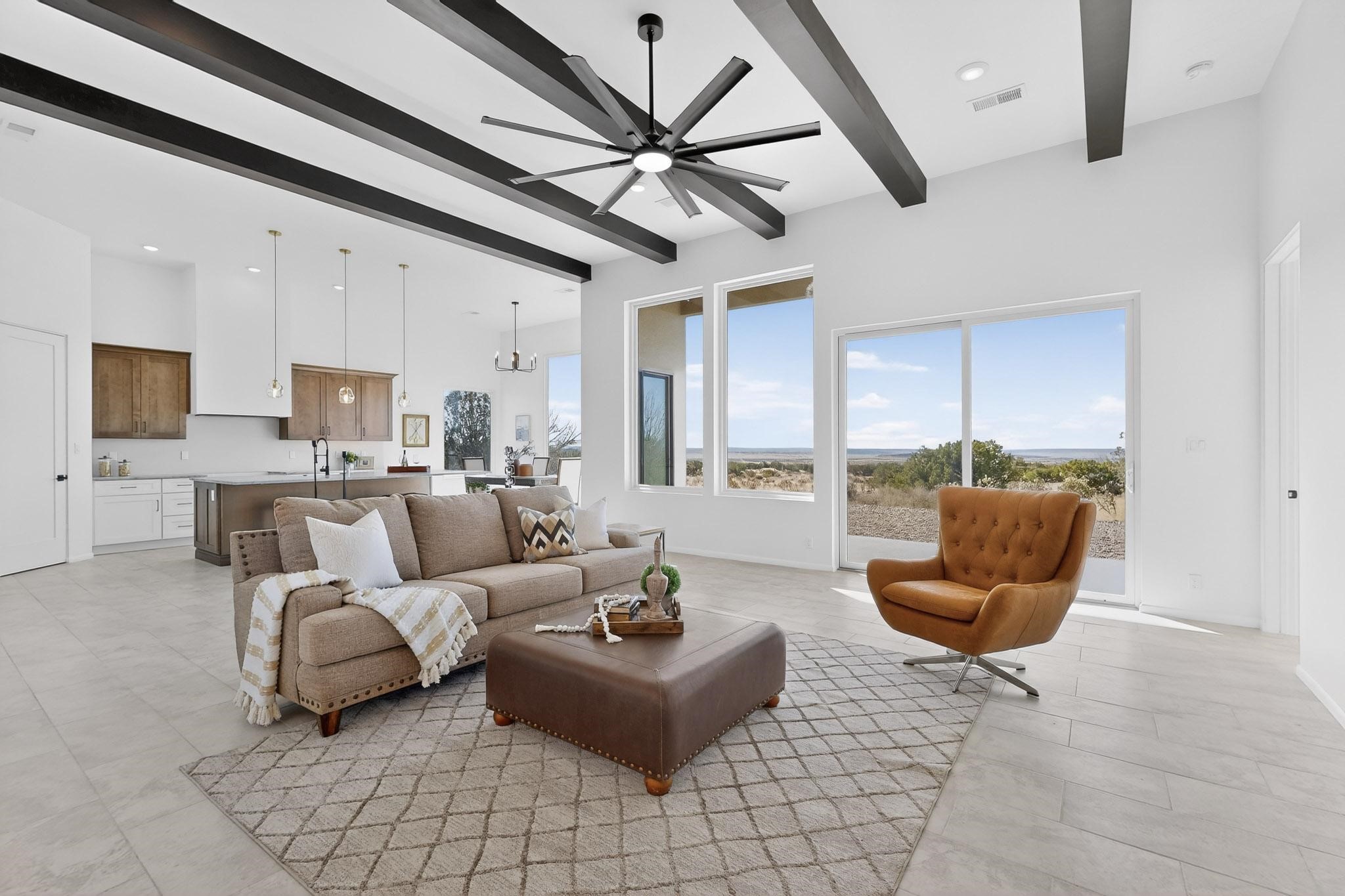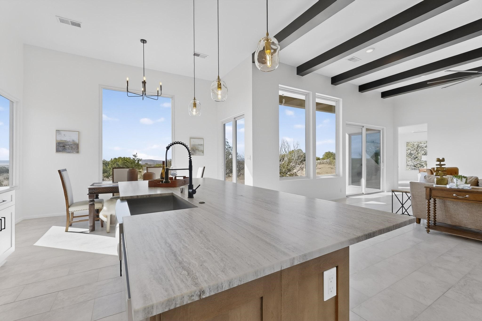 Welcome home! This stunning newly constructed contemporary-modern style home is perfectly positioned on 3.10 acres with stunning views of the Sandia Mountains and the Galisteo Basin. This 2,000 sq ft home has been designed to maximize the natural light and space, featuring high ceilings with contemporary style vigas, an open floor plan great for entertaining or keeping an eye on kids; with walls of windows taking full advantage of the expansive views!The modern kitchen includes a beautiful large granite island, large walk-in pantry, that flows beautifully into the living and dining areas, very functional and ideal for entertaining. Oversized windows and sliding glass doors invite abundant natural light and creates a seamless connection between indoor comfort and outdoor enjoyment; meanwhile framing the surrounding landscape like living artwork. The primary suite offers a peaceful escape with a luxurious spa inspired stand-alone bathtub, dual vanities, walk-in-shower with dual rain heads, and a spacious walk-in closet. Two additional bedrooms and a second full bath provide comfortable accommodations for family or guests.Enjoy the freedom of no HOA, space for horses, and the tranquility of rural living - while remaining just 20 minutes from downtown Santa Fe, close to nearby restaurants, shopping and outdoor activities. Brand new, beautifully designed, and ready to be lived in!