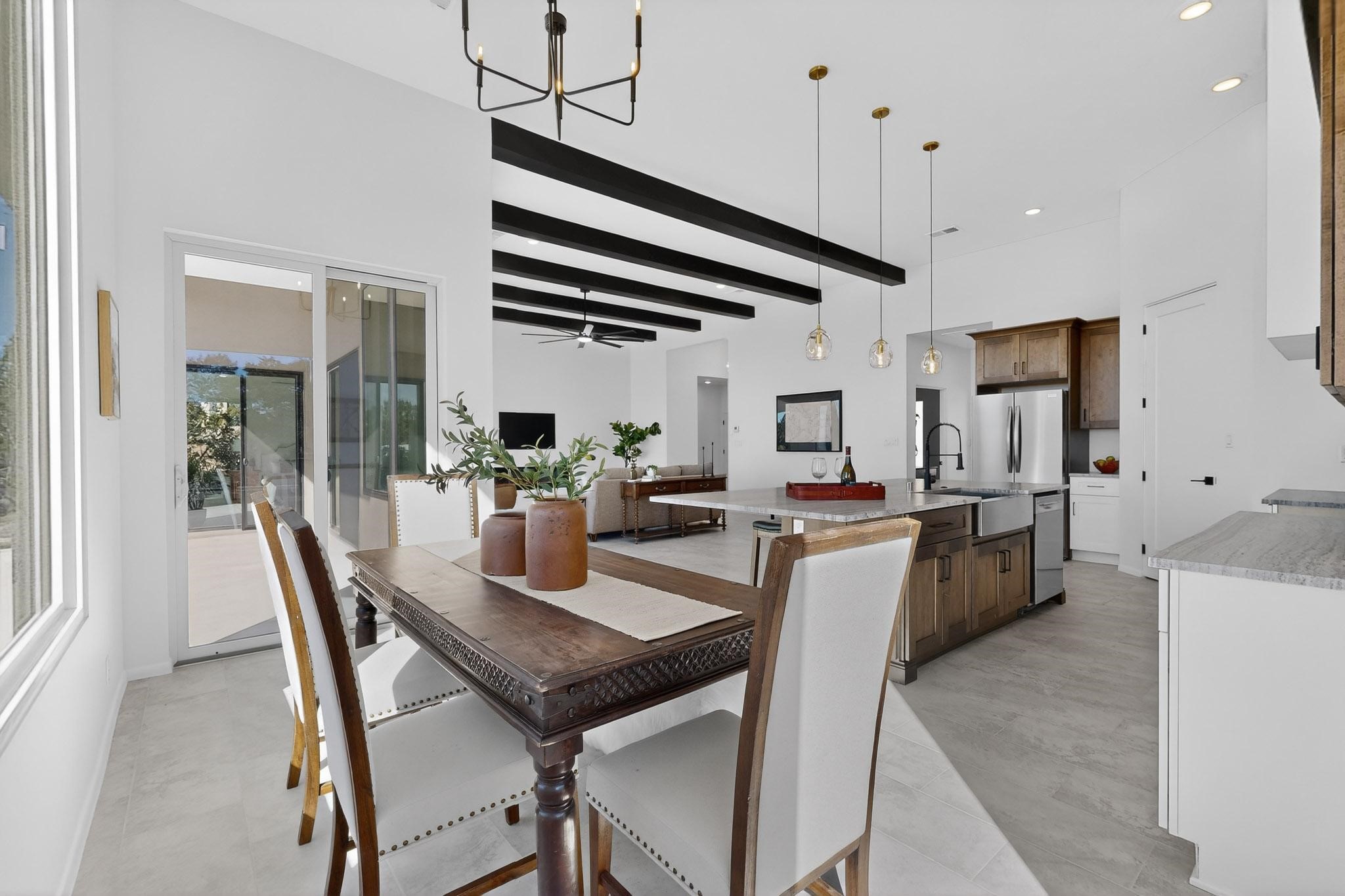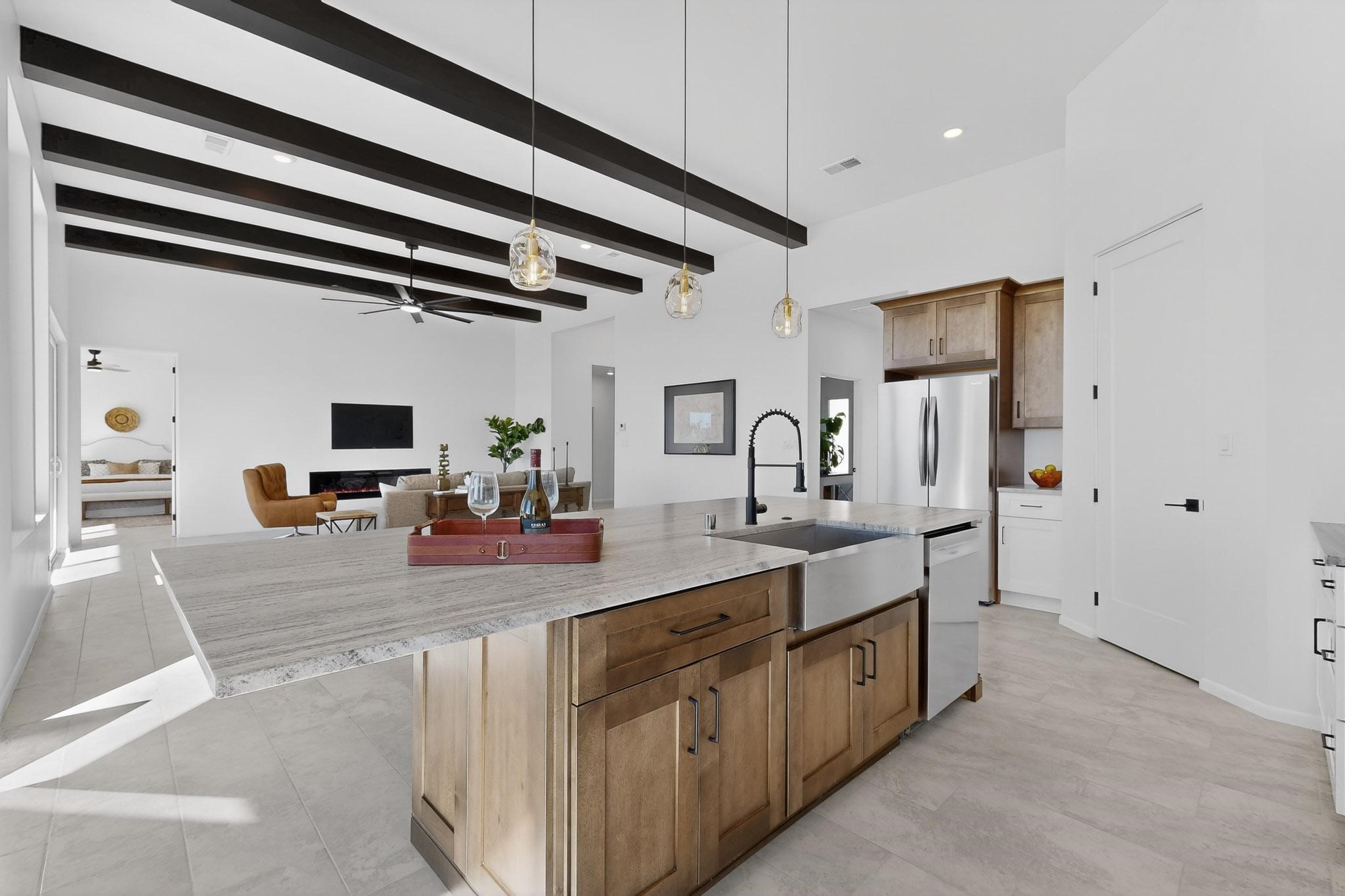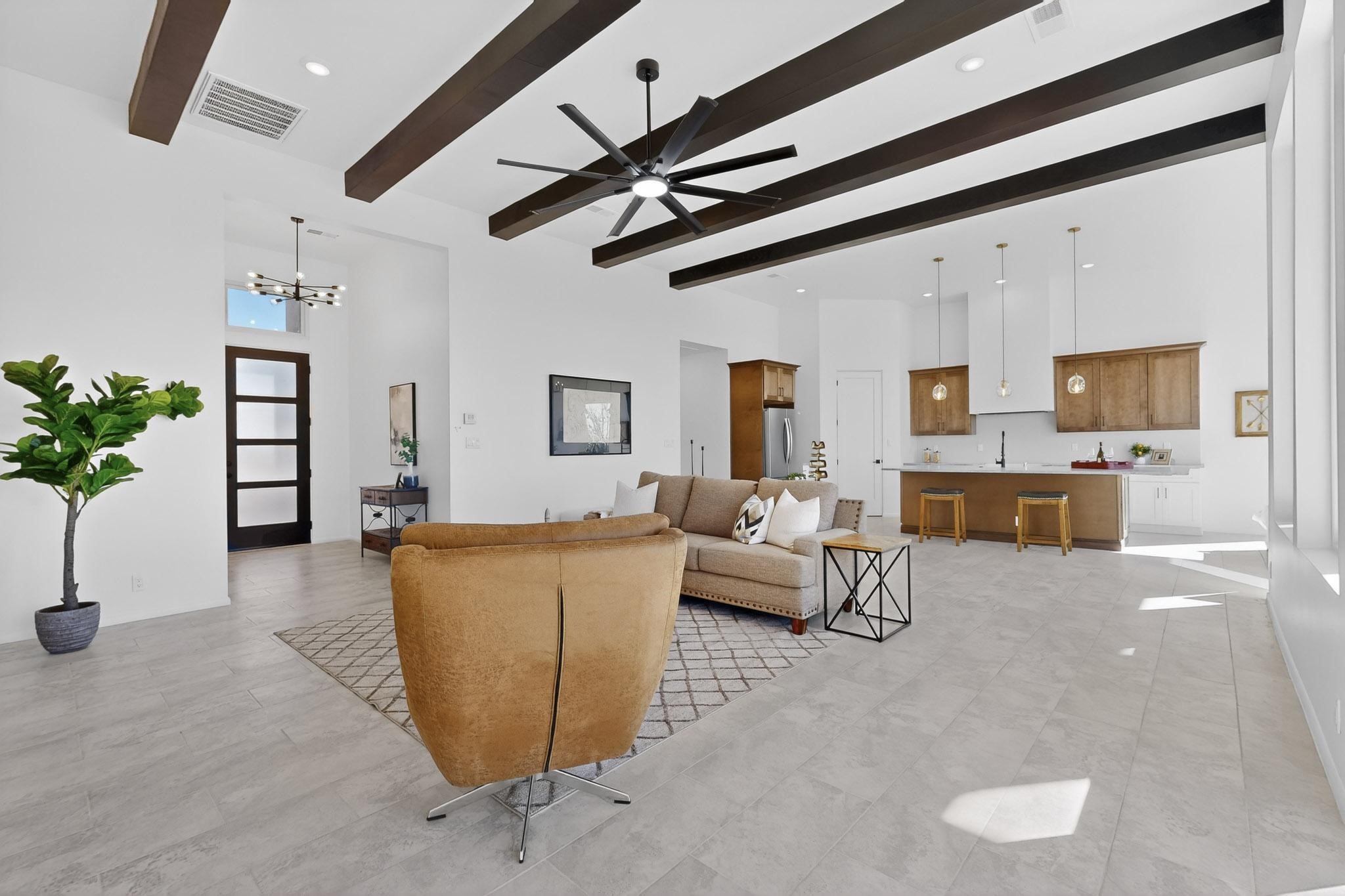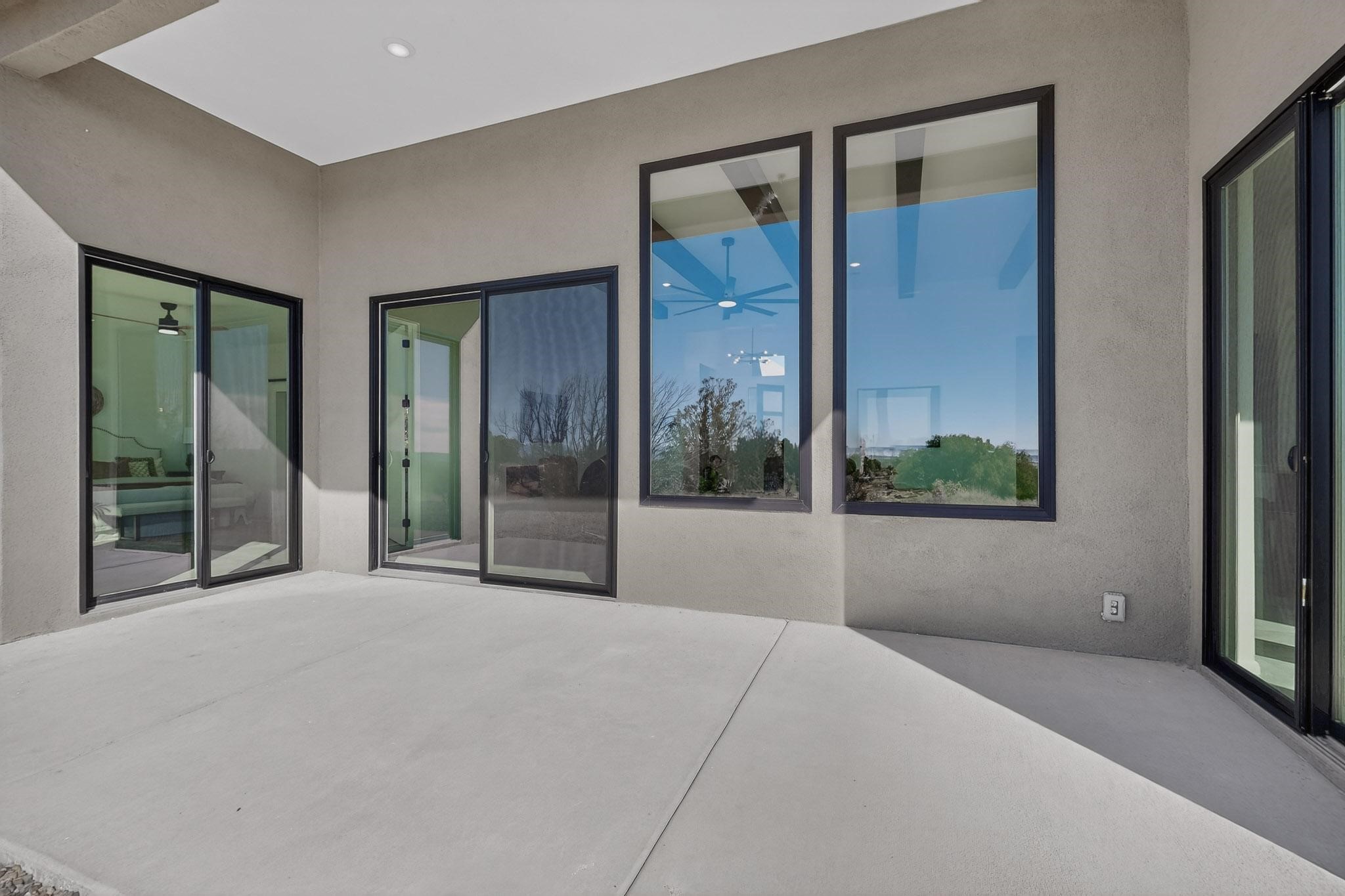 Welcome home! This stunning newly constructed contemporary-modern style home is perfectly positioned on 3.10 acres with stunning views of the Sandia Mountains and the Galisteo Basin. This 2,000 sq ft home has been designed to maximize the natural light and space, featuring high ceilings with contemporary style vigas, an open floor plan great for entertaining or keeping an eye on kids; with walls of windows taking full advantage of the expansive views!The modern kitchen includes a beautiful large granite island, large walk-in pantry, that flows beautifully into the living and dining areas, very functional and ideal for entertaining. Oversized windows and sliding glass doors invite abundant natural light and creates a seamless connection between indoor comfort and outdoor enjoyment; meanwhile framing the surrounding landscape like living artwork. The primary suite offers a peaceful escape with a luxurious spa inspired stand-alone bathtub, dual vanities, walk-in-shower with dual rain heads, and a spacious walk-in closet. Two additional bedrooms and a second full bath provide comfortable accommodations for family or guests.Enjoy the freedom of no HOA, space for horses, and the tranquility of rural living - while remaining just 20 minutes from downtown Santa Fe, close to nearby restaurants, shopping and outdoor activities. Brand new, beautifully designed, and ready to be lived in!