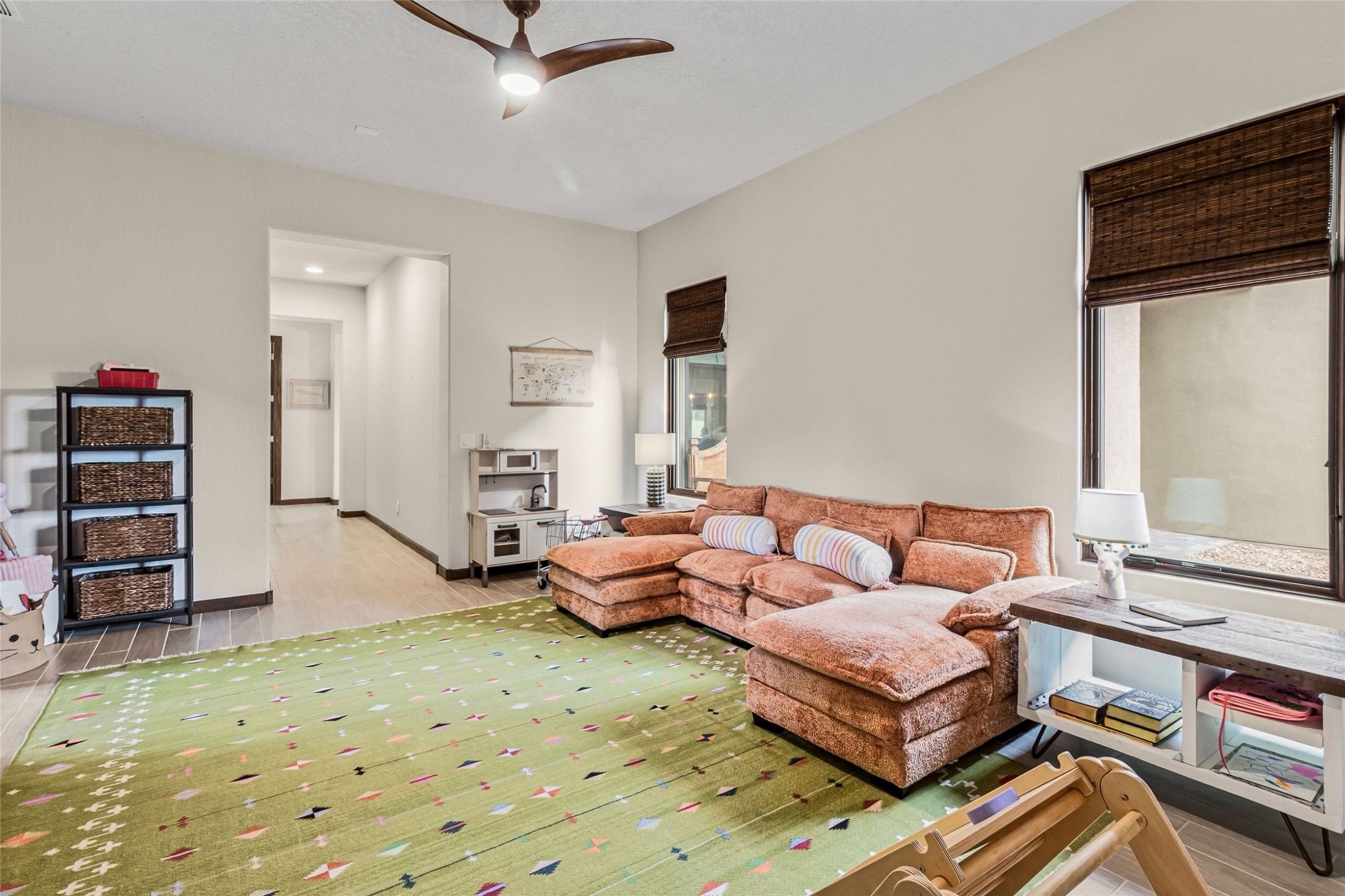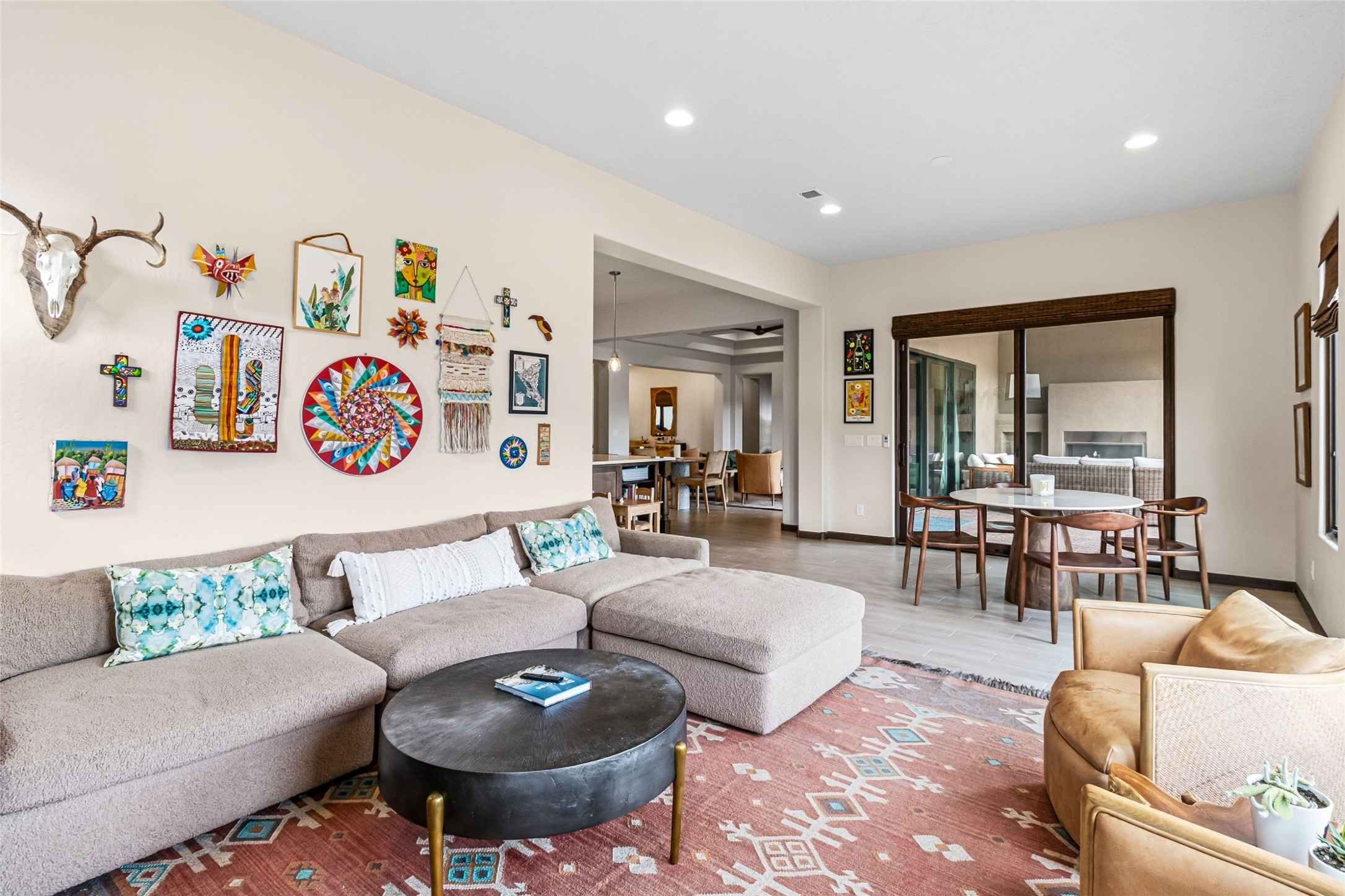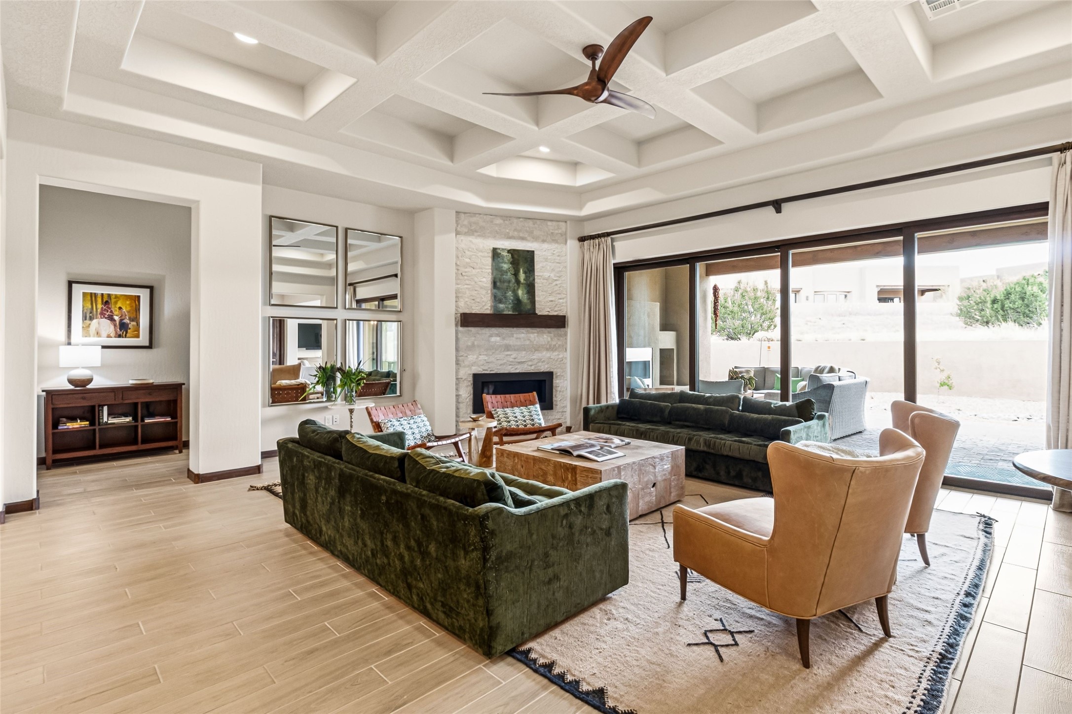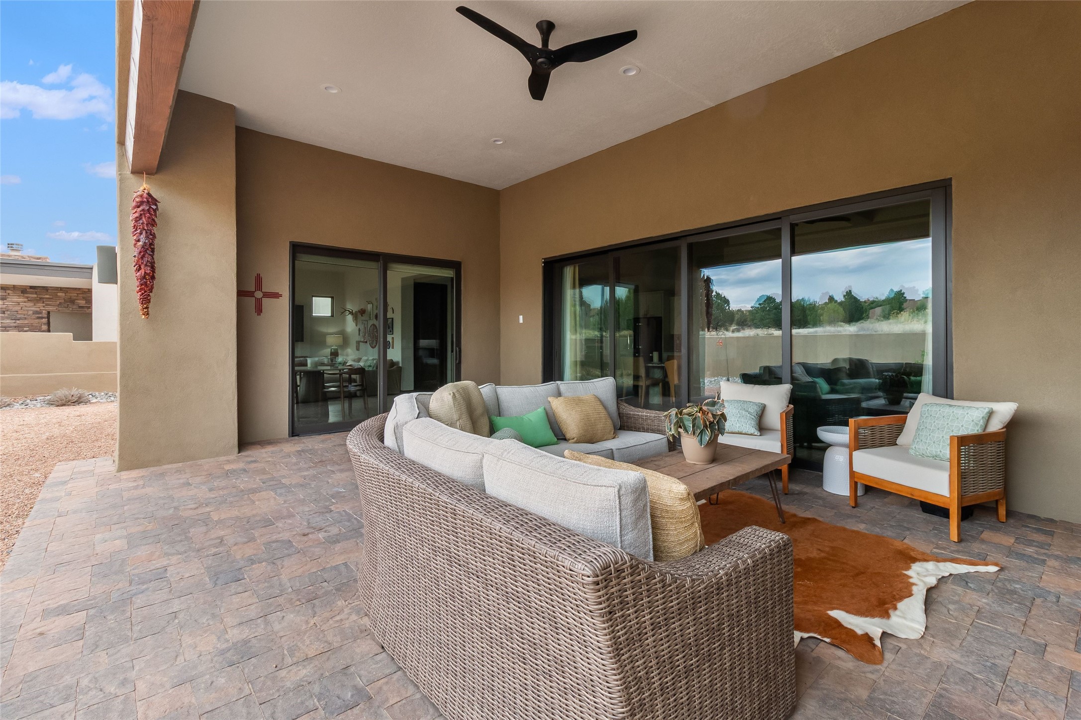 Set at the end of a quiet cul-de-sac in Las Terrazas at Las Campanas, this recently completed 2023 home offers a thoughtful blend of gathering spaces and private retreats. An inviting entry courtyard connects the main residence and a separate casita, creating flexibility for guests, work, or extended stays. Inside, the open layout unfolds with distinct yet connected living, dining, and kitchen spaces, along with a tucked-away family room for more relaxed moments. The kitchen centers around a generous island with quartz countertops, bar seating, and abundant prep space, complemented by double ovens, a coffee bar, and a large walk-in pantry. Retracting sliding glass doors open to a covered portal with a fireplace and a walled, low maintenance yard. The primary suite offers a spa-like bath and spacious closet, while three additional bedrooms are set along a private hallway with a secondary living area. A dedicated office with French doors, along with a tandem three-car garage, mudroom, and ample storage, complete a home designed for comfort, flexibility, and everyday ease. Adjacent to dedicated open space and walking paths, with HOA-covered maintenance, gated entry, 24-hour security, and EMT services.