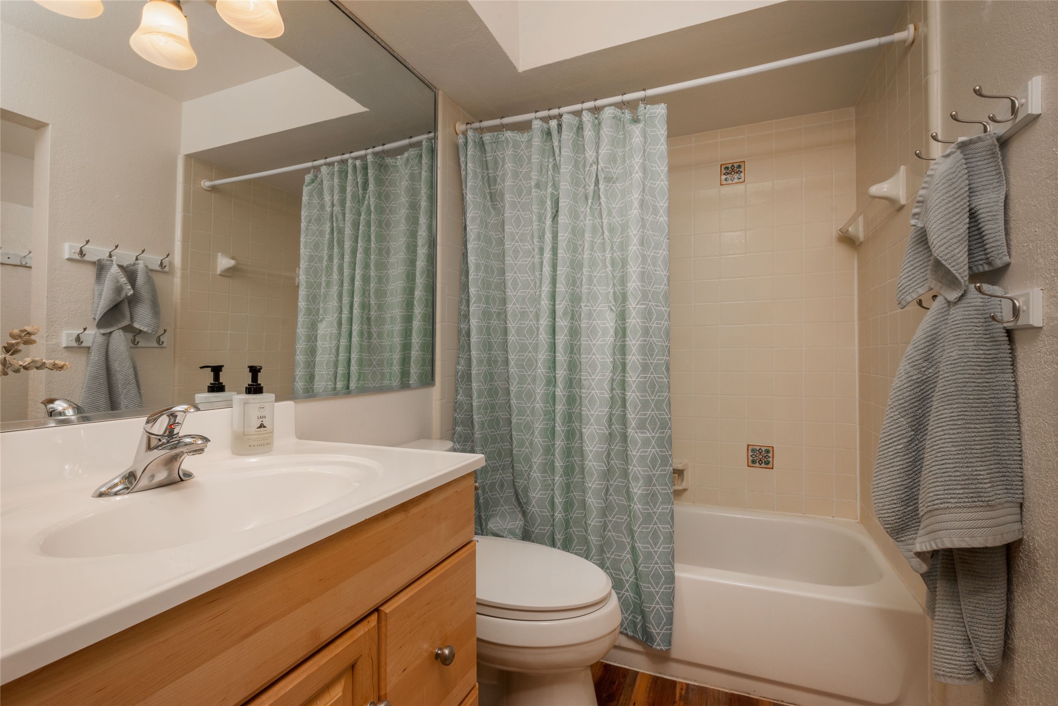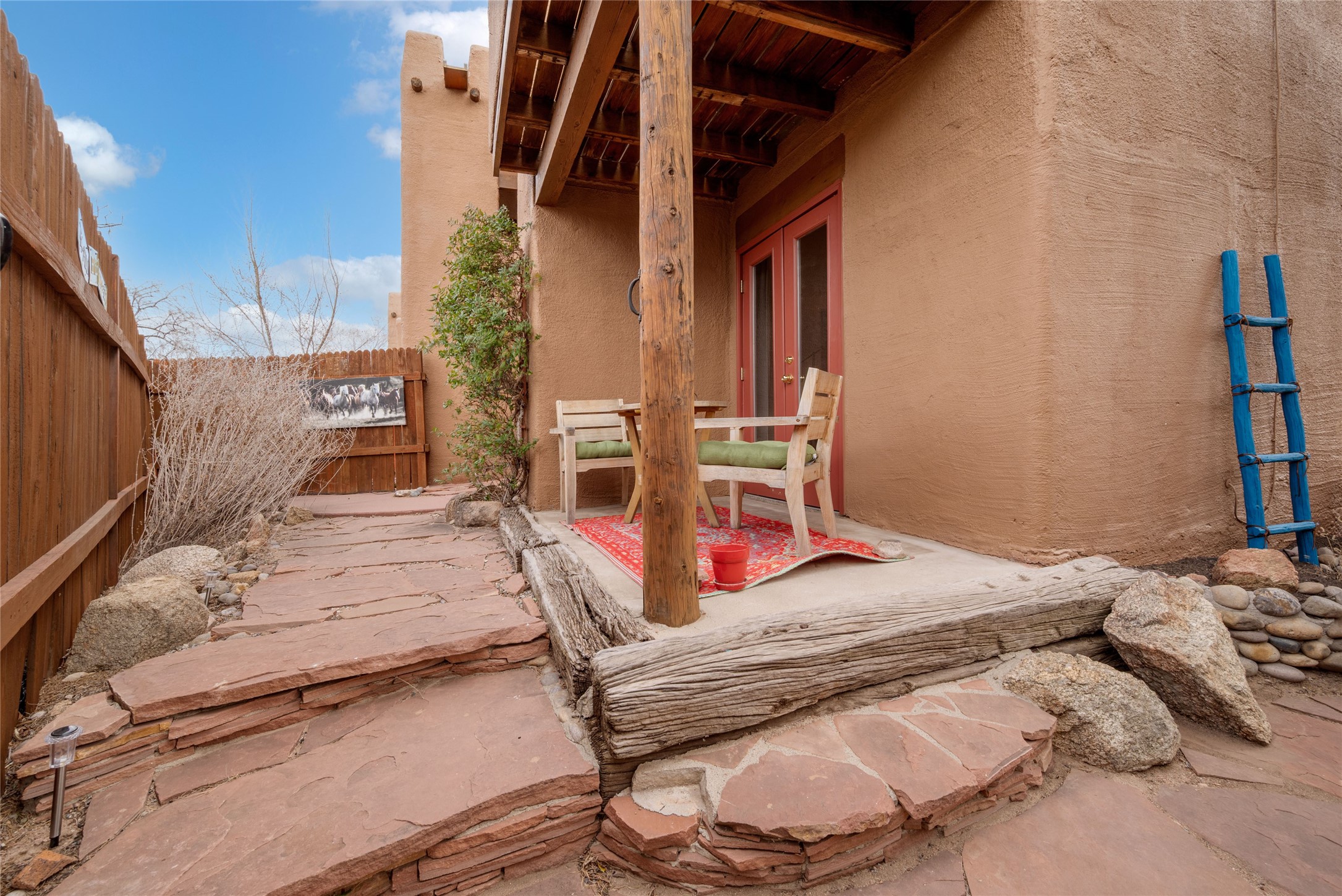 TURNKEY! Are you looking for the perfect condo to live full time, as a pied-a-terre, or an investment property? Here it is, completely furnished, at the sought after Tierra de Zia condo gated community in mid-town Santa Fe! A corner, ground level unit with a beautiful private deck, patio and gardens. Living room with french doors, lots of light, and a kiva fireplace. Kitchen complete with washer and dryer and double door refrigerator with ice and water dispenser. Maple cabinetry. Ensuite bedroom with walk-in closet off the bathroom. Wood/vinyl wide plank flooring throughout. Designated parking directly in front of the unit. Sunset views! Beautiful grounds with ponds, fountains and walking trails through a natural setting. On-site management.