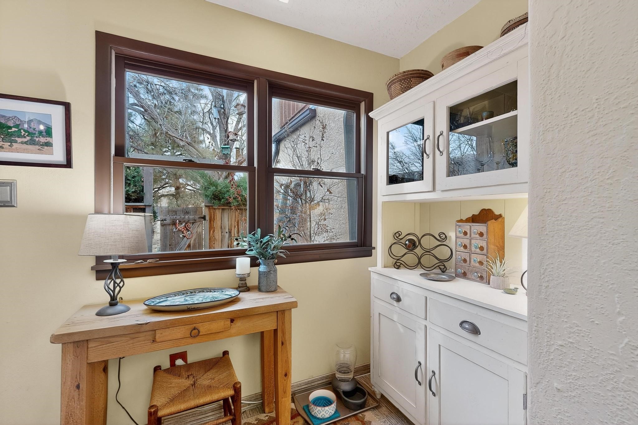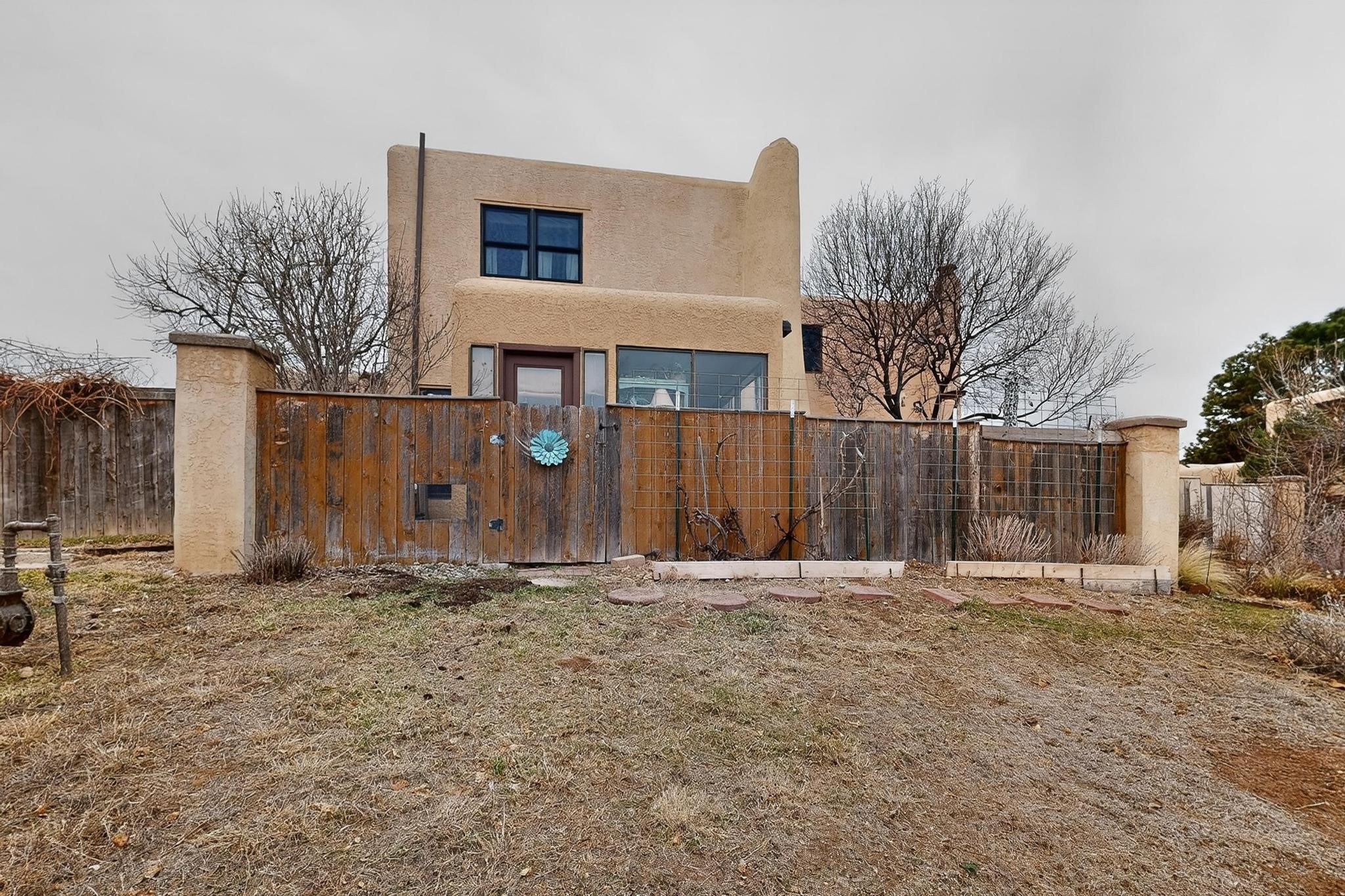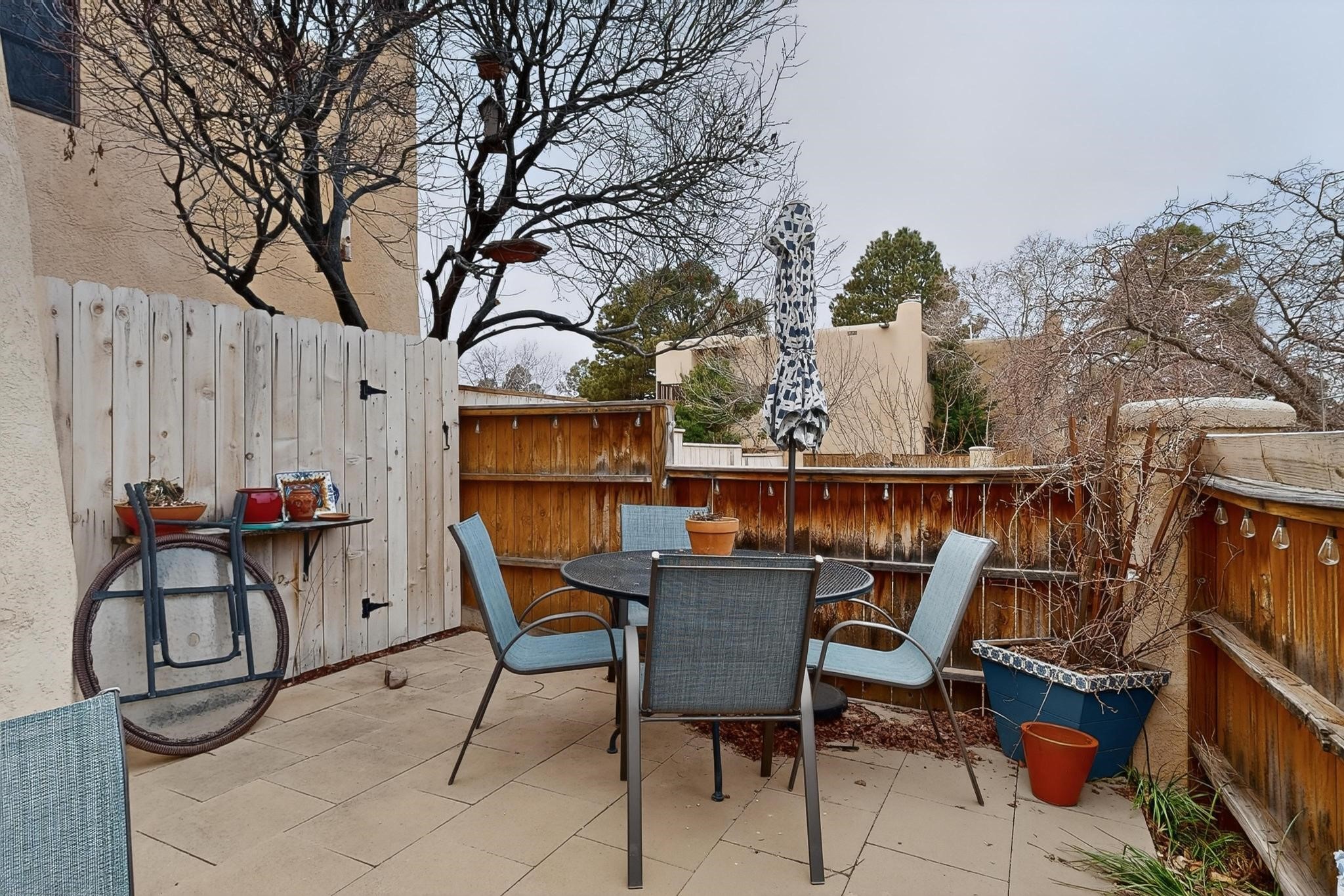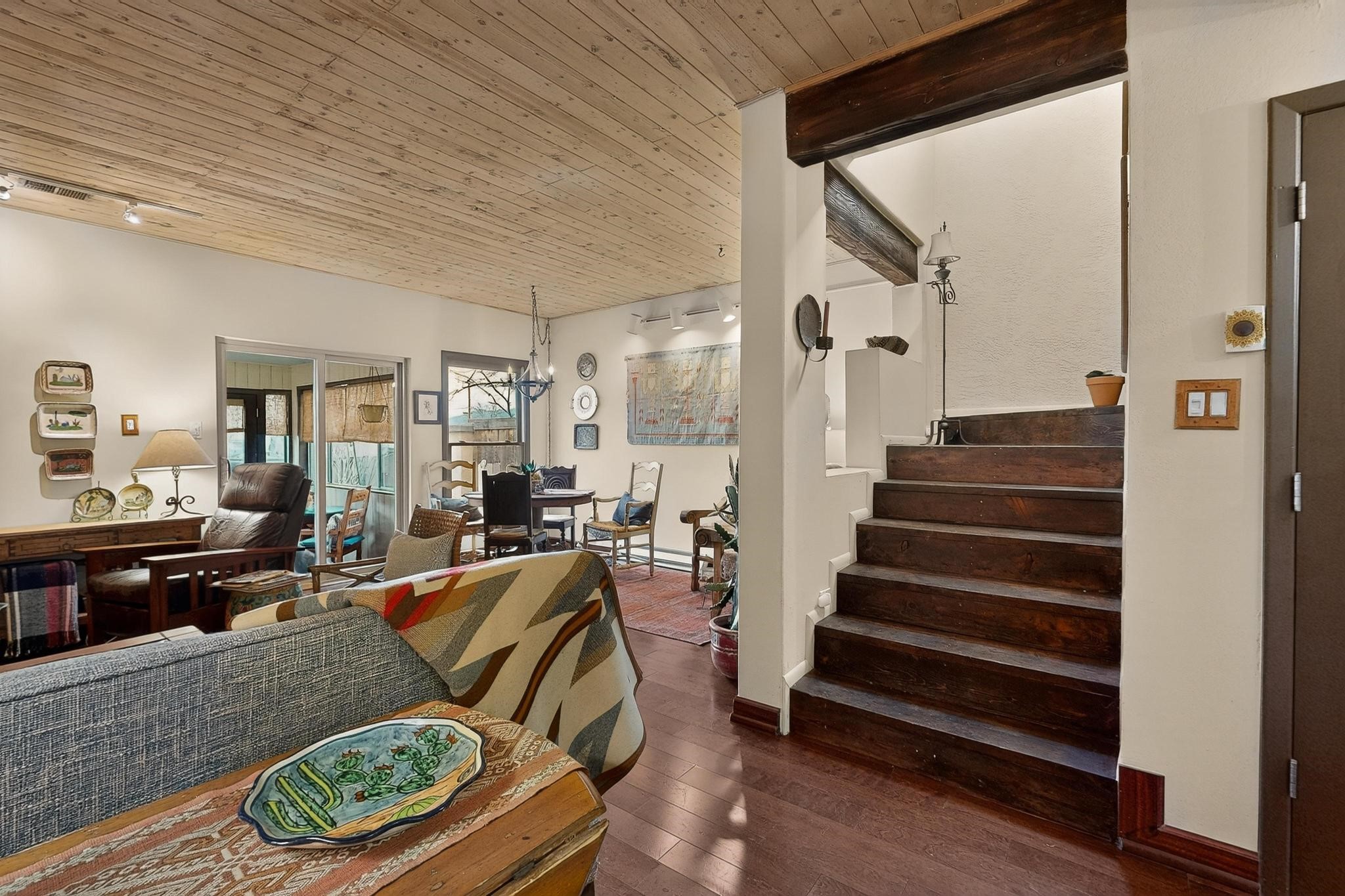 Charming townhome, located in the desirable Park Plazas neighborhood! 2 bedrooms, 2.5 baths (one is a 3/4), about 1330 square feet and many wonderful upgrades! Downstairs you will enjoy a lovely living room with an electric, kiva fireplace, a beautiful galley kitchen and dining room area, a spacious laundry room with storage and an enclosed, unheated sunroom where you can sit and enjoy your morning coffee! Upstairs is the 2 bedrooms, both with bathrooms, one with a new closet, the other with a wood burning, kiva fireplace, and wonderful views. The cute backyard has a sitting area where you can enjoy the Santa Fe sun, the Rose of Sharon on the right hand side and the amazing grapevines that are on the fence. as well as storage for your landscaping tools. This home is perfect if you are downsizing or are looking for a second home. Feel the love, once you step into the front door...