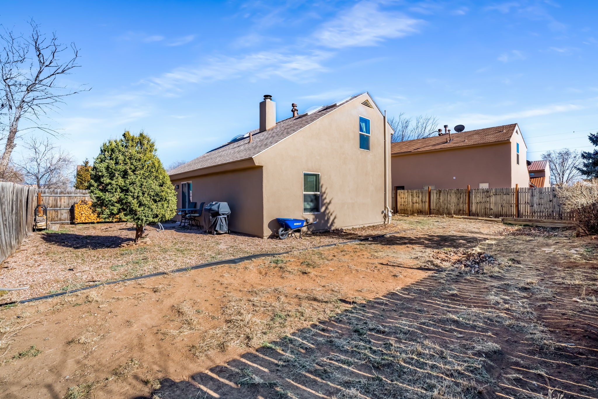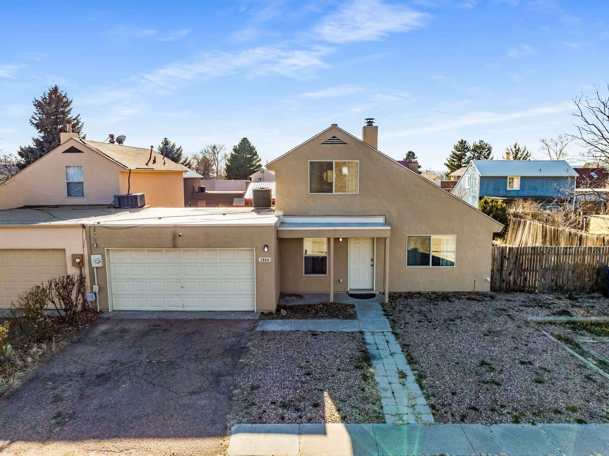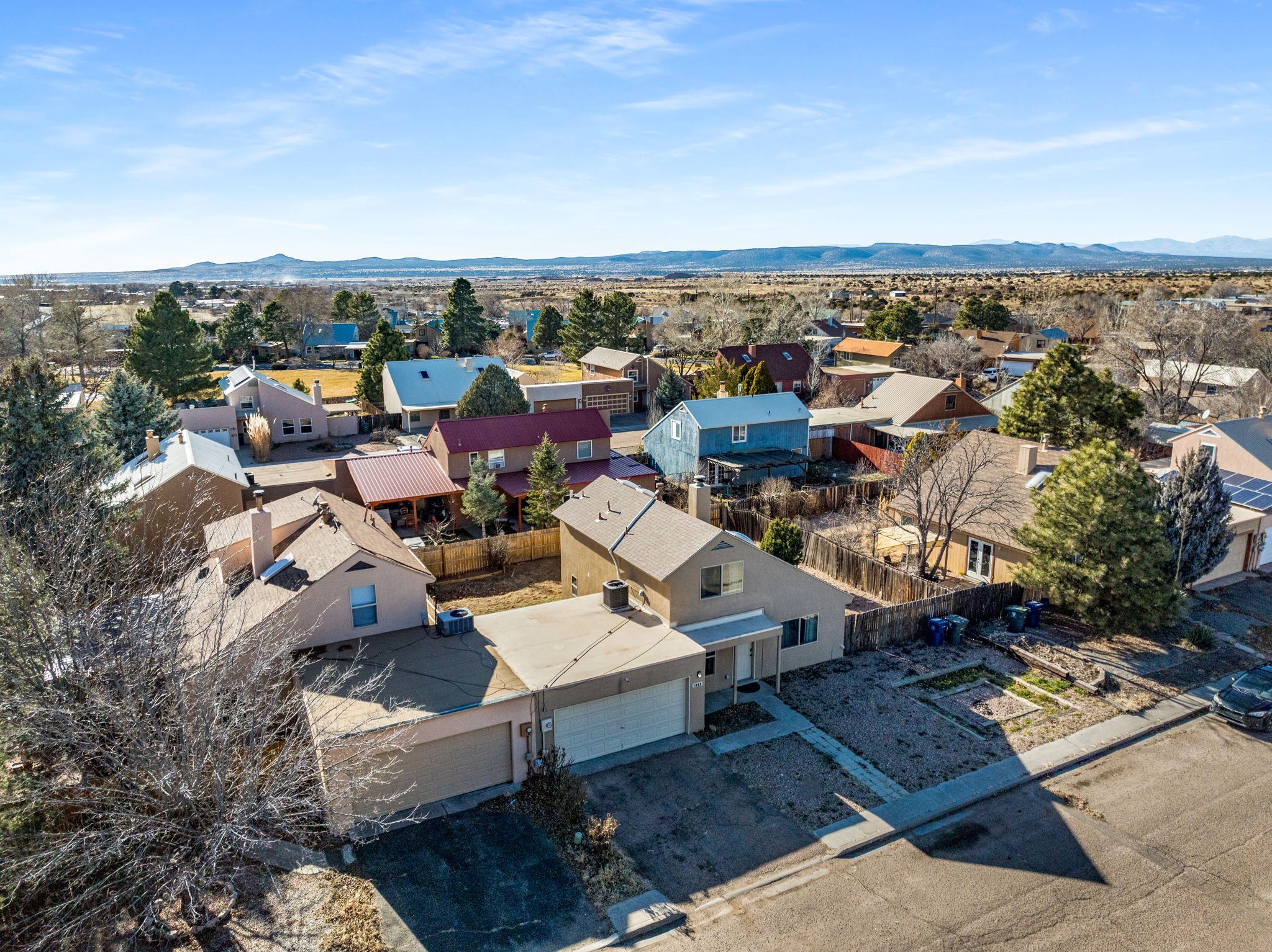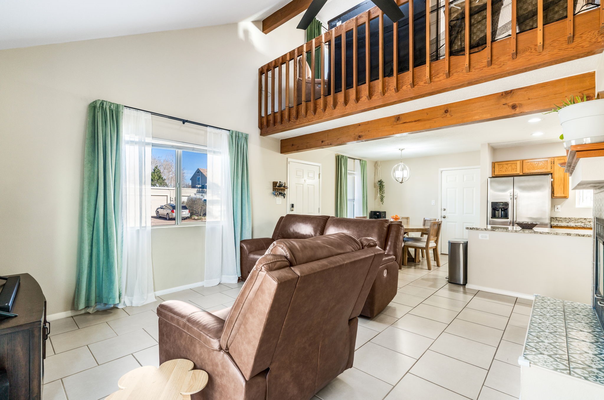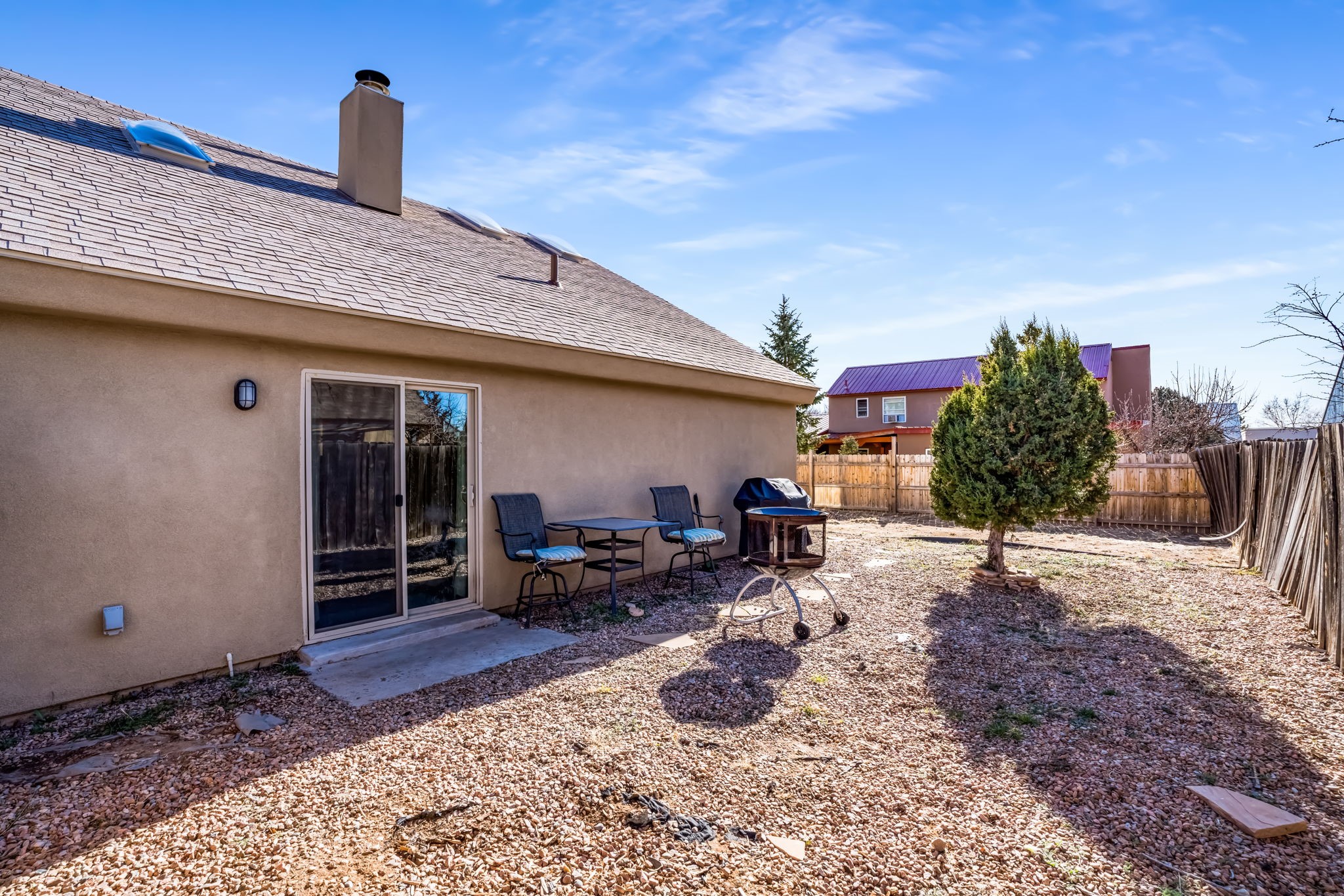 Situated in the Fairway Village community, this thoughtfully designed home offers comfort, functionality, and recent improvements throughout. The layout provides flexibility with a bedroom and full bath on the main level, while an additional bedroom and bathroom are privately positioned upstairs. The living space feels open and airy with elevated ceilings that enhance the sense of volume. Natural light filters in from above through upper level skylights, adding brightness to the interior. A spacious loft offers versatile use for a second living area, workspace, or hobby room. Outside, the generously sized enclosed backyard creates room for outdoor gatherings, pets, or quiet relaxation. Recent updates include upgraded windows, refreshed exterior stucco, updated kitchen appliances, granite countertops, and a newly installed roof(2021), offering added value and peace of mind. Conveniently located near parks, retail centers, schools, Interstate 25, and NM 599, this home combines neighborhood charm with easy access to daily essentials and commuting routes.