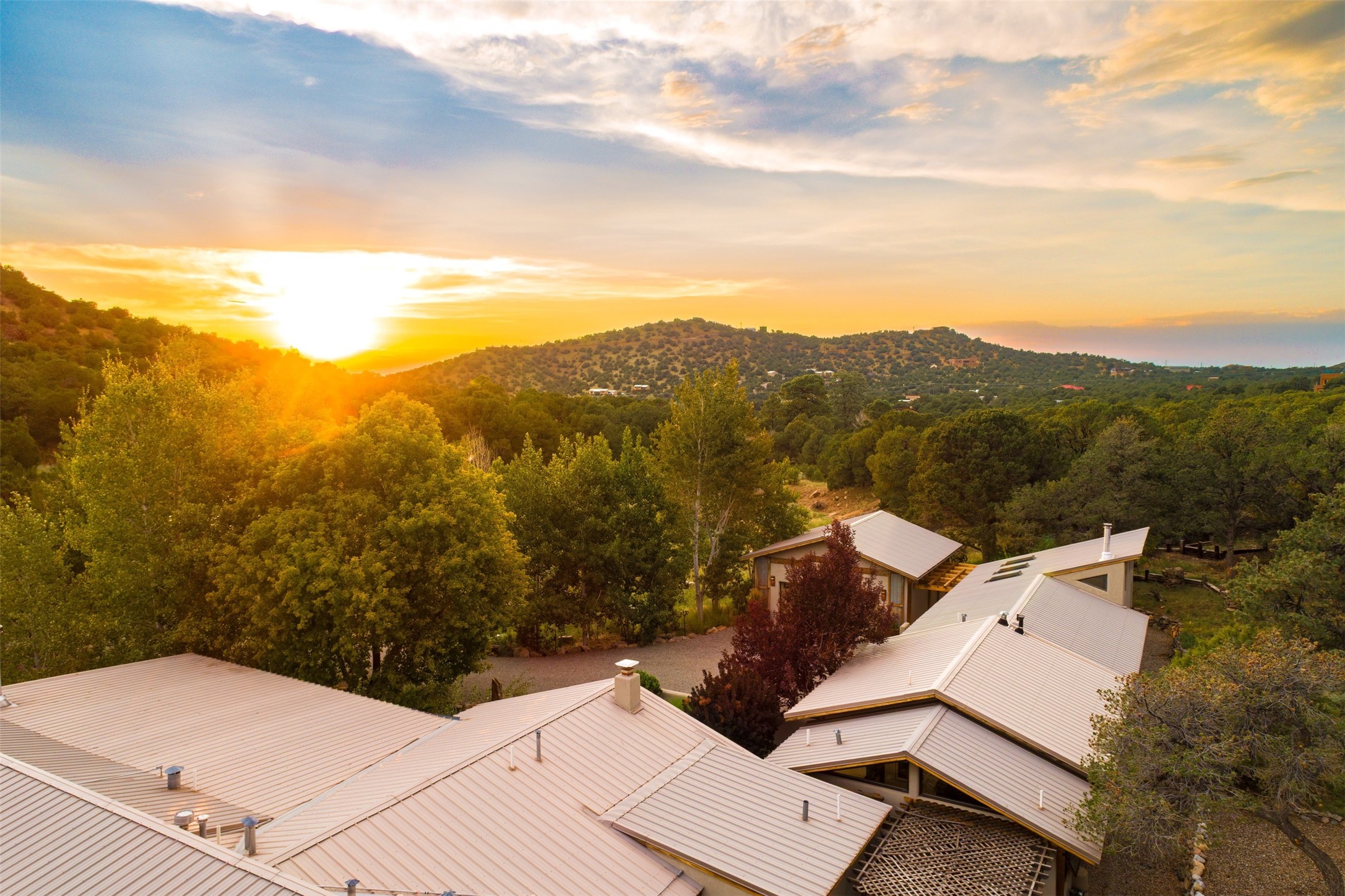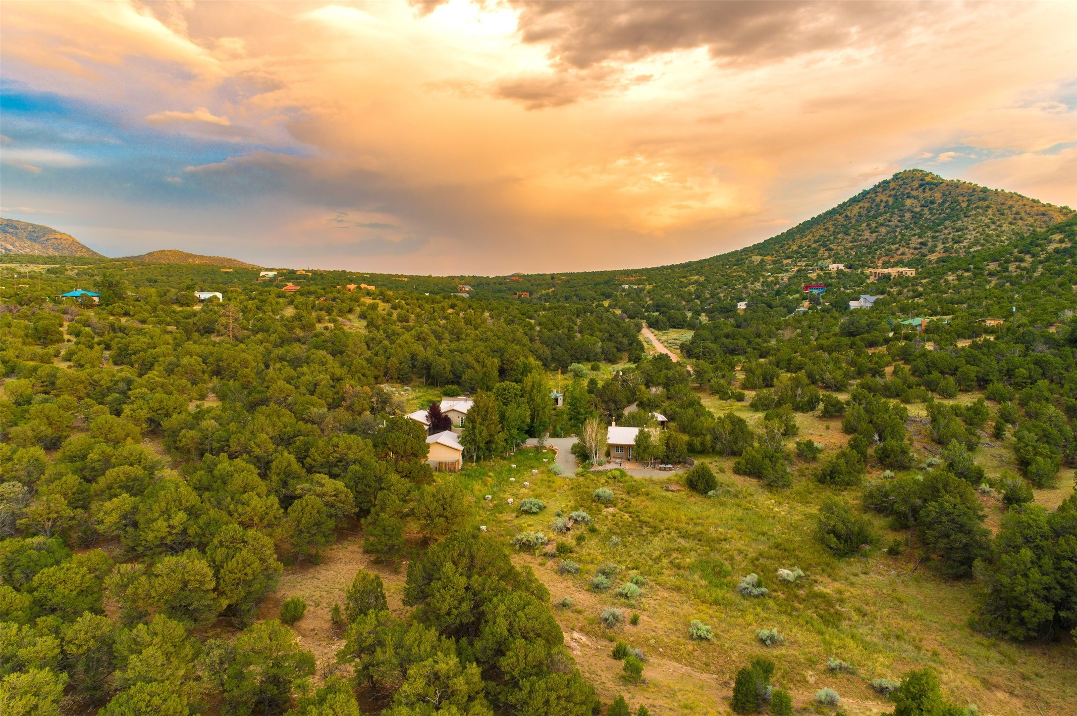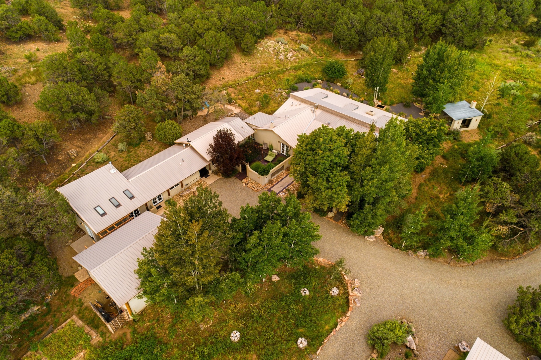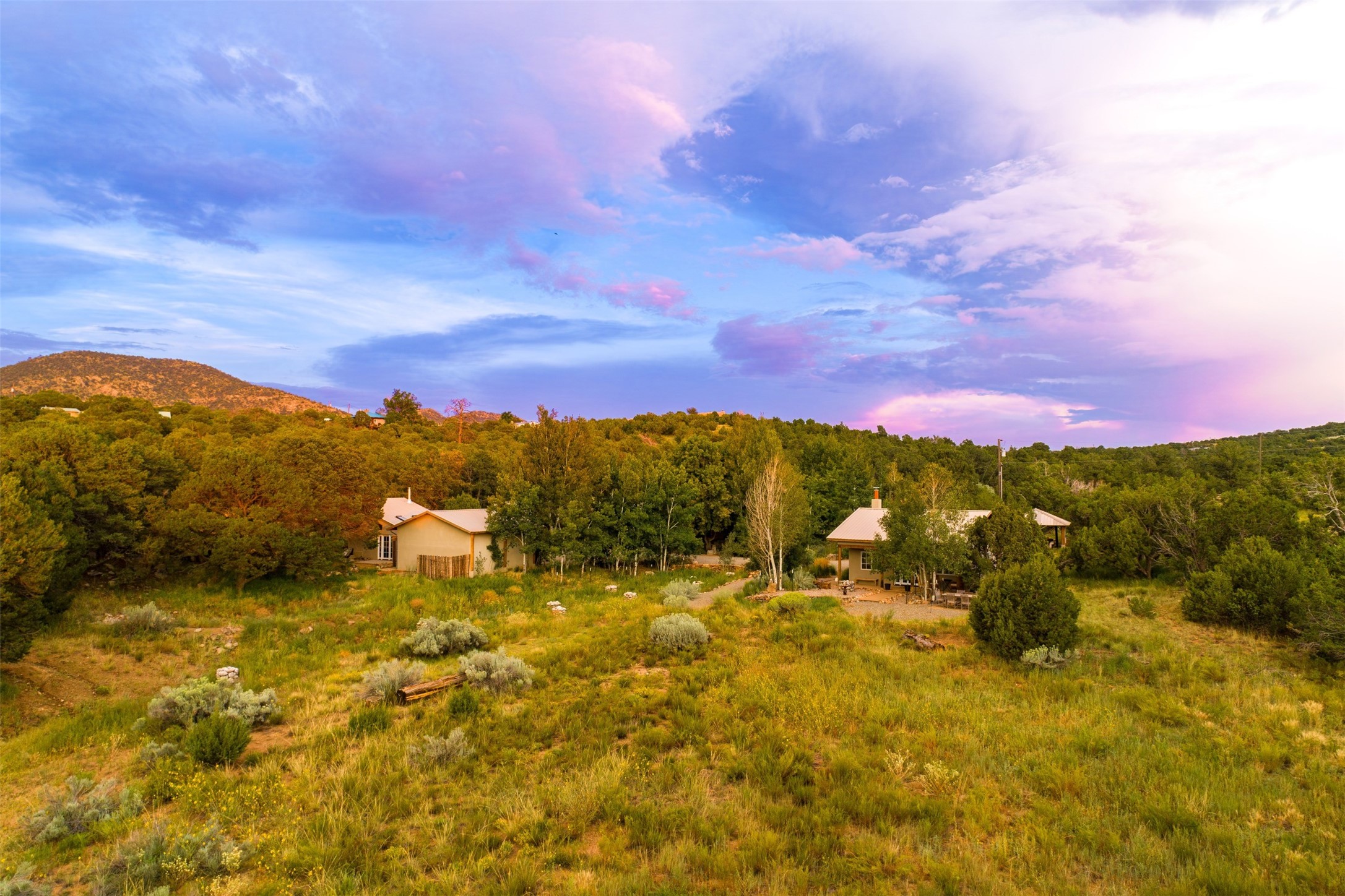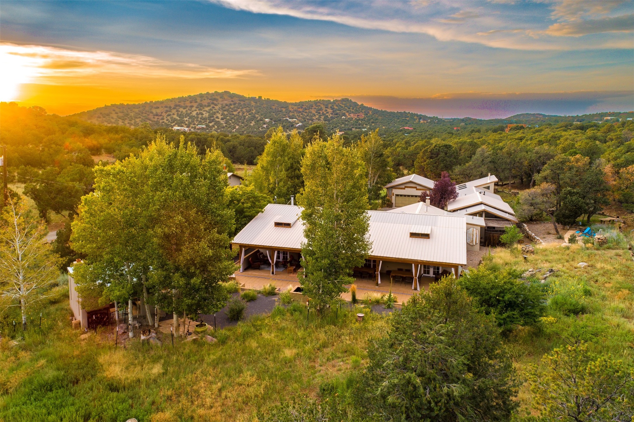 LIVE, WORK, ENTERTAIN, in your own secluded sanctuary located on 7.08 Sunlit Hills acres. 10 Sabina Lane is a sophisticated & contemporary COMPOUND offering a wide variety of living & working spaces in a stunning pastoral setting, 15 minutes from Santa Fe. MAIN HOUSE - 2,187sqft open concept Great Room w/beamed cathedral ceiling, fireplace, Chef's kitchen w/granite counters, high end appliances, 2 spacious bedrooms w/en suite bathrooms, laundry area, 5 sets of French door leading to 58 foot long covered portal. GUEST SUITE - 530sqft is steps from the main house & offers an inviting bedroom, spa inspired bathroom, custom tiles, soaking tub, is adjoined by a private tranquil terrace. STUDIO/OFFICE - 994sqft amazing work space with vaulted ceiling, view windows, areas for an office, art or other work related spaces, powder room & covered portal entry. One would never need to leave the property to conduct all their business or artistic work. CASITA - 683sqft Set apart from the main house, the casita has a full kitchen w/stone counters, kiva fireplace, covered portal, stackable washer/dryer. The casita has produced additional income as an Air B&B GARAGE - 60 sqft Fully finished, 2car capacity, storage areas. GAZEBO -196sqft An inviting space away from the home for meditation & relaxation. PAVILION -241sqft Wonderful retreat area w/fireplace, banco seating, ceiling fan, designer lighting. The property is accessed through a gated entry, a graveled driveway w/recently added retaining wall. Many additional aspects - electric convection stove top, extensive & significant landscaping,10 zone irrigation system,2 owned propane tanks (500 and 250 gallons), 5 fireplaces, an amazing flower filled meadow, healthy pinon, aspen and juniper trees, eclectic river rock pylons, antique wooden bathroom cabinet, a wealth of ceiling fans & mini split in the primary bedroom. For folks seeking a destination, full time live/work situation, please consider 10 Sabina Lane.