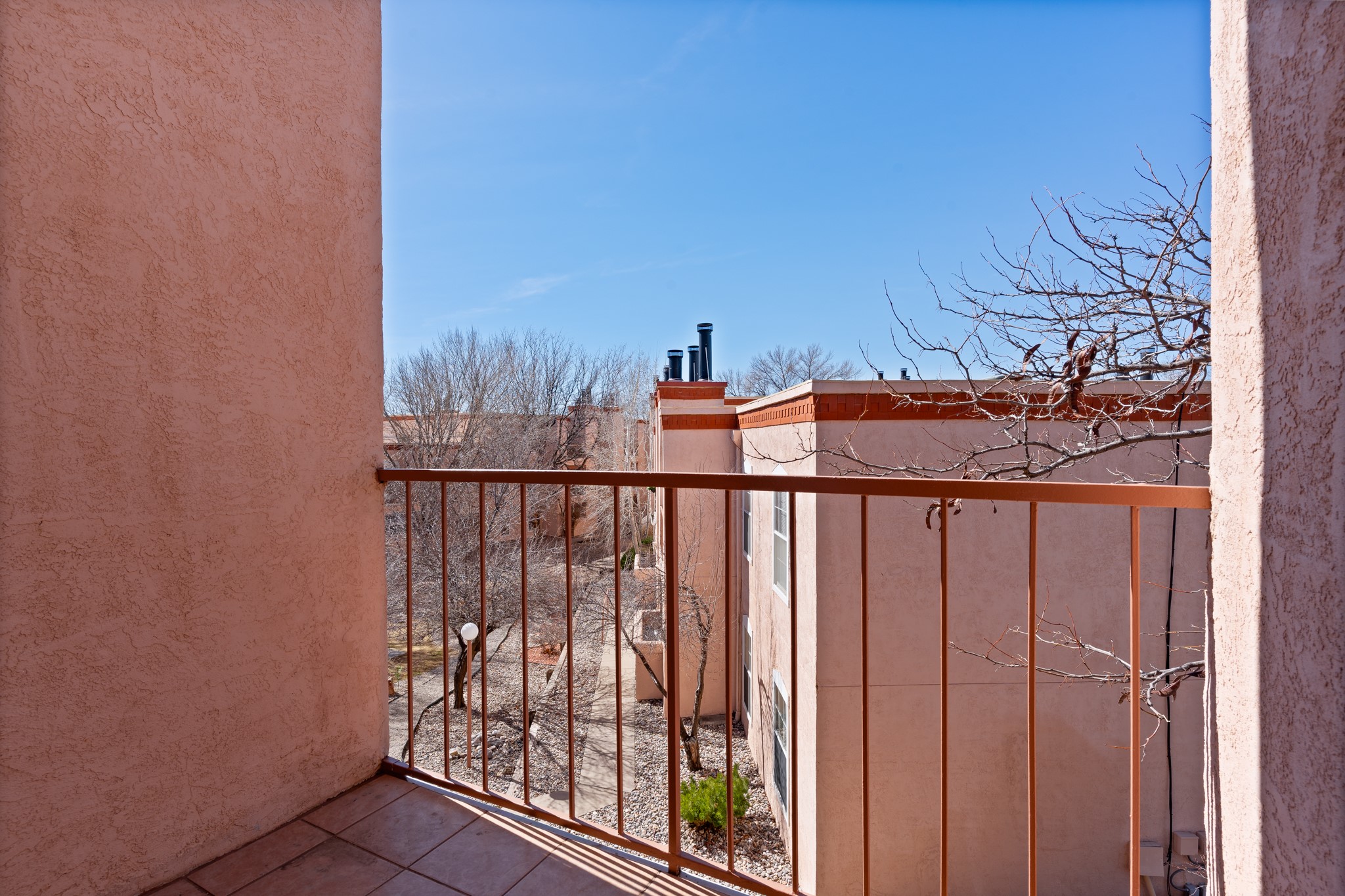 Lovely 2 bedroom, 2 Bath unit in Zia Vista Condominiums. Upstairs unit letting in more ligh. Set on the north side of the complex away from Zia Road traffic. Nearby gate for walking paths. True convenience with Pool, Clubhouse, gym and gated security entrance.