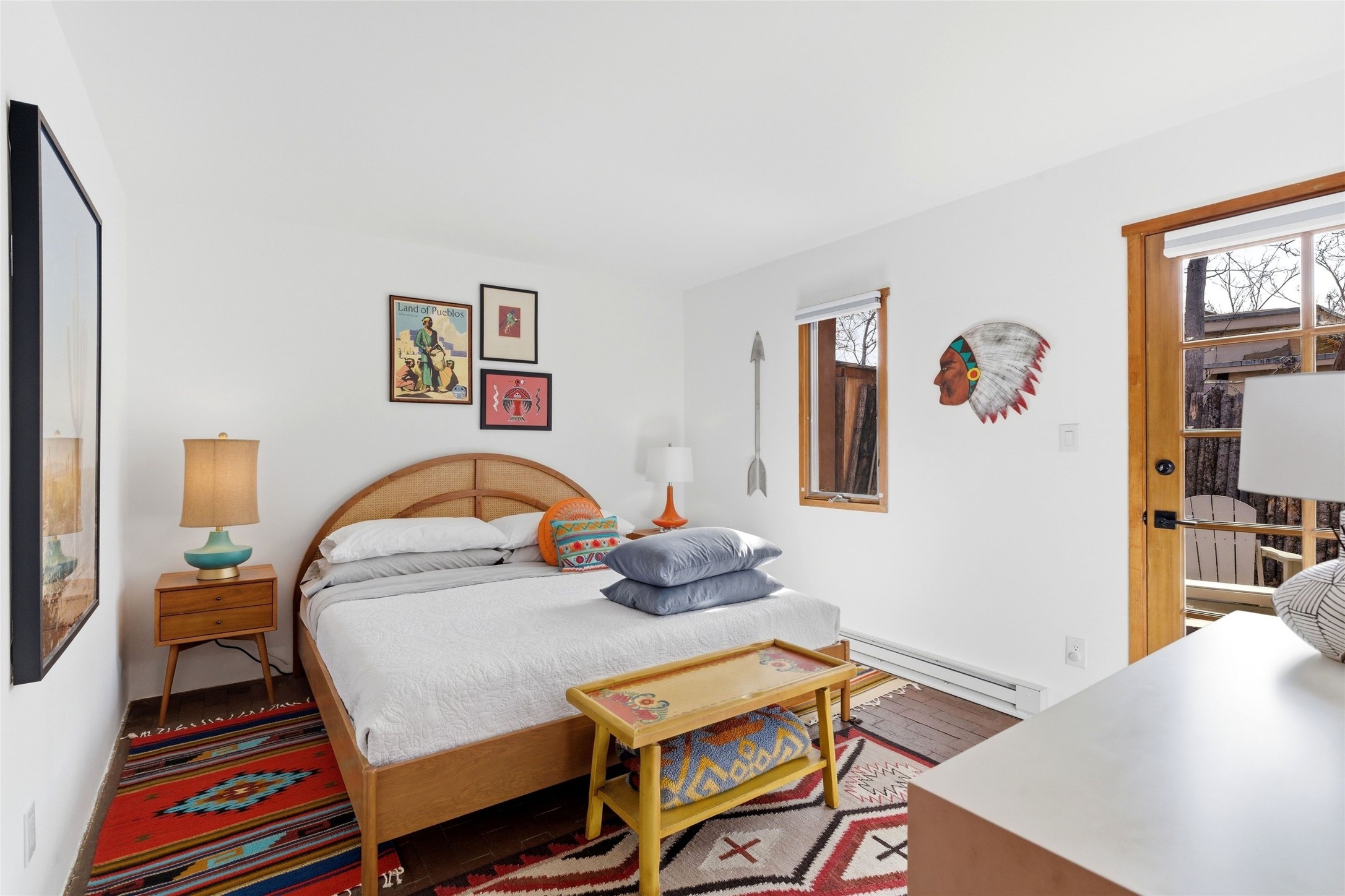 Cheerful, updated South Capitol 1-bedroom, 1-bath condo with a private, shaded courtyard. Whether as a primary residence, a stylish pied--terre, or a potential investment in a sought-after central district, this property represents an opportunity to enjoy the Santa Fe lifestyle. Single level; no interior steps. Iconic Santa Fe touches with wood beamed ceilings, kiva fireplace, and brick floors. Newly renovated kitchen with stainless steel appliances. Bonuses are one designated parking space, deluxe washer/dryer, and a Samsung Frame TV that transforms into a digital art display. Perfect location, close proximity to everything including the Railyard, Canyon Road and the Plaza.