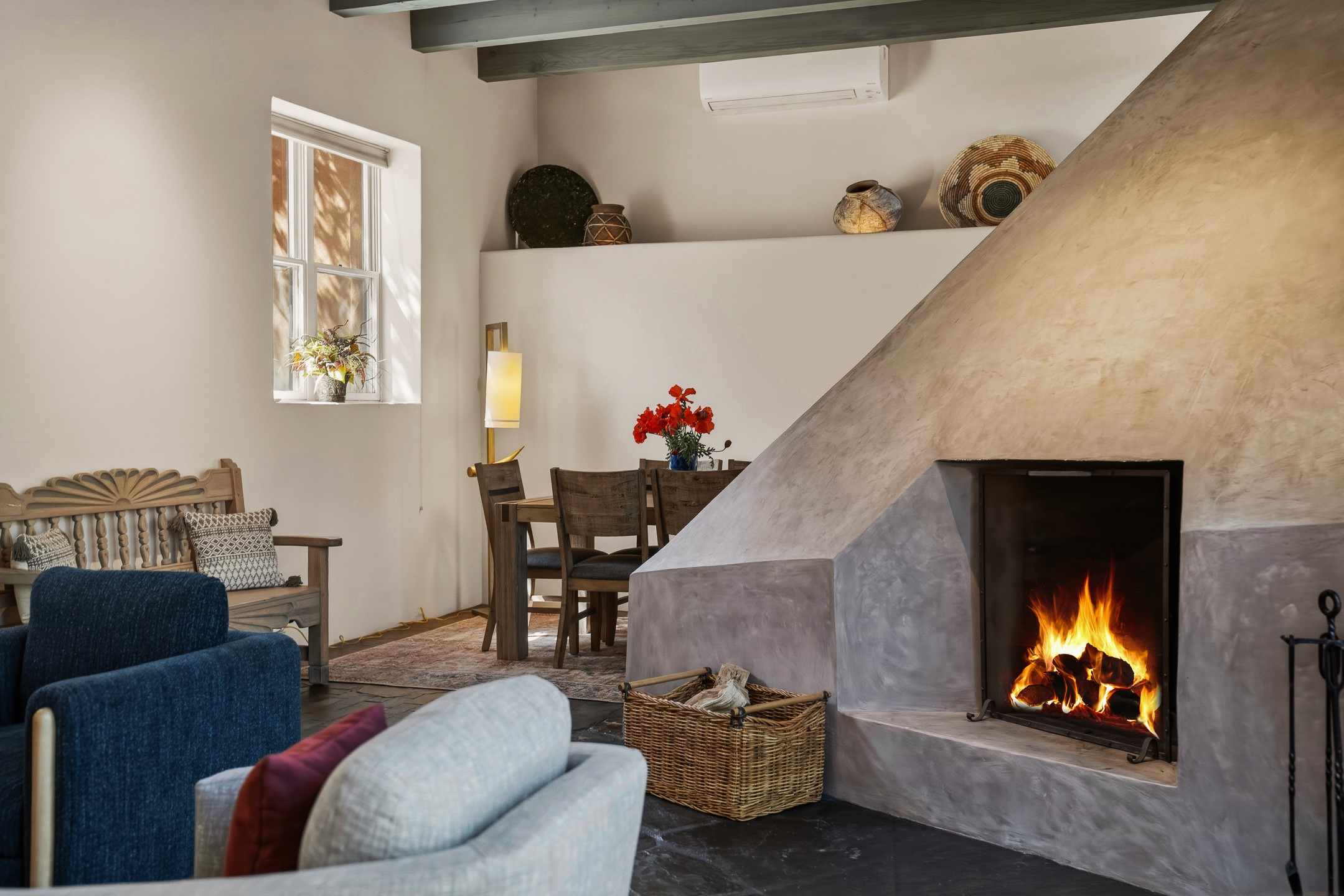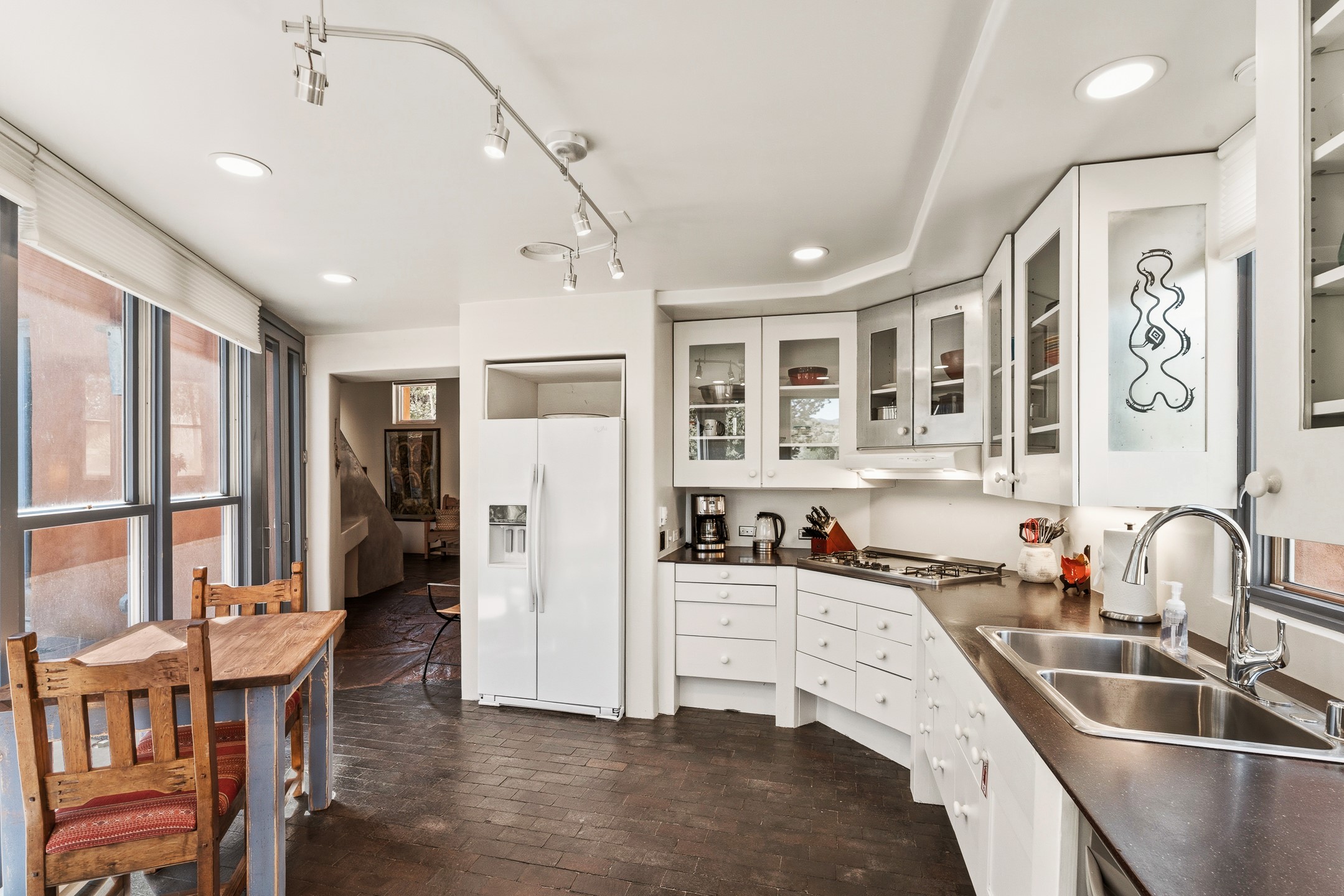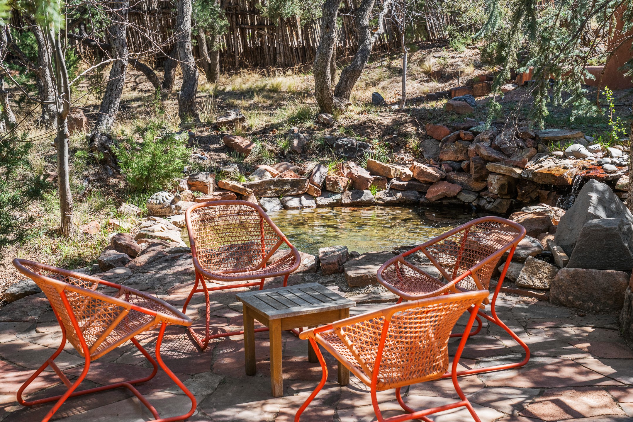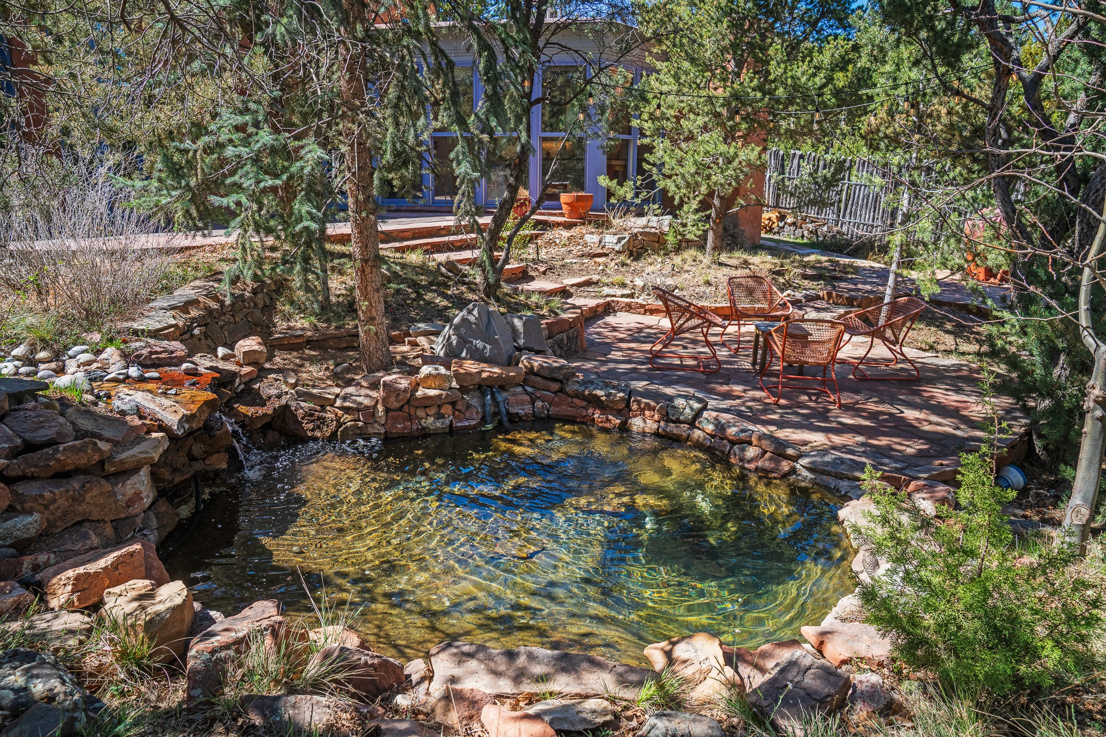 An exceptional offering on Santa Fe's coveted Eastside, moments from Canyon Road, this refined residence on Camino del Monte Sol embodies contemporary design and timeless Santa Fe style. Designed by the award-winning Texas based Lake Flato Architects, the home is a study in light, form, and seamless indoor-outdoor living. The interiors unfold with effortless elegance, with soaring wood-beamed ceilings, a striking modern fireplace, and an artful circular den anchored by a built-in banco beneath a dramatic skylight that draws the sky inward. Expansive glass doors bathe the open living space in natural light, framing tranquil views of the surrounding landscape. The thoughtfully designed kitchen is both light-filled and inviting, with generous windows that connect you to the serenity of the outdoors. Three well-appointed bedrooms and two and a half baths offer comfort and privacy, including a serene primary suite with a spa-inspired bath, soaking tub, and oversized shower. Outdoors, a private sanctuary awaits with lush mature juniper and pion, a gently cascading fountain over river rock, and a peaceful pond that invites quiet reflection. A rooftop terrace, complete with a traditional kiva fireplace, captures sweeping views of the Sangre de Cristo Mountains and the surrounding historic neighborhood. Currently operating as a successful short-term rental, this extraordinary property presents a rare opportunity to own an artful retreat in one of Santa Fe's most treasured locations.