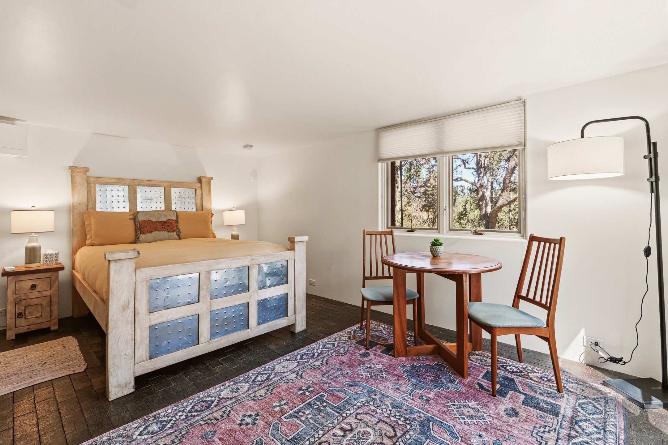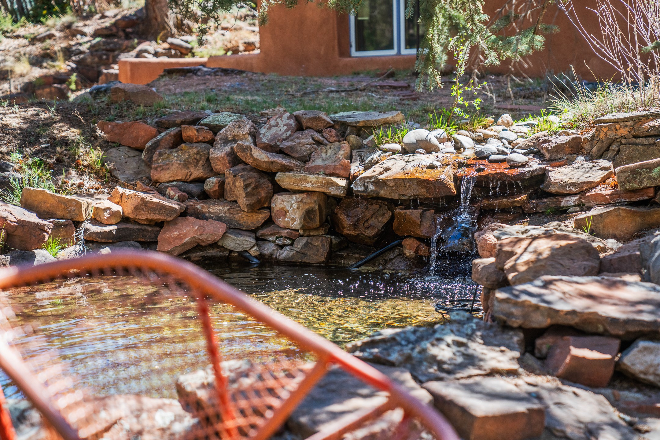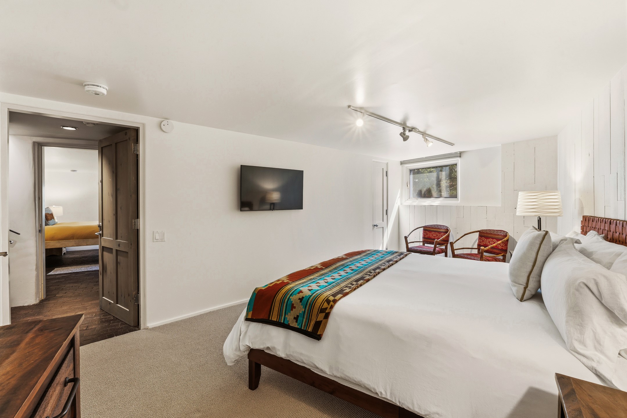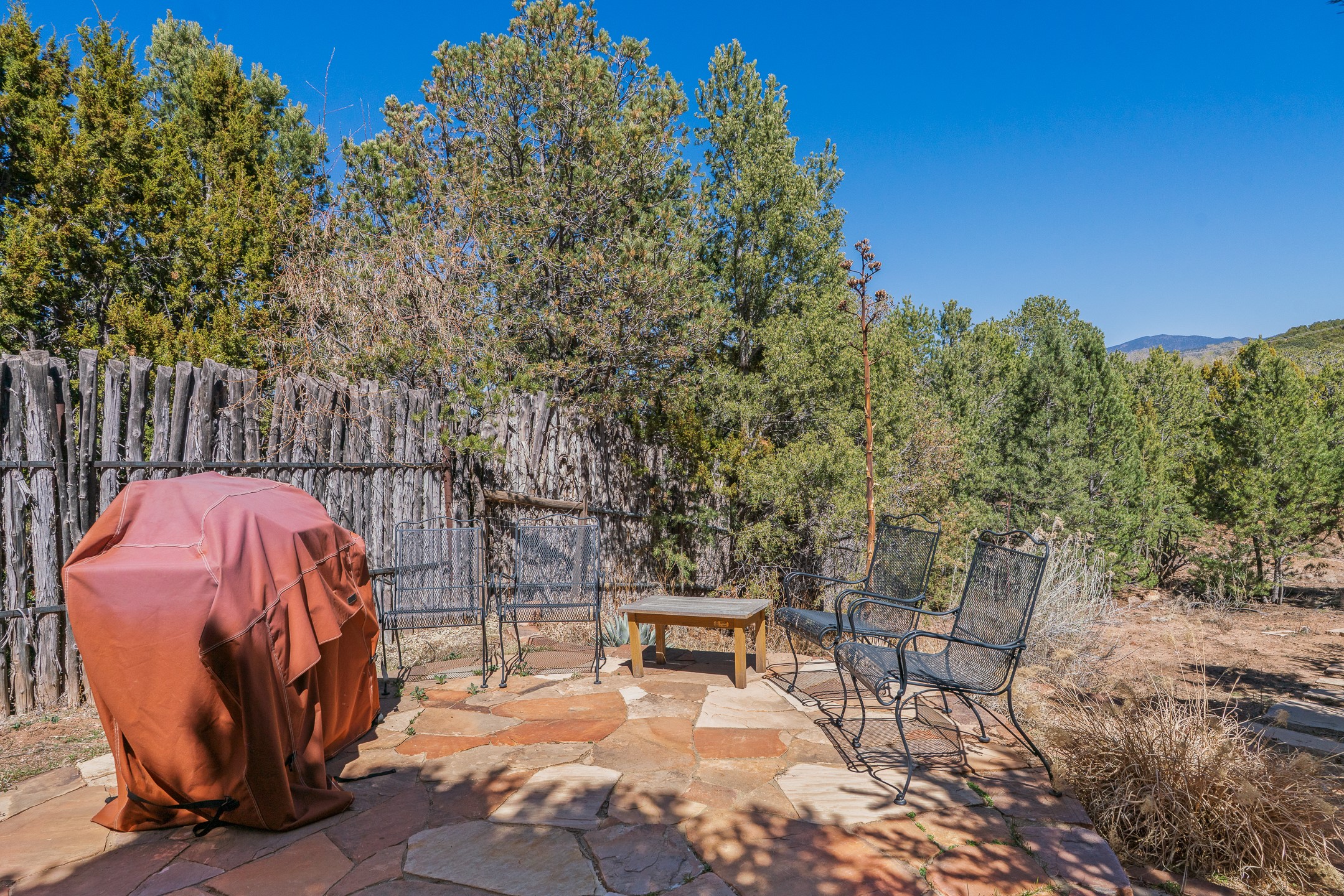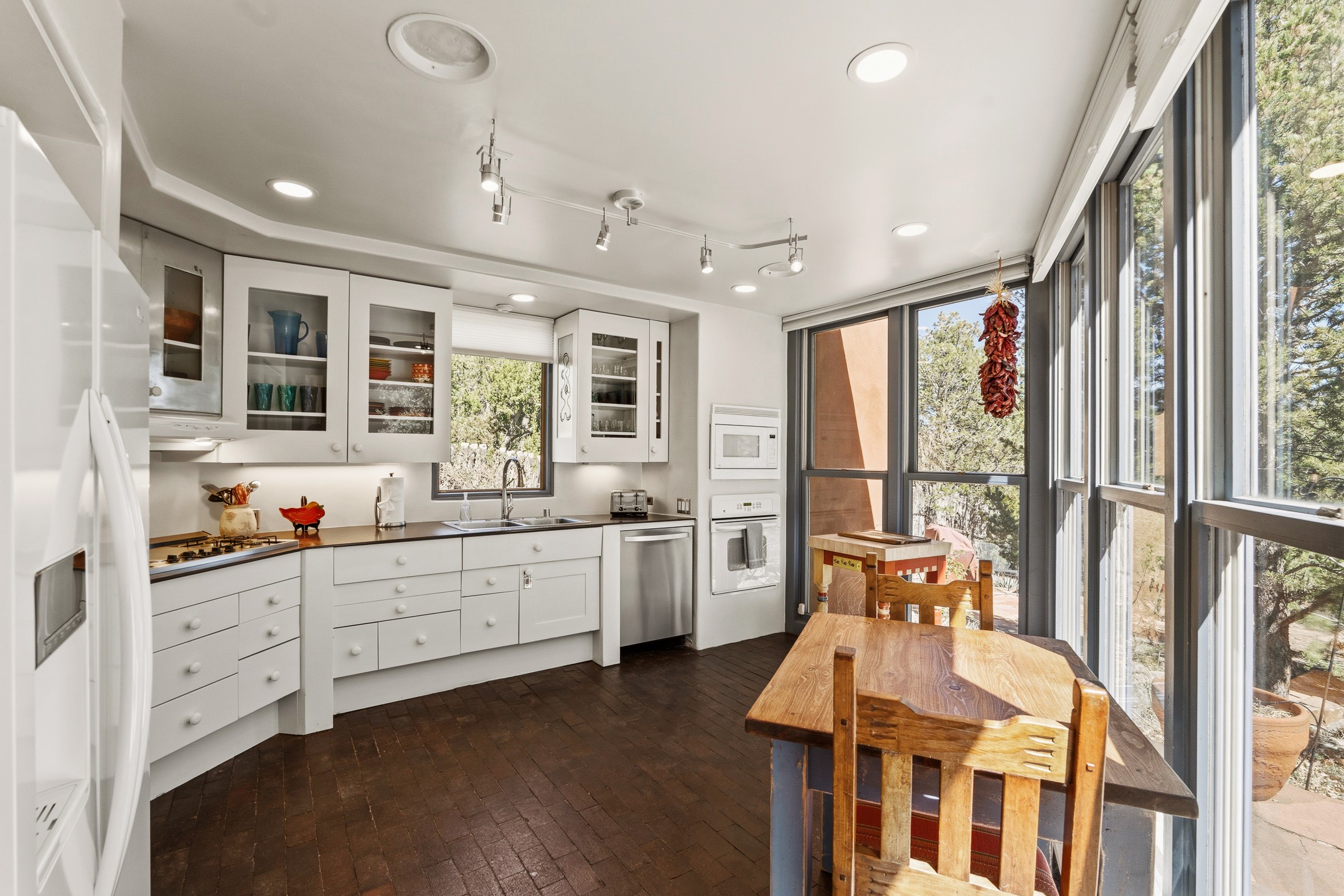 An exceptional offering on Santa Fe's coveted Eastside, moments from Canyon Road, this refined residence on Camino del Monte Sol embodies contemporary design and timeless Santa Fe style. Designed by the award-winning Texas based Lake Flato Architects, the home is a study in light, form, and seamless indoor-outdoor living. The interiors unfold with effortless elegance, with soaring wood-beamed ceilings, a striking modern fireplace, and an artful circular den anchored by a built-in banco beneath a dramatic skylight that draws the sky inward. Expansive glass doors bathe the open living space in natural light, framing tranquil views of the surrounding landscape. The thoughtfully designed kitchen is both light-filled and inviting, with generous windows that connect you to the serenity of the outdoors. Three well-appointed bedrooms and two and a half baths offer comfort and privacy, including a serene primary suite with a spa-inspired bath, soaking tub, and oversized shower. Outdoors, a private sanctuary awaits with lush mature juniper and pion, a gently cascading fountain over river rock, and a peaceful pond that invites quiet reflection. A rooftop terrace, complete with a traditional kiva fireplace, captures sweeping views of the Sangre de Cristo Mountains and the surrounding historic neighborhood. Currently operating as a successful short-term rental, this extraordinary property presents a rare opportunity to own an artful retreat in one of Santa Fe's most treasured locations.