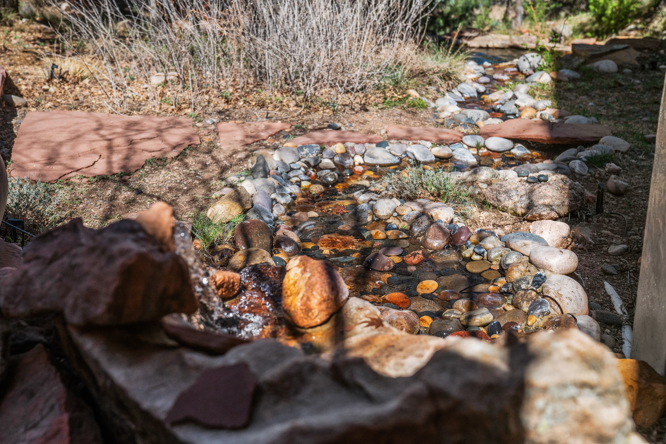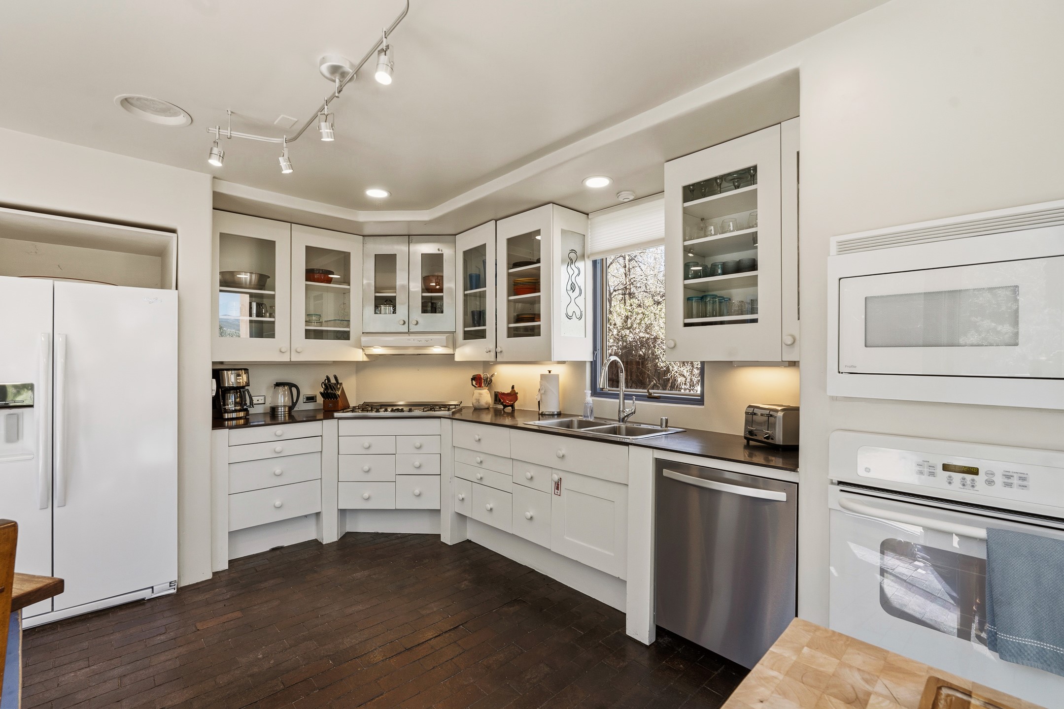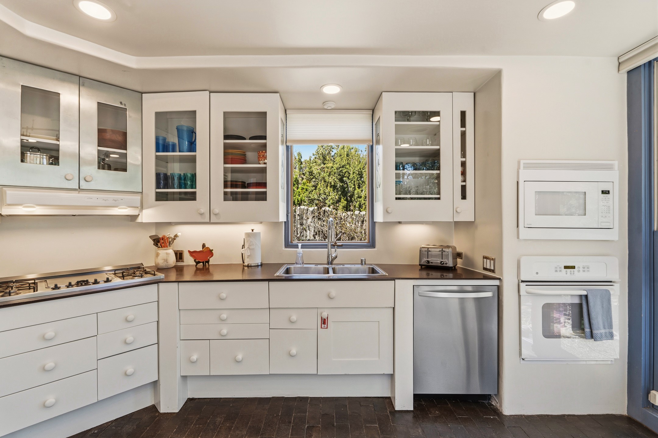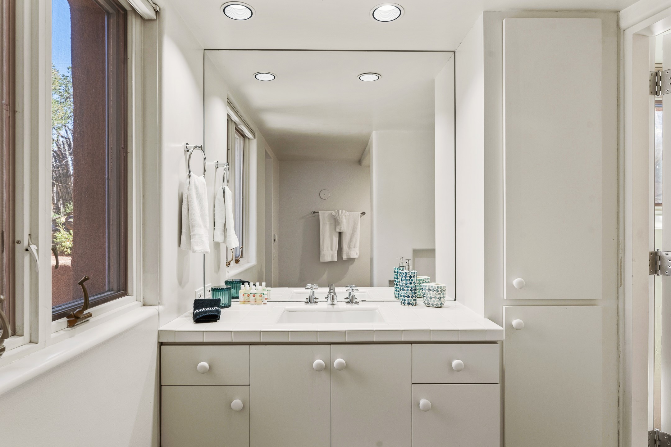 An exceptional offering on Santa Fe's coveted Eastside, moments from Canyon Road, this refined residence on Camino del Monte Sol embodies contemporary design and timeless Santa Fe style. Designed by the award-winning Texas based Lake Flato Architects, the home is a study in light, form, and seamless indoor-outdoor living. The interiors unfold with effortless elegance, with soaring wood-beamed ceilings, a striking modern fireplace, and an artful circular den anchored by a built-in banco beneath a dramatic skylight that draws the sky inward. Expansive glass doors bathe the open living space in natural light, framing tranquil views of the surrounding landscape. The thoughtfully designed kitchen is both light-filled and inviting, with generous windows that connect you to the serenity of the outdoors. Three well-appointed bedrooms and two and a half baths offer comfort and privacy, including a serene primary suite with a spa-inspired bath, soaking tub, and oversized shower. Outdoors, a private sanctuary awaits with lush mature juniper and pion, a gently cascading fountain over river rock, and a peaceful pond that invites quiet reflection. A rooftop terrace, complete with a traditional kiva fireplace, captures sweeping views of the Sangre de Cristo Mountains and the surrounding historic neighborhood. Currently operating as a successful short-term rental, this extraordinary property presents a rare opportunity to own an artful retreat in one of Santa Fe's most treasured locations.