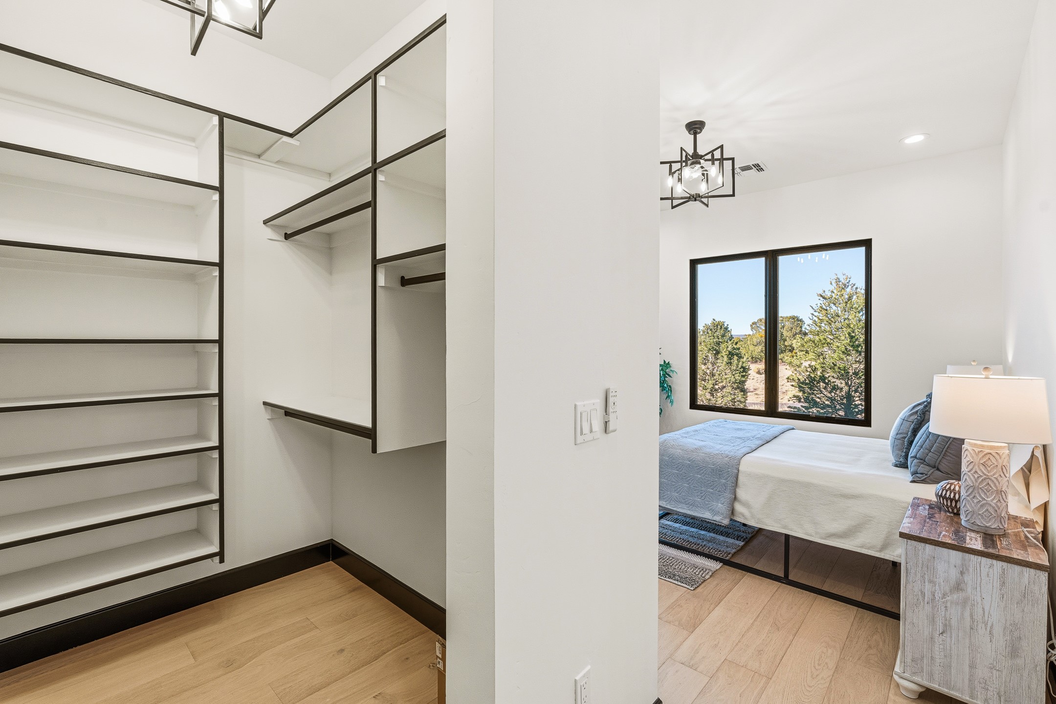 Defining Santa Fe luxury, this brand-new custom estate by renowned Candelaria Homes is ideally positioned on 1.64 acres within the prestigious Las Campanas community, commanding sweeping views of the 14th and 15th golf holes, championship fairways, and the Sangre de Cristo and Sandia Mountains. Showcasing a sophisticated blend of contemporary architecture and classic New Mexican design, this single-level residence offers effortless elegance and exceptional livability. The open-concept great room is designed for both grand entertaining and everyday comfort, with radiant heated floors extending through the main living areas. The gourmet kitchen features rich dark cabinetry, a striking center island, integrated high-end appliances, and an oversized butler's pantry. A detached one-bedroom casita offers luxurious guest accommodations or studio potential, while a flexible bonus room can serve as a media room, library, office, or guest retreat.Floor-to-ceiling picture windows capture Santa Fe's celebrated light and frame the dramatic desert landscape. Outdoor living is equally impressive, with an expansive portal featuring an above-ground spa, gas fireplace, and built-in grill.Membership at The Club at Las Campanas is available separately. An extraordinary Las Campanas offering that embodies refined desert living at its finest.