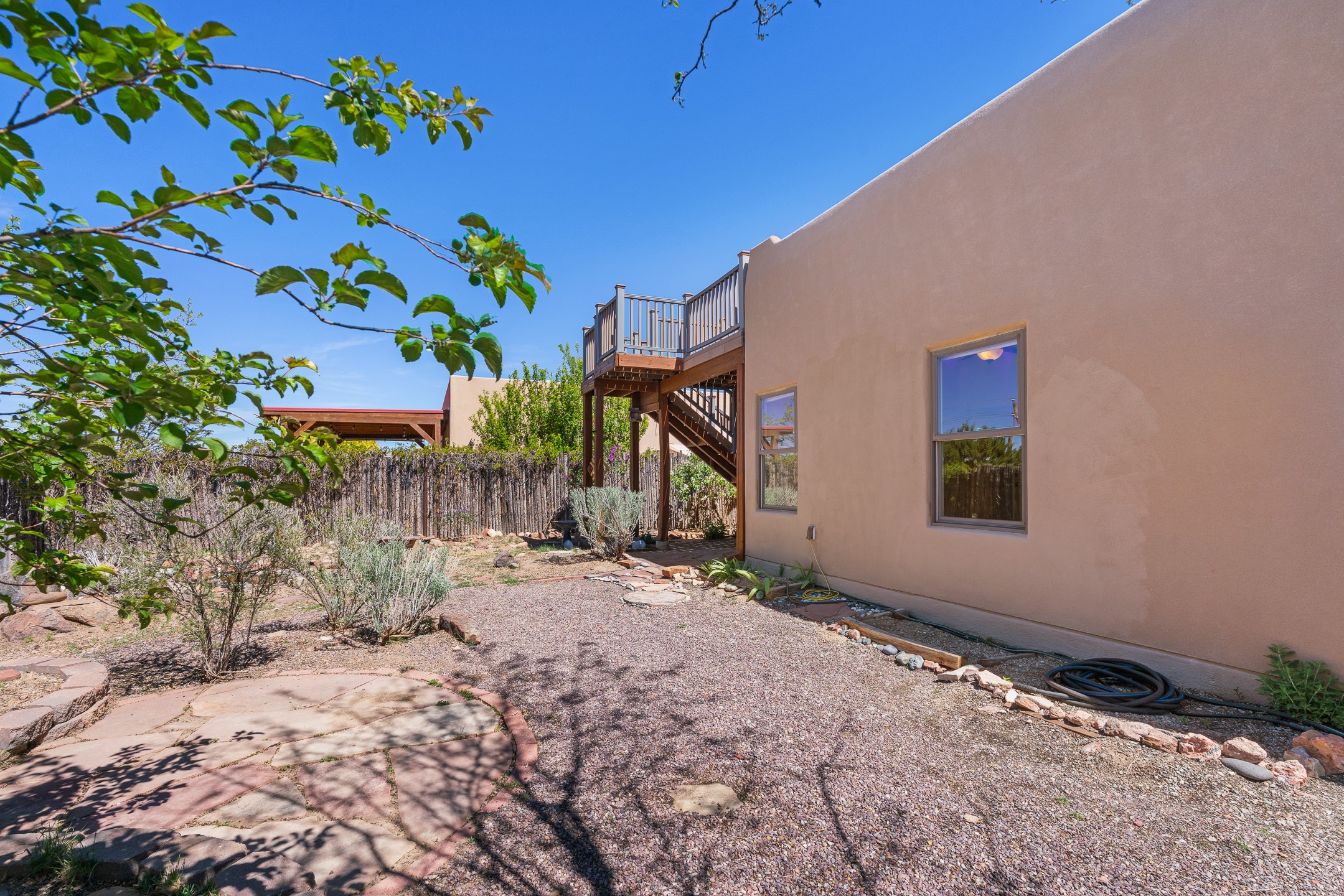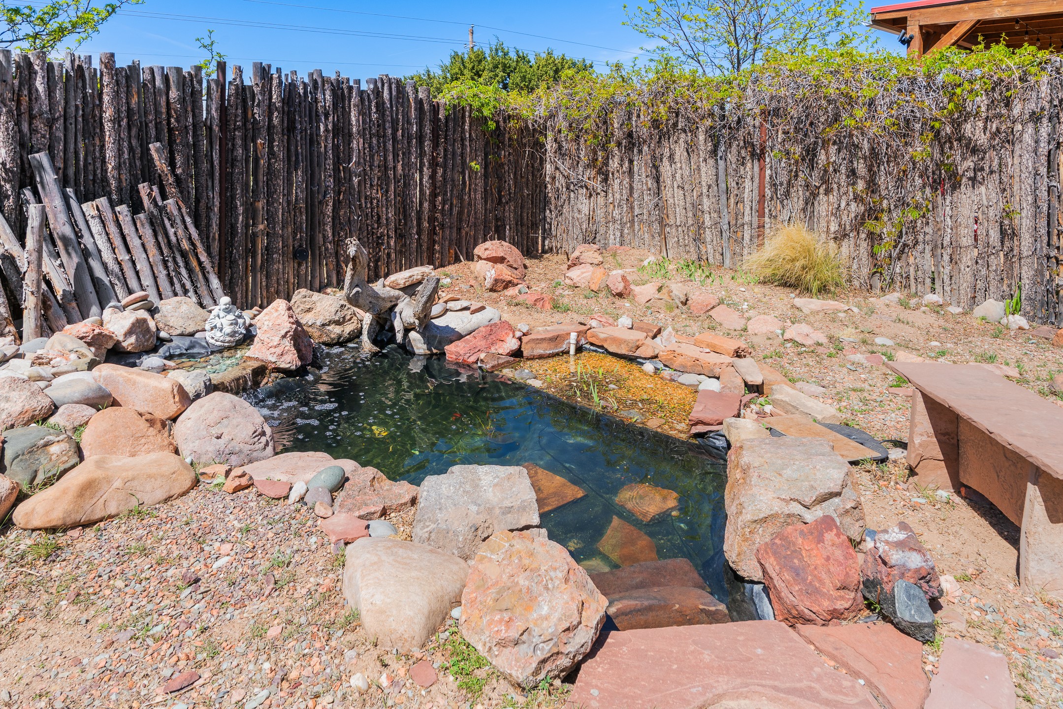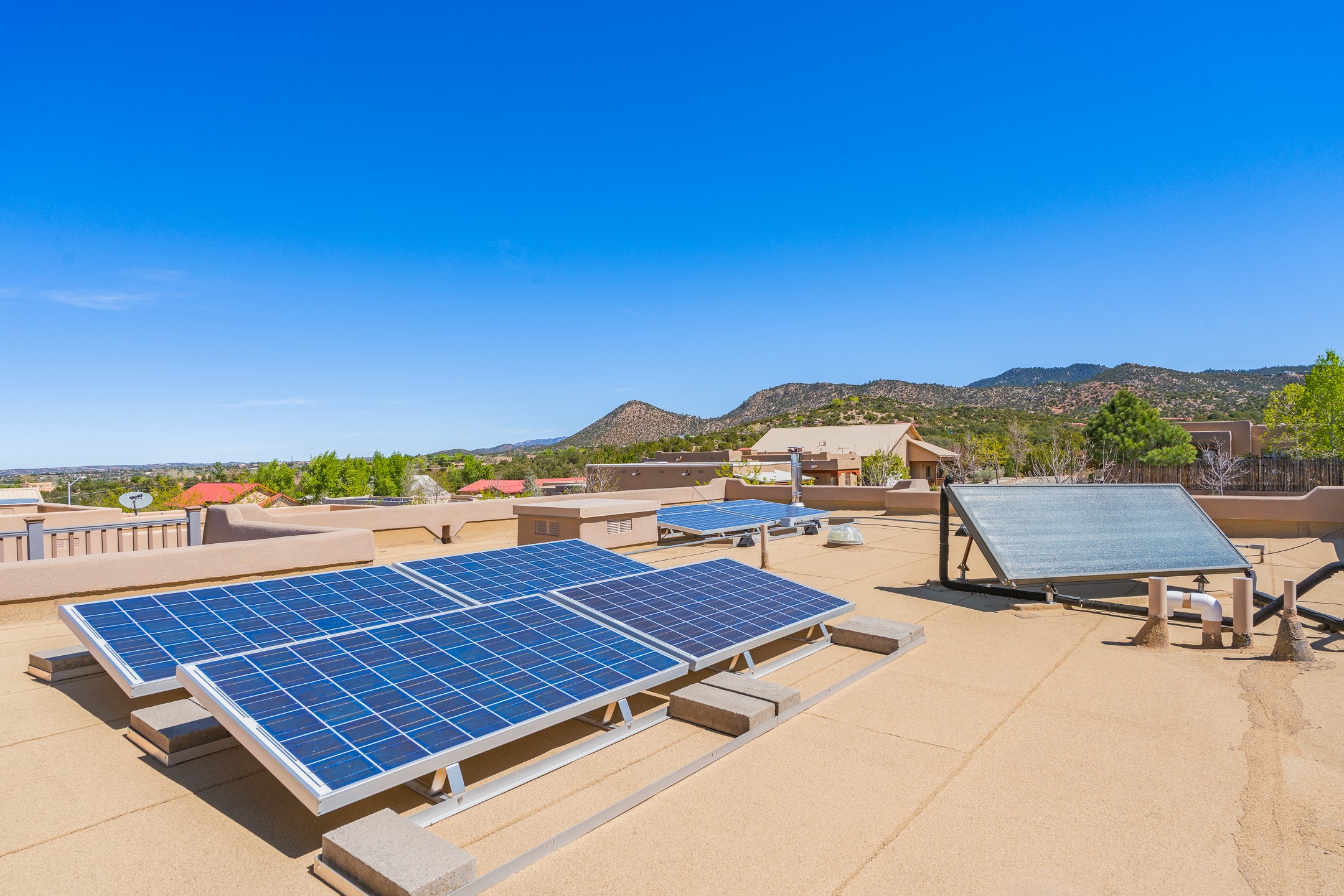 Experience the magic of Santa Fe living in this meticulously maintained, solar-powered home in the desirable Wood Gormley school district. Relax on your private rooftop deck, taking in breathtaking mountain views and iconic New Mexico sunsets. The fully fenced backyard, complete with circulating pond, provides an oasis for relaxation. Inside, enjoy a bright, open-concept design featuring 9-foot ceilings, fresh paint, new flooring, and a brand-new furnace for in-floor radiant heating. This award-winning, energy-efficient home combines premium efficiency with comfort, all on a quiet cul-de-sac perfectly positioned for easy access to downtown, shopping, and I-25.