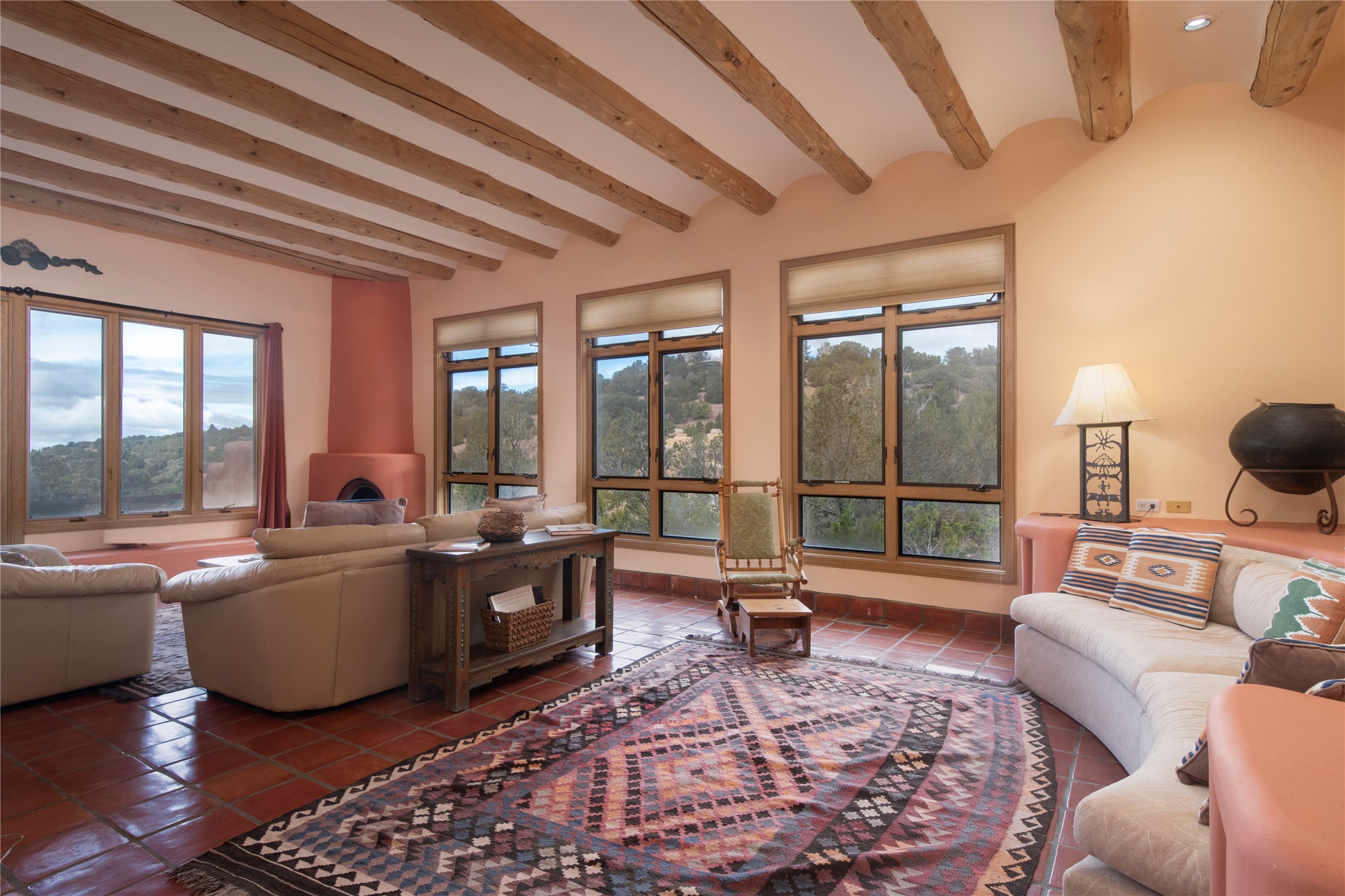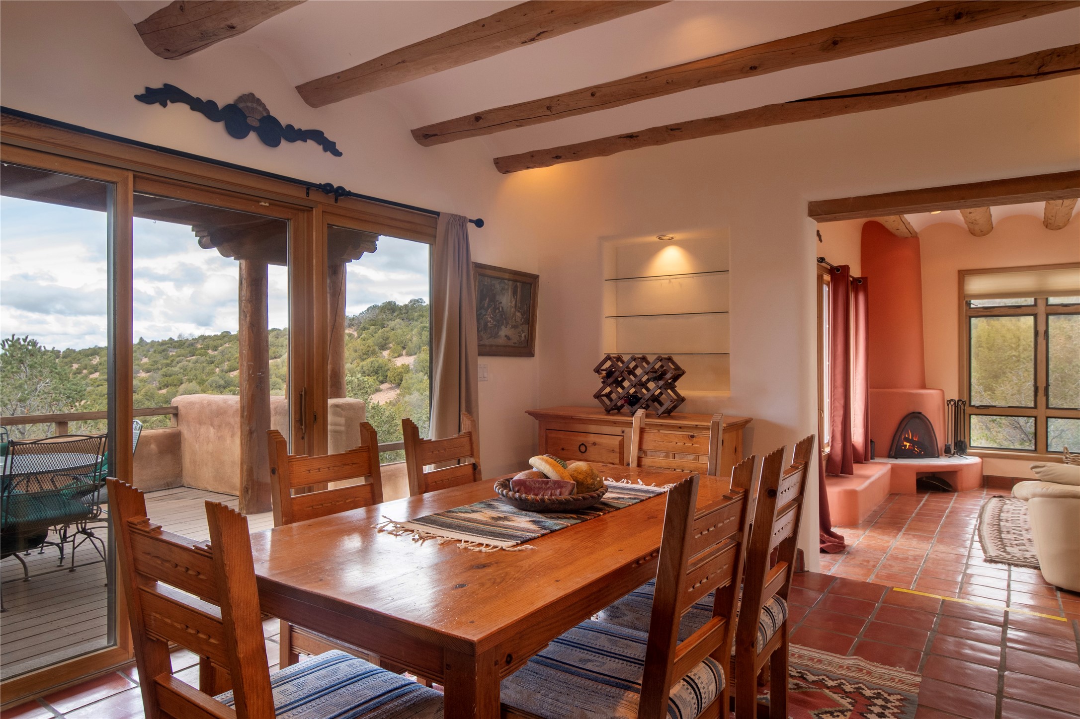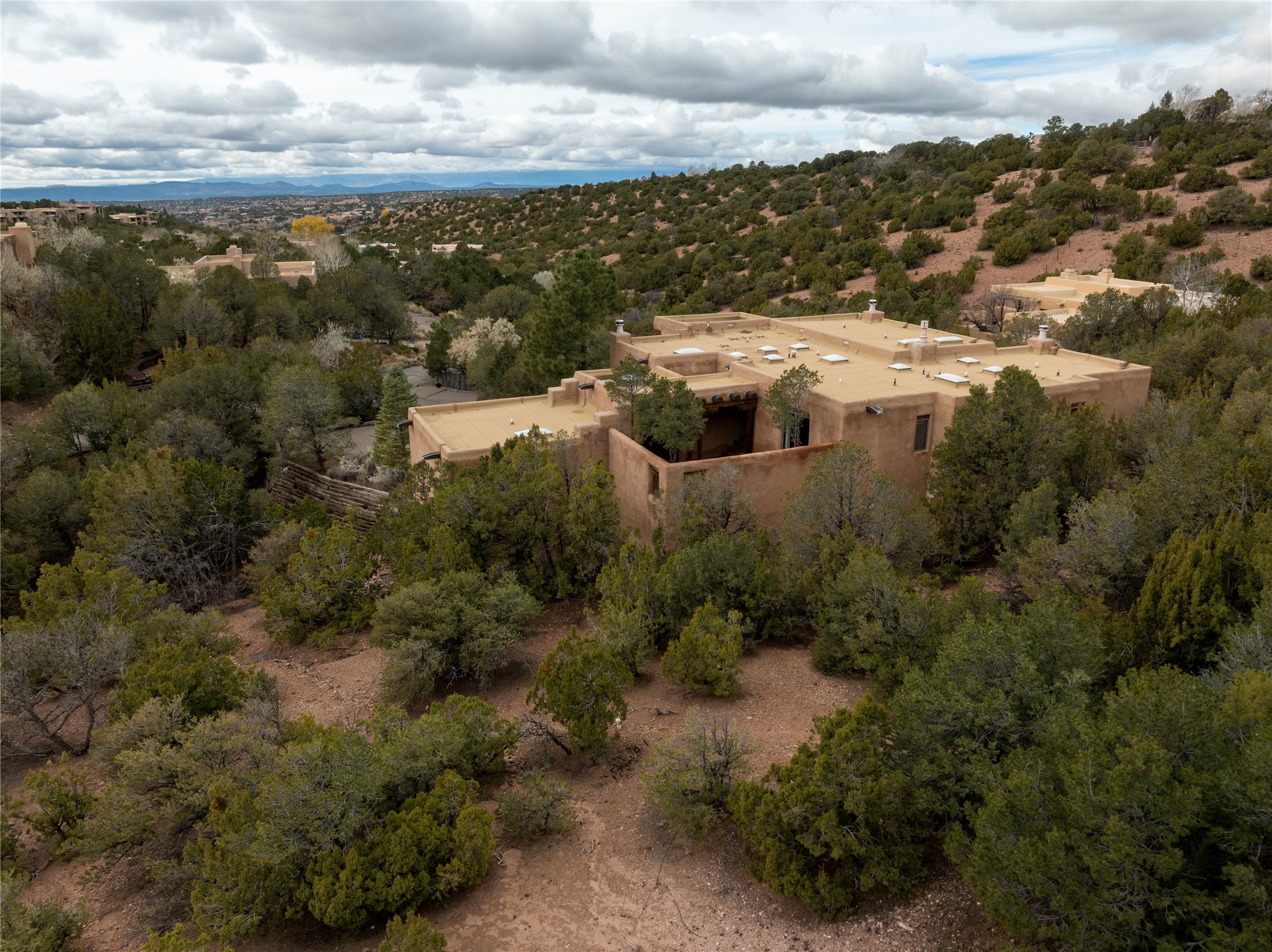 Beautifully sited among mature pion and juniper, this warm Pueblo-style home offers 3 bed 3 bath and stunning views of the Jemez mountains. Light-filled living and dining spaces connect seamlessly to a charming kitchen with wood cabinetry, skylights, and tile accents. The home includes a dedicated office, a serene primary suite, comfortable guest accommodations, and a finished lower level with additional living space, storage, and a well-appointed laundry room. Outdoor living is exceptional with an intimate walled patio, view-filled deck, and natural desert landscaping. A spacious garage and tranquil setting complete this inviting Santa Fe retreat.