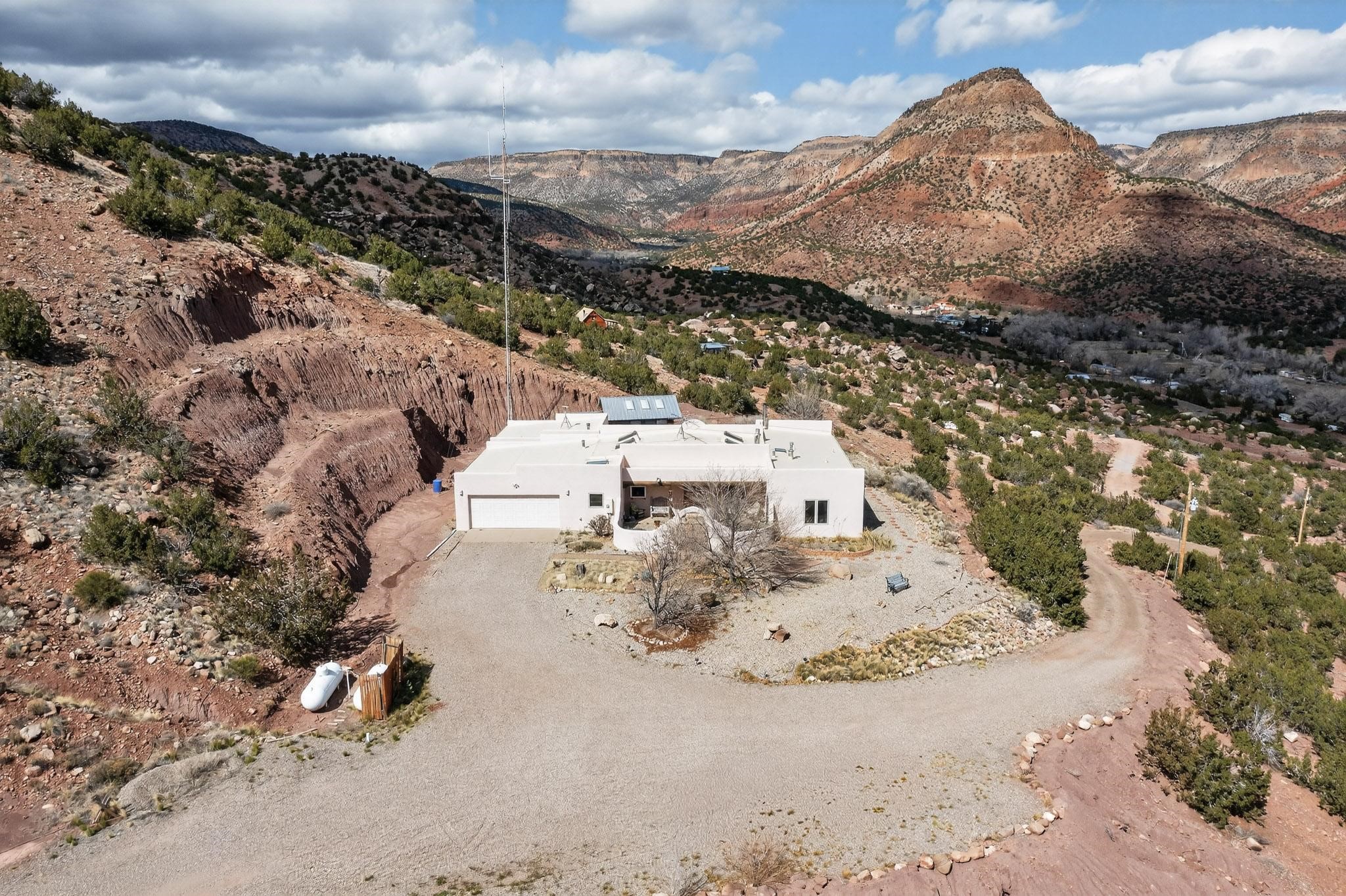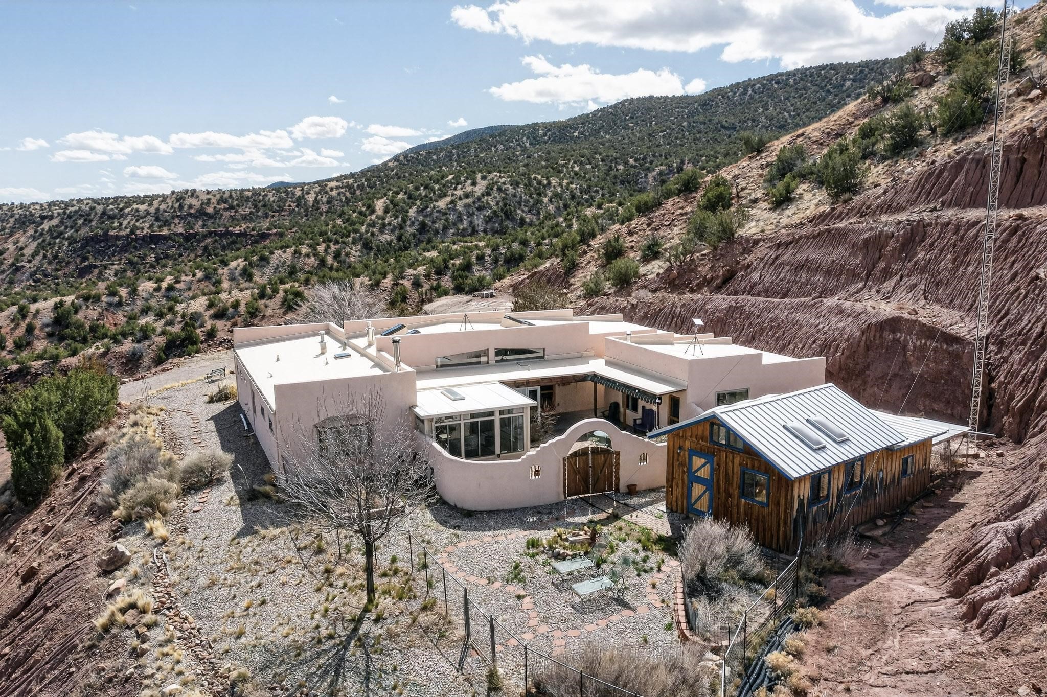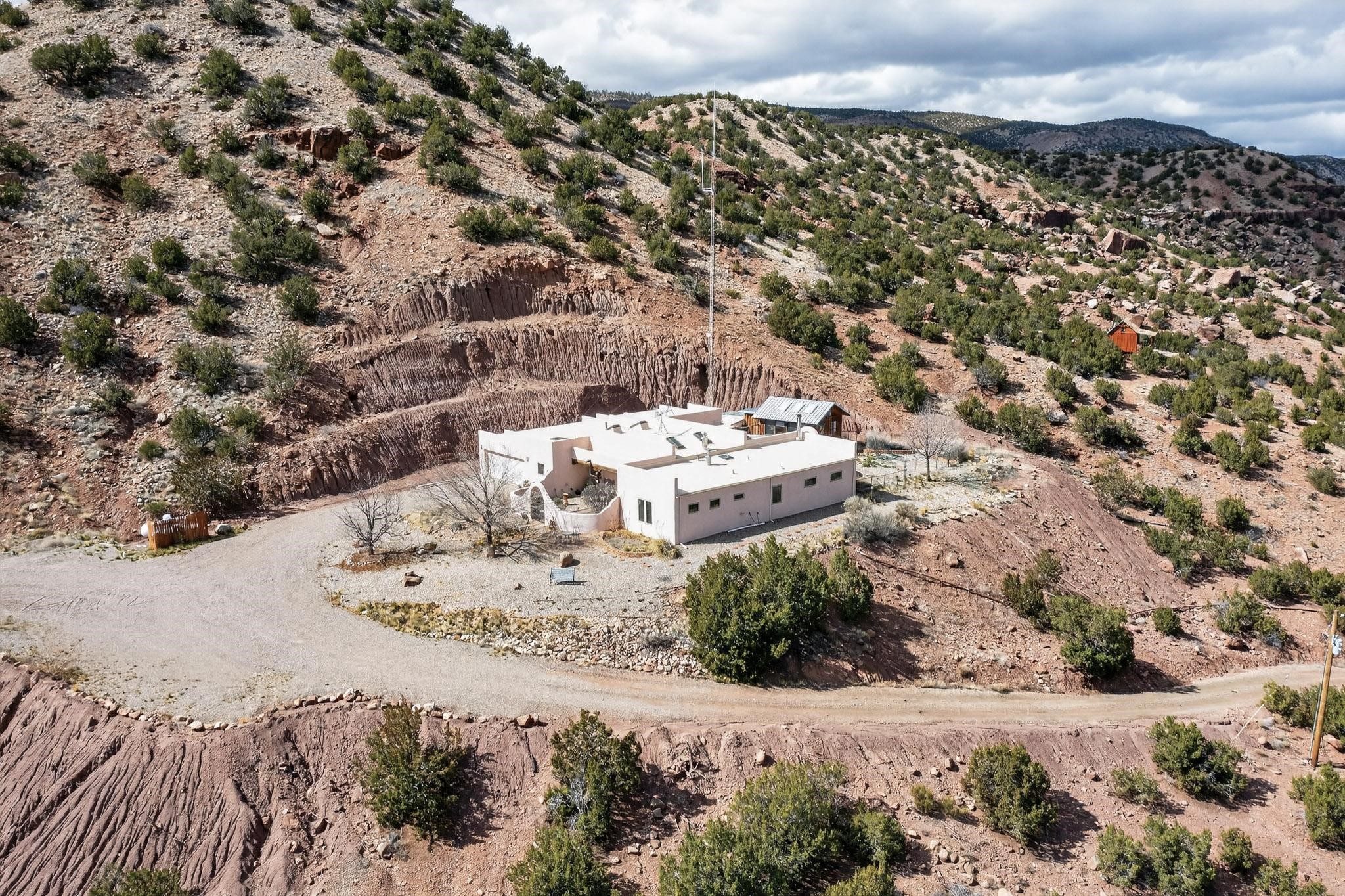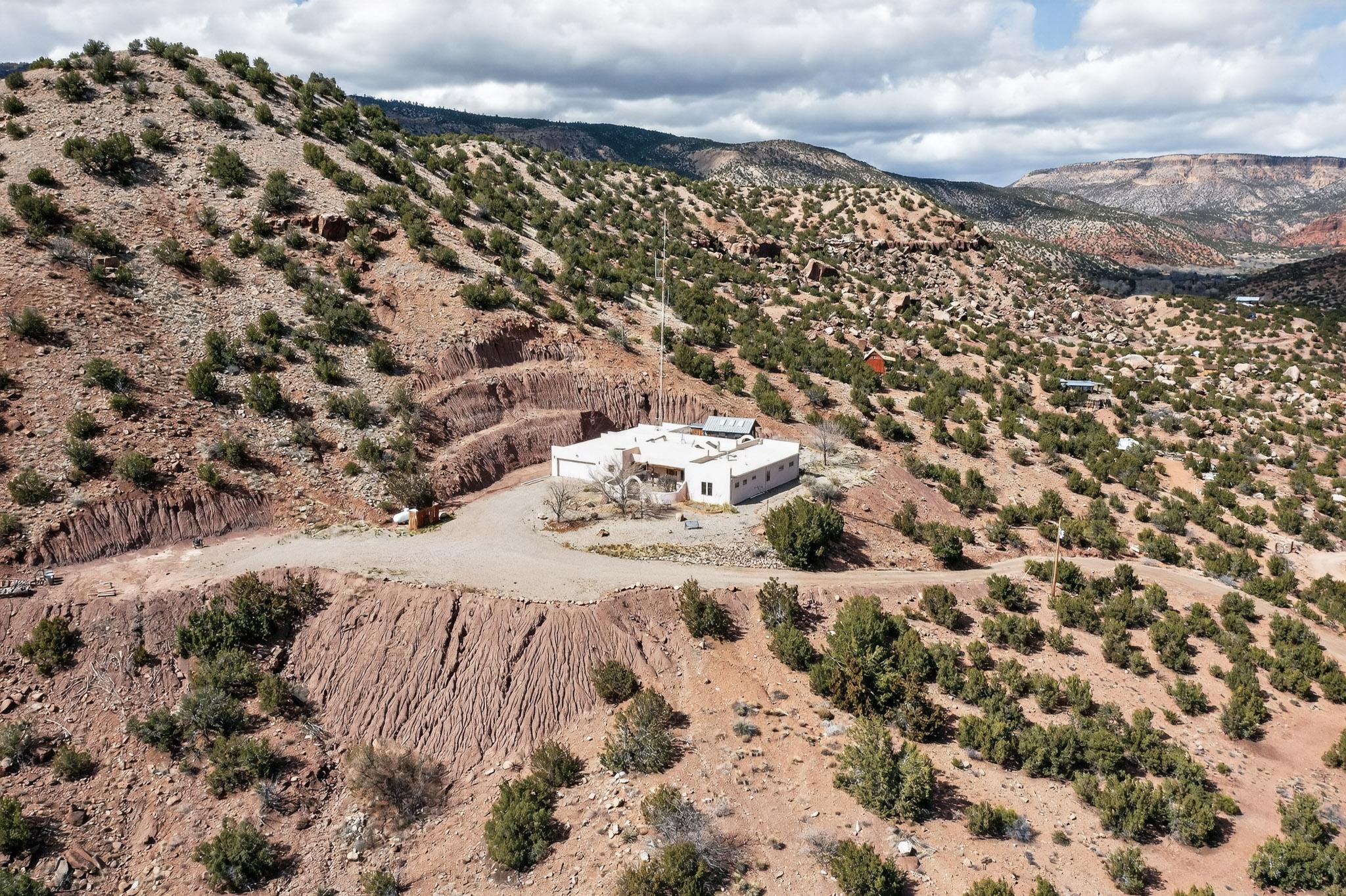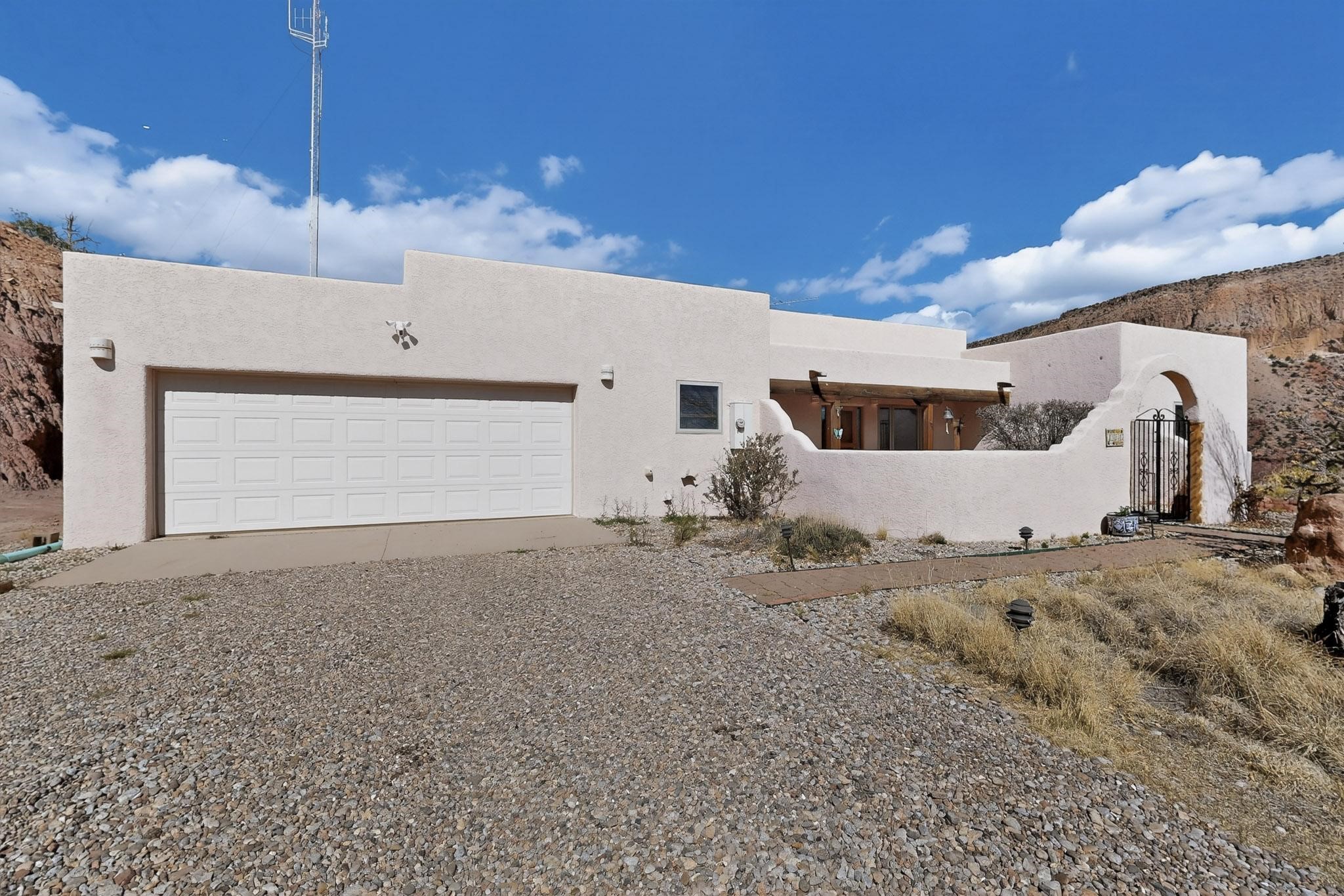 An Elevated Southwest experience on 5.75 acres set against breathtaking Red Mesas of Jemez, capturing expansive VIEWS & exceptional seclusion in a private end of road setting. Enter through courtyard garden into great room, high wood beam ceilings & Radiant Saltillo tile throughout. Spacious kitchen w/ island opens seamlessly for gathering & entertaining. Meticulously cared for, this property reflects lasting quality. Beautiful, spacious primary suite w/ private bath & walk in closet. Comfortable enclosed sunroom w/ hot tub for year round relaxation. Outside, Casita beautifully finished in matching materials, perfect for guests or multigenerational living. Newer TPO roof, 2 fireplaces, laundry room, oversized finished 2 car garage w/ workshop & generator, plus additional studio & RV PAD.At the crown of established Tower Ridge Road, this bespoke retreat commands sweeping red rock views and a rare sense of privacy. The home enjoys a naturally elevated setting where surrounding residences remain respectfully set apart, while direct access to bordering public land opens to miles of unspoiled landscape and quiet exploration. Pella windows throughout, complemented by automated skylights with remote controlled venting a. The spacious primary suite, well appointed bath, walk in closet. The laundry room offers thoughtful functionality. Throughout the home, doors, cabinetry crafted from hardwood, coordinated hardware.The detached casita offers exceptional flexibility for guests or extended stays, wood burning stove, radiant floor heat, Evap. cooler, heating, private bath.Detached studio annex heating /cooling wall unit 3 skylights, ambient diffusing shade screens, offering exceptional versatility for art, yoga, storage, studio work, a wood shop, light industrial projects.An oversized finished 2 car garage, storage or projects. A propane powered generator is also included. Full tiled sunroom with a nice hot-tubFurniture may be available with an acceptable offer.