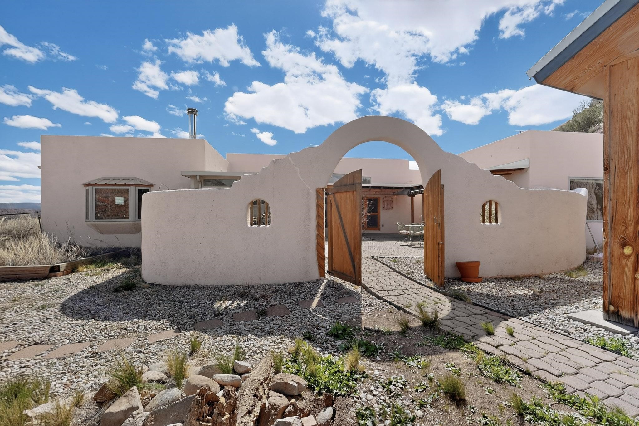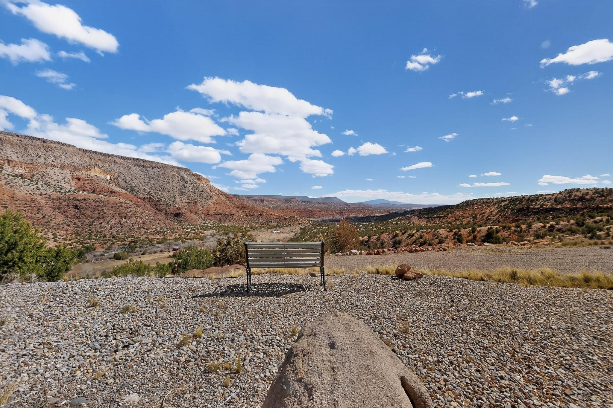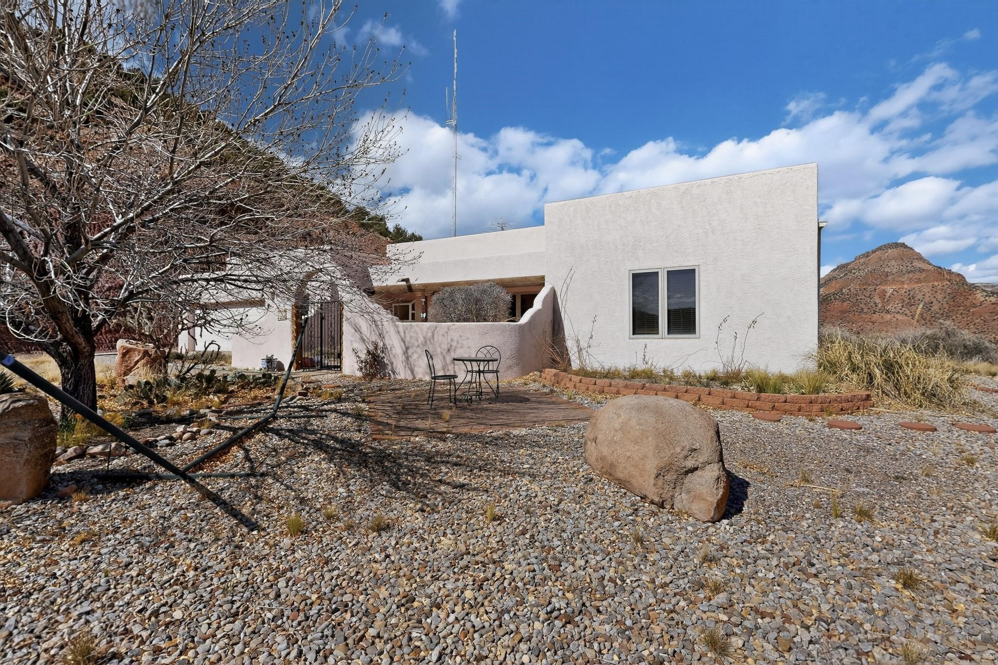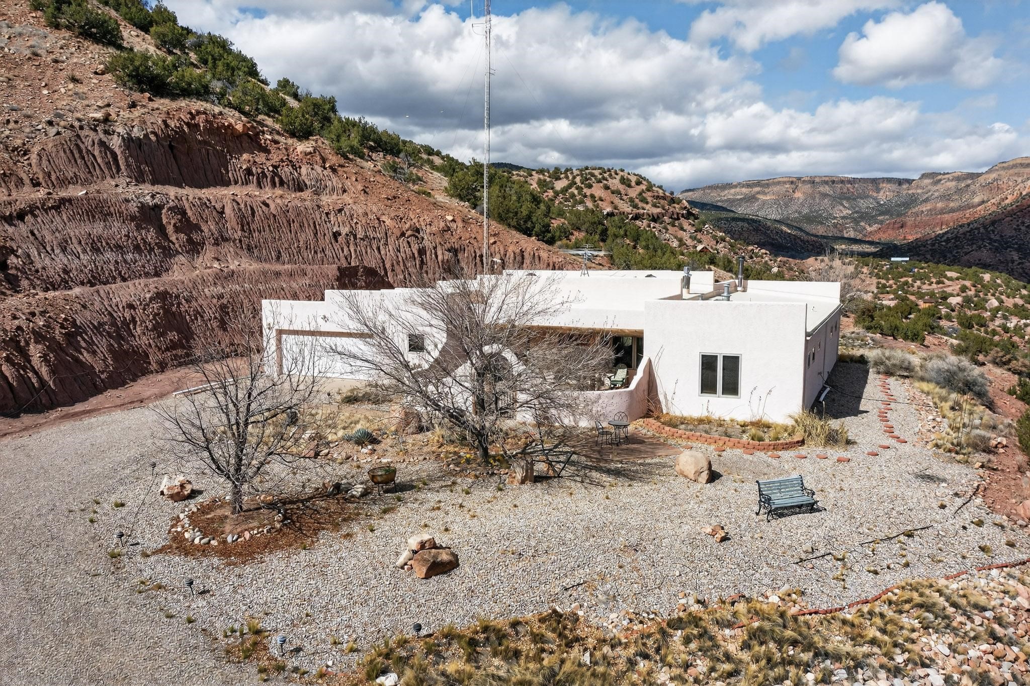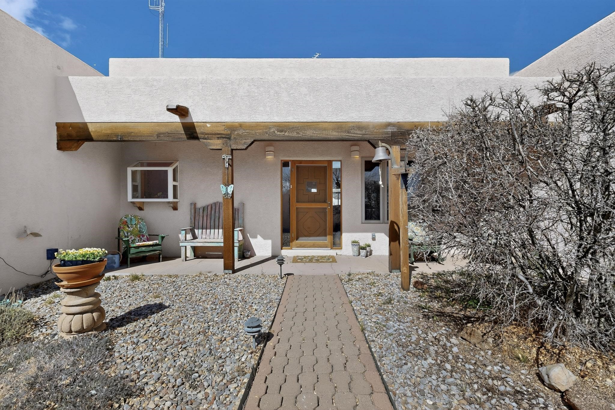 An Elevated Southwest experience on 5.75 acres set against breathtaking Red Mesas of Jemez, capturing expansive VIEWS & exceptional seclusion in a private end of road setting. Enter through courtyard garden into great room, high wood beam ceilings & Radiant Saltillo tile throughout. Spacious kitchen w/ island opens seamlessly for gathering & entertaining. Meticulously cared for, this property reflects lasting quality. Beautiful, spacious primary suite w/ private bath & walk in closet. Comfortable enclosed sunroom w/ hot tub for year round relaxation. Outside, Casita beautifully finished in matching materials, perfect for guests or multigenerational living. Newer TPO roof, 2 fireplaces, laundry room, oversized finished 2 car garage w/ workshop & generator, plus additional studio & RV PAD.At the crown of established Tower Ridge Road, this bespoke retreat commands sweeping red rock views and a rare sense of privacy. The home enjoys a naturally elevated setting where surrounding residences remain respectfully set apart, while direct access to bordering public land opens to miles of unspoiled landscape and quiet exploration. Pella windows throughout, complemented by automated skylights with remote controlled venting a. The spacious primary suite, well appointed bath, walk in closet. The laundry room offers thoughtful functionality. Throughout the home, doors, cabinetry crafted from hardwood, coordinated hardware.The detached casita offers exceptional flexibility for guests or extended stays, wood burning stove, radiant floor heat, Evap. cooler, heating, private bath.Detached studio annex heating /cooling wall unit 3 skylights, ambient diffusing shade screens, offering exceptional versatility for art, yoga, storage, studio work, a wood shop, light industrial projects.An oversized finished 2 car garage, storage or projects. A propane powered generator is also included. Full tiled sunroom with a nice hot-tubFurniture may be available with an acceptable offer.