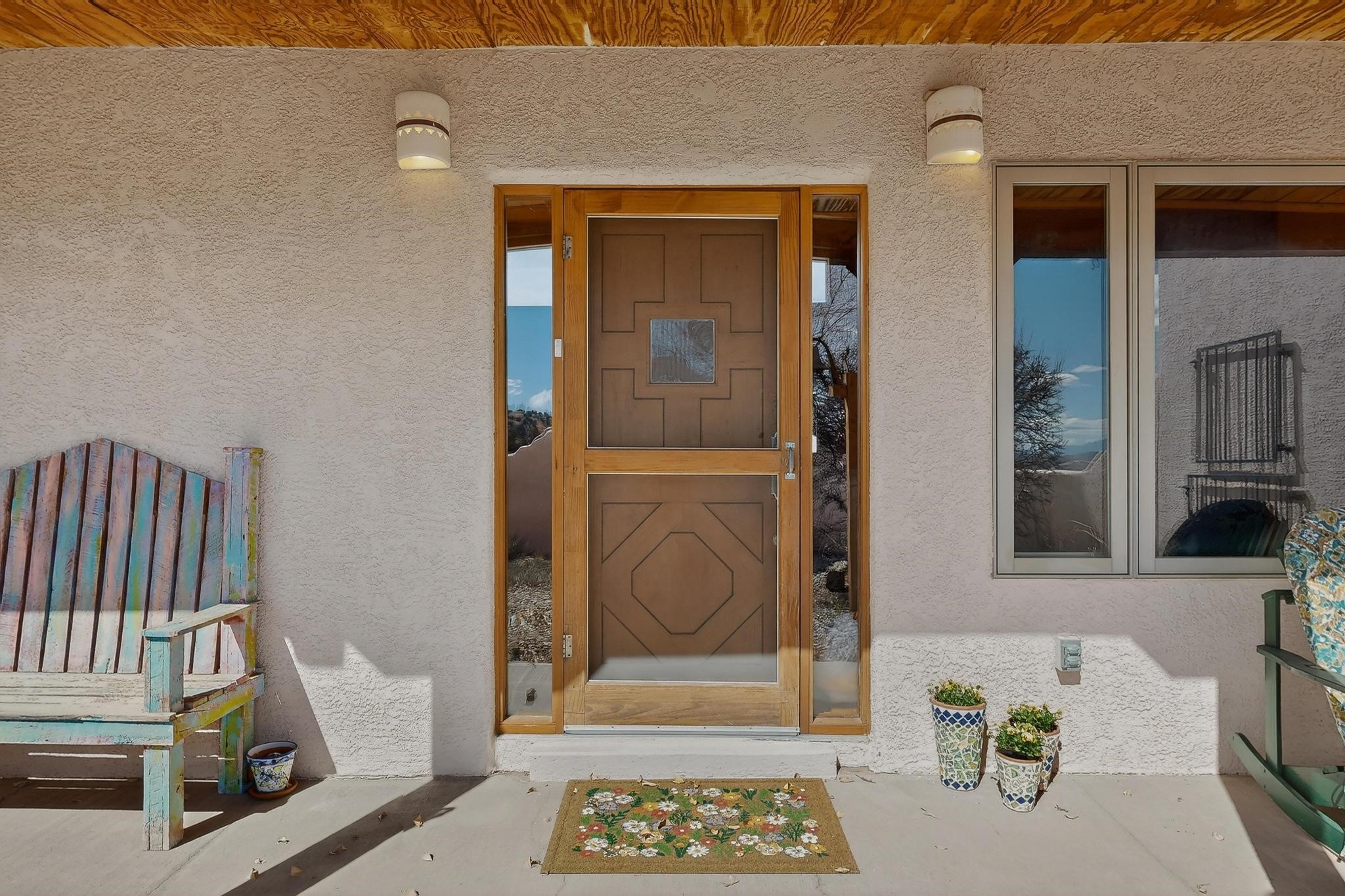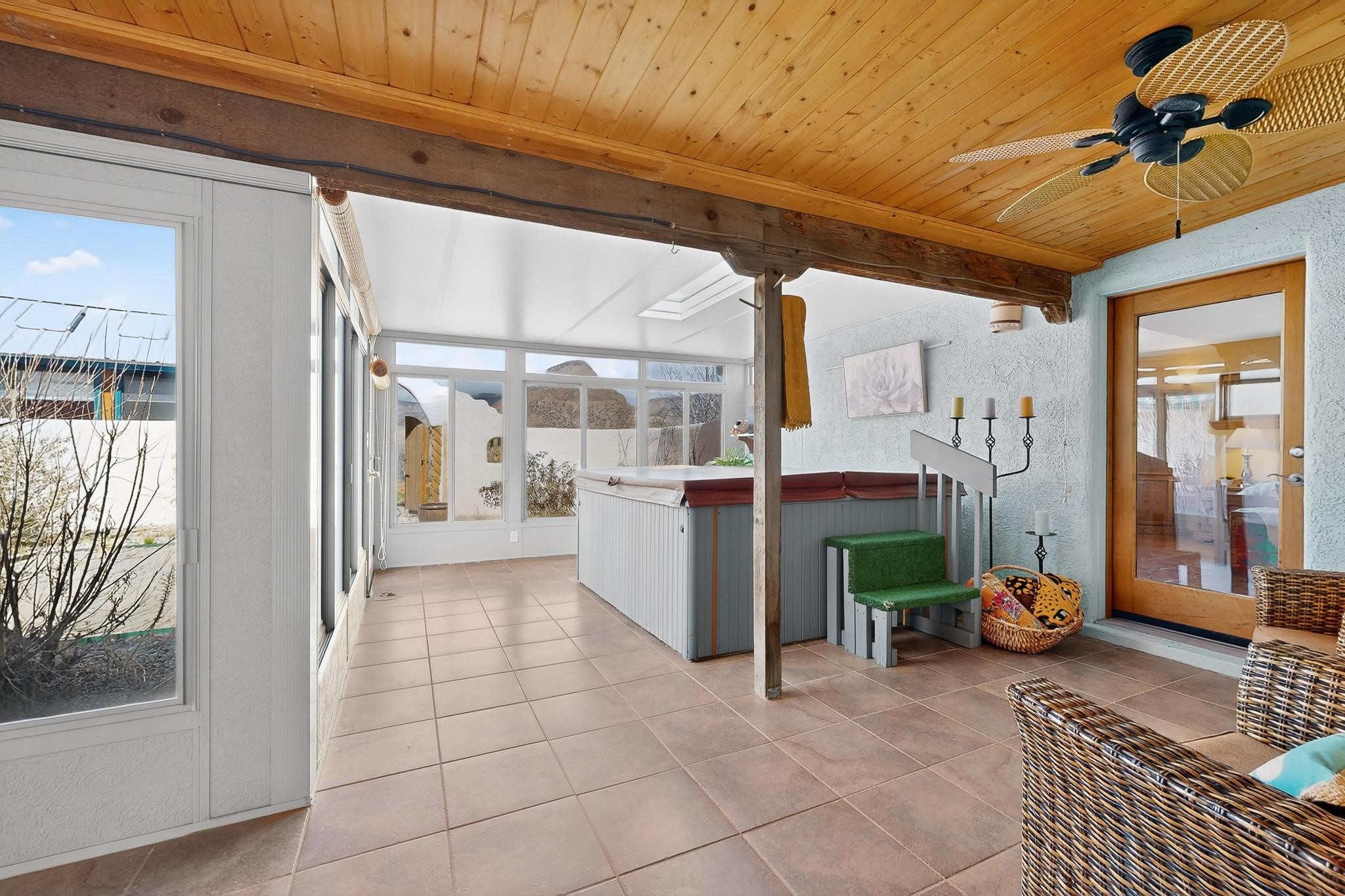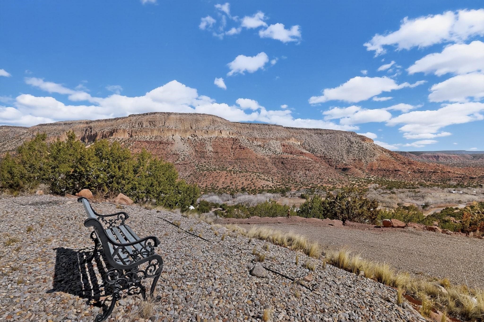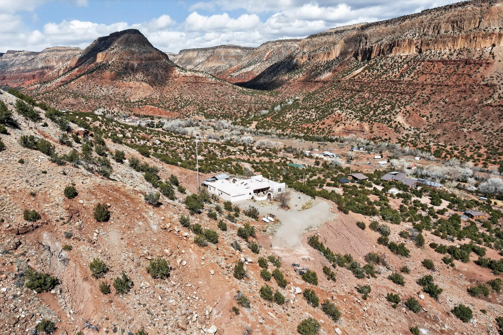 An Elevated Southwest experience on 5.75 acres set against breathtaking Red Mesas of Jemez, capturing expansive VIEWS & exceptional seclusion in a private end of road setting. Enter through courtyard garden into great room, high wood beam ceilings & Radiant Saltillo tile throughout. Spacious kitchen w/ island opens seamlessly for gathering & entertaining. Meticulously cared for, this property reflects lasting quality. Beautiful, spacious primary suite w/ private bath & walk in closet. Comfortable enclosed sunroom w/ hot tub for year round relaxation. Outside, Casita beautifully finished in matching materials, perfect for guests or multigenerational living. Newer TPO roof, 2 fireplaces, laundry room, oversized finished 2 car garage w/ workshop & generator, plus additional studio & RV PAD.At the crown of established Tower Ridge Road, this bespoke retreat commands sweeping red rock views and a rare sense of privacy. The home enjoys a naturally elevated setting where surrounding residences remain respectfully set apart, while direct access to bordering public land opens to miles of unspoiled landscape and quiet exploration. Pella windows throughout, complemented by automated skylights with remote controlled venting a. The spacious primary suite, well appointed bath, walk in closet. The laundry room offers thoughtful functionality. Throughout the home, doors, cabinetry crafted from hardwood, coordinated hardware.The detached casita offers exceptional flexibility for guests or extended stays, wood burning stove, radiant floor heat, Evap. cooler, heating, private bath.Detached studio annex heating /cooling wall unit 3 skylights, ambient diffusing shade screens, offering exceptional versatility for art, yoga, storage, studio work, a wood shop, light industrial projects.An oversized finished 2 car garage, storage or projects. A propane powered generator is also included. Full tiled sunroom with a nice hot-tubFurniture may be available with an acceptable offer.
