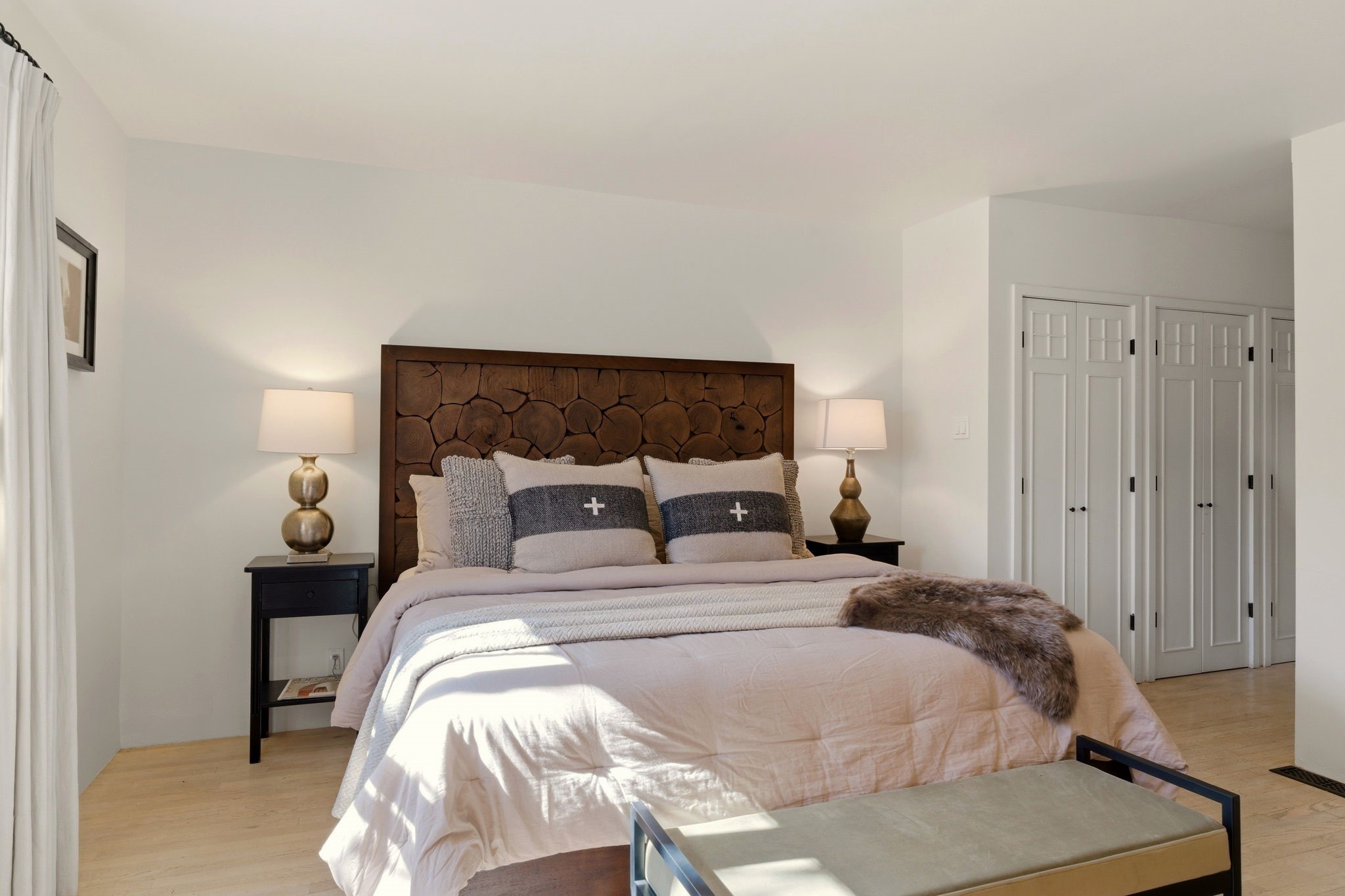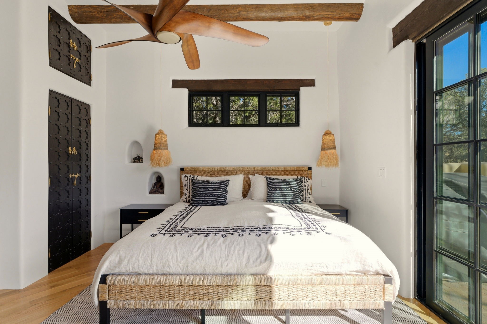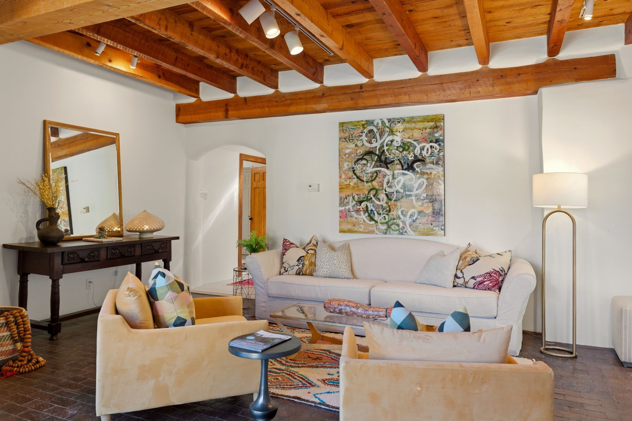 Set on approximately 2 private acres in one of Santa Fe's most coveted foothill enclaves, just a few quick minutes from Museum Hill and the Eastside, this exceptional compound unfolds as a beautifully composed private retreat defined by space, light, and remarkable natural surroundings. The property encompasses apx 3,610 sqft with a 3 BR / 4 BA configuration. The main residence spans roughly 3,040 sqft with 2 BR / 3 BA filled with natural light from skylights and expansive windows that frame Santa Fe's legendary deep blue skies, brilliant pink sunsets, and luminous night skies. Authentic Santa Fe elements are abundant throughout, including vigas, latillas, nichos, and 3 kiva fireplaces. Luxurious wood, brick, and tile flooring and a streamlined elegant chef's kitchen with stainless appliances anchor the home's inviting living spaces. Historic elements from its original 1947 construction lend character and warmth throughout, though recently and thoroughly updated and completely renovated and modernized. A separate guest house of approximately 570 sqft completely reimagined offers a beautifully stunning and private 1 BR / 1 BA retreat. Distinctive Moroccan-imported doors and hardware open to interiors highlighted by striking oversized invisible pocket doors and diagonal blonde wood floors with a steam shower, creating an inviting and stylish sanctuary for guests, creative pursuits, or quiet retreat. Air-conditioning cools in the height of summer's hottest days. At the center of its outdoor experience is a newly redone walled and private saltwater lap pool with an automatic retractable cover - an elegant retreat for quiet morning swims, sun-drenched afternoons, or moonlit evenings. Surrounding the pool are rare, lush grass lawns - an extraordinary luxury in Santa Fe - along with generous outdoor spaces and private patios designed for spontaneous entertaining and languid moments. This gated paradise provides exceptional privacy and abundant parking with direct, close access from the property to the Sun Mountain trail system - offering the rare privilege of stepping right from your backyard into one of Santa Fe's most beloved hiking landscapes. Here, expansive skies, breathtaking sunsets, and a deep sense of privacy create a lifestyle that is both rare and deeply restorative, Santa Fe itself truly embodied in an exceptional estate.