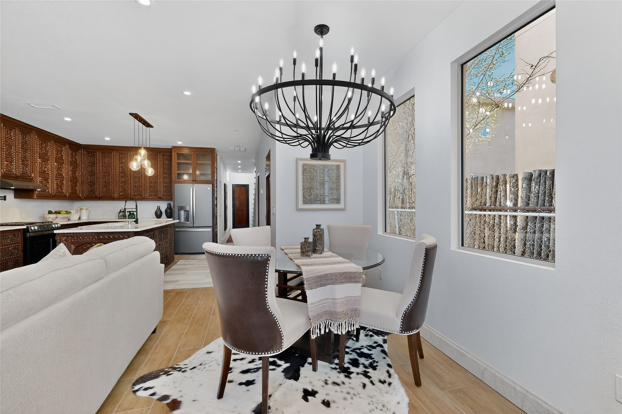 Old world craftsmanship blends seamlessly with modern luxury at the Estancia Collection, a unique compound located in the Baca Railyard District, minutes from Santa Fe's top galleries and restaurants. This latest vision of renowned developer Mitch Menaker, is where every room becomes a work of living art. Curated by artisans from around the world, using hand cut semi-precious stone, tiles, iron, and rare wood finishes creates a truly immersive and peaceful experience, as if being hugged by nature. As you enter the sanctuary, a profound sensory experience awaits: a 20-foot Anasazi-style wall creates awe and naturally anchors the home. Inside are hand-carved teak doors, alder kitchen cabinets artisan-crafted in Mexico, and Italian marble countertops inlaid with semi-precious stone, creating a fine art masterpiece. The open concept living area features a 250-year-old triple-arch entertainment center that mimics the arcade of an ancient palace. Ascending the staircase is like gliding through a canyon of stone to the bedroom suites above. The primary bedroom greets you through a charming speakeasy door. This light-filled sanctuary features a fireplace, an antique carved wooden ceiling, a wet bar and a one of a kind spa-like bathroom with blue agate sinks, set on backlit white onyx countertops. The tub/shower, surrounded by stunning backlit blue agate panels, creates a luxurious and luminous retreat. The second light-filled bedroom features a bathroom with a hand-carved Mexican vanity and petrified wood sink atop a white onyx counter. The museum-quality shower/tub is framed in petrified wood squares, hand-assembled to create a puzzle pattern.The laundry room, located on the 2nd floor includes a dog shower covered with "happy dog" faces on each hand cut tile. Blending ancient techniques with the expert hands that brought them to life, the developer's vision has created the most unique visual and artistic sanctuary Santa Fe has seen in years.