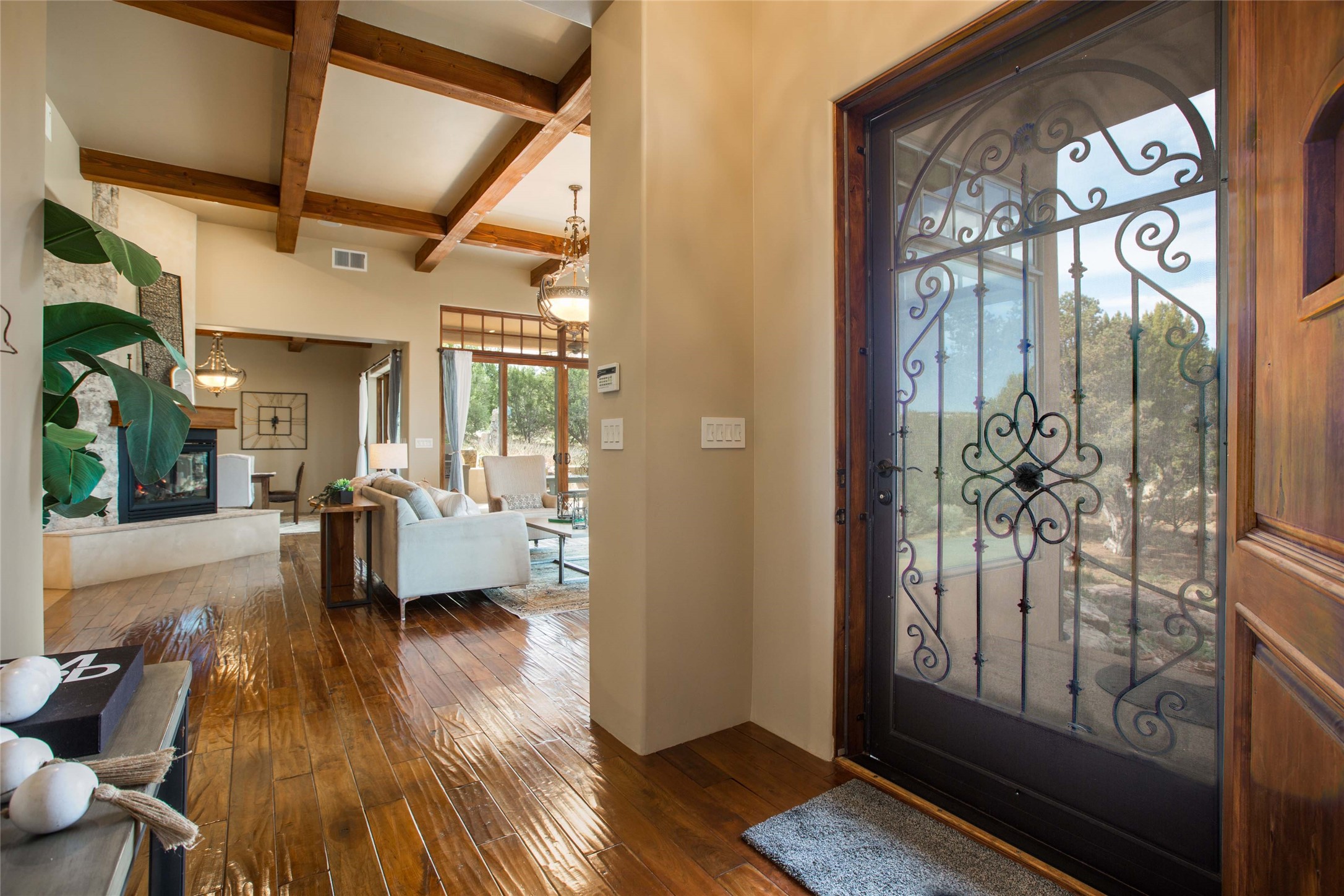 OPEN HOUSE 3-15 from 2-4pm. The outside and the inside meet in this superb warm Contemporary design. Wood, stone and glass elements and views from every room. Custom Harwell home; nestled in Paa-Ko with breathtaking Sandia and Placer Mountain views. Soaring ceilings with elegant wood beams, striking travertine accent walls, a multi-sided gas fireplace, and hand-scraped cherry hardwood floors. The gourmet kitchen boasts custom knotty alder cabinetry, and Wolf & Subzero pro-style appliances. Elegant dining room flanked by a fireplace one one side and large windows on the other is an inviting space and is separated from the kitchen by a convenient wet bar. Plush primary suite, in its own wing for ultimate privacy, offers a coffee bar, gas fireplace, sitting rm,spa-like bath, and private balcony. A gorgeous library features custom wood floor-to-ceiling shelving makes an excellent office. Two additional bedrooms on the opposite side of the home with a large full bath between. Enchanting outdoor spaces include a covered patio, courtyard, nature trail, and water features. Oversized 3-car garage. Owned Solar. The Paa-Ko community features a renowned golf course and a golf club with beautifully situated restaurant overlooking the course with the pond and mountains in the background. Additionally, there is a community pool, tennis courts and clubhouse. All of these amenities are within walking distance of the home. Living in this home is truly living New Mexico.