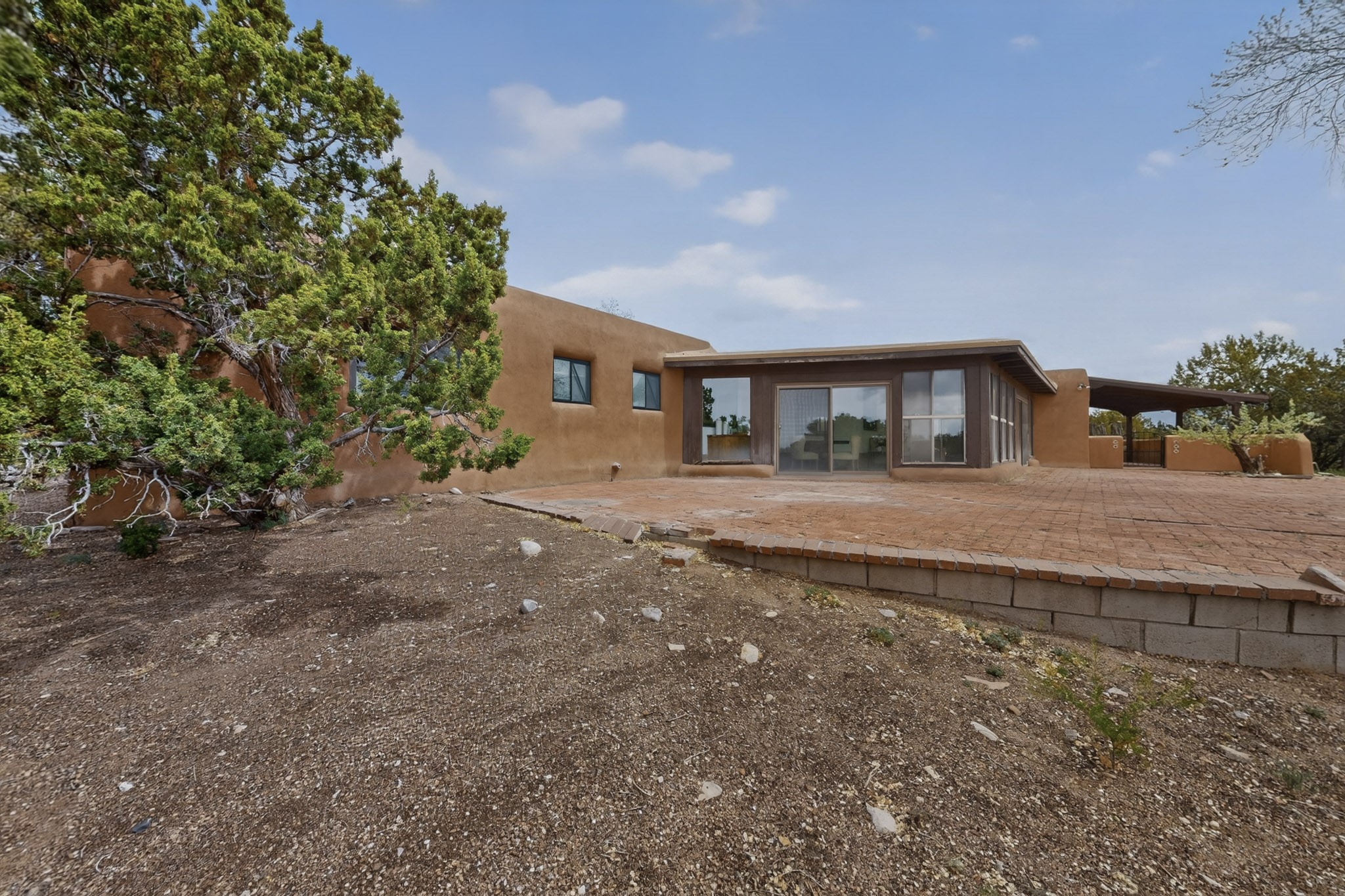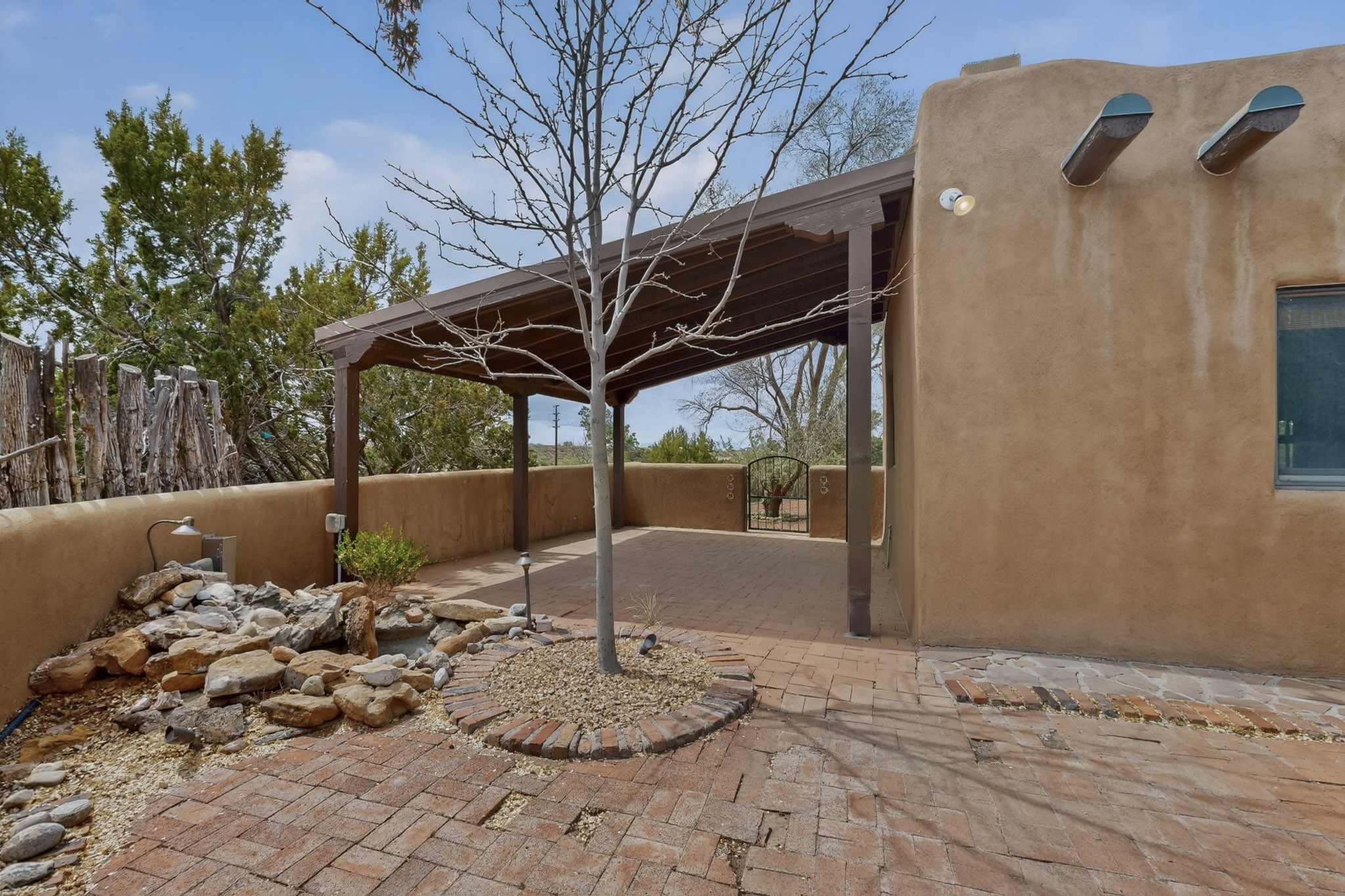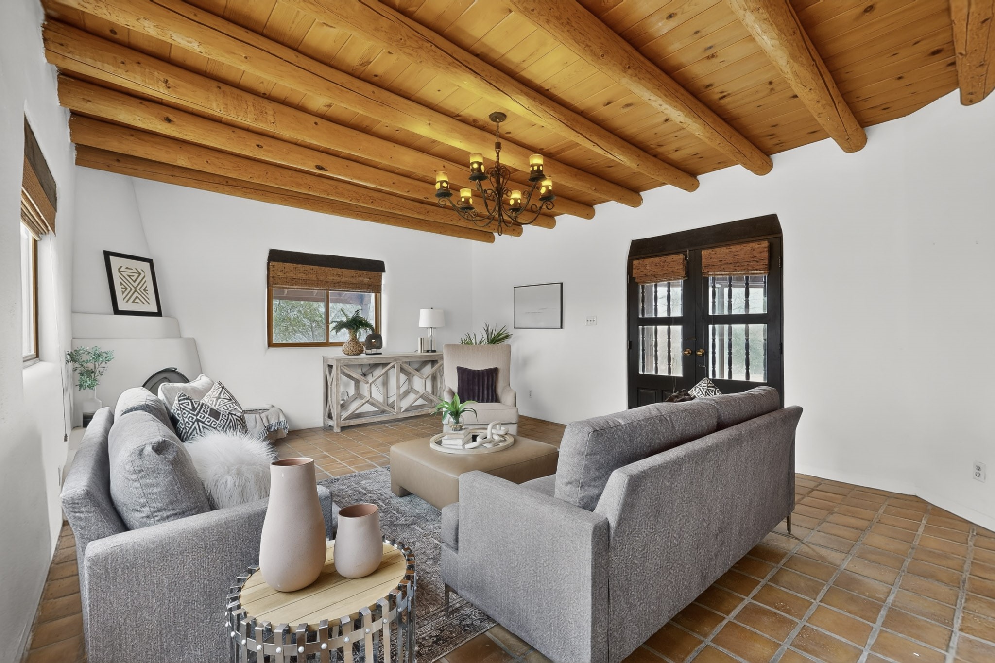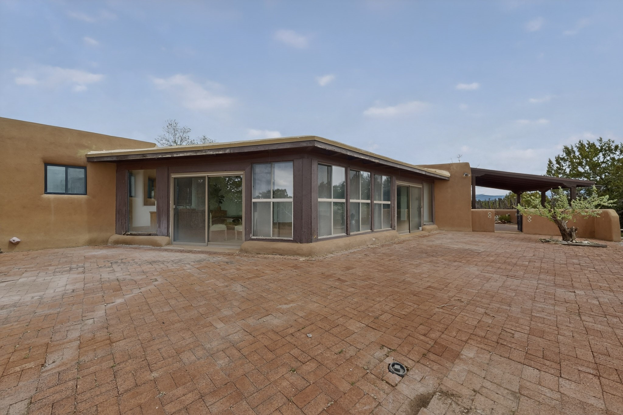 Located in the Puesta Del Sol subdivision, this Santa Fe-style charmer sits on an expansive 7.78-acre parcel in the peaceful Southern NW quadrant of Santa Fe. Built circa 1966, this 3-bedroom, 2-bath home offers approximately 2,295 sqft. of warm, rustic character with timeless Southwestern details throughout, including Saltillo tile floors, vigas and beams, wood-paneled walls, and two kiva fireplaces. The inviting main living area centers around a classic kiva fireplace, while the spacious primary suite features its own fireplace, viga ceilings, and bathroom. A bright, South-facing sunroom brings in abundant natural light, creating a comfortable year-round living space. Outdoor living is equally appealing with an enclosed East-facing courtyard, a large brick patio to the South, and a generously sized fenced yard; ideal for pets, gardening, or enjoying the surrounding landscape. Peek-a-boo views of the Sangre de Cristo Mountains add to the property's charm, while nearby arroyos offer opportunities for hiking or horseback riding. Conveniently located near Highway 599, this home provides easy access to both downtown Santa Fe and the Southside. Offered as part of an estate sale, this property presents a rare opportunity to update and personalize a classic Santa Fe home while maintaining its authentic character and setting.