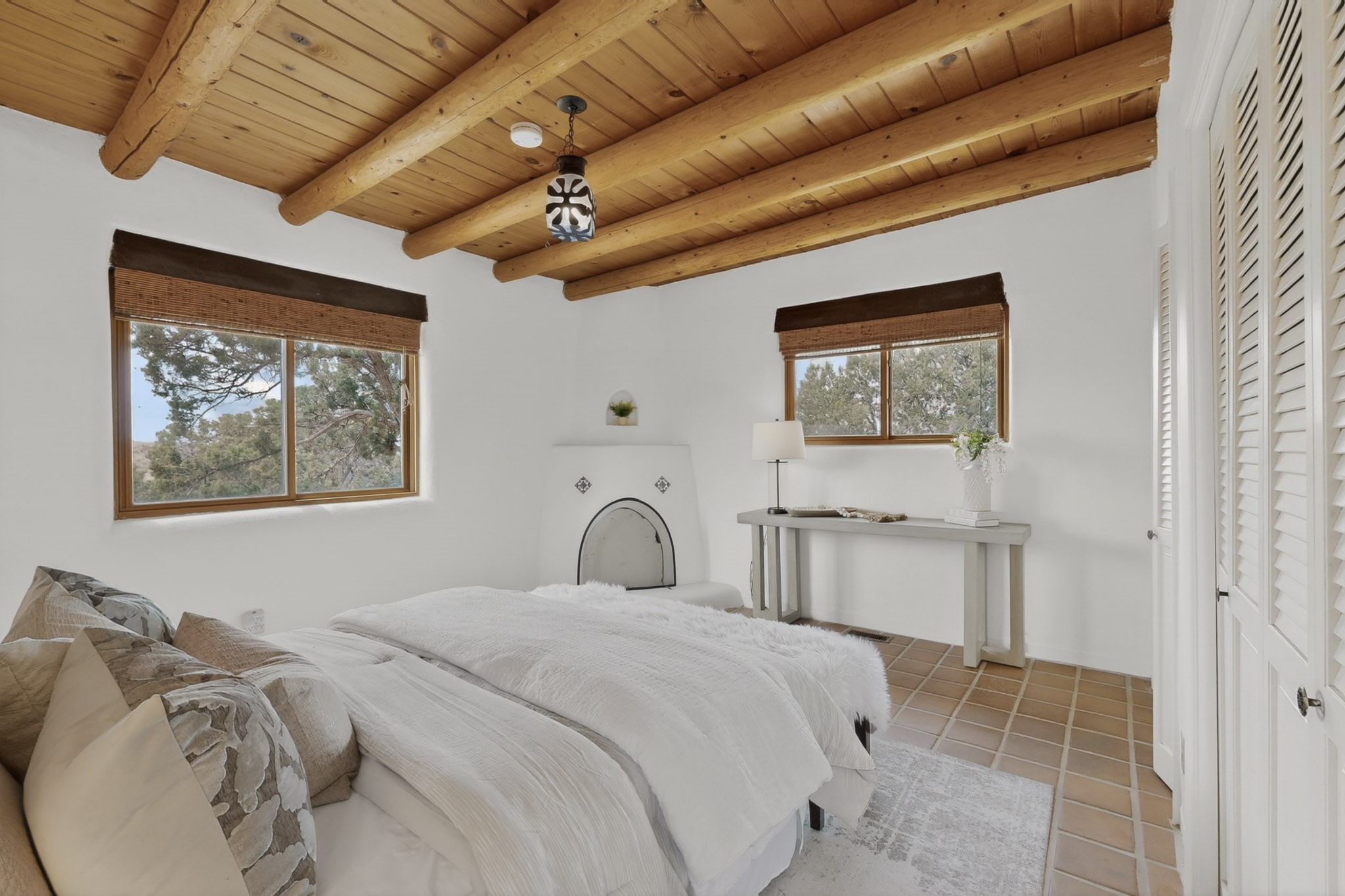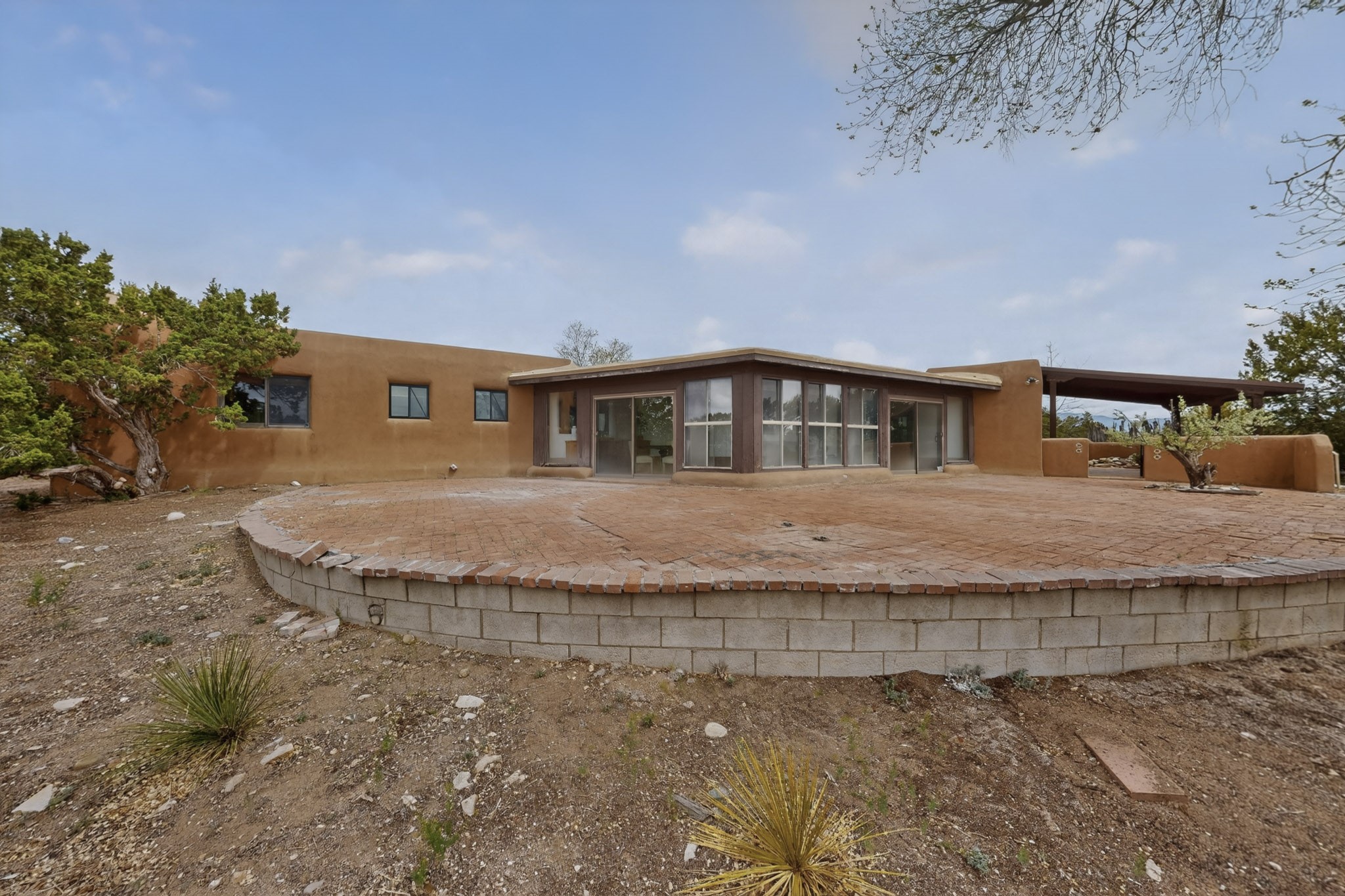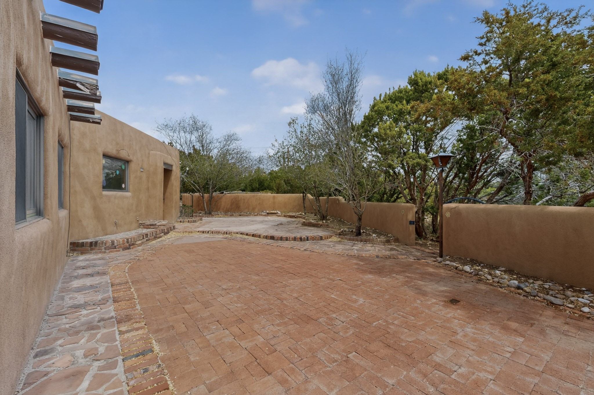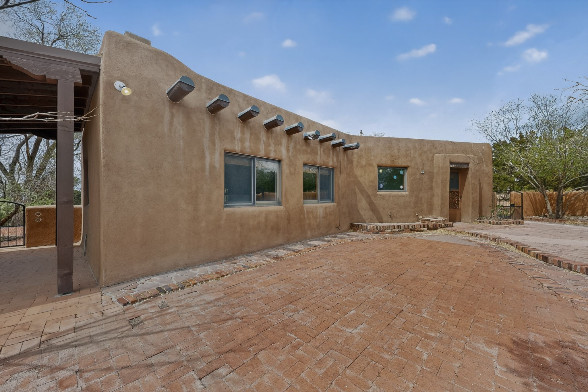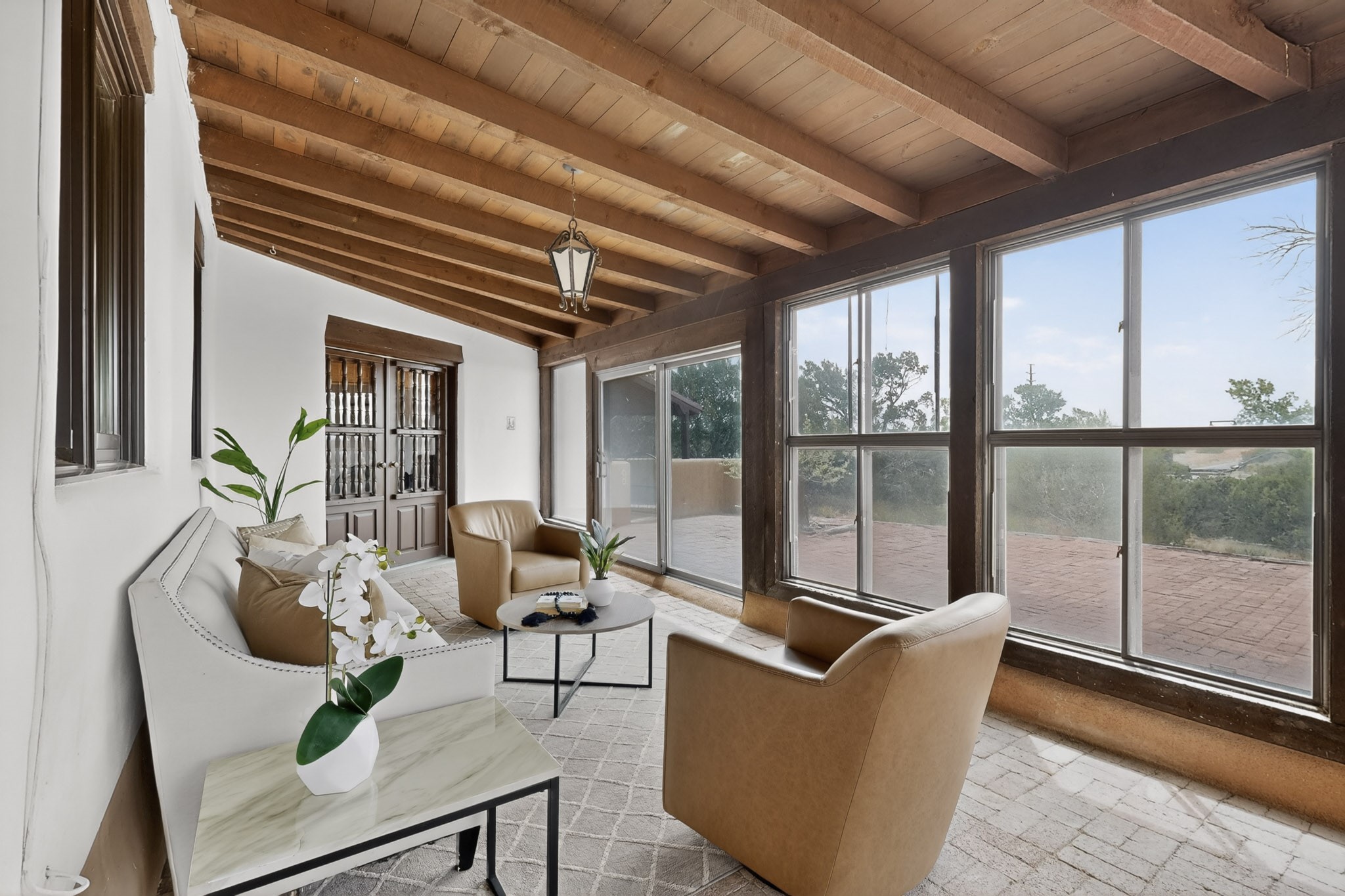 Located in the Puesta Del Sol subdivision, this Santa Fe-style charmer sits on an expansive 7.78-acre parcel in the peaceful Southern NW quadrant of Santa Fe. Built circa 1966, this 3-bedroom, 2-bath home offers approximately 2,295 sqft. of warm, rustic character with timeless Southwestern details throughout, including Saltillo tile floors, vigas and beams, wood-paneled walls, and two kiva fireplaces. The inviting main living area centers around a classic kiva fireplace, while the spacious primary suite features its own fireplace, viga ceilings, and bathroom. A bright, South-facing sunroom brings in abundant natural light, creating a comfortable year-round living space. Outdoor living is equally appealing with an enclosed East-facing courtyard, a large brick patio to the South, and a generously sized fenced yard; ideal for pets, gardening, or enjoying the surrounding landscape. Peek-a-boo views of the Sangre de Cristo Mountains add to the property's charm, while nearby arroyos offer opportunities for hiking or horseback riding. Conveniently located near Highway 599, this home provides easy access to both downtown Santa Fe and the Southside. Offered as part of an estate sale, this property presents a rare opportunity to update and personalize a classic Santa Fe home while maintaining its authentic character and setting.