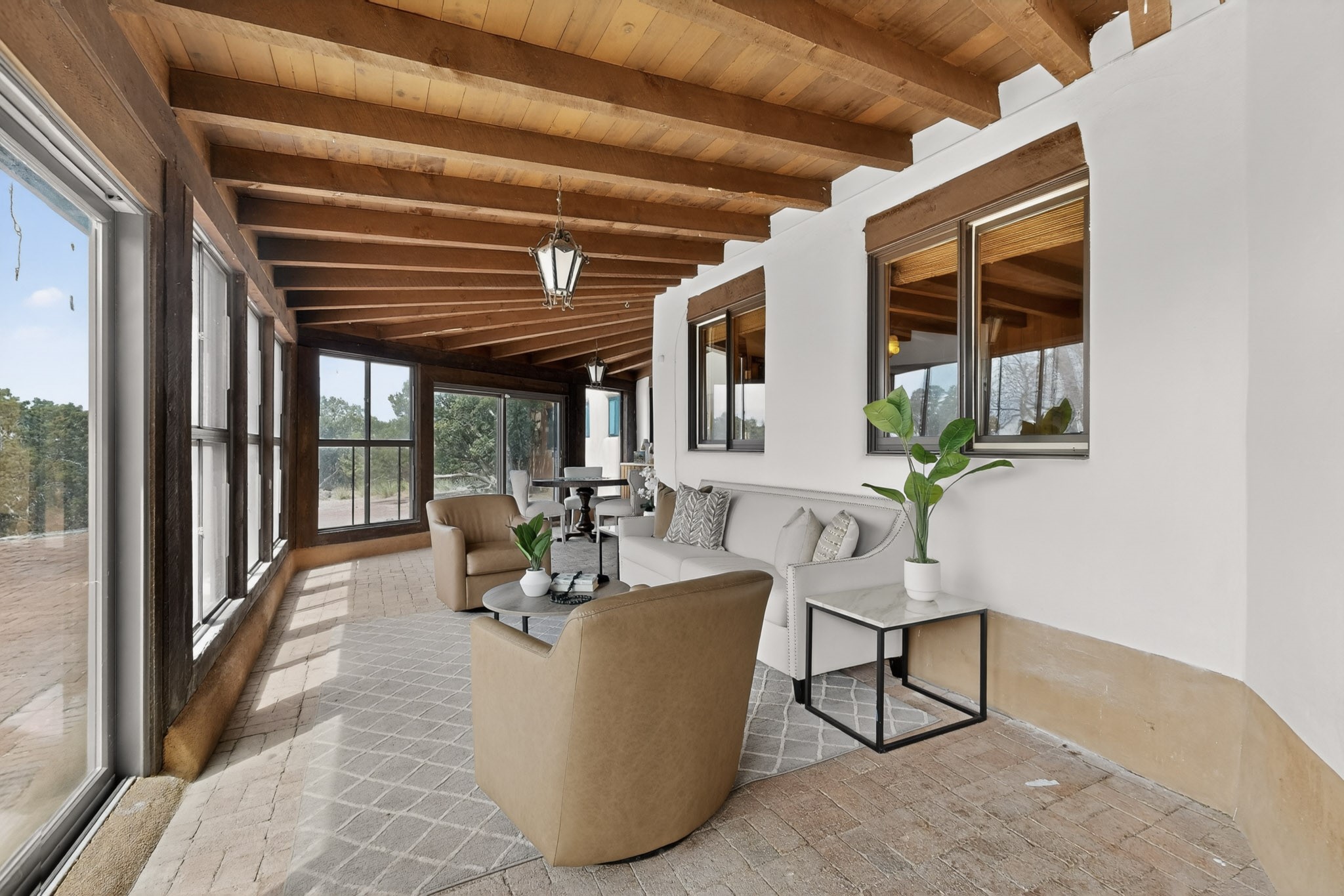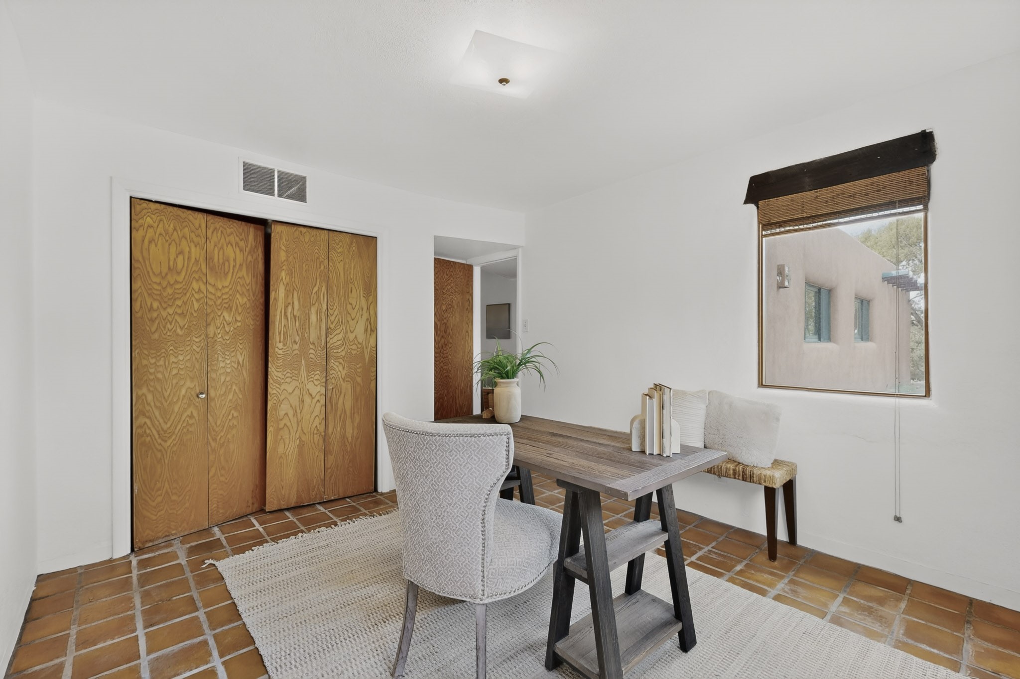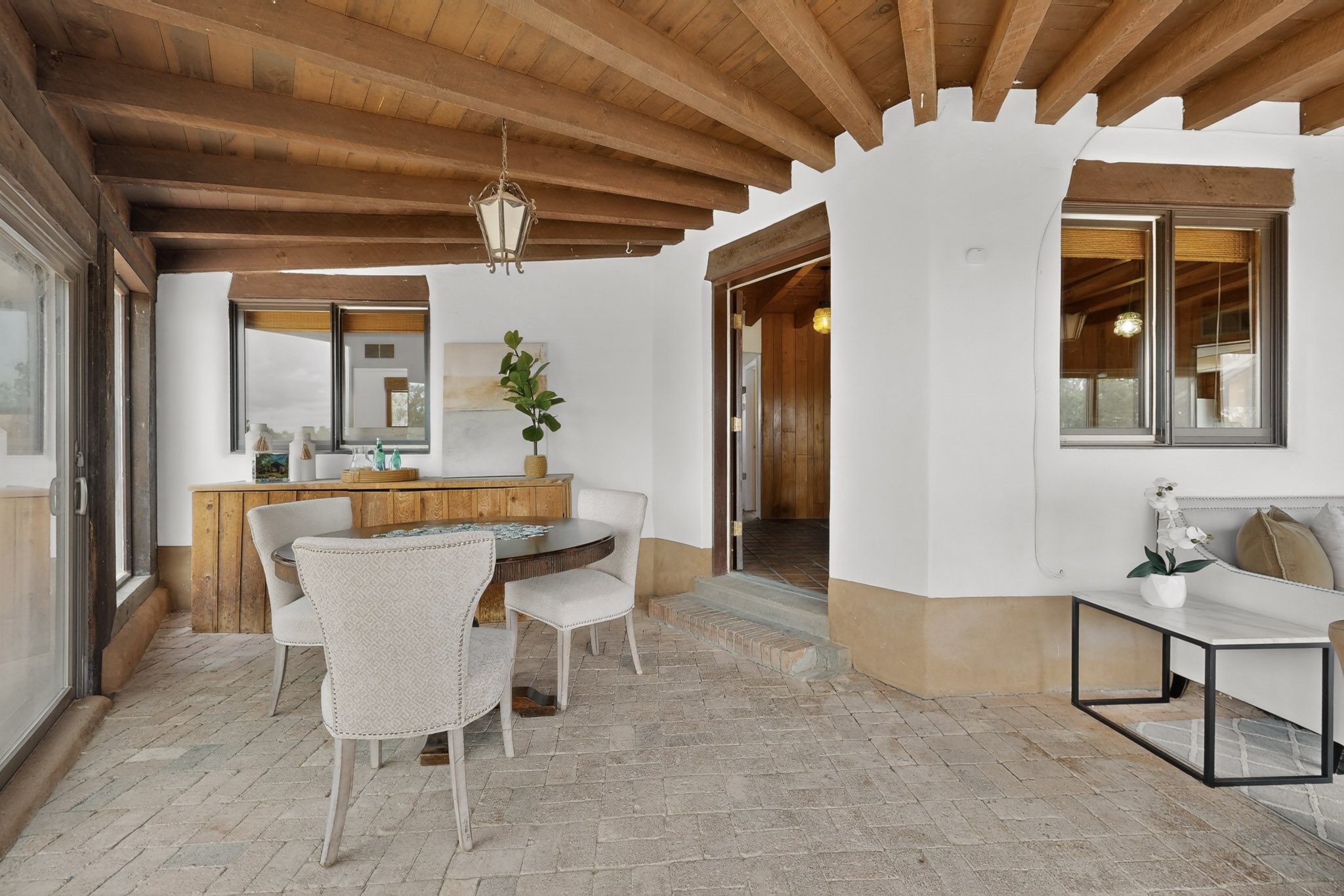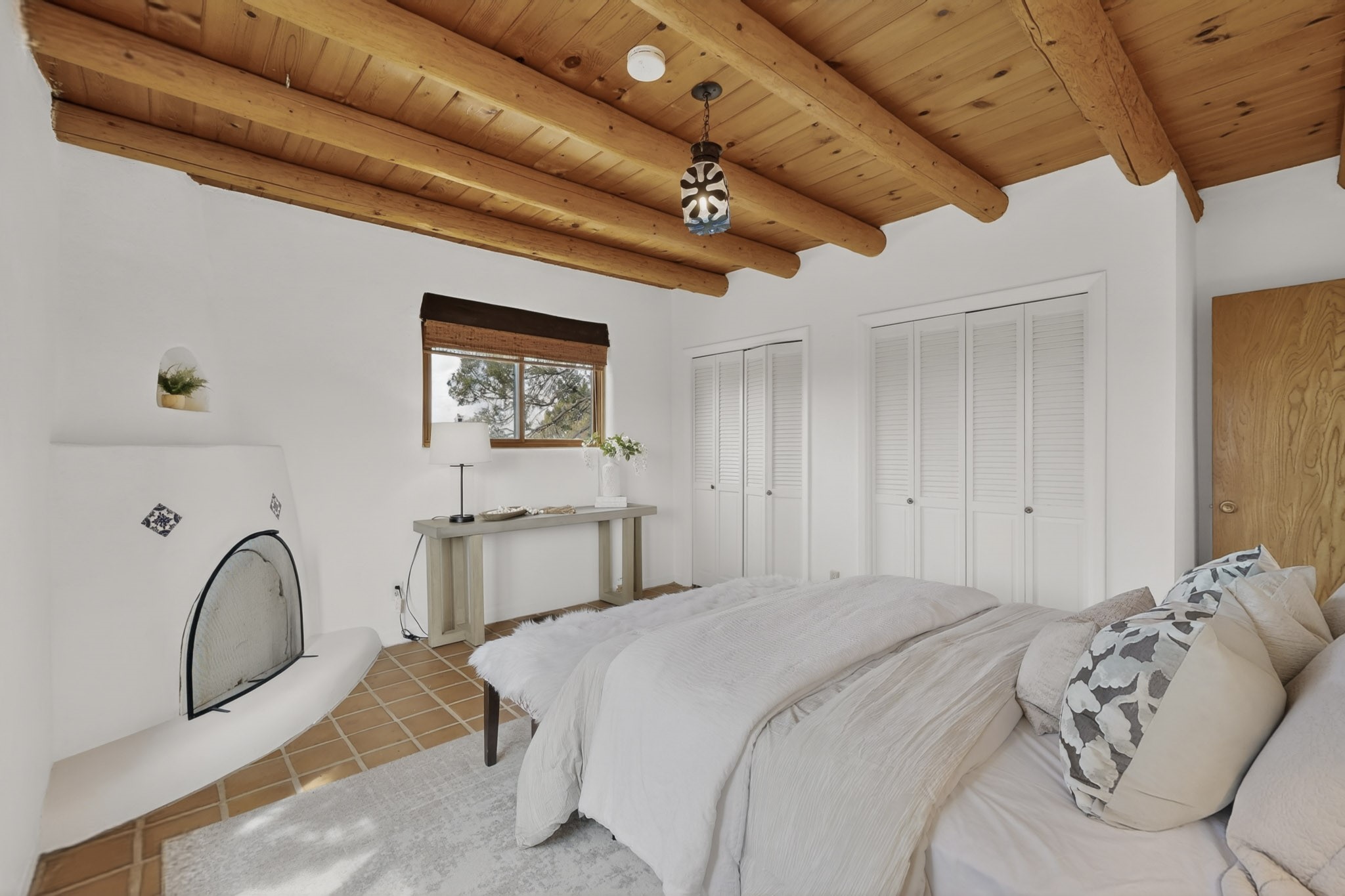 Located in the Puesta Del Sol subdivision, this Santa Fe-style charmer sits on an expansive 7.78-acre parcel in the peaceful Southern NW quadrant of Santa Fe. Built circa 1966, this 3-bedroom, 2-bath home offers approximately 2,295 sqft. of warm, rustic character with timeless Southwestern details throughout, including Saltillo tile floors, vigas and beams, wood-paneled walls, and two kiva fireplaces. The inviting main living area centers around a classic kiva fireplace, while the spacious primary suite features its own fireplace, viga ceilings, and bathroom. A bright, South-facing sunroom brings in abundant natural light, creating a comfortable year-round living space. Outdoor living is equally appealing with an enclosed East-facing courtyard, a large brick patio to the South, and a generously sized fenced yard; ideal for pets, gardening, or enjoying the surrounding landscape. Peek-a-boo views of the Sangre de Cristo Mountains add to the property's charm, while nearby arroyos offer opportunities for hiking or horseback riding. Conveniently located near Highway 599, this home provides easy access to both downtown Santa Fe and the Southside. Offered as part of an estate sale, this property presents a rare opportunity to update and personalize a classic Santa Fe home while maintaining its authentic character and setting.