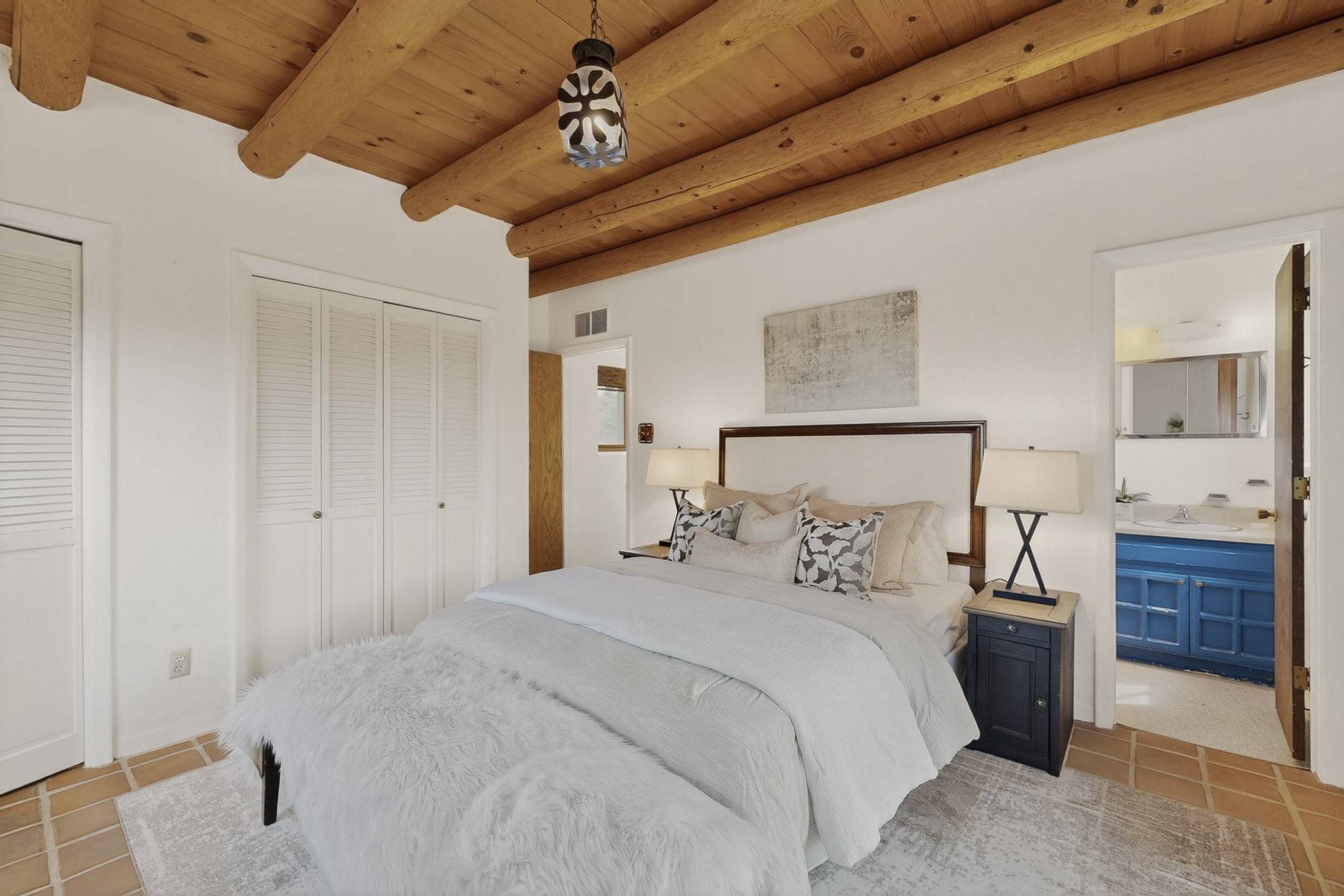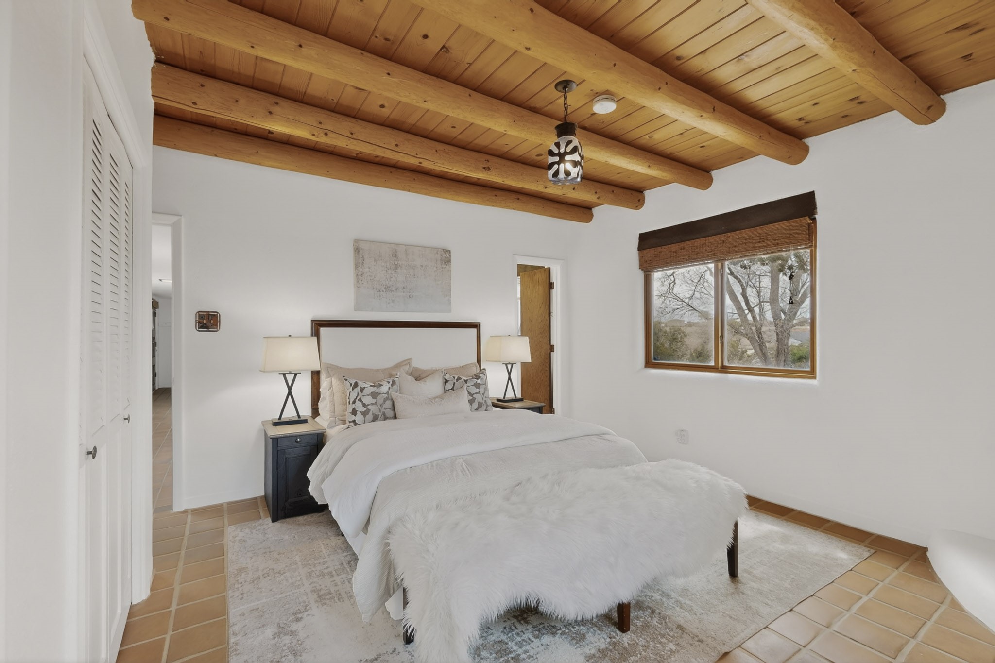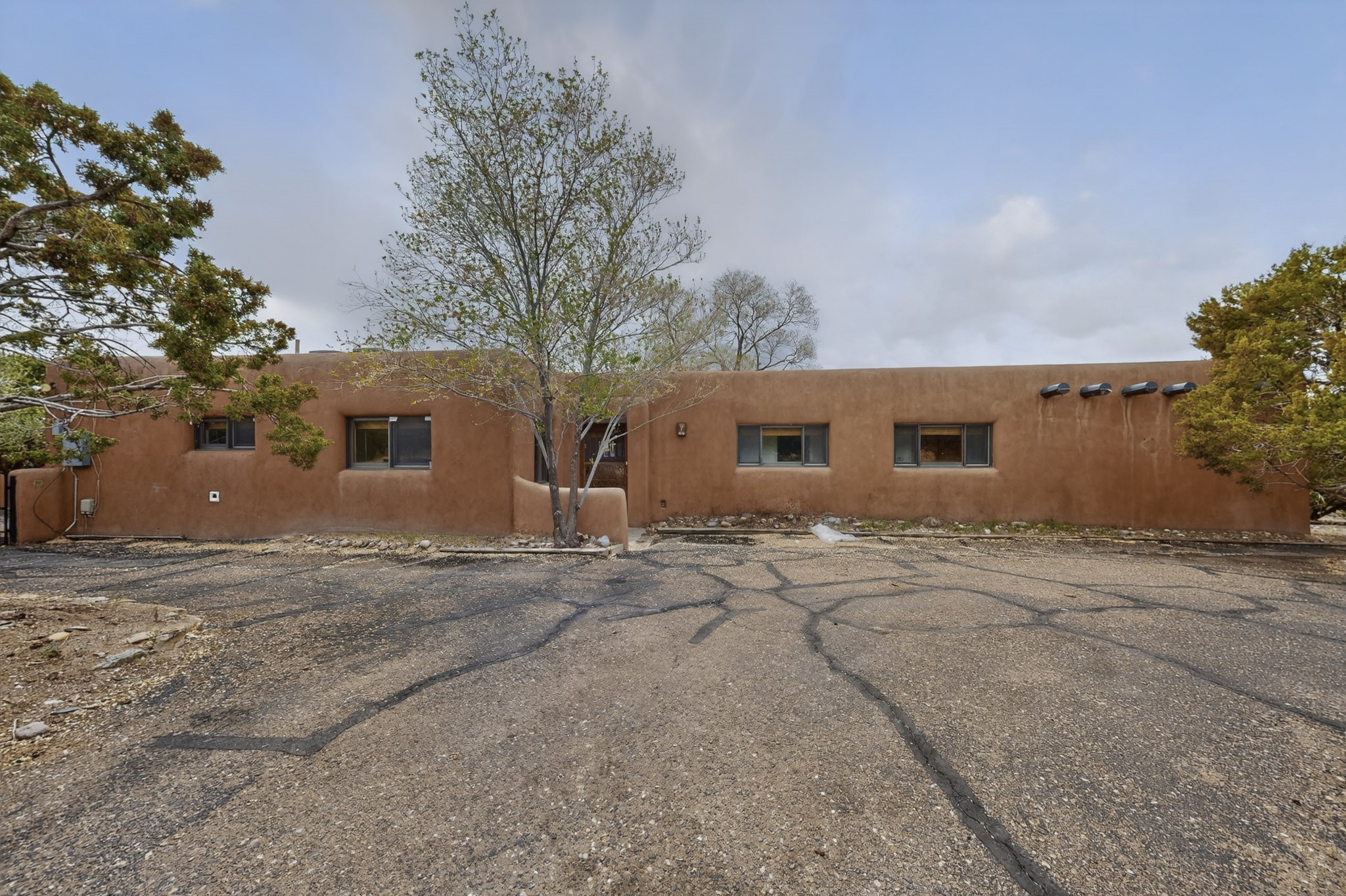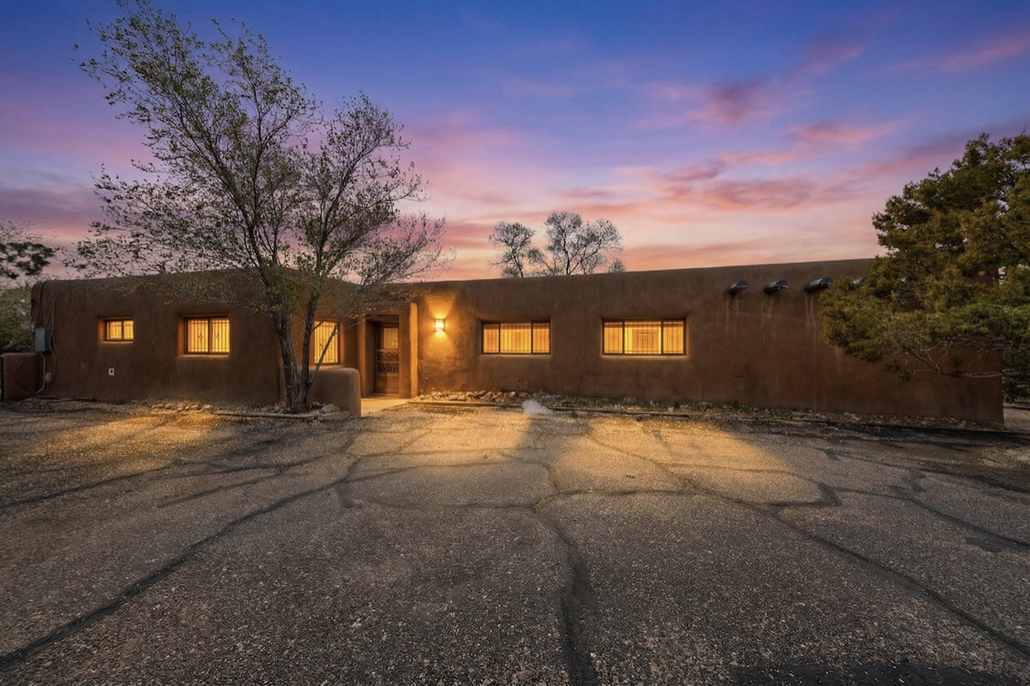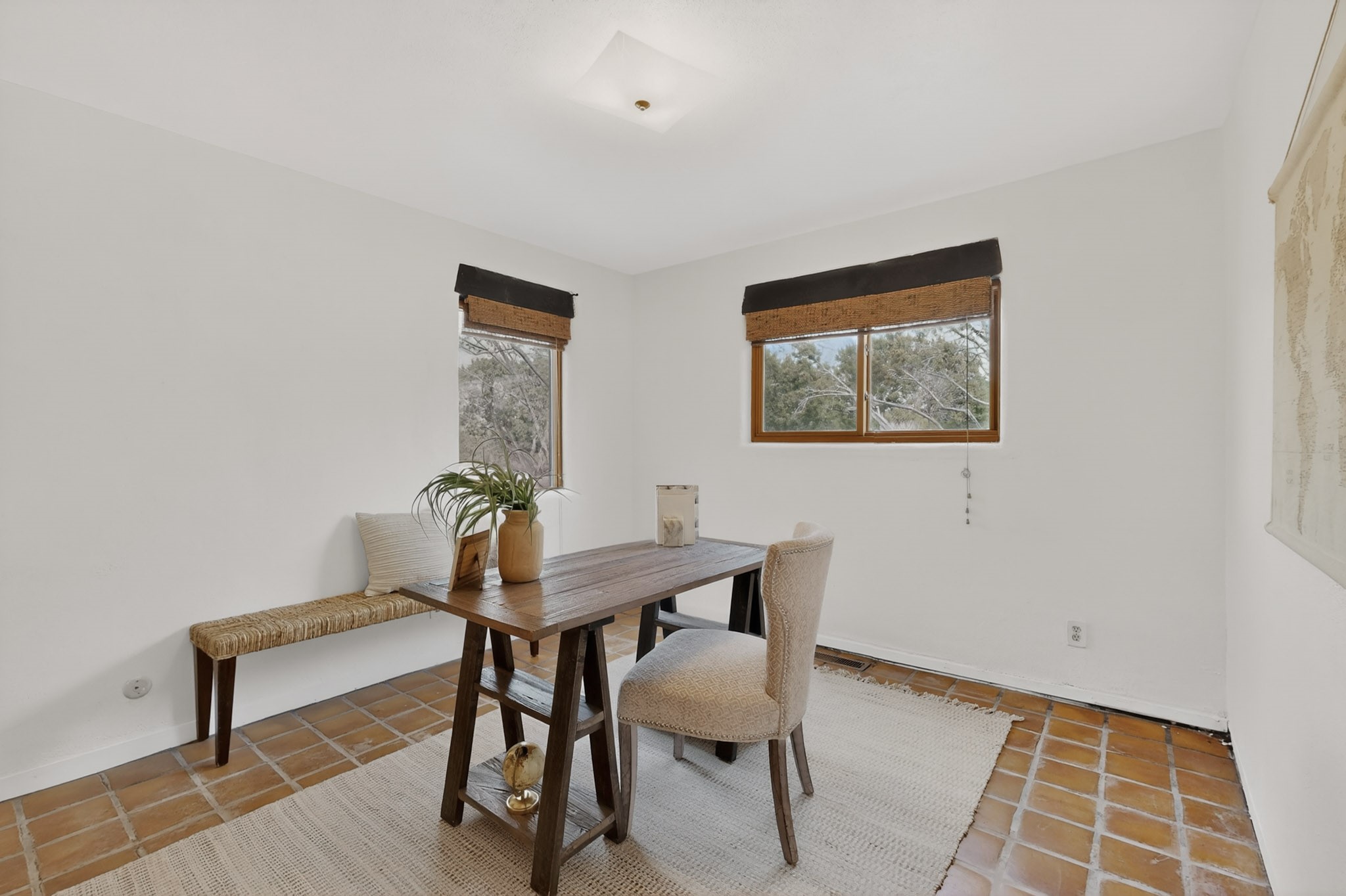 Located in the Puesta Del Sol subdivision, this Santa Fe-style charmer sits on an expansive 7.78-acre parcel in the peaceful Southern NW quadrant of Santa Fe. Built circa 1966, this 3-bedroom, 2-bath home offers approximately 2,295 sqft. of warm, rustic character with timeless Southwestern details throughout, including Saltillo tile floors, vigas and beams, wood-paneled walls, and two kiva fireplaces. The inviting main living area centers around a classic kiva fireplace, while the spacious primary suite features its own fireplace, viga ceilings, and bathroom. A bright, South-facing sunroom brings in abundant natural light, creating a comfortable year-round living space. Outdoor living is equally appealing with an enclosed East-facing courtyard, a large brick patio to the South, and a generously sized fenced yard; ideal for pets, gardening, or enjoying the surrounding landscape. Peek-a-boo views of the Sangre de Cristo Mountains add to the property's charm, while nearby arroyos offer opportunities for hiking or horseback riding. Conveniently located near Highway 599, this home provides easy access to both downtown Santa Fe and the Southside. Offered as part of an estate sale, this property presents a rare opportunity to update and personalize a classic Santa Fe home while maintaining its authentic character and setting.