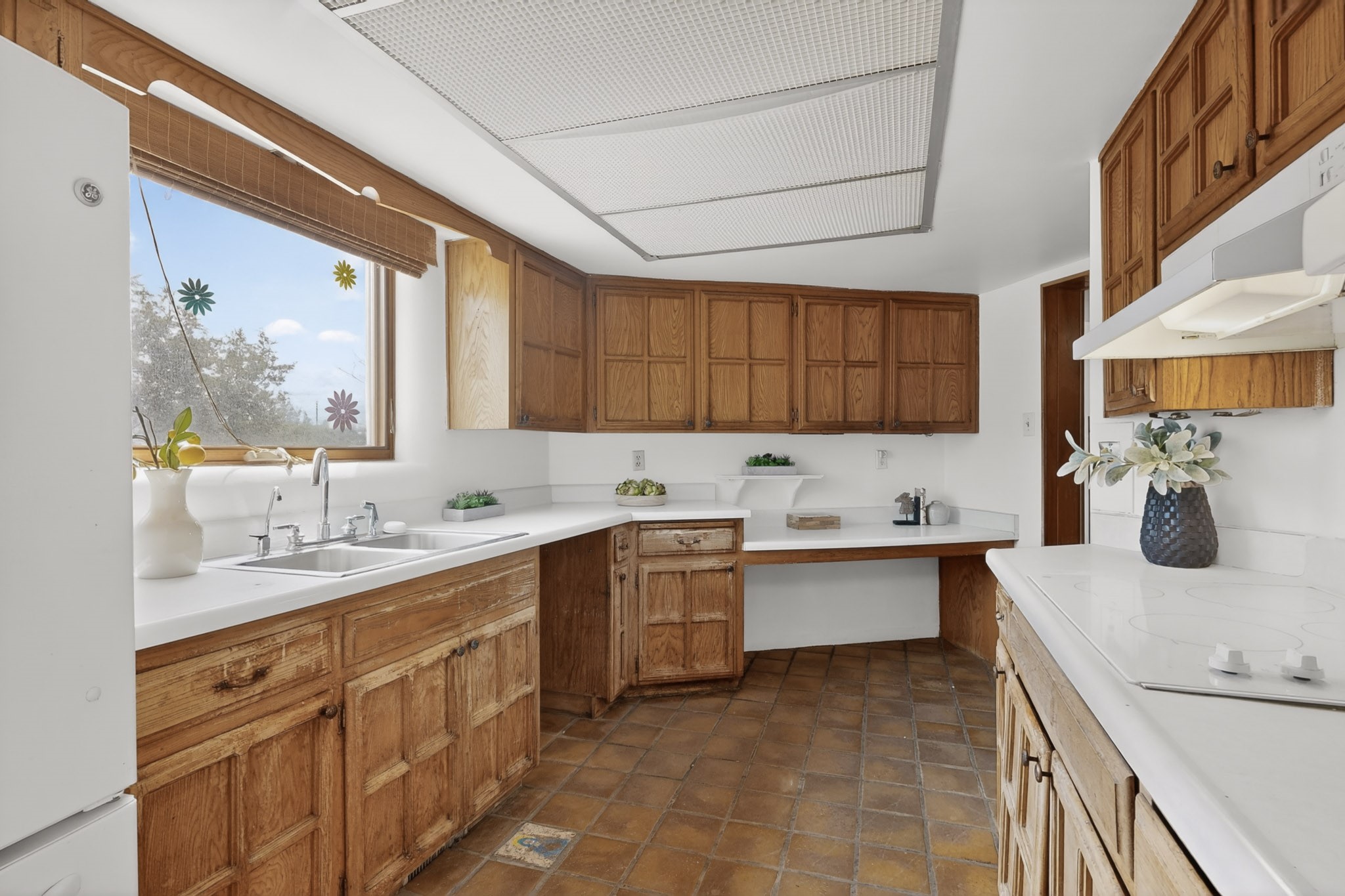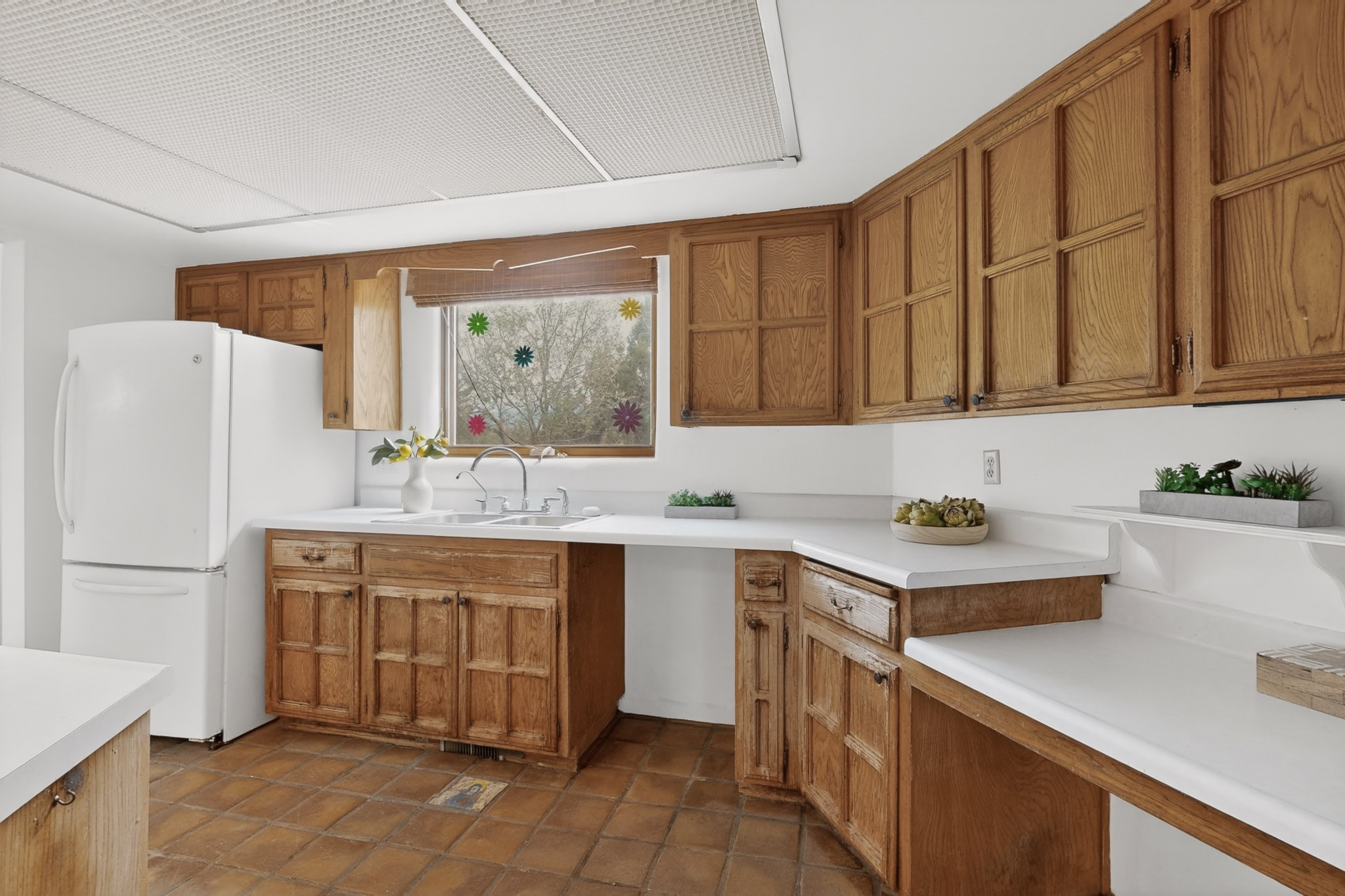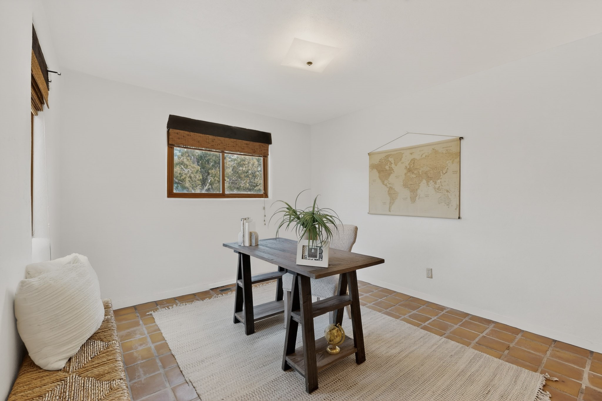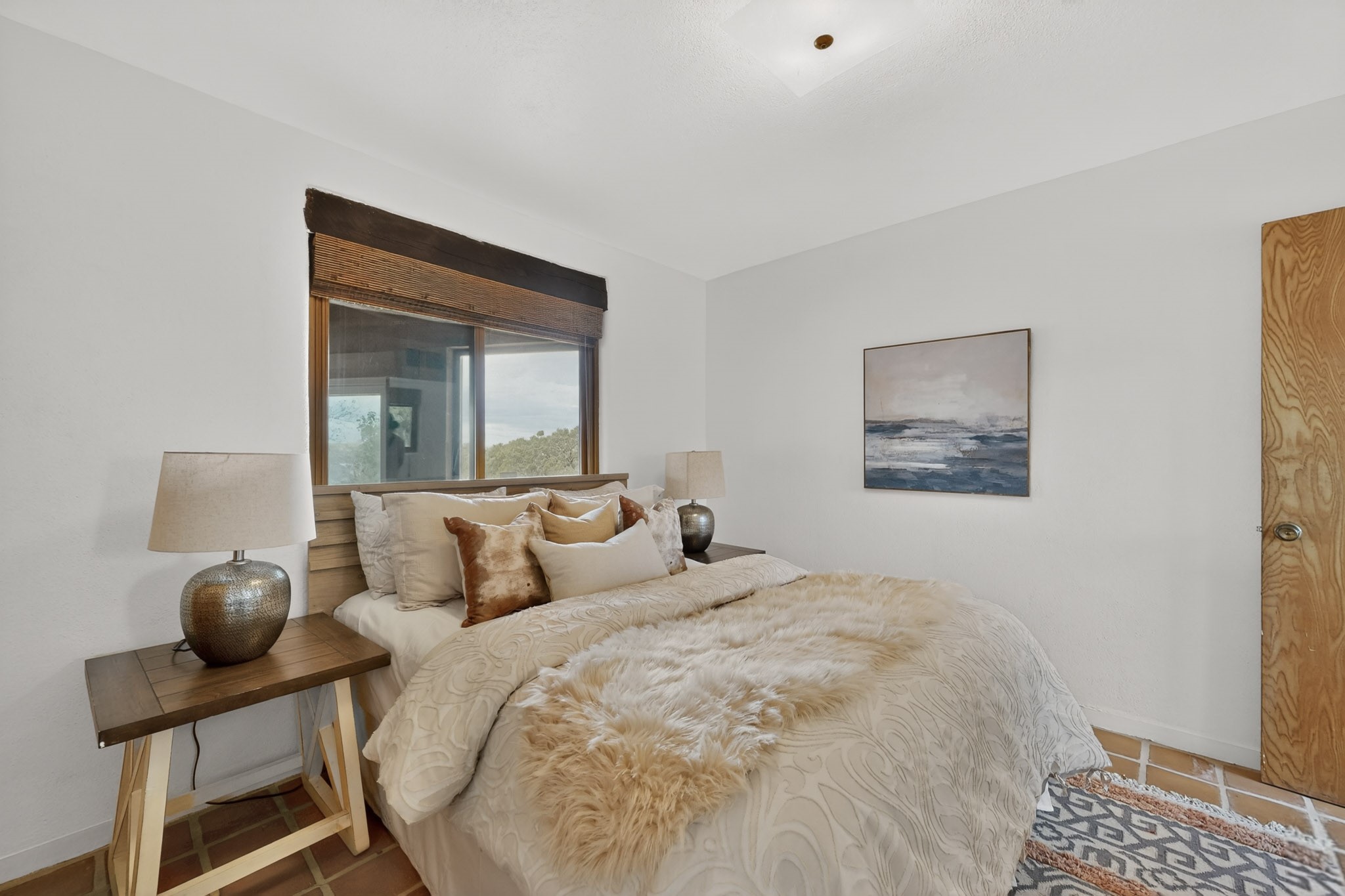 Located in the Puesta Del Sol subdivision, this Santa Fe-style charmer sits on an expansive 7.78-acre parcel in the peaceful Southern NW quadrant of Santa Fe. Built circa 1966, this 3-bedroom, 2-bath home offers approximately 2,295 sqft. of warm, rustic character with timeless Southwestern details throughout, including Saltillo tile floors, vigas and beams, wood-paneled walls, and two kiva fireplaces. The inviting main living area centers around a classic kiva fireplace, while the spacious primary suite features its own fireplace, viga ceilings, and bathroom. A bright, South-facing sunroom brings in abundant natural light, creating a comfortable year-round living space. Outdoor living is equally appealing with an enclosed East-facing courtyard, a large brick patio to the South, and a generously sized fenced yard; ideal for pets, gardening, or enjoying the surrounding landscape. Peek-a-boo views of the Sangre de Cristo Mountains add to the property's charm, while nearby arroyos offer opportunities for hiking or horseback riding. Conveniently located near Highway 599, this home provides easy access to both downtown Santa Fe and the Southside. Offered as part of an estate sale, this property presents a rare opportunity to update and personalize a classic Santa Fe home while maintaining its authentic character and setting.