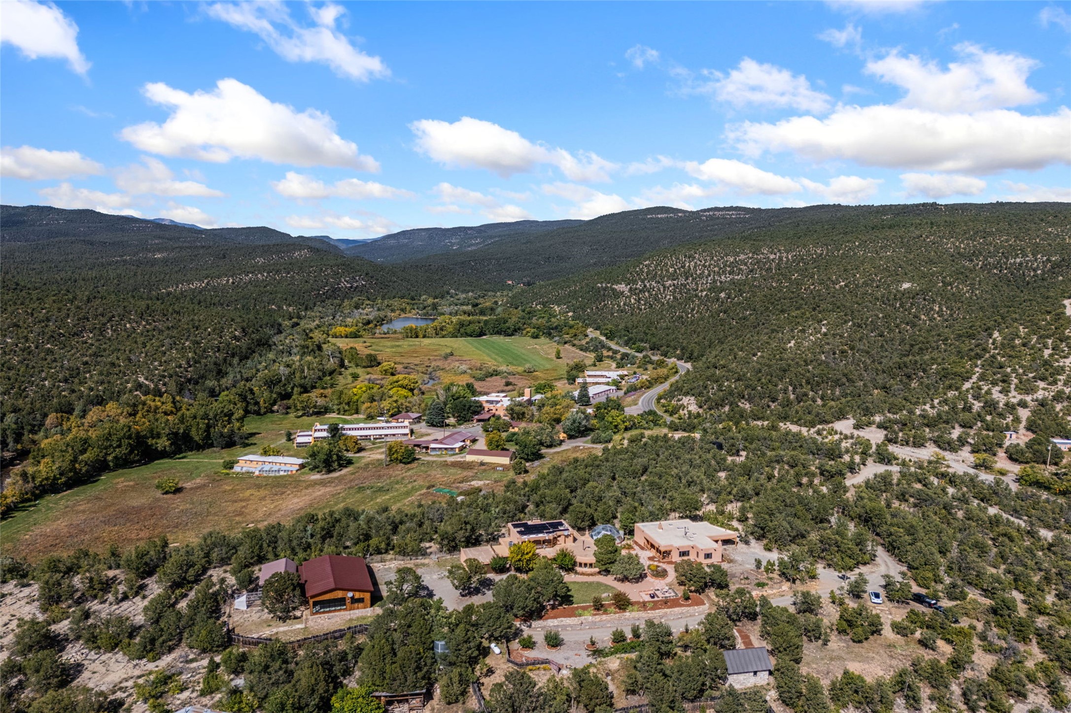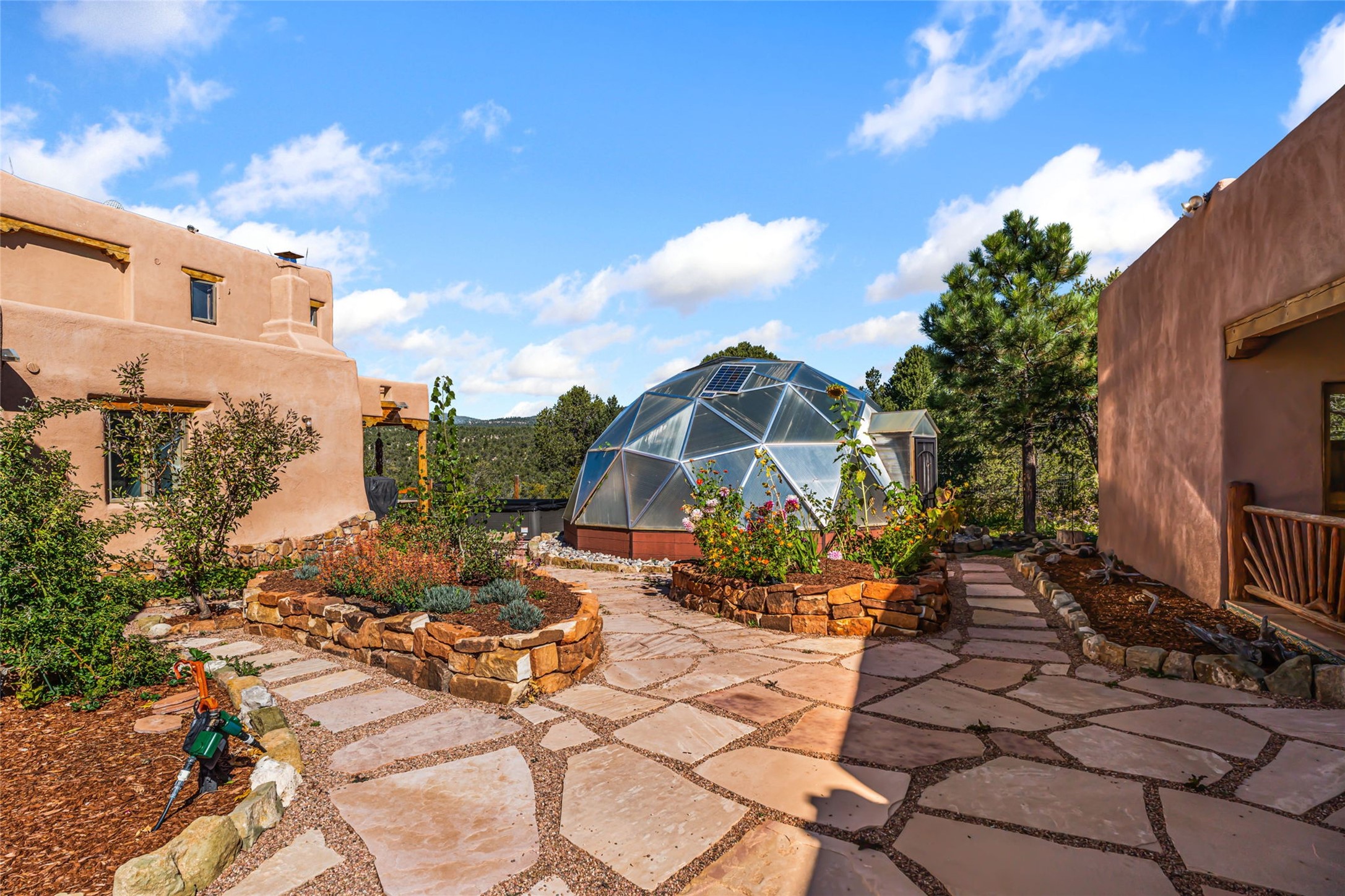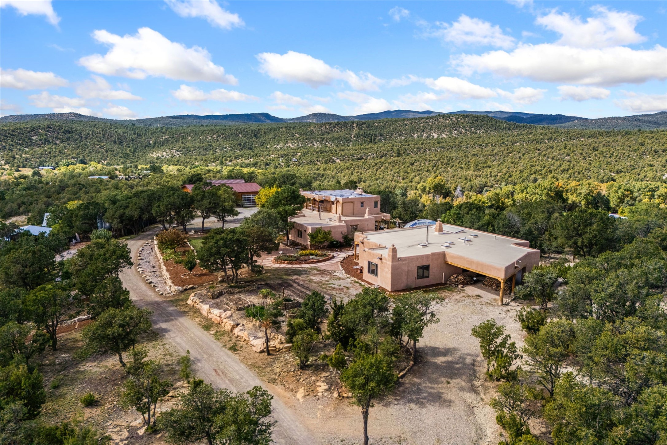 Set on nearly four acres 30 minutes from Santa Fe and only minutes from the Pecos River, 16 Hubbard Hill offers a profound and immediate sense of peace. The property overlooks serene Monastery Lake and borders more than one thousand acres of land belonging to the Benedictine Monastery, creating extraordinary privacy and an uninterrupted natural backdrop. This extraordinary estate was originally the personal residence and apex creation of renowned custom builder Richard Roybal, a true Northern New Mexico artisan whose craftsmanship is visible in every detail. Hand inlaid wood floors, sculpted stonework, vigas and latillas, aspen and willow ceilings and generous windows create a warm, soulful environment filled with natural light. The home has been thoughtfully expanded and impeccably maintained ever since, evolving into a property that supports both refined living and meaningful self-reliance.The current owners have continued this legacy with significant upgrades designed for long-term comfort and sustainability. A powerful solar system with a three-plus-day battery backup provides dependable energy independence. Improvements to water and power systems were completed with durability and ease of living in mind. New fruit trees and hundreds of berry plants complement the existing mature plantings, contributing to a landscape that functions as a flourishing food forest. Landscaping throughout the property has been refined to minimize maintenance, maximize automation and support a thriving ecosystem for humans, birds and bees. A private gate marks the entrance to the estate, and the grounds are fully fenced to accommodate dogs, making the land as welcoming as it is expansive.One of the most exceptional features of the estate is the expansive detached garage and south-facing studio, where dramatic glass garage doors fill the space with natural light. This luminous building is ideal for an artist, maker, healer or collector and functions beautifully as a workshop, gallery, creative studio or retreat space.The greenhouse beautifully supports a lifestyle of intentional, sustainable living. It includes a large hydroponic water enclosure, solar-operated fans, automated roof ventilation and raised beds with full drip irrigation, all designed for maximum growing efficiency and year-round cultivation.The fully appointed guest house is a complete home of its own, not a simple casita. High ceilings and large windows create an airy, spacious feel, while thoughtfully placed skylights bring in abundant natural light. Heated tile floors throughout add comfort and warmth, and the full amenities offer exceptional flexibility for hosting, multigenerational living or generating rental income.With approximately eight thousand square feet of living and studio space, exceptional craftsmanship, modern enhancements and a landscape that feels both magical and deeply grounding, 16 Hubbard Hill stands as a truly singular offering. It is a home built to endure, expanded with care and aligned with a lifestyle that values beauty, creativity and self-reliance. A rare sanctuary with endless potential.