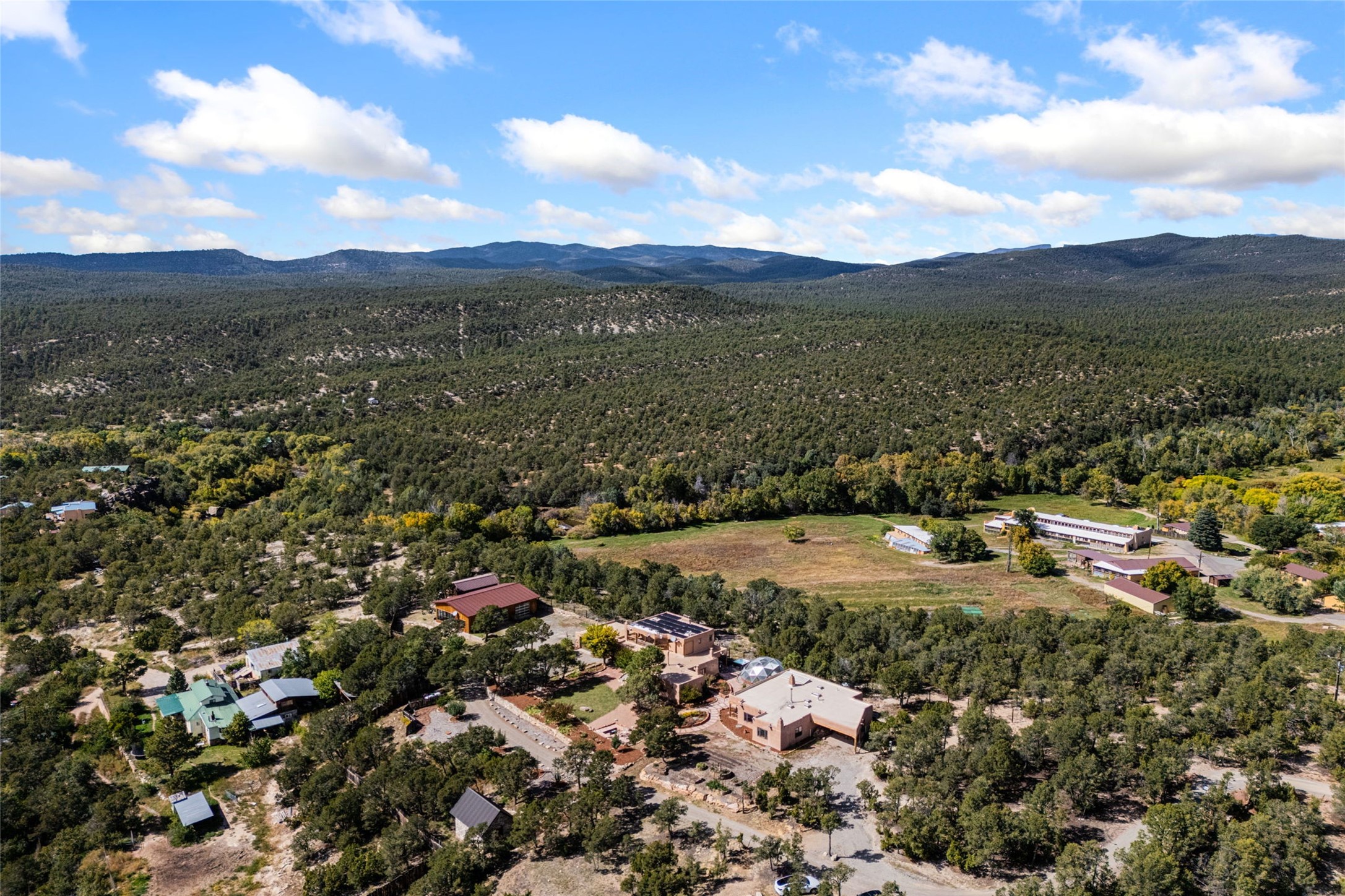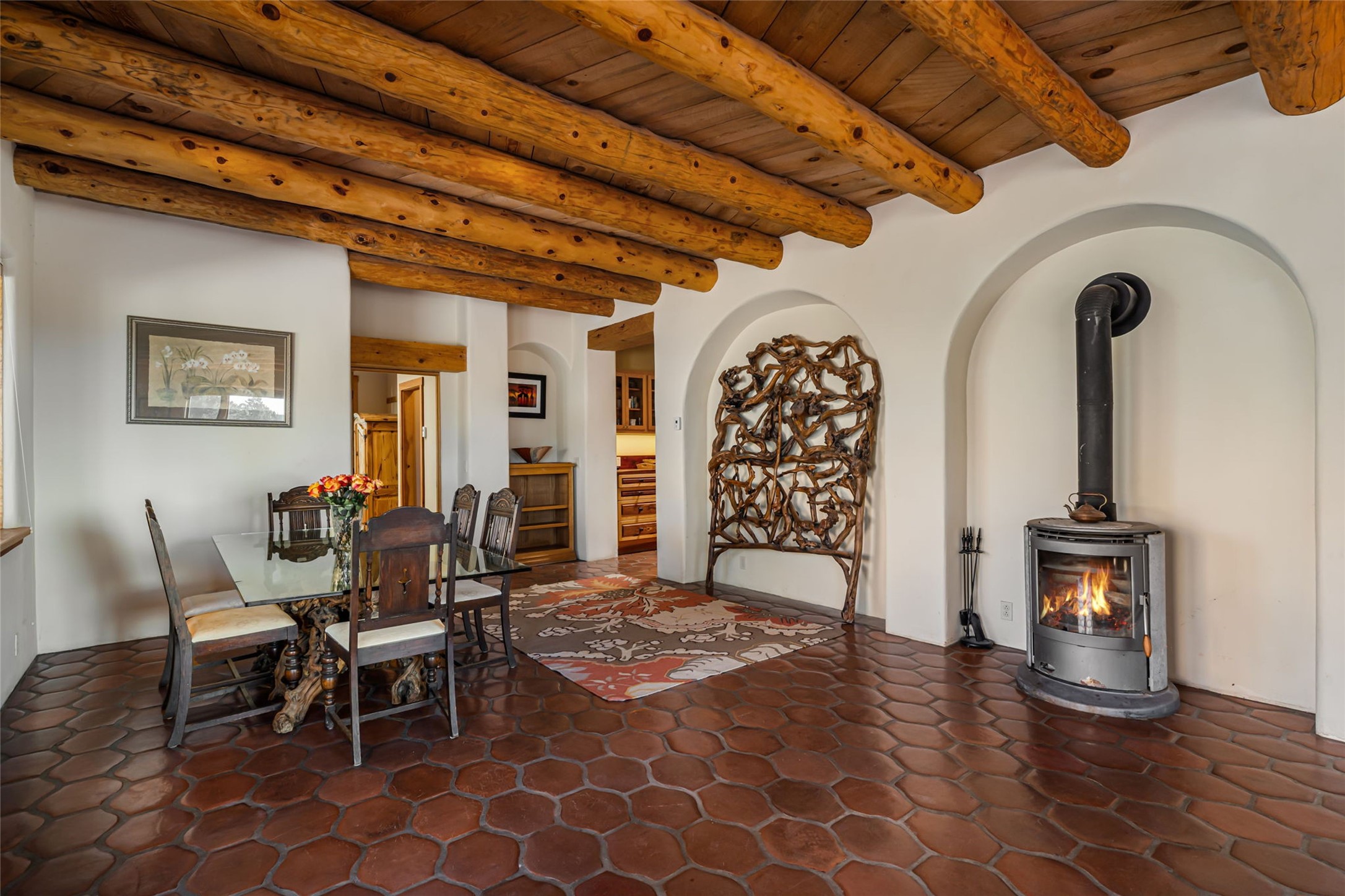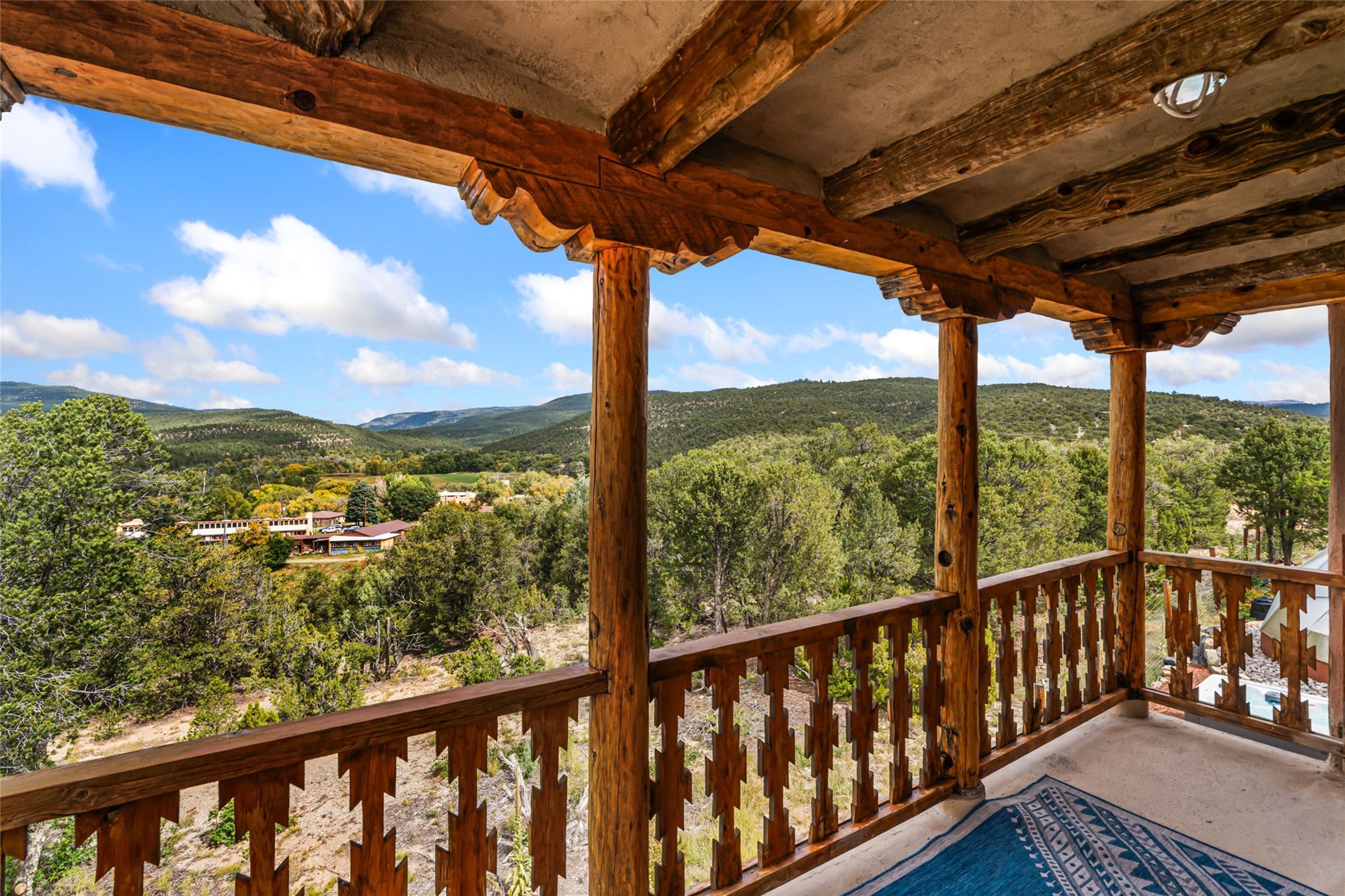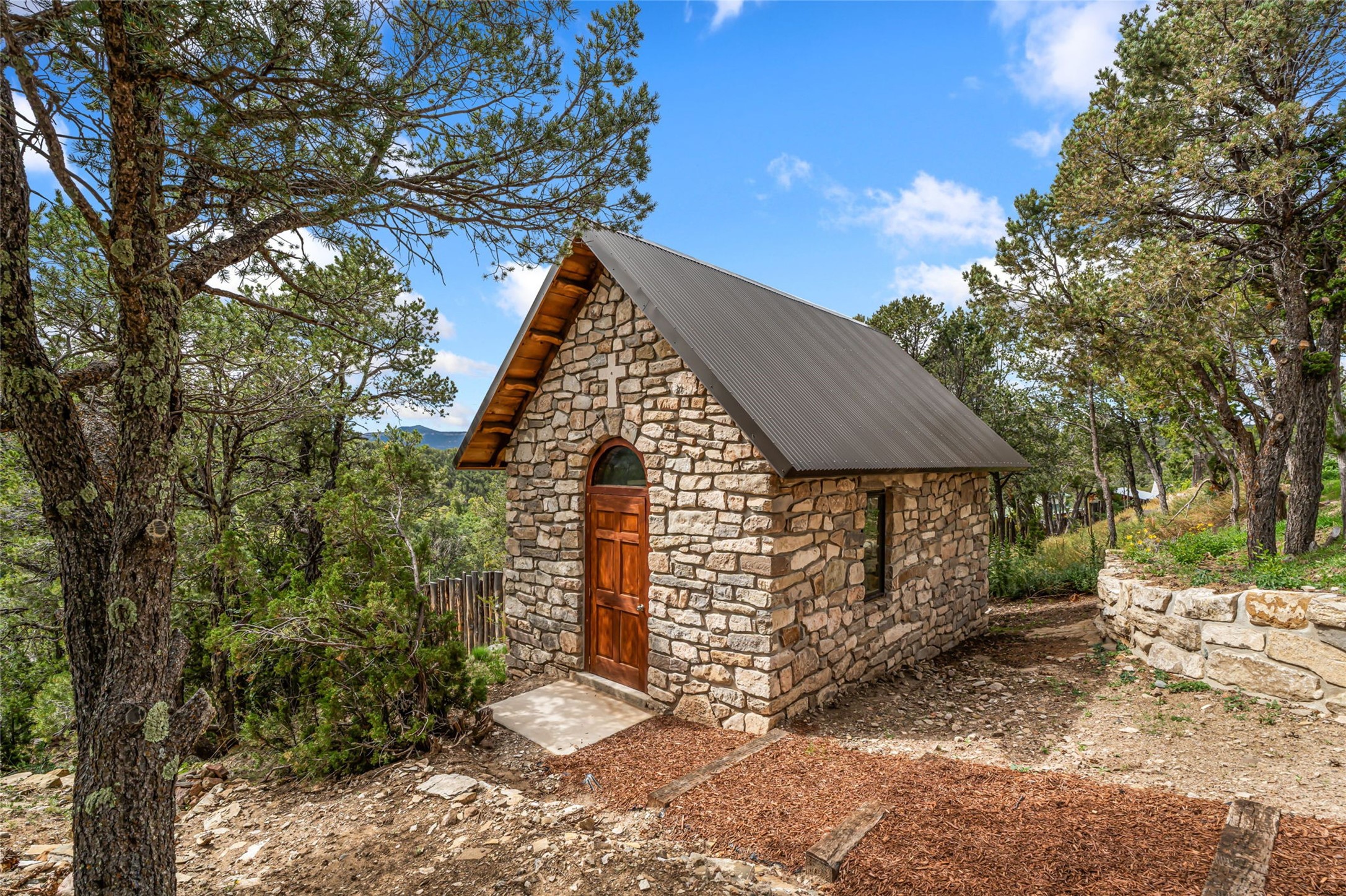 Set on nearly four acres 30 minutes from Santa Fe and only minutes from the Pecos River, 16 Hubbard Hill offers a profound and immediate sense of peace. The property overlooks serene Monastery Lake and borders more than one thousand acres of land belonging to the Benedictine Monastery, creating extraordinary privacy and an uninterrupted natural backdrop. This extraordinary estate was originally the personal residence and apex creation of renowned custom builder Richard Roybal, a true Northern New Mexico artisan whose craftsmanship is visible in every detail. Hand inlaid wood floors, sculpted stonework, vigas and latillas, aspen and willow ceilings and generous windows create a warm, soulful environment filled with natural light. The home has been thoughtfully expanded and impeccably maintained ever since, evolving into a property that supports both refined living and meaningful self-reliance.The current owners have continued this legacy with significant upgrades designed for long-term comfort and sustainability. A powerful solar system with a three-plus-day battery backup provides dependable energy independence. Improvements to water and power systems were completed with durability and ease of living in mind. New fruit trees and hundreds of berry plants complement the existing mature plantings, contributing to a landscape that functions as a flourishing food forest. Landscaping throughout the property has been refined to minimize maintenance, maximize automation and support a thriving ecosystem for humans, birds and bees. A private gate marks the entrance to the estate, and the grounds are fully fenced to accommodate dogs, making the land as welcoming as it is expansive.One of the most exceptional features of the estate is the expansive detached garage and south-facing studio, where dramatic glass garage doors fill the space with natural light. This luminous building is ideal for an artist, maker, healer or collector and functions beautifully as a workshop, gallery, creative studio or retreat space.The greenhouse beautifully supports a lifestyle of intentional, sustainable living. It includes a large hydroponic water enclosure, solar-operated fans, automated roof ventilation and raised beds with full drip irrigation, all designed for maximum growing efficiency and year-round cultivation.The fully appointed guest house is a complete home of its own, not a simple casita. High ceilings and large windows create an airy, spacious feel, while thoughtfully placed skylights bring in abundant natural light. Heated tile floors throughout add comfort and warmth, and the full amenities offer exceptional flexibility for hosting, multigenerational living or generating rental income.With approximately eight thousand square feet of living and studio space, exceptional craftsmanship, modern enhancements and a landscape that feels both magical and deeply grounding, 16 Hubbard Hill stands as a truly singular offering. It is a home built to endure, expanded with care and aligned with a lifestyle that values beauty, creativity and self-reliance. A rare sanctuary with endless potential.