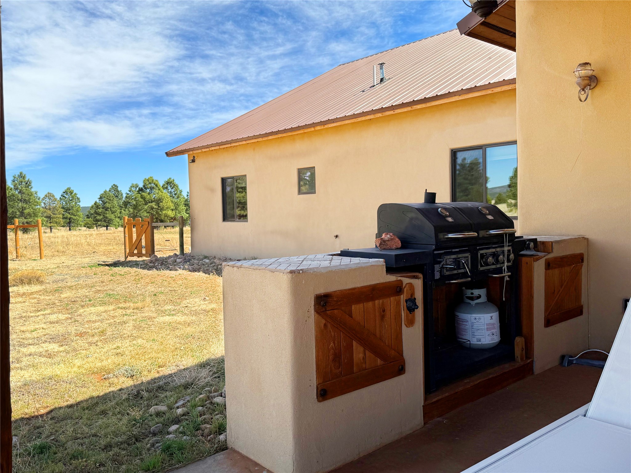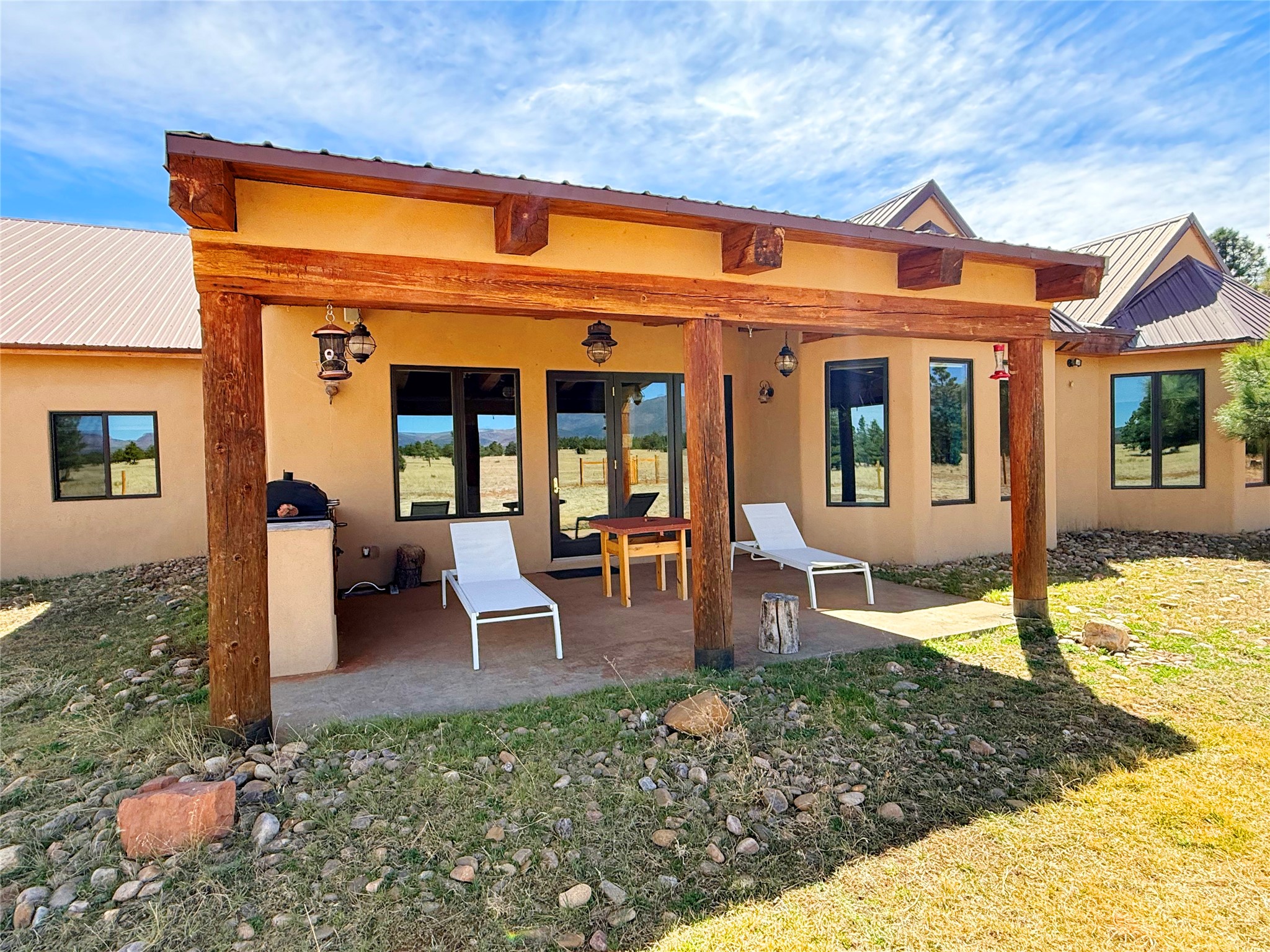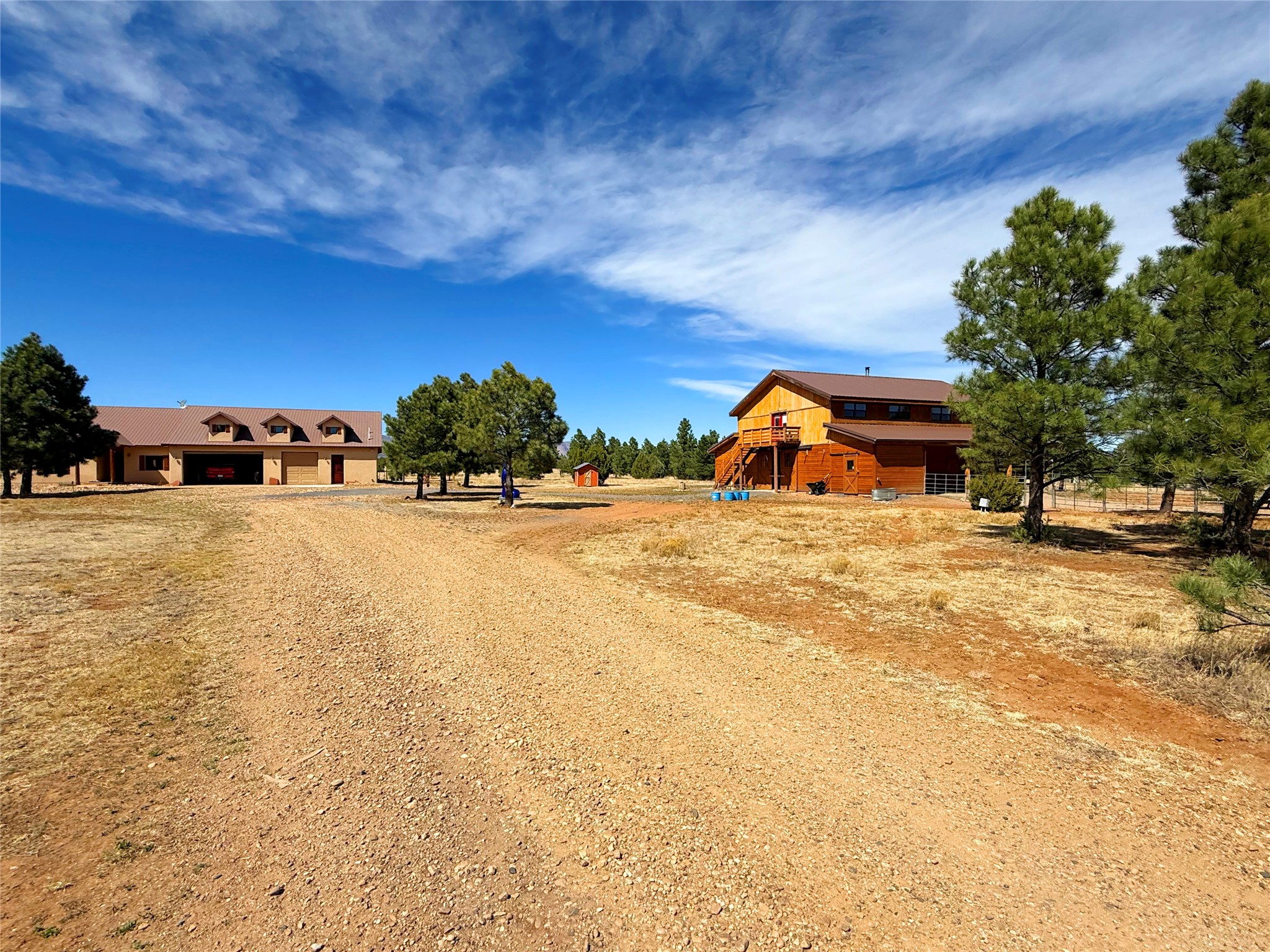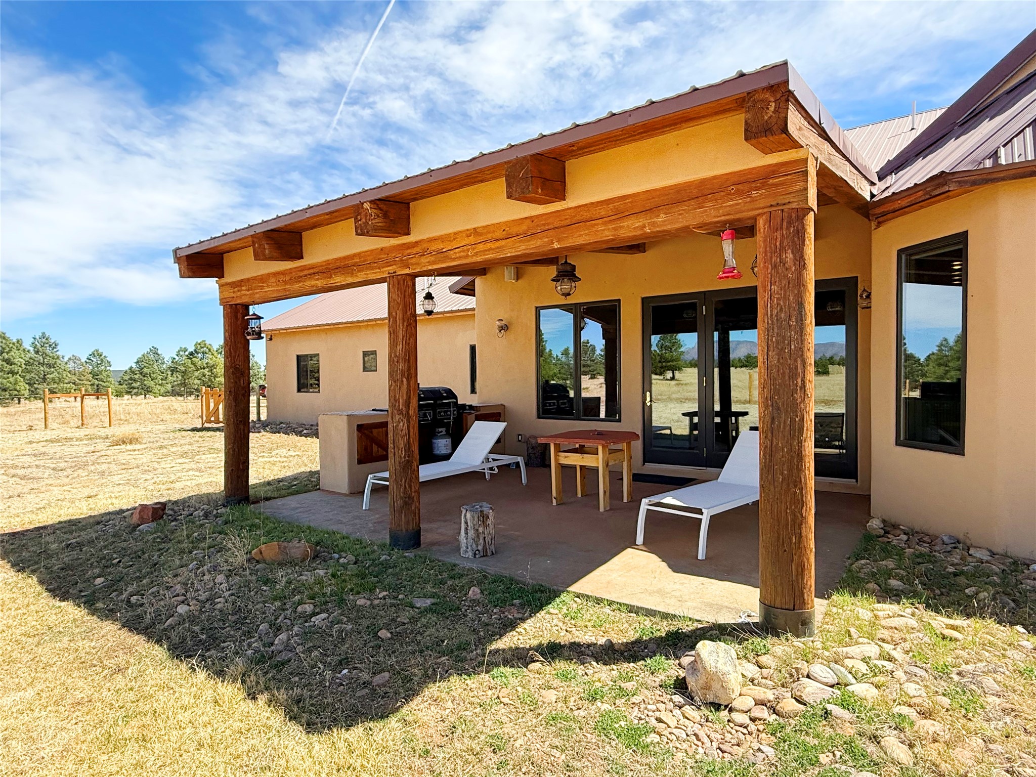 Tara Ranch is a substantially built Northern New Mexico ranch property offering privacy, scale, and exceptional equestrian improvements on 20 fully fenced, mostly flat acres. From the gated entrance, a beautiful quarter-mile private driveway leads to the 3,400+square-foot main home and the impressive barn. Built in 2006, the one-level home features 12-foot ceilings, diamond-finish walls, arches, and large beams throughout, creating a spacious feel with oversized rooms and generous living areas. The open main living, dining, and kitchen spaces take in magnificent views and connect easily to a covered portal for outdoor dining, grilling, and enjoying the landscape. The chef's kitchen is well equipped with two ovens, a large gas cooktop with griddle, two sinks, wild stone granite counters, stainless steel appliances, large pantry, and abundant cabinetry. The layout is practical and comfortable, with the primary suite, office or media room, and one guest bedroom on the west wing, while two additional bedrooms and a Jack-and-Jill bath are on the east wing. The heated 3+ car garage, radiant floor heat, fenced backyard, updated boiler in 2024, hot water heater in 2022, private well, and water softener add everyday function and value. Completed in 2025, the state-of-the-art 6-stall Barn Pros equestrian facility includes rubber flooring, tack room, workshop, hay storage, wash area, fenced 45x60 corral, RV covered parking, and a 1,600-square-foot apartment above. Surrounded on three sides by a 2,500-acre private ranch, with sweeping Hermit's Peak views and easy access to riding trails, Tara Ranch is well situated for access to Santa Fe and Las Vegas NM.
