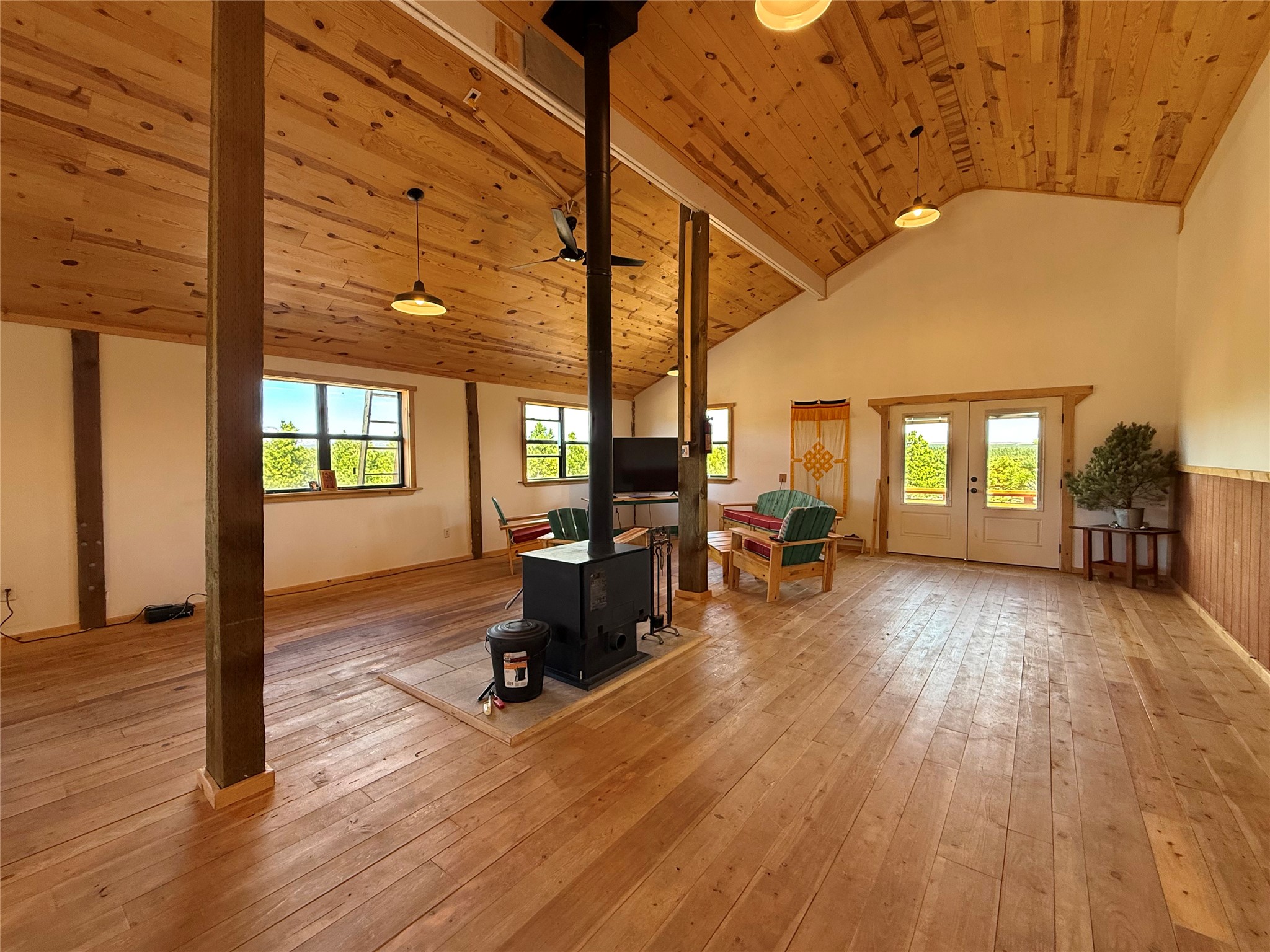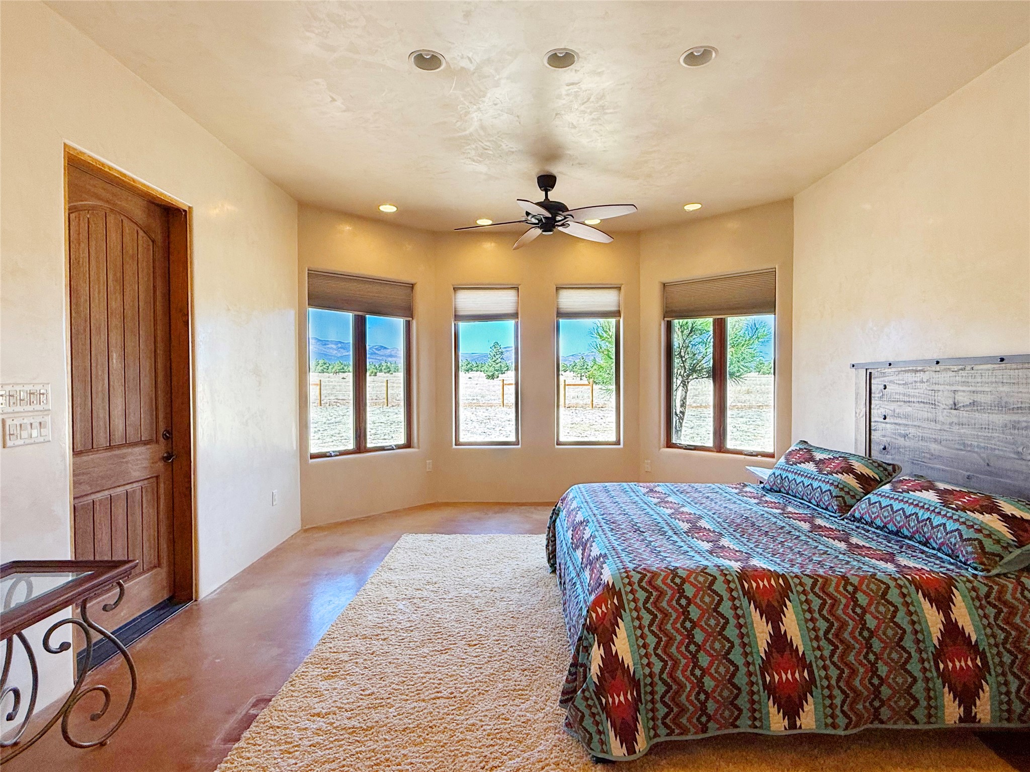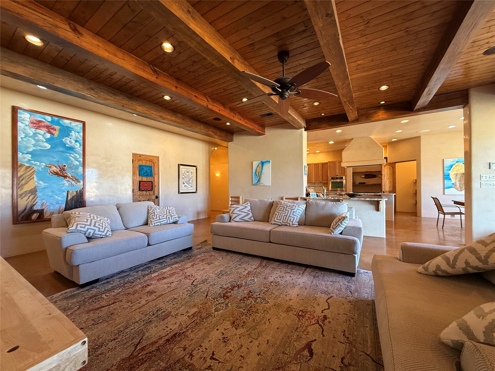 Tara Ranch is a substantially built Northern New Mexico ranch property offering privacy, scale, and exceptional equestrian improvements on 20 fully fenced, mostly flat acres. From the gated entrance, a beautiful quarter-mile private driveway leads to the 3,400+square-foot main home and the impressive barn. Built in 2006, the one-level home features 12-foot ceilings, diamond-finish walls, arches, and large beams throughout, creating a spacious feel with oversized rooms and generous living areas. The open main living, dining, and kitchen spaces take in magnificent views and connect easily to a covered portal for outdoor dining, grilling, and enjoying the landscape. The chef's kitchen is well equipped with two ovens, a large gas cooktop with griddle, two sinks, wild stone granite counters, stainless steel appliances, large pantry, and abundant cabinetry. The layout is practical and comfortable, with the primary suite, office or media room, and one guest bedroom on the west wing, while two additional bedrooms and a Jack-and-Jill bath are on the east wing. The heated 3+ car garage, radiant floor heat, fenced backyard, updated boiler in 2024, hot water heater in 2022, private well, and water softener add everyday function and value. Completed in 2025, the state-of-the-art 6-stall Barn Pros equestrian facility includes rubber flooring, tack room, workshop, hay storage, wash area, fenced 45x60 corral, RV covered parking, and a 1,600-square-foot apartment above. Surrounded on three sides by a 2,500-acre private ranch, with sweeping Hermit's Peak views and easy access to riding trails, Tara Ranch is well situated for access to Santa Fe and Las Vegas NM.