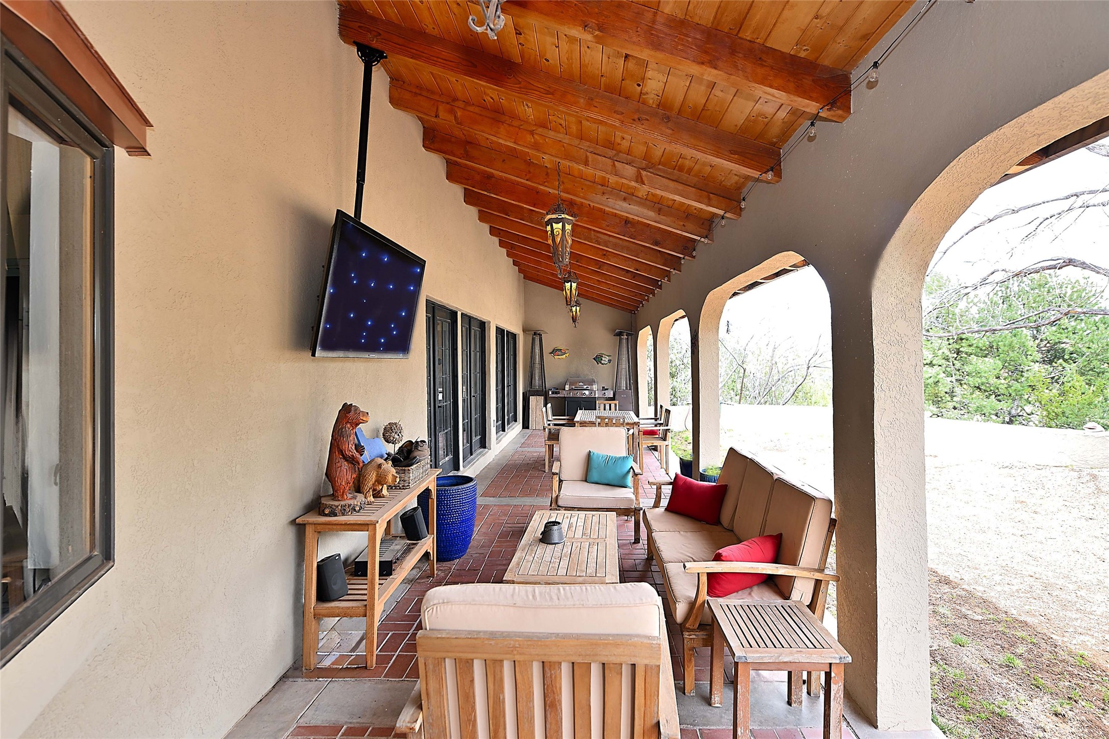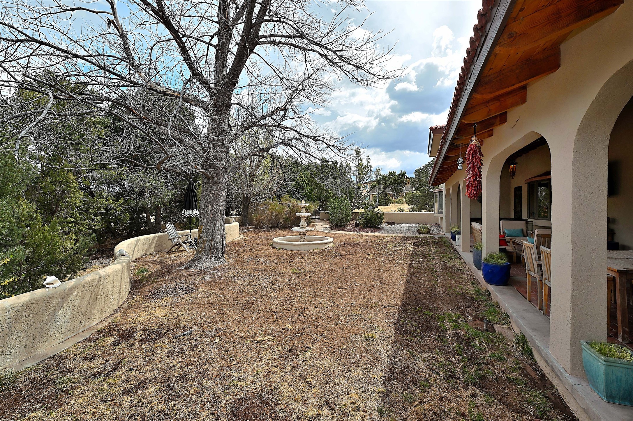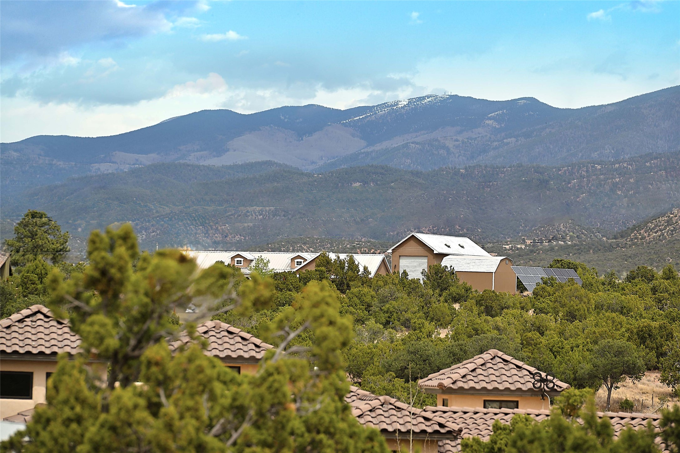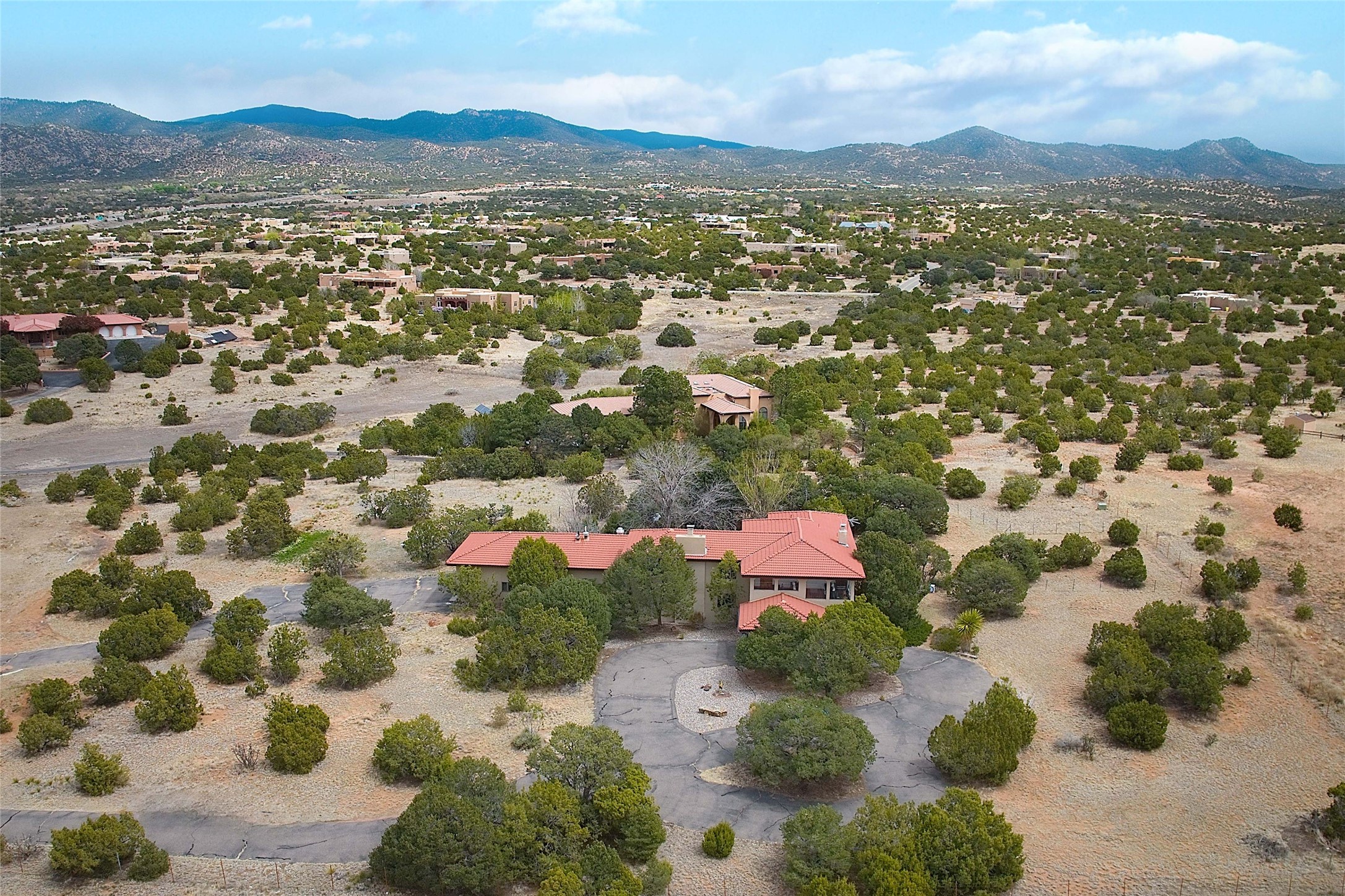 Tucked at the end of a quiet lane, this expansive 2.5-acre property offers privacy and sweeping views with the convenience of being within ten minutes to shopping, schools and the Plaza. With over 4,300 square feet, 5 bedrooms, and 4 bathrooms, there's room to spread out while still feeling connected.The heart of the home is a generous recently remodeled kitchen designed for gathering, complete with a walk-in pantry and space that flows easily for everyday living or entertaining. A large laundry room off the kitchen connects to the expansive garage. The lower level features a large primary suite with a kiva fireplace, a spacious, recently renovated, master bathroom with a shower and a bathtub, and dual walk-in closets. An additional bedroom or office is also on the lower level. Upstairs features 3 bedrooms, 2 bathrooms, a western-facing sunroom with gorgeous Jemez and sunset views, and a spacious attic for storage. The living room features beautifully carved corbels and beamed 20-foot ceilings. Wide plank wood flooring pairs beautifully with the wood-burning fireplace, creating a cozy, inviting atmosphere year-round. Thoughtful features like baseboard hot water heat and central evaporative cooling provide comfort in every season.Outside, enjoy the expansive back portal off the kitchen, recently reseeded lawn and wide-open space with endless possibilities and views of the Sangre de Cristo Mountains--all with no HOA and no Santa Fe mansion tax.This home comes partially furnished, and includes a 90-inch, wall-mounted Sony TV in the living room, an outdoor TV on the back portal, Teak furniture on the back portal, and various antique pieces throughout.Whether you're looking for quiet mornings, sunset views, or room to grow, this property delivers a lifestyle that feels both grounded and expansive.