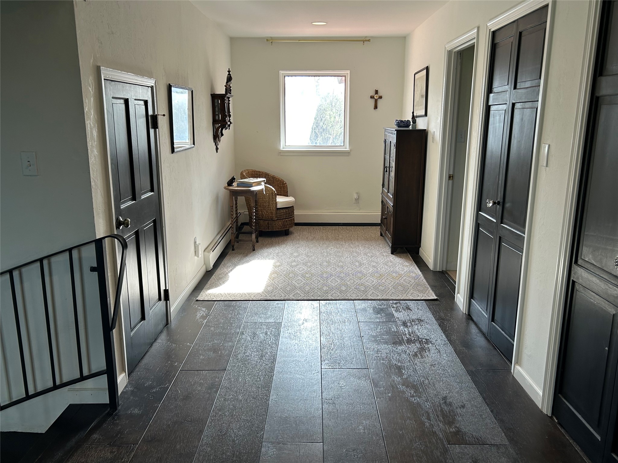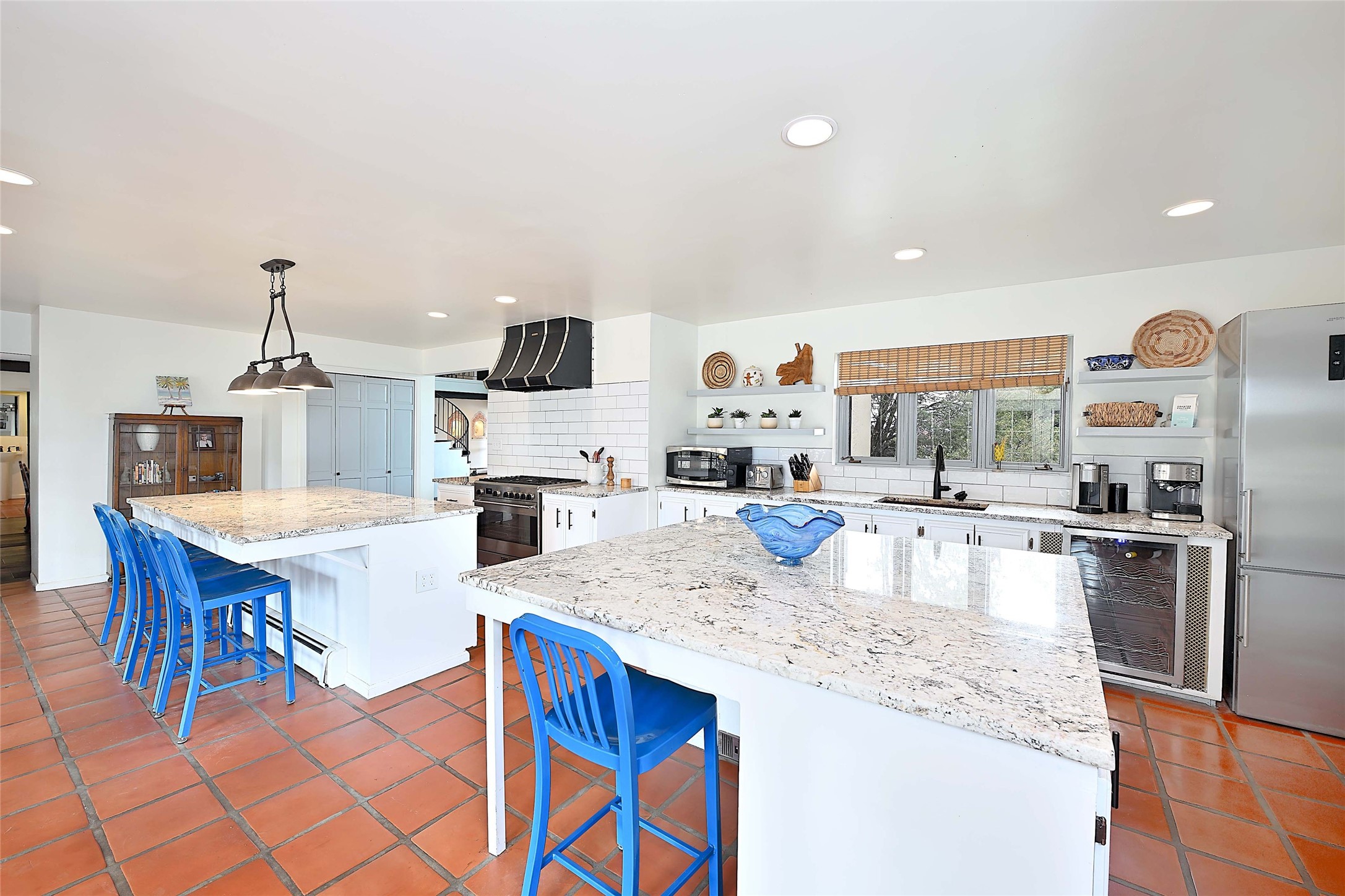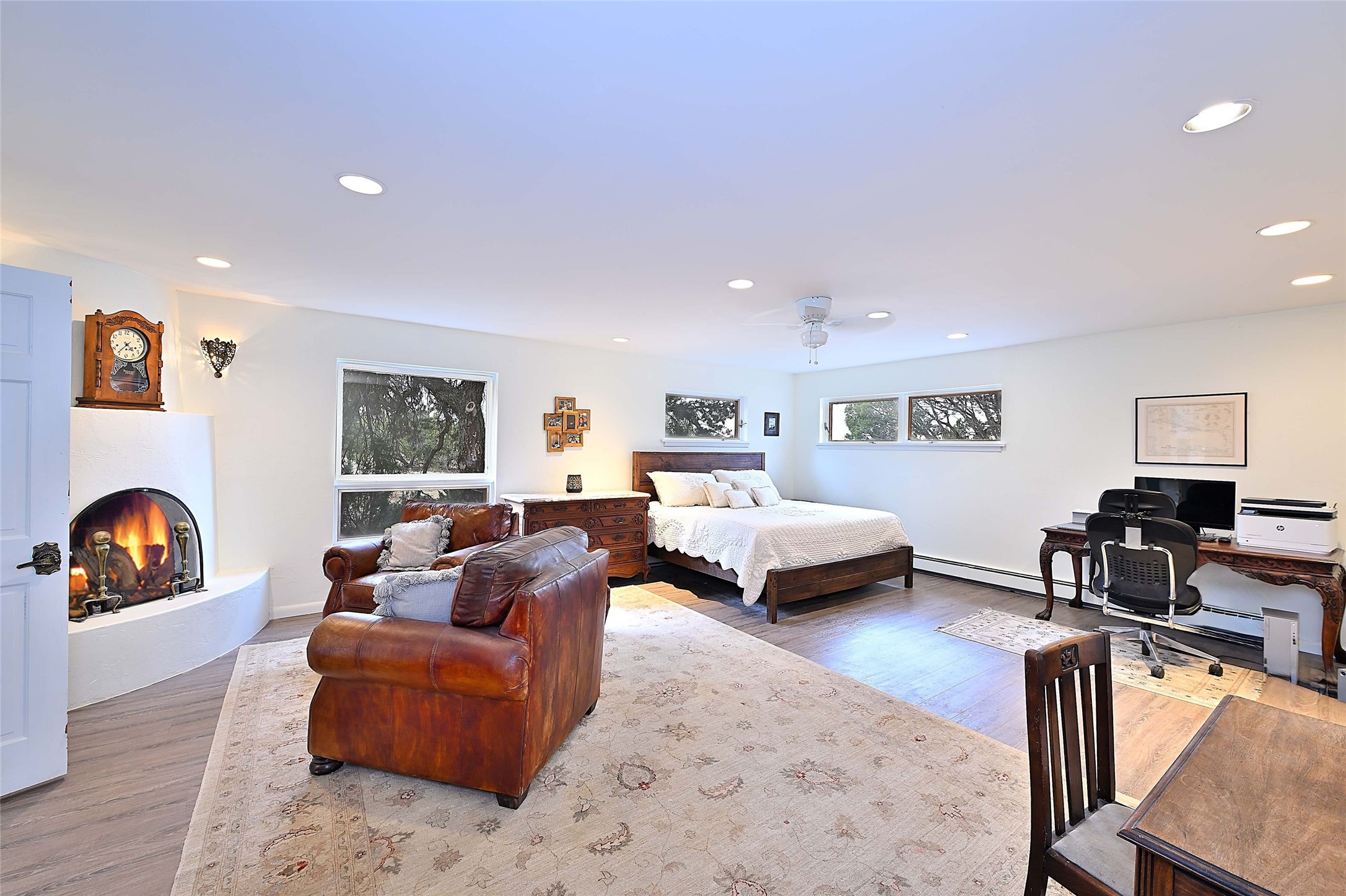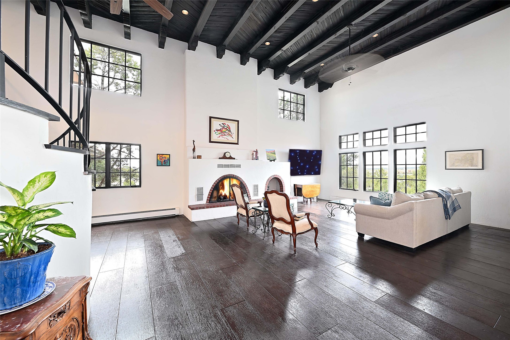 Tucked at the end of a quiet lane, this expansive 2.5-acre property offers privacy and sweeping views with the convenience of being within ten minutes to shopping, schools and the Plaza. With over 4,300 square feet, 5 bedrooms, and 4 bathrooms, there's room to spread out while still feeling connected.The heart of the home is a generous recently remodeled kitchen designed for gathering, complete with a walk-in pantry and space that flows easily for everyday living or entertaining. A large laundry room off the kitchen connects to the expansive garage. The lower level features a large primary suite with a kiva fireplace, a spacious, recently renovated, master bathroom with a shower and a bathtub, and dual walk-in closets. An additional bedroom or office is also on the lower level. Upstairs features 3 bedrooms, 2 bathrooms, a western-facing sunroom with gorgeous Jemez and sunset views, and a spacious attic for storage. The living room features beautifully carved corbels and beamed 20-foot ceilings. Wide plank wood flooring pairs beautifully with the wood-burning fireplace, creating a cozy, inviting atmosphere year-round. Thoughtful features like baseboard hot water heat and central evaporative cooling provide comfort in every season.Outside, enjoy the expansive back portal off the kitchen, recently reseeded lawn and wide-open space with endless possibilities and views of the Sangre de Cristo Mountains--all with no HOA and no Santa Fe mansion tax.This home comes partially furnished, and includes a 90-inch, wall-mounted Sony TV in the living room, an outdoor TV on the back portal, Teak furniture on the back portal, and various antique pieces throughout.Whether you're looking for quiet mornings, sunset views, or room to grow, this property delivers a lifestyle that feels both grounded and expansive.
