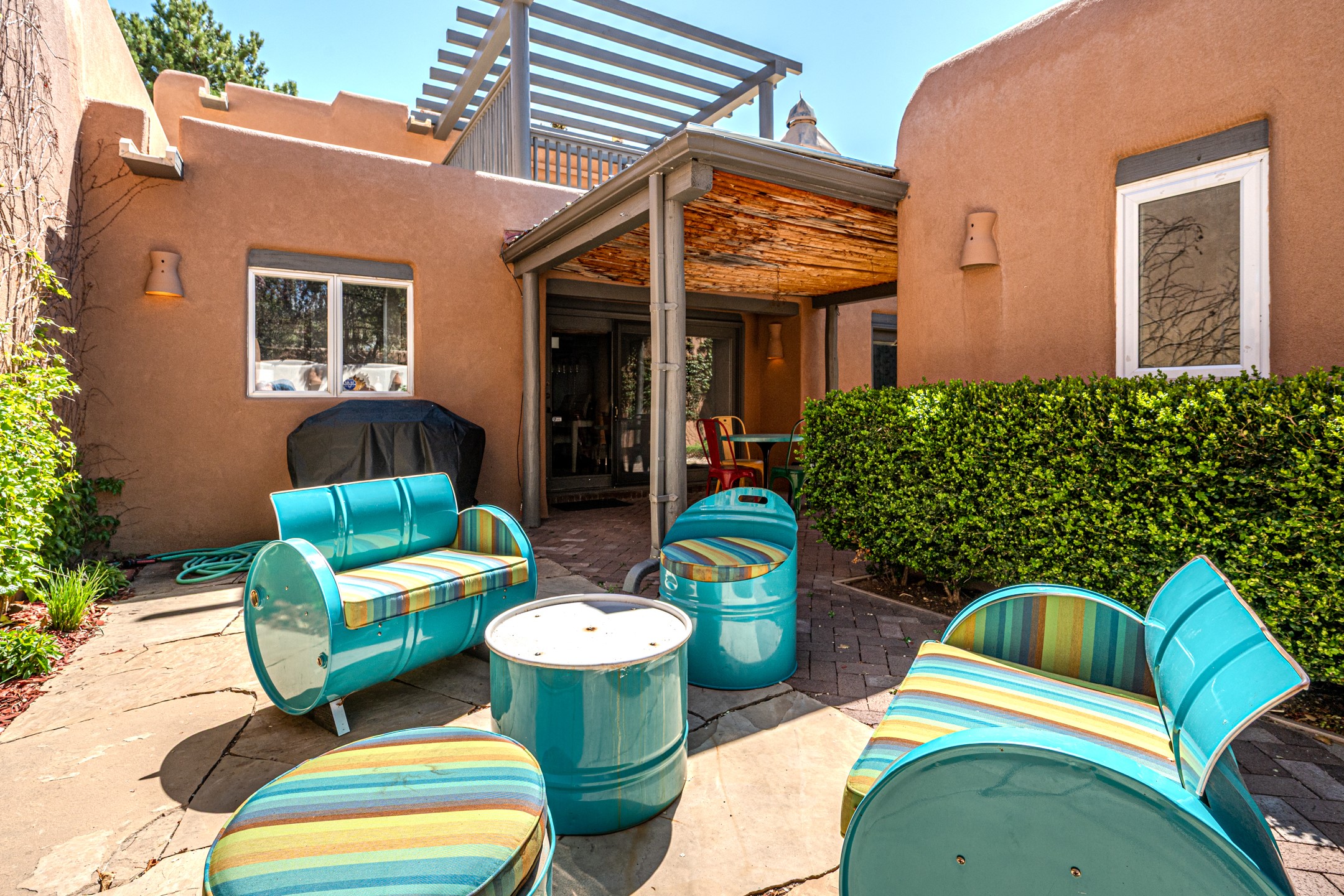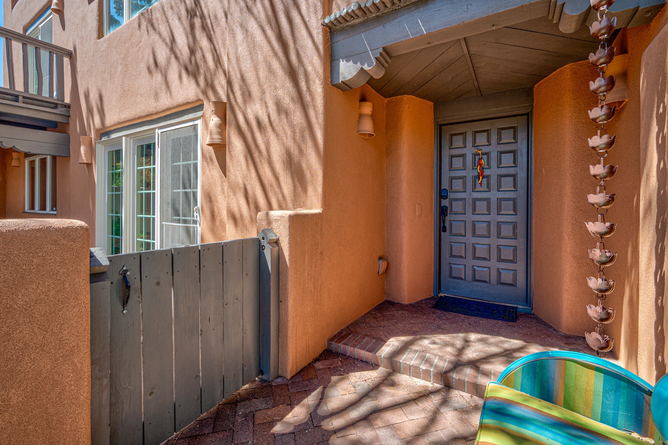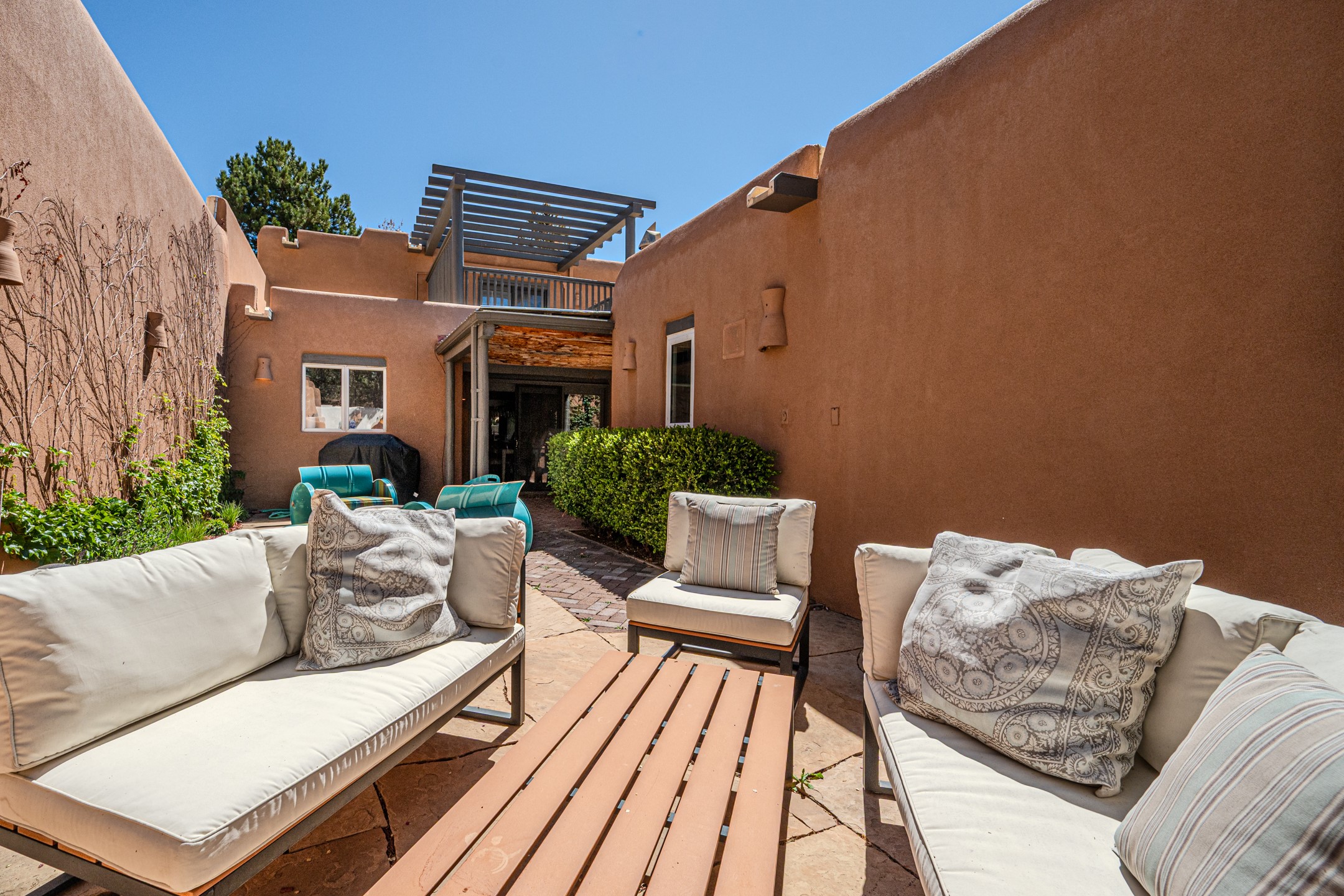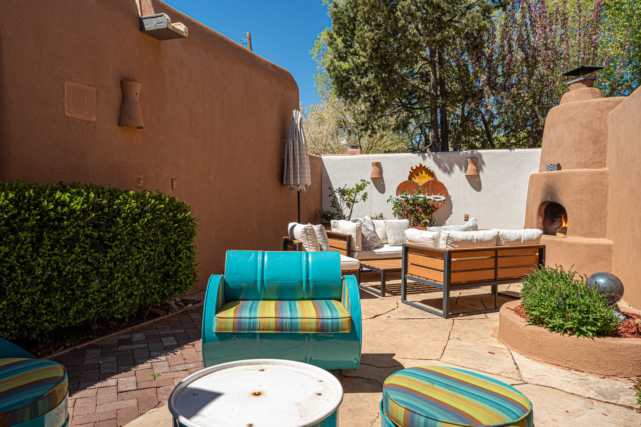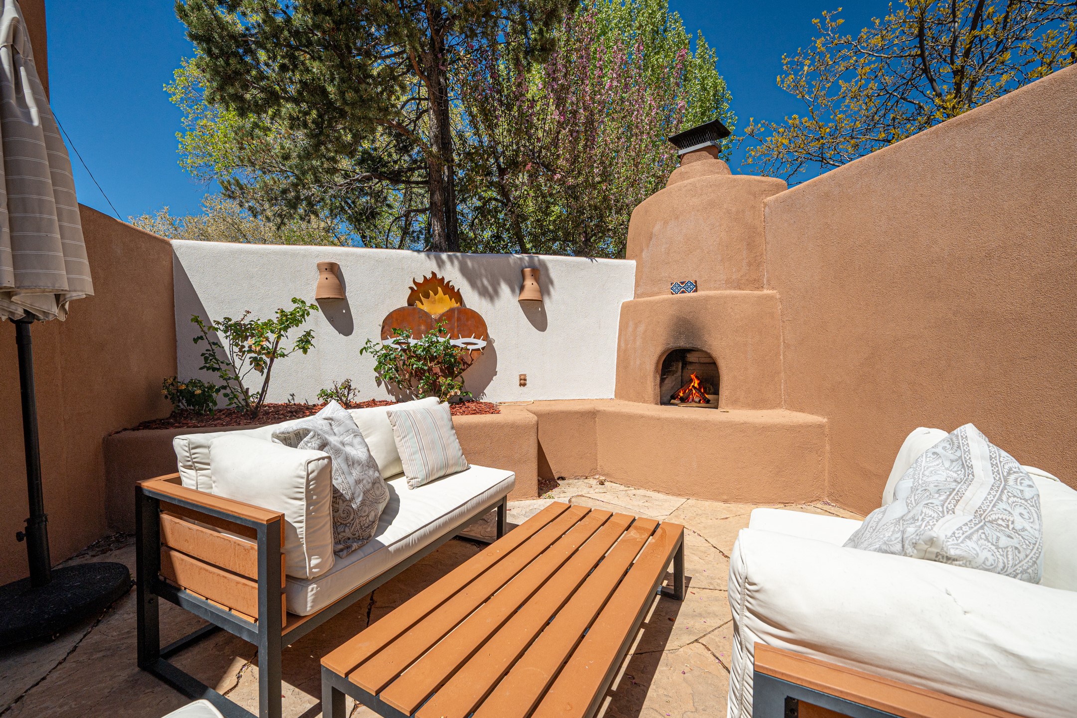 Tucked within a gated enclave in Santa Fe's highly sought-after Historic Eastside, this exceptional 4-bedroom, 4-bath residence offers the perfect blend of charm, comfort, and convenience. Ideally positioned between Alameda and Canyon Road, step outside one complex gate and find yourself on Canyon Road, step out the other gate and there you are on E. Alameda where you can stroll downtown along the Santa Fe River. Designed for both relaxed living and effortless entertaining, the home features four traditional kiva fireplaces that add warmth and authentic Southwestern character throughout plus central heating and air conditioning ensure year-round comfort. The thoughtfully designed layout includes generous storage and four inviting outdoor living spaces--perfect for enjoying Santa Fe's stunning climate. One outdoor area is highlighted by its own kiva fireplace and tranquil water feature, creating a peaceful retreat for morning coffee or evening gatherings. A rare and coveted amenity for this historic area, the property includes a spacious two-car garage--an exceptional find in the Eastside. The gated setting provides security and privacy, making this an ideal "lock and leave" residence for part-time owners or those seeking a low-maintenance lifestyle with recent upgrades including a new roof and stucco. Currently utilized as a successful short-term rental and second home, the property offers flexibility and income potential. Whether you're seeking a full-time residence, vacation escape, or investment opportunity, this unique Santa Fe home delivers timeless appeal in an unbeatable location. Rental History available upon request.