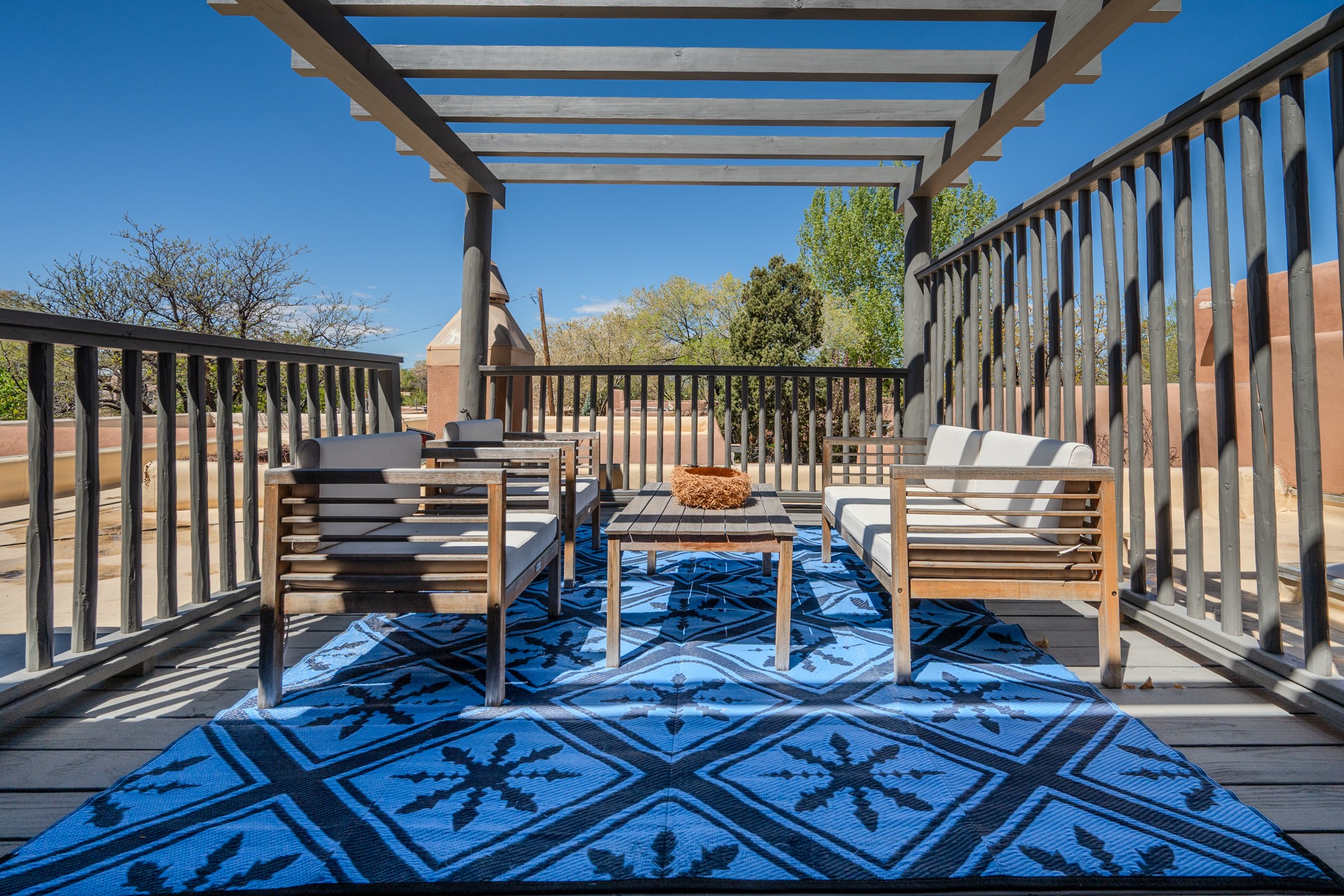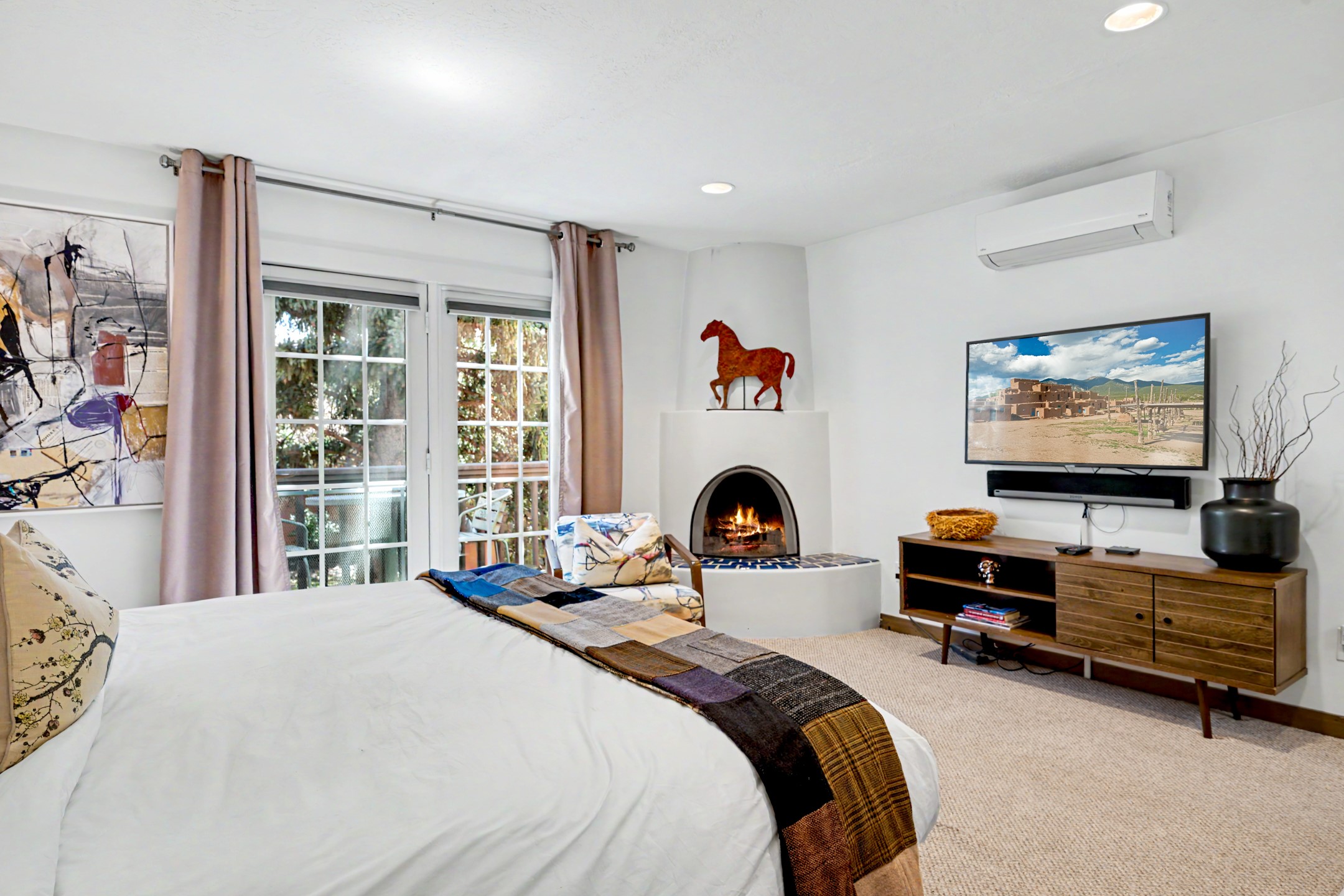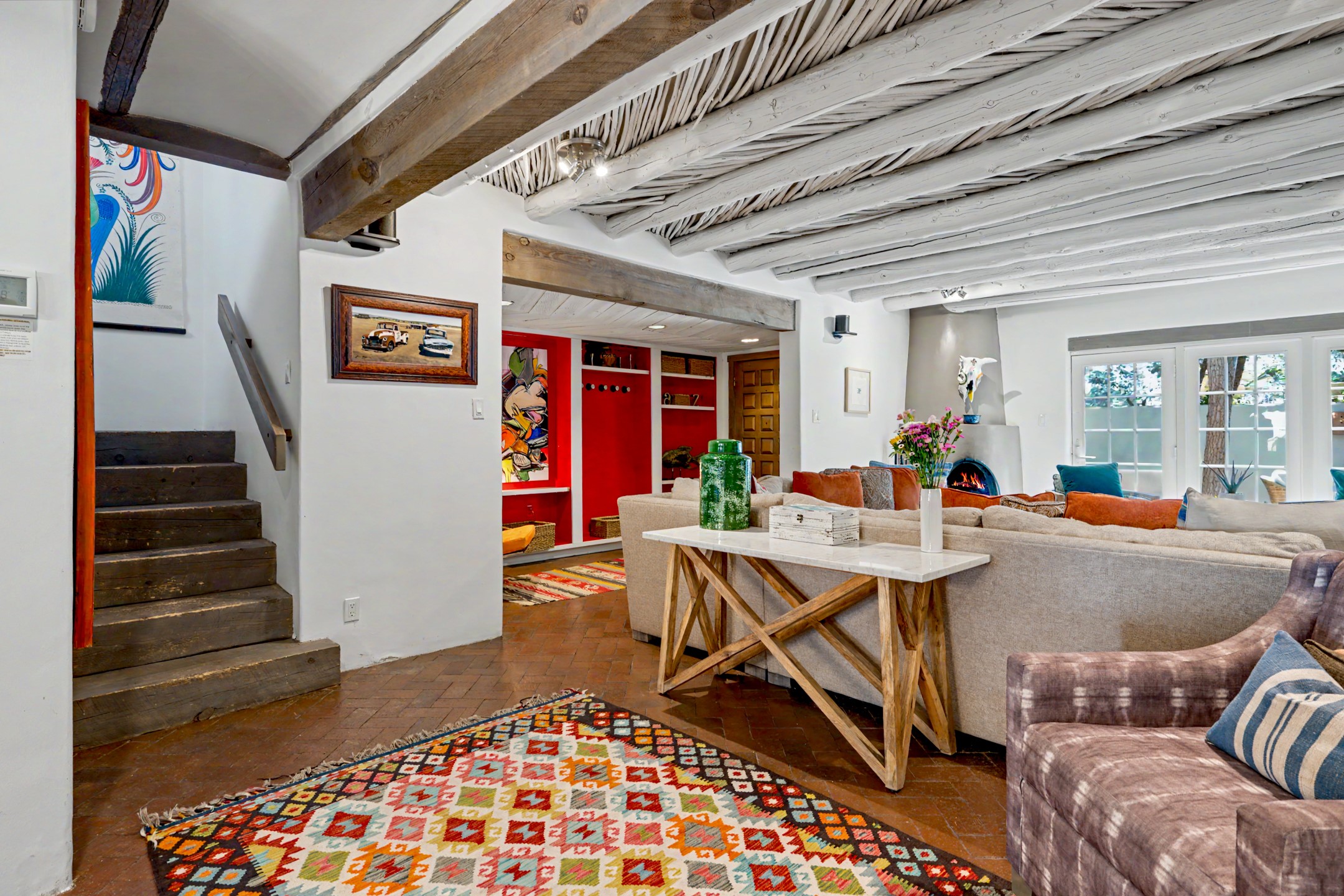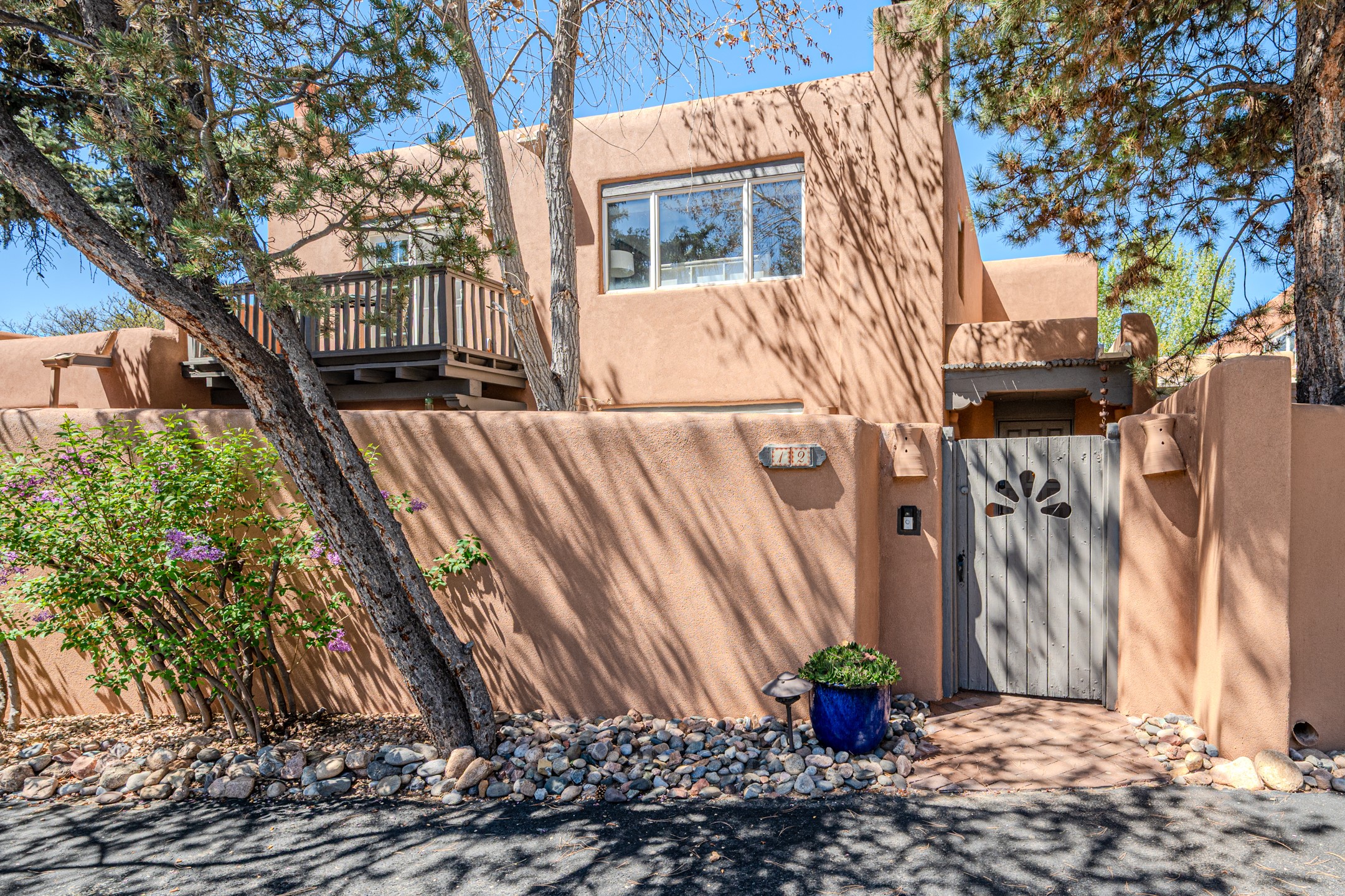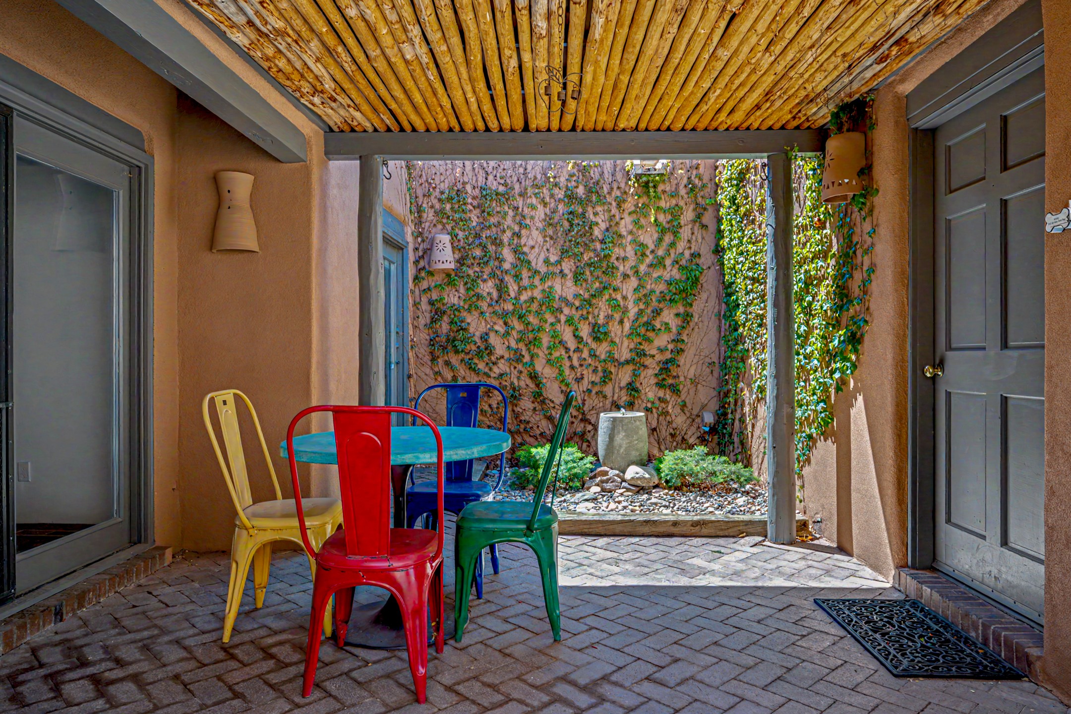 Tucked within a gated enclave in Santa Fe's highly sought-after Historic Eastside, this exceptional 4-bedroom, 4-bath residence offers the perfect blend of charm, comfort, and convenience. Ideally positioned between Alameda and Canyon Road, step outside one complex gate and find yourself on Canyon Road, step out the other gate and there you are on E. Alameda where you can stroll downtown along the Santa Fe River. Designed for both relaxed living and effortless entertaining, the home features four traditional kiva fireplaces that add warmth and authentic Southwestern character throughout plus central heating and air conditioning ensure year-round comfort. The thoughtfully designed layout includes generous storage and four inviting outdoor living spaces--perfect for enjoying Santa Fe's stunning climate. One outdoor area is highlighted by its own kiva fireplace and tranquil water feature, creating a peaceful retreat for morning coffee or evening gatherings. A rare and coveted amenity for this historic area, the property includes a spacious two-car garage--an exceptional find in the Eastside. The gated setting provides security and privacy, making this an ideal "lock and leave" residence for part-time owners or those seeking a low-maintenance lifestyle with recent upgrades including a new roof and stucco. Currently utilized as a successful short-term rental and second home, the property offers flexibility and income potential. Whether you're seeking a full-time residence, vacation escape, or investment opportunity, this unique Santa Fe home delivers timeless appeal in an unbeatable location. Rental History available upon request.