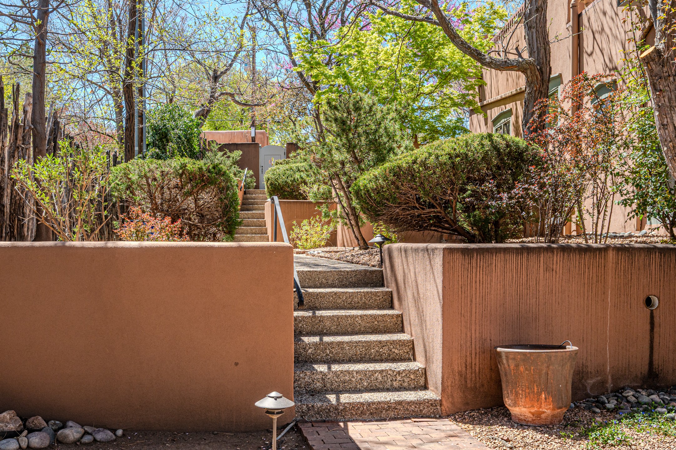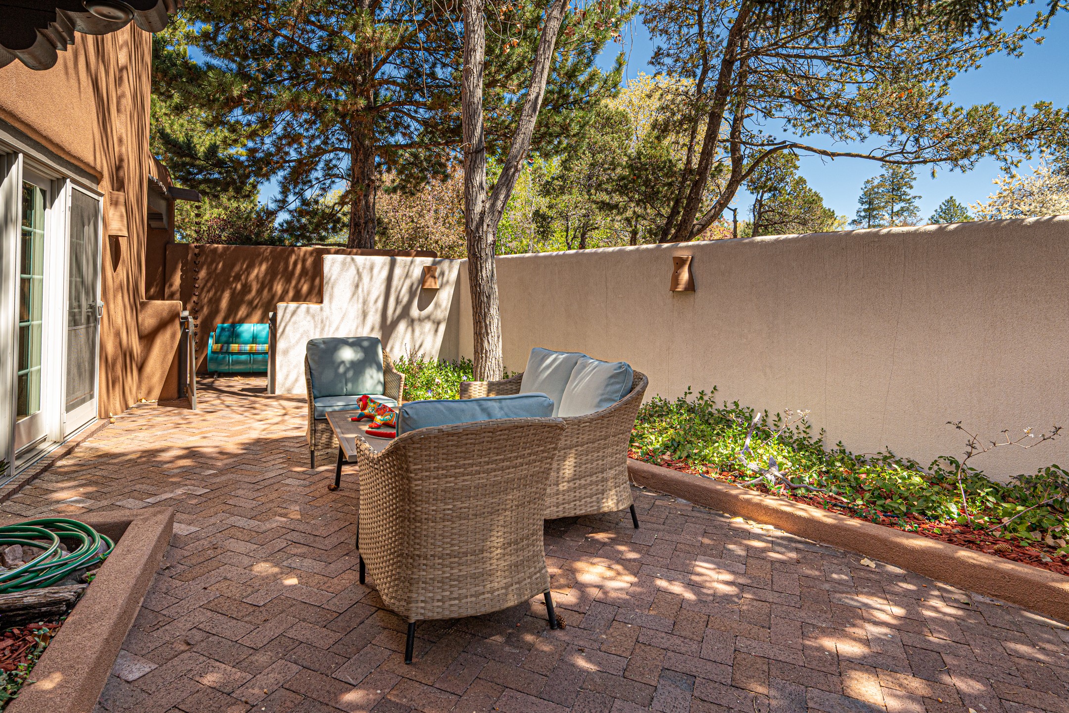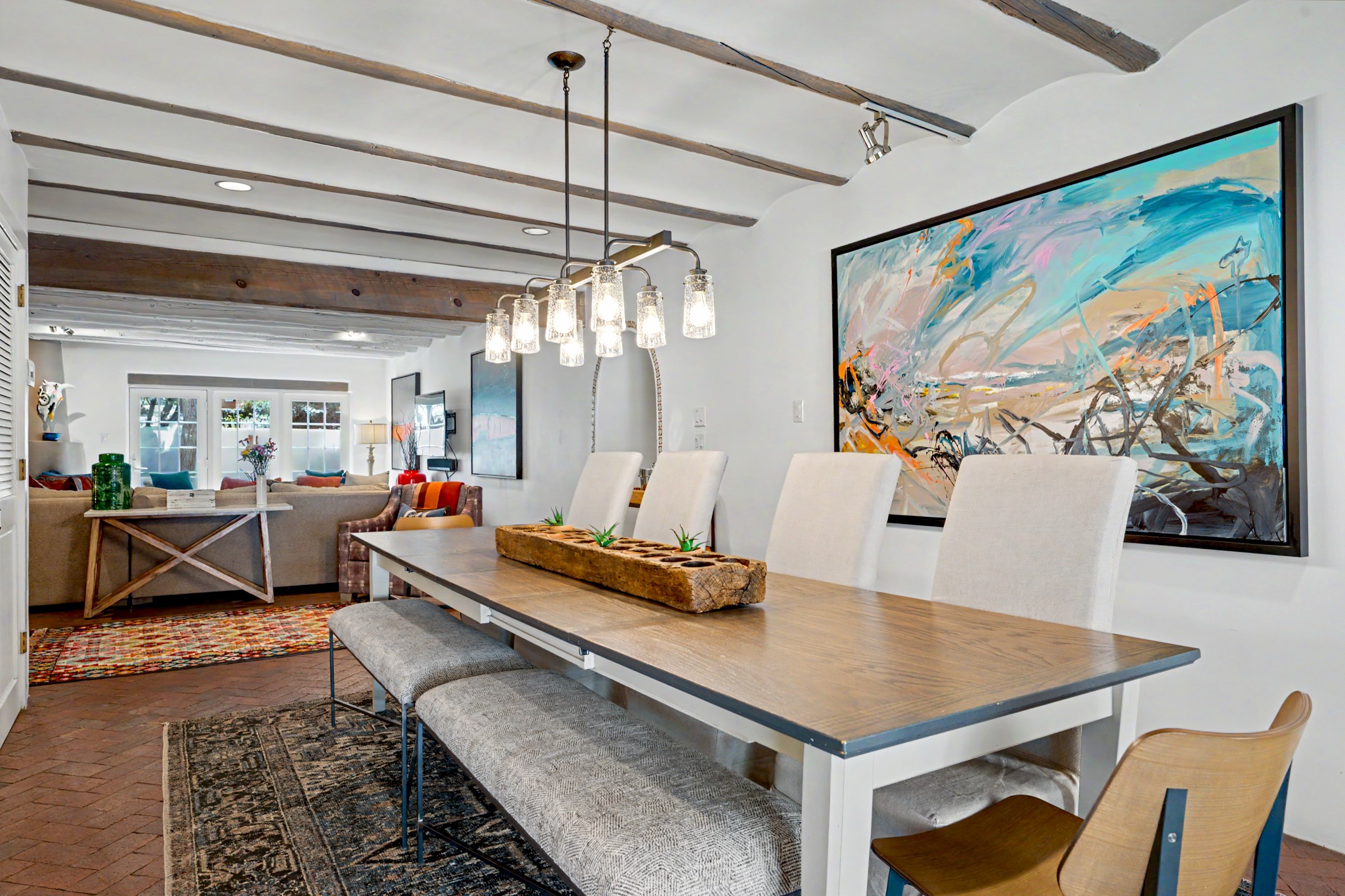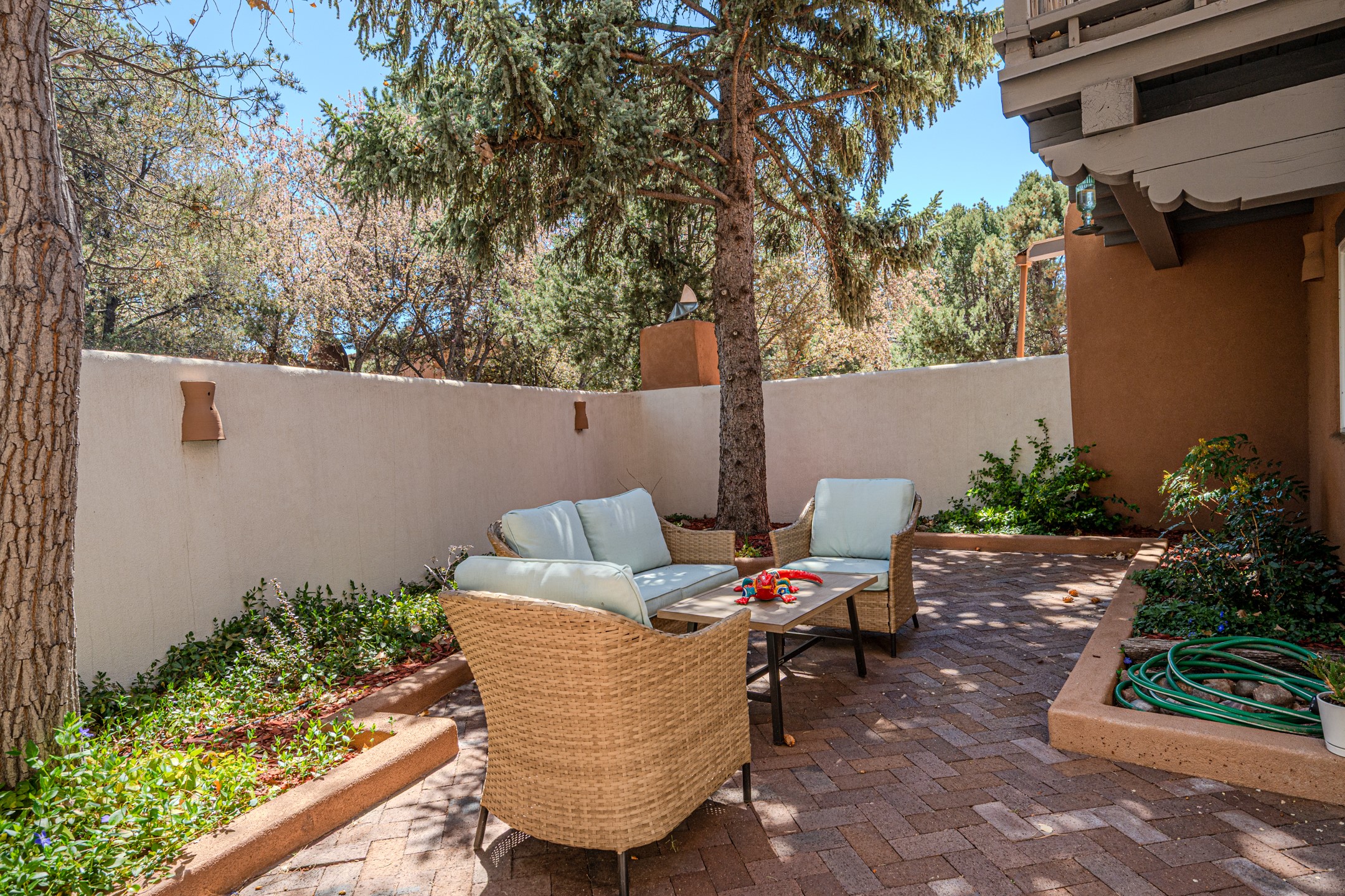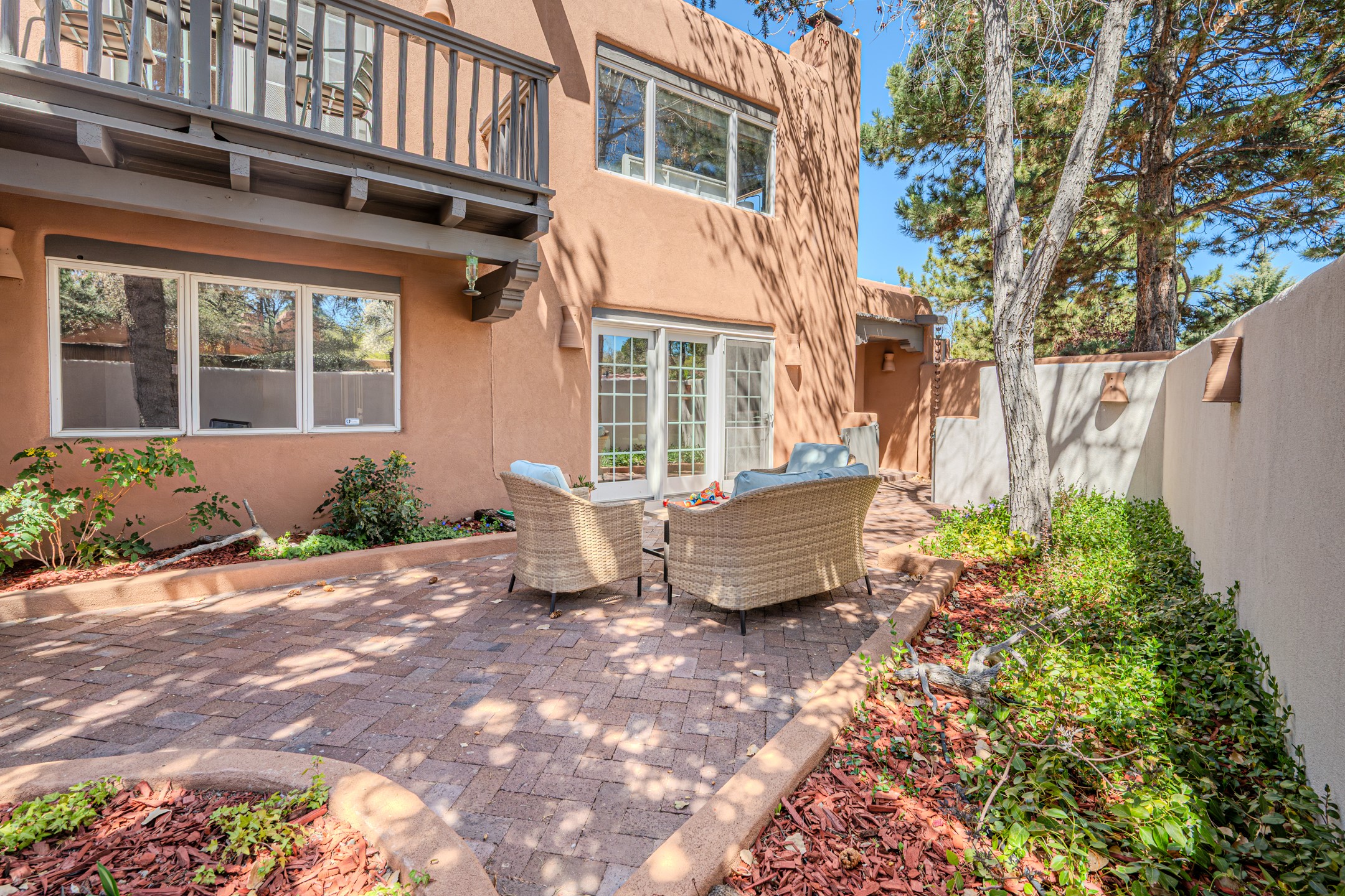 Tucked within a gated enclave in Santa Fe's highly sought-after Historic Eastside, this exceptional 4-bedroom, 4-bath residence offers the perfect blend of charm, comfort, and convenience. Ideally positioned between Alameda and Canyon Road, step outside one complex gate and find yourself on Canyon Road, step out the other gate and there you are on E. Alameda where you can stroll downtown along the Santa Fe River. Designed for both relaxed living and effortless entertaining, the home features four traditional kiva fireplaces that add warmth and authentic Southwestern character throughout plus central heating and air conditioning ensure year-round comfort. The thoughtfully designed layout includes generous storage and four inviting outdoor living spaces--perfect for enjoying Santa Fe's stunning climate. One outdoor area is highlighted by its own kiva fireplace and tranquil water feature, creating a peaceful retreat for morning coffee or evening gatherings. A rare and coveted amenity for this historic area, the property includes a spacious two-car garage--an exceptional find in the Eastside. The gated setting provides security and privacy, making this an ideal "lock and leave" residence for part-time owners or those seeking a low-maintenance lifestyle with recent upgrades including a new roof and stucco. Currently utilized as a successful short-term rental and second home, the property offers flexibility and income potential. Whether you're seeking a full-time residence, vacation escape, or investment opportunity, this unique Santa Fe home delivers timeless appeal in an unbeatable location. Rental History available upon request.