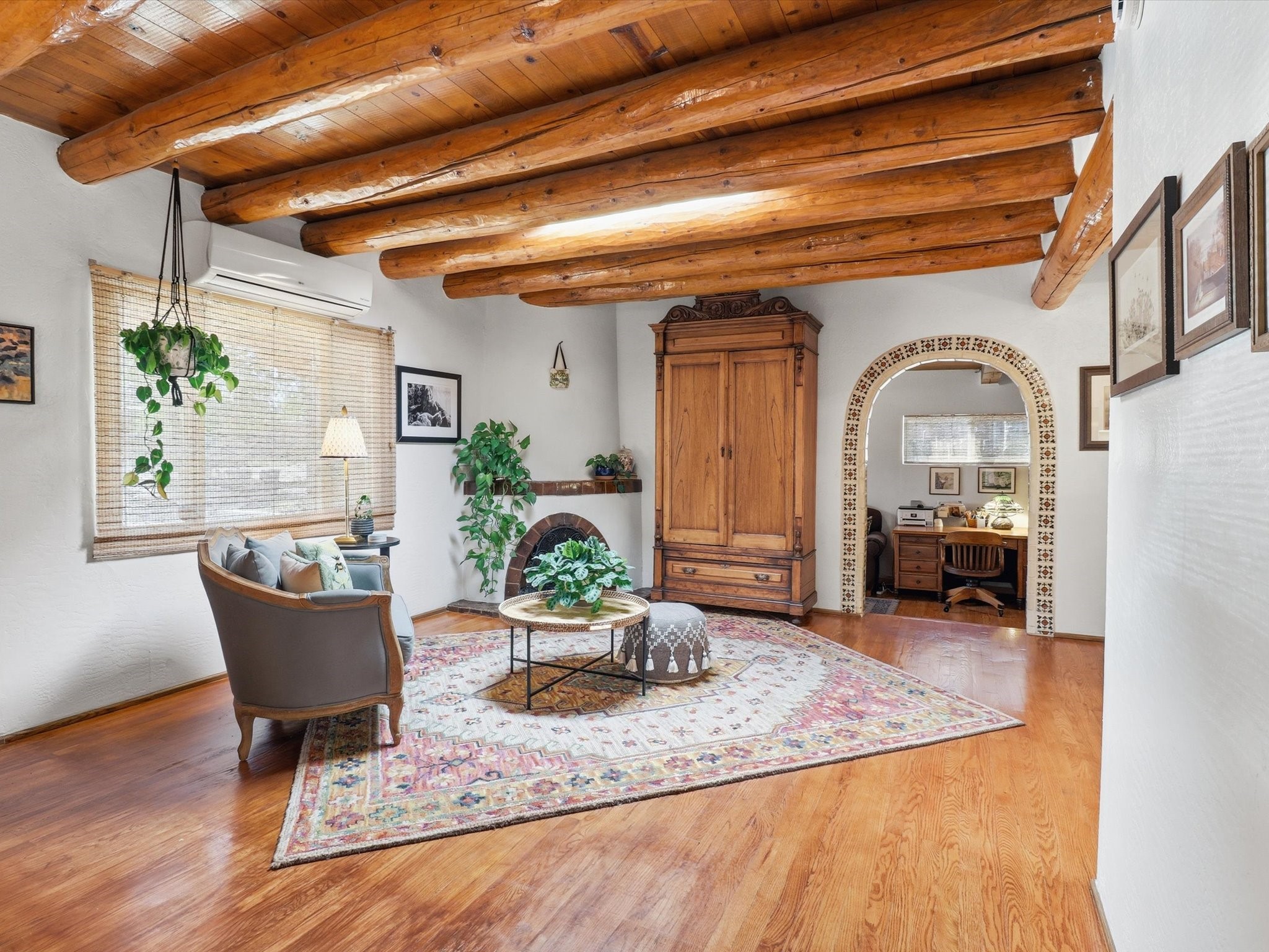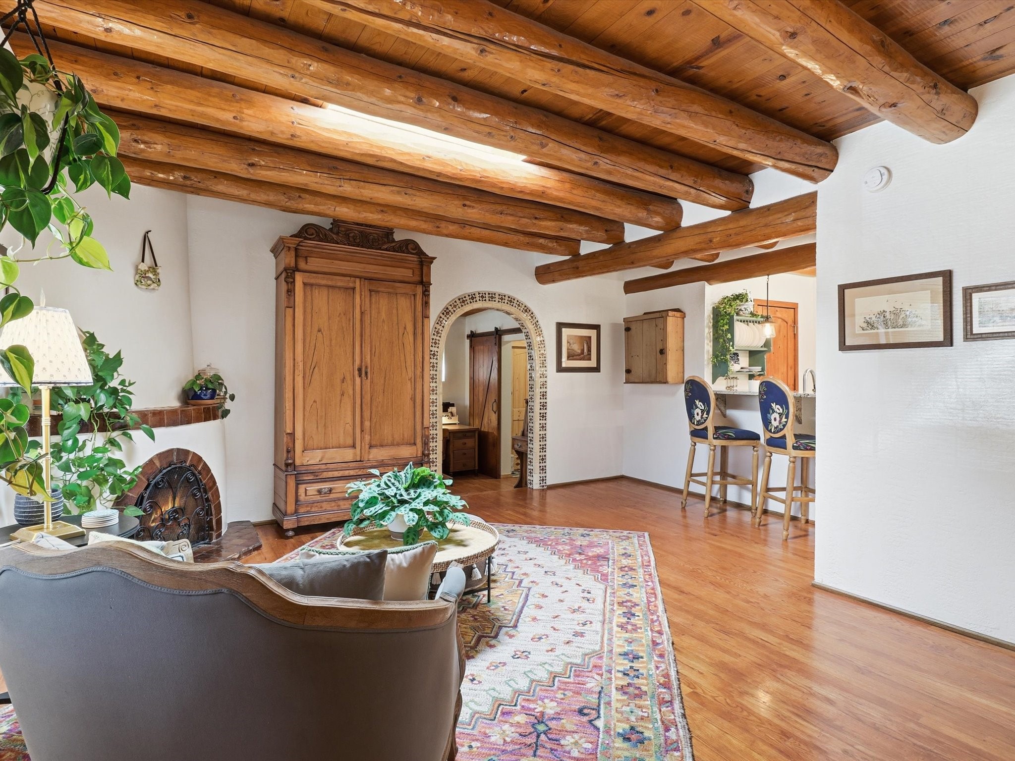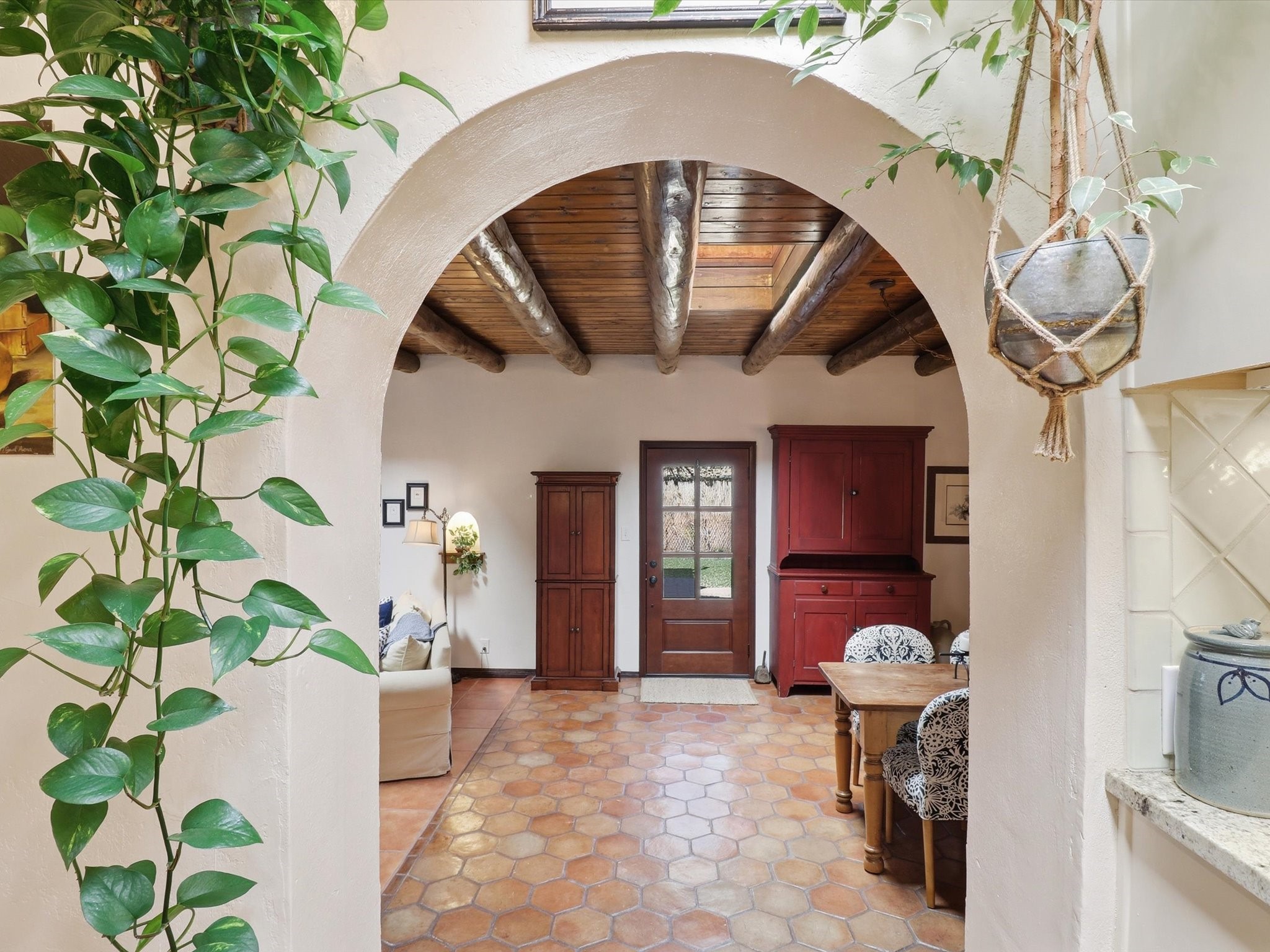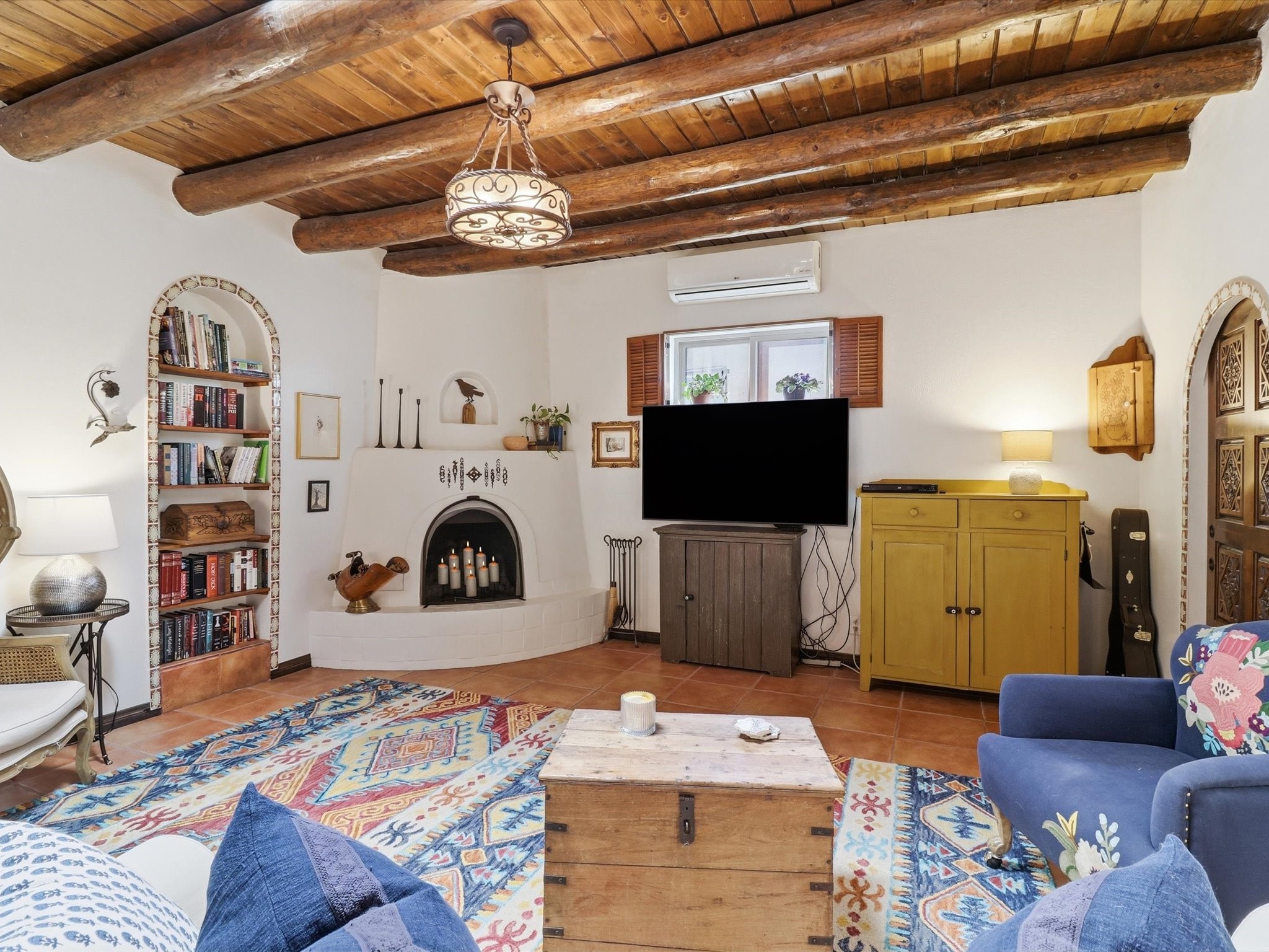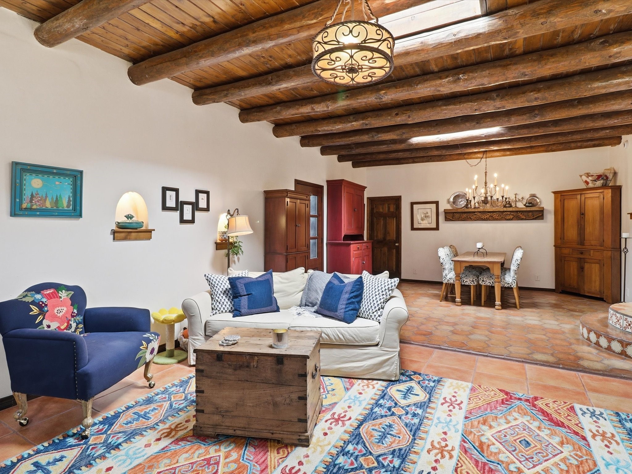 This classic Stamm home is a masterclass in authentic Santa Fe charm, blending historic architectural details with the functional space today's luxury buyers crave. Featuring 4 bedrooms, 3 bathrooms, and a versatile flex room, the residence is defined by traditional vigas that stretch across the ceilings, creating a warm, grounded atmosphere throughout. The interior showcases a rich palette of textures, from original hardwood floors to Saltillo tile and timeless finishes. Distinctive arched doorways accented with Spanish tile lead you through the home, while three wood-burning kiva fireplaces serve as soulful focal points for gathering. Outside, the property transforms into a private desert oasis. The beautifully landscaped grounds are anchored by a covered pergola, perfect for alfresco dining or quiet evenings. Located just minutes from the Santa Fe Rail Trail, this home offers the perfect balance of serene living and active lifestyle access.