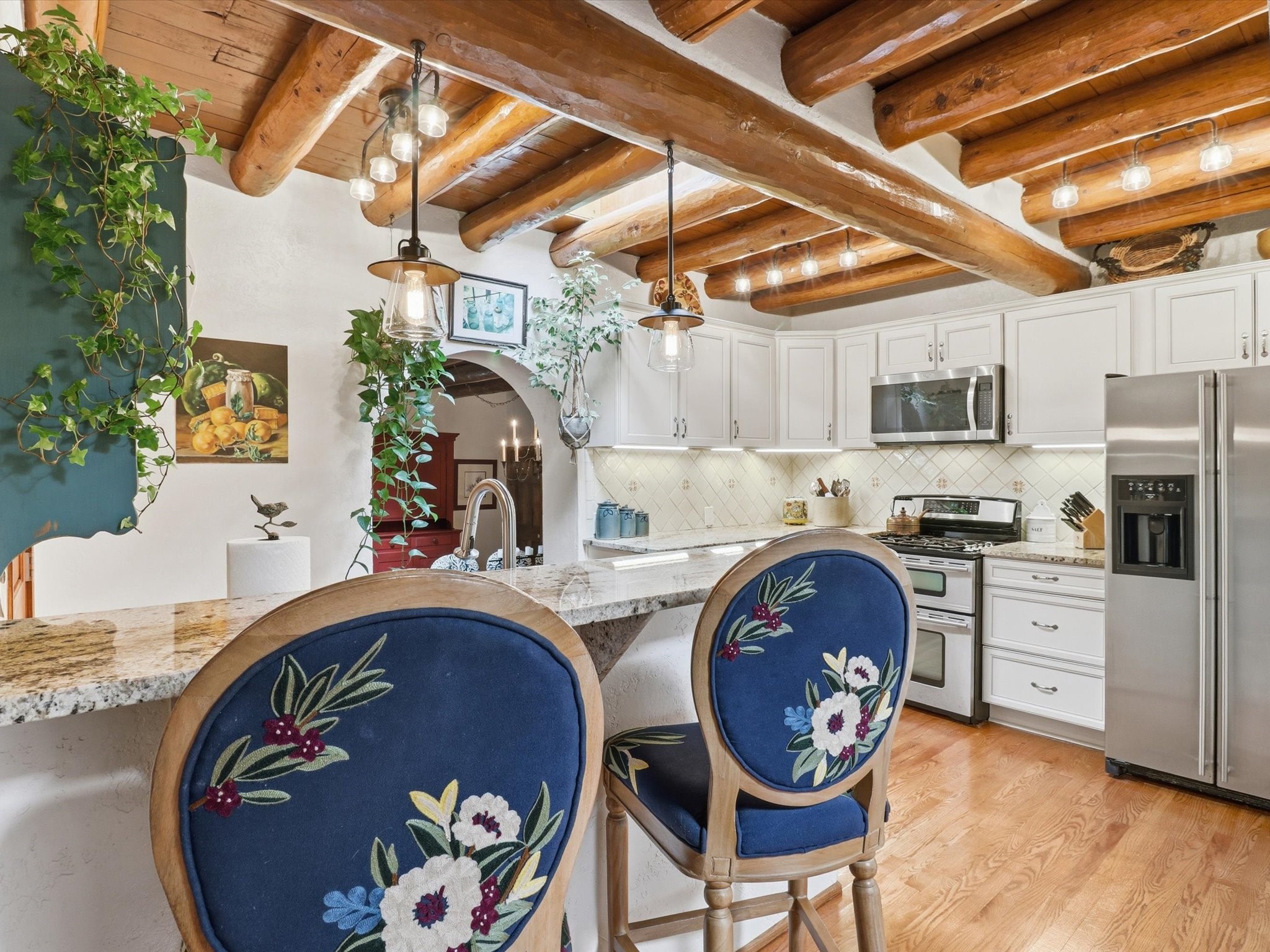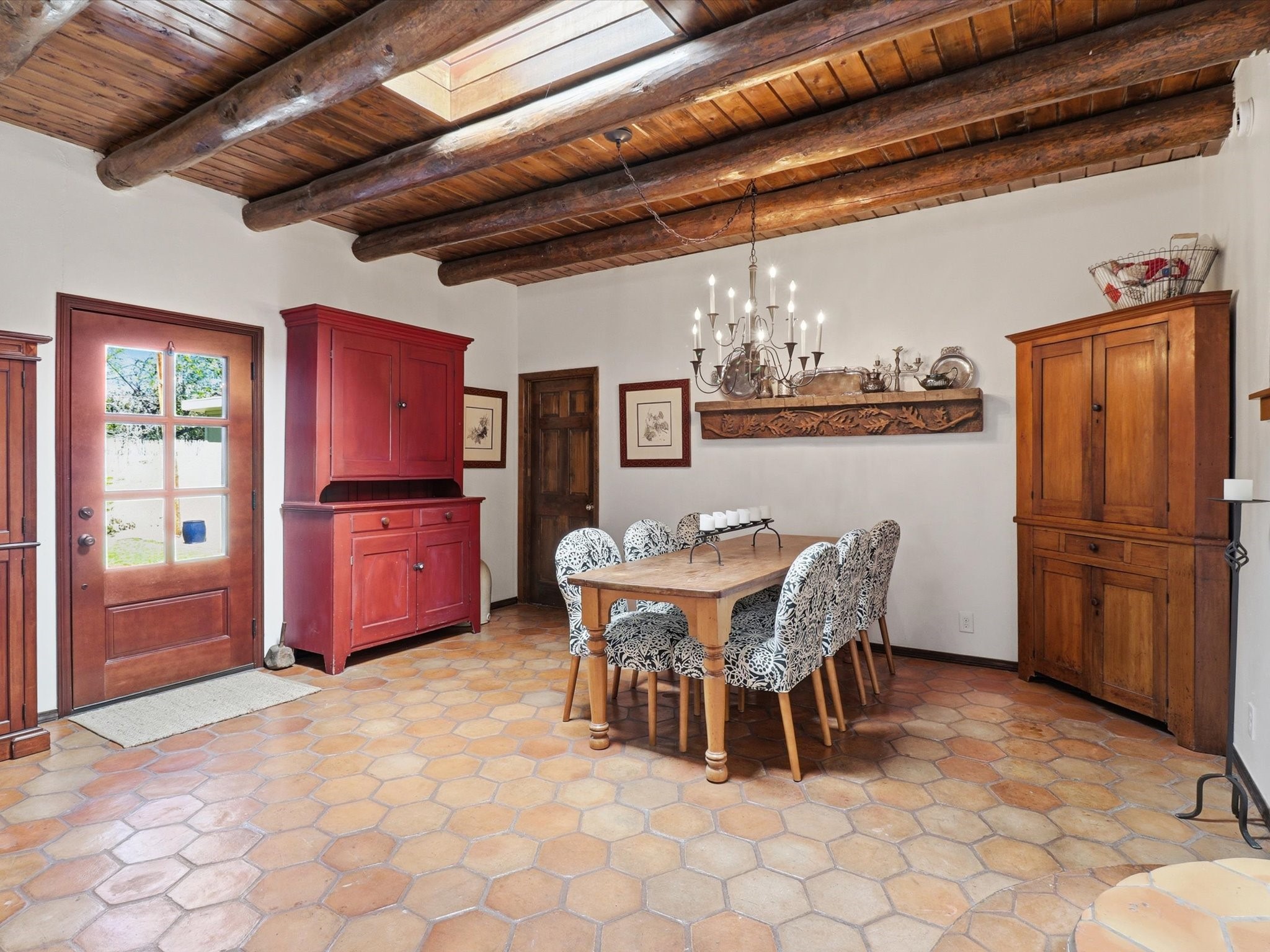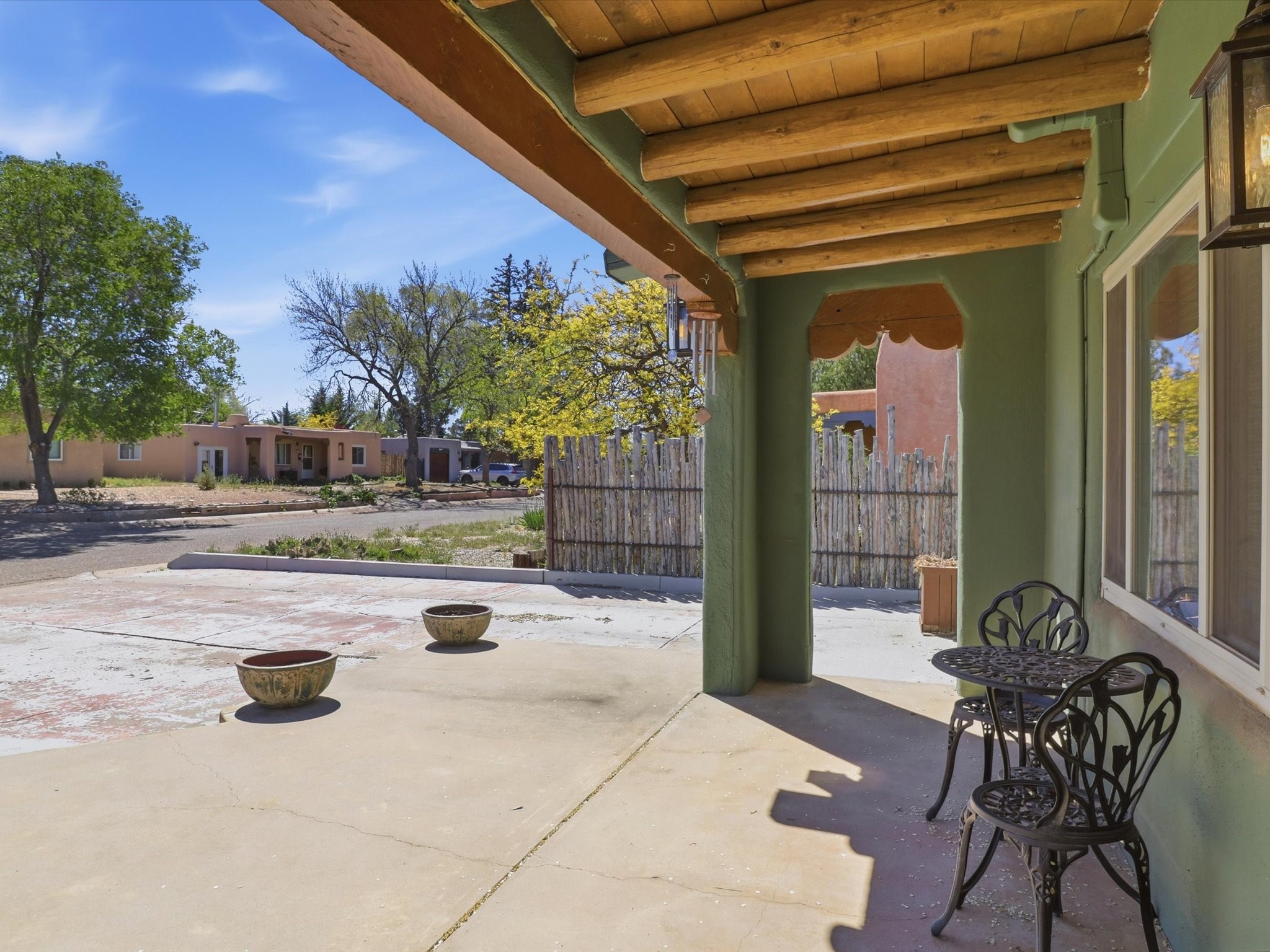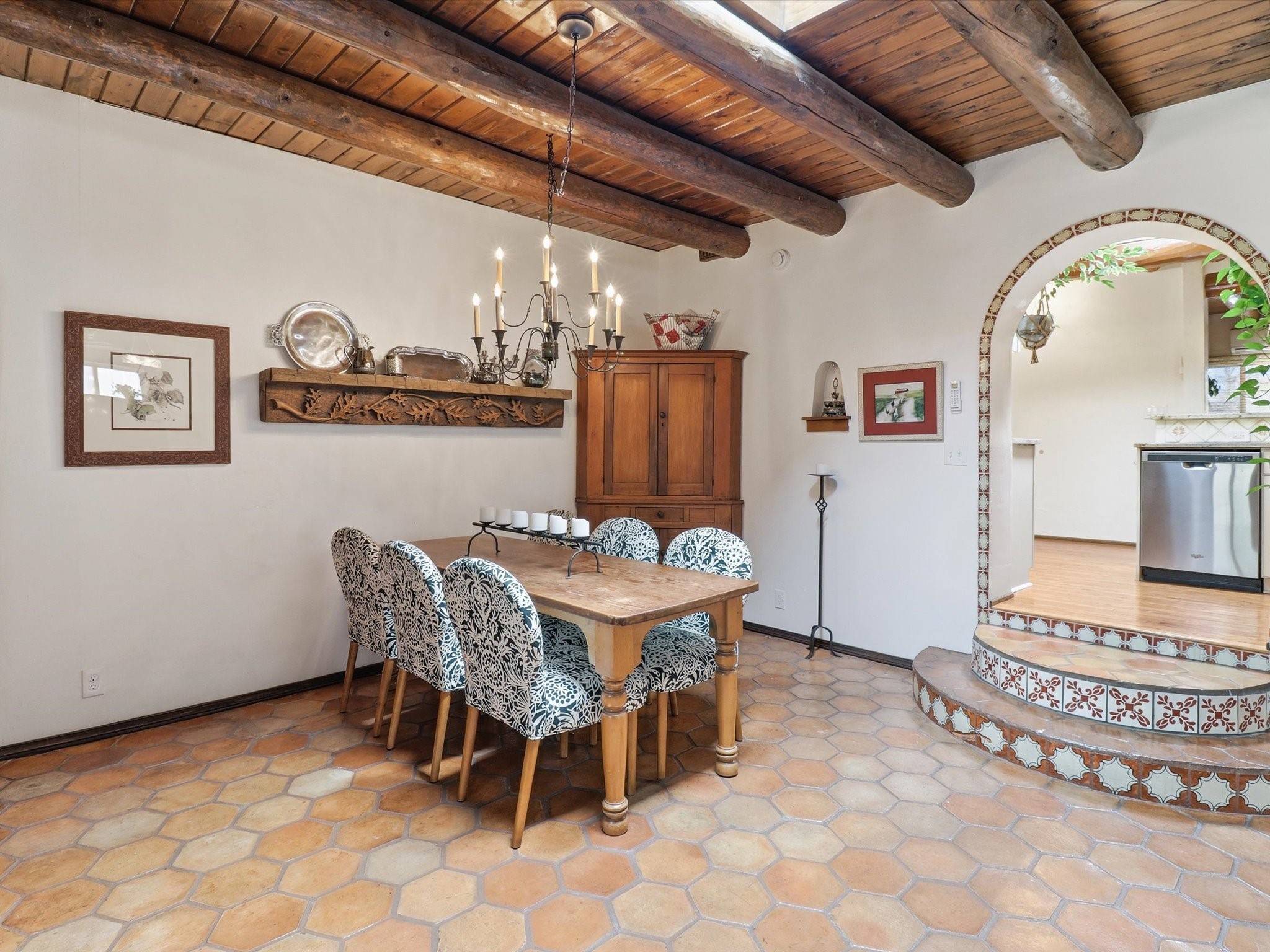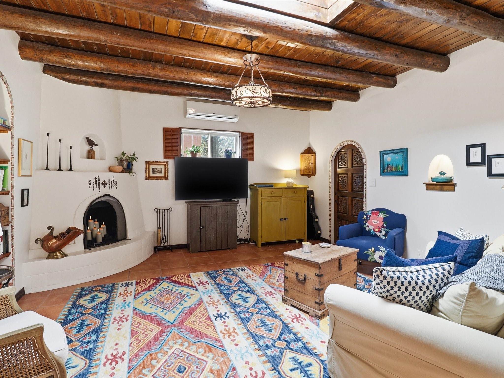 This classic Stamm home is a masterclass in authentic Santa Fe charm, blending historic architectural details with the functional space today's luxury buyers crave. Featuring 4 bedrooms, 3 bathrooms, and a versatile flex room, the residence is defined by traditional vigas that stretch across the ceilings, creating a warm, grounded atmosphere throughout. The interior showcases a rich palette of textures, from original hardwood floors to Saltillo tile and timeless finishes. Distinctive arched doorways accented with Spanish tile lead you through the home, while three wood-burning kiva fireplaces serve as soulful focal points for gathering. Outside, the property transforms into a private desert oasis. The beautifully landscaped grounds are anchored by a covered pergola, perfect for alfresco dining or quiet evenings. Located just minutes from the Santa Fe Rail Trail, this home offers the perfect balance of serene living and active lifestyle access.