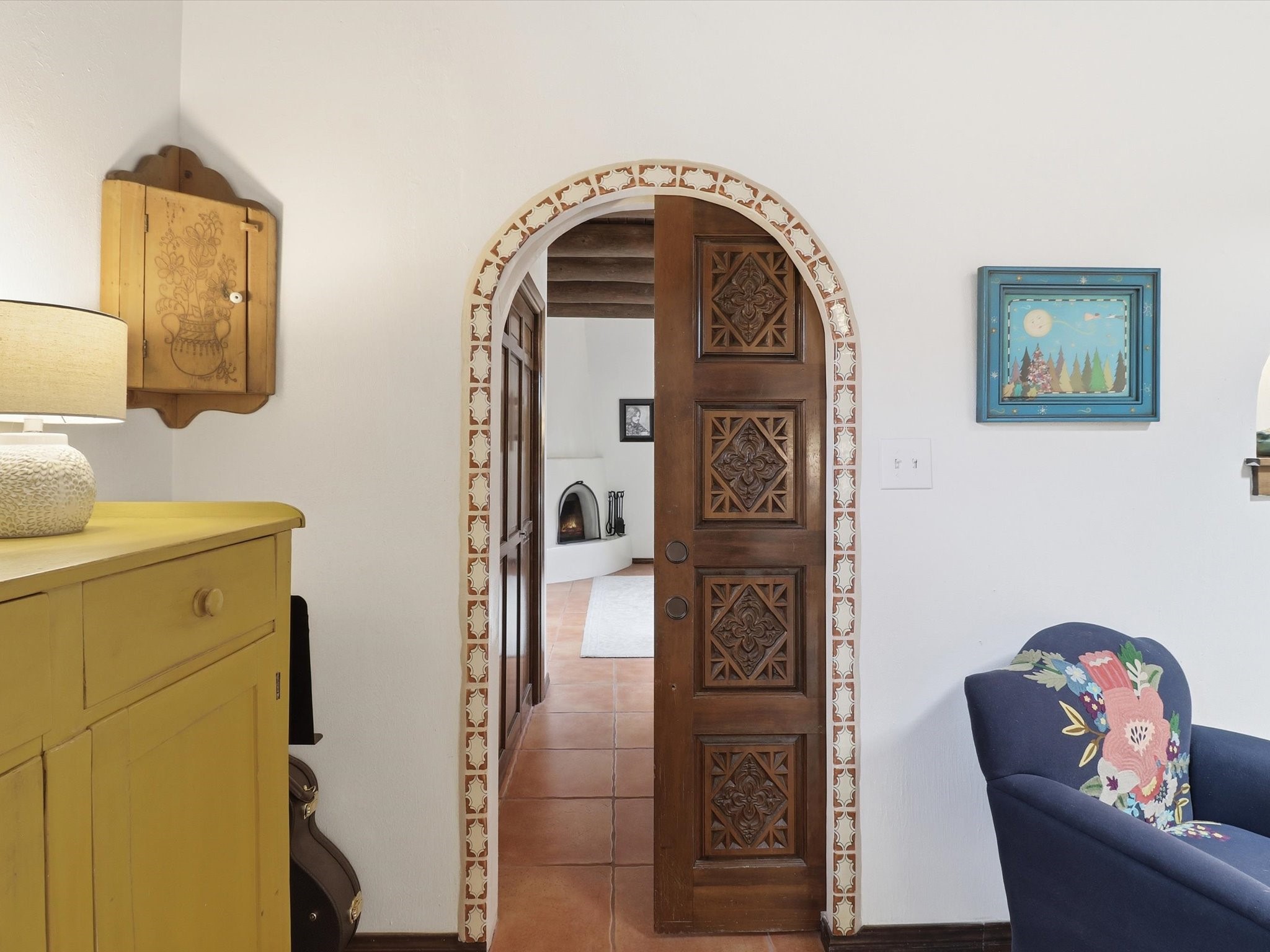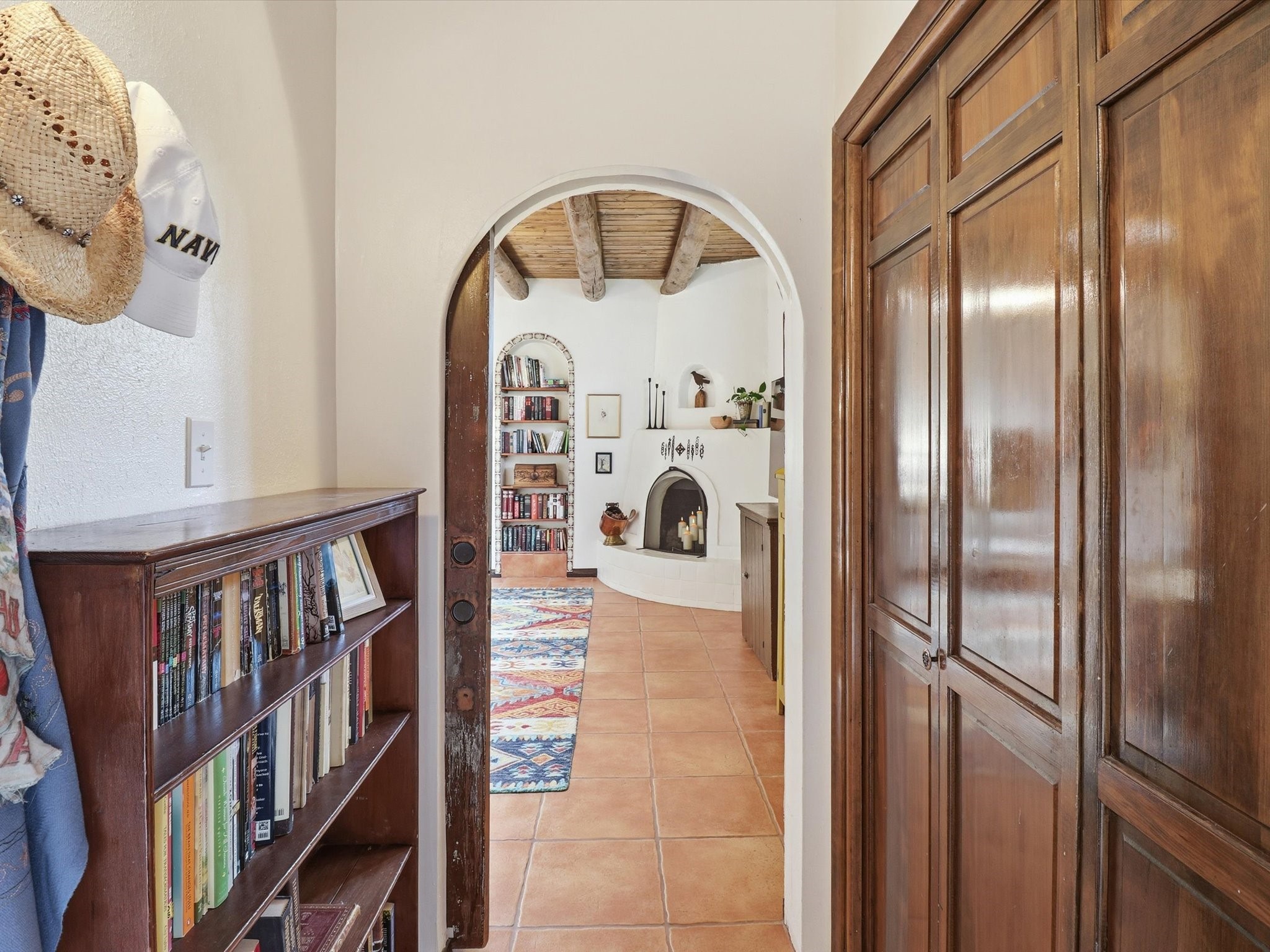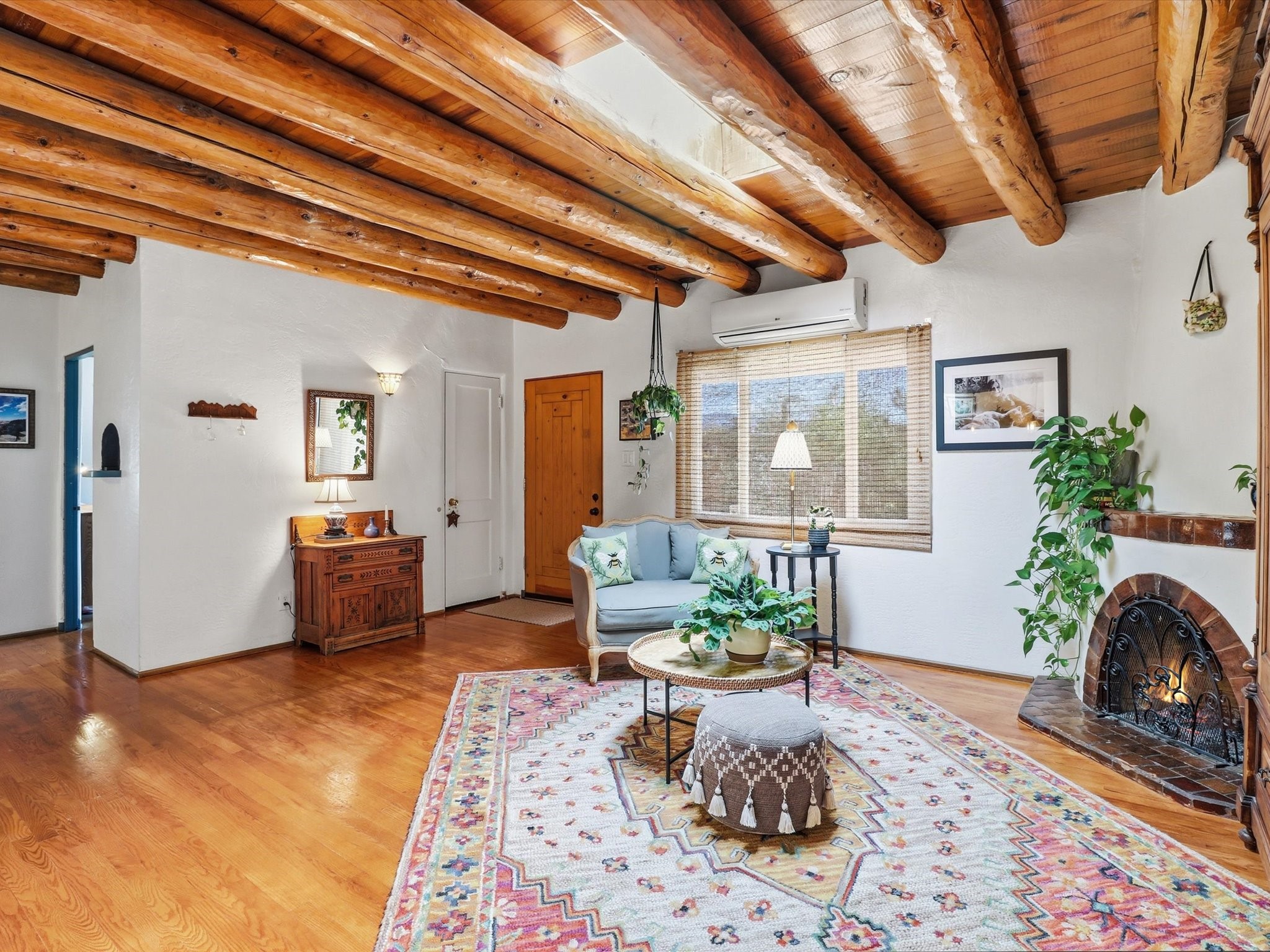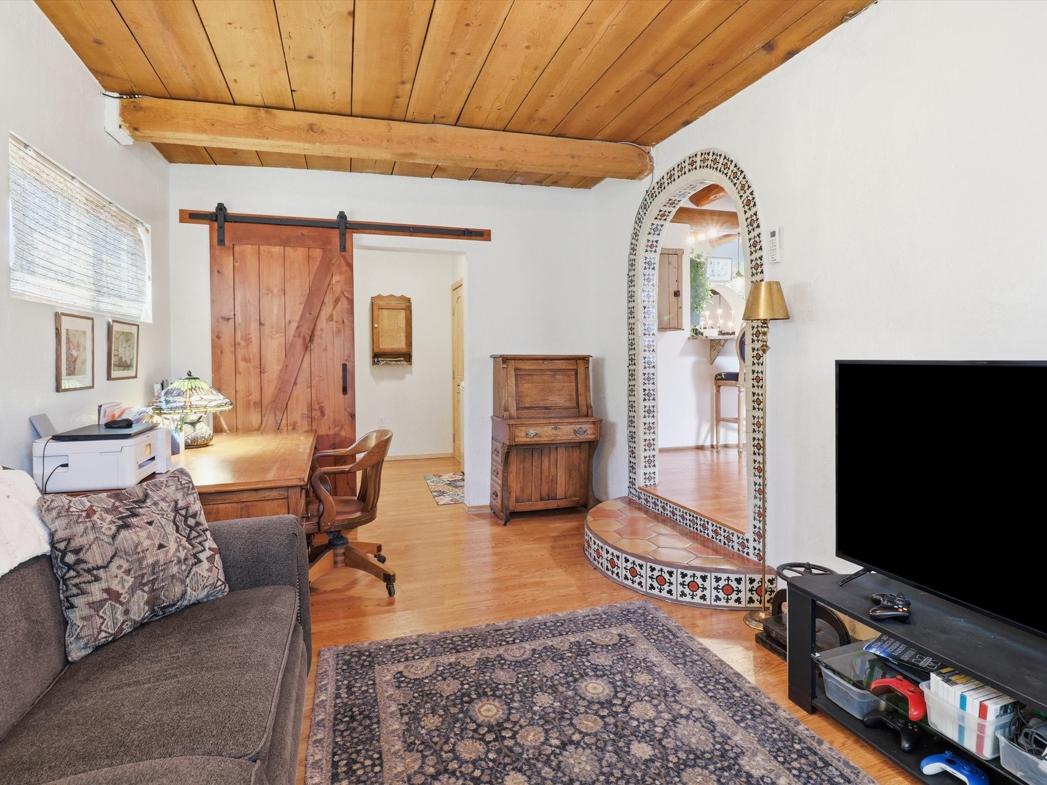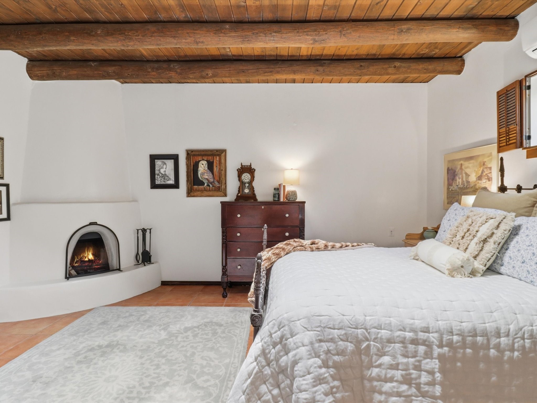 This classic Stamm home is a masterclass in authentic Santa Fe charm, blending historic architectural details with the functional space today's luxury buyers crave. Featuring 4 bedrooms, 3 bathrooms, and a versatile flex room, the residence is defined by traditional vigas that stretch across the ceilings, creating a warm, grounded atmosphere throughout. The interior showcases a rich palette of textures, from original hardwood floors to Saltillo tile and timeless finishes. Distinctive arched doorways accented with Spanish tile lead you through the home, while three wood-burning kiva fireplaces serve as soulful focal points for gathering. Outside, the property transforms into a private desert oasis. The beautifully landscaped grounds are anchored by a covered pergola, perfect for alfresco dining or quiet evenings. Located just minutes from the Santa Fe Rail Trail, this home offers the perfect balance of serene living and active lifestyle access.