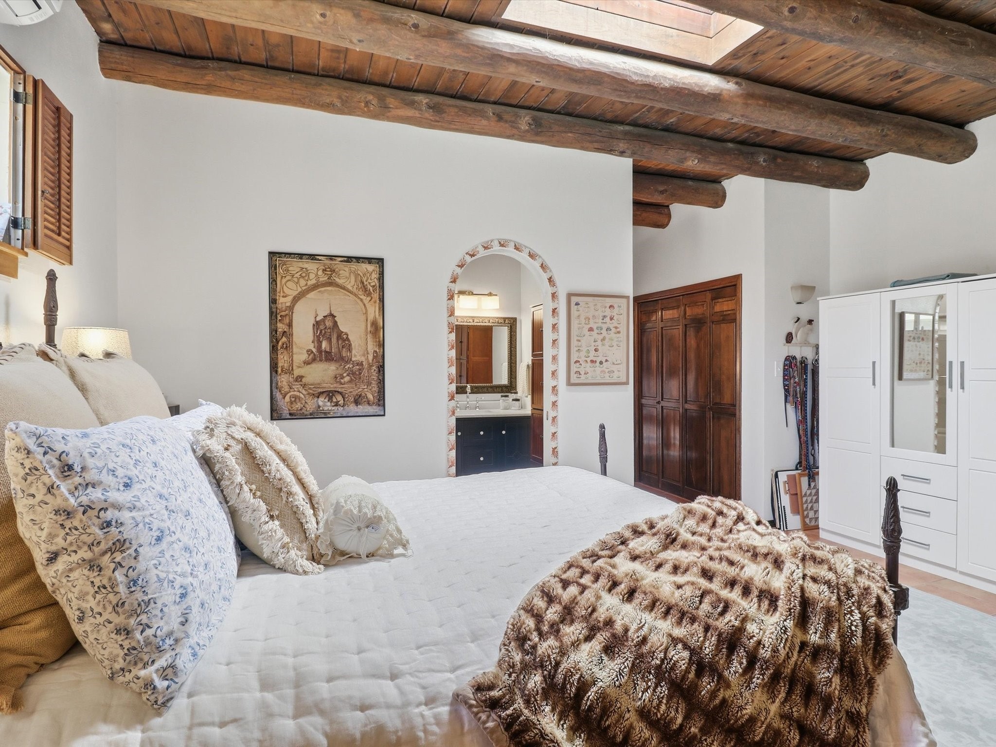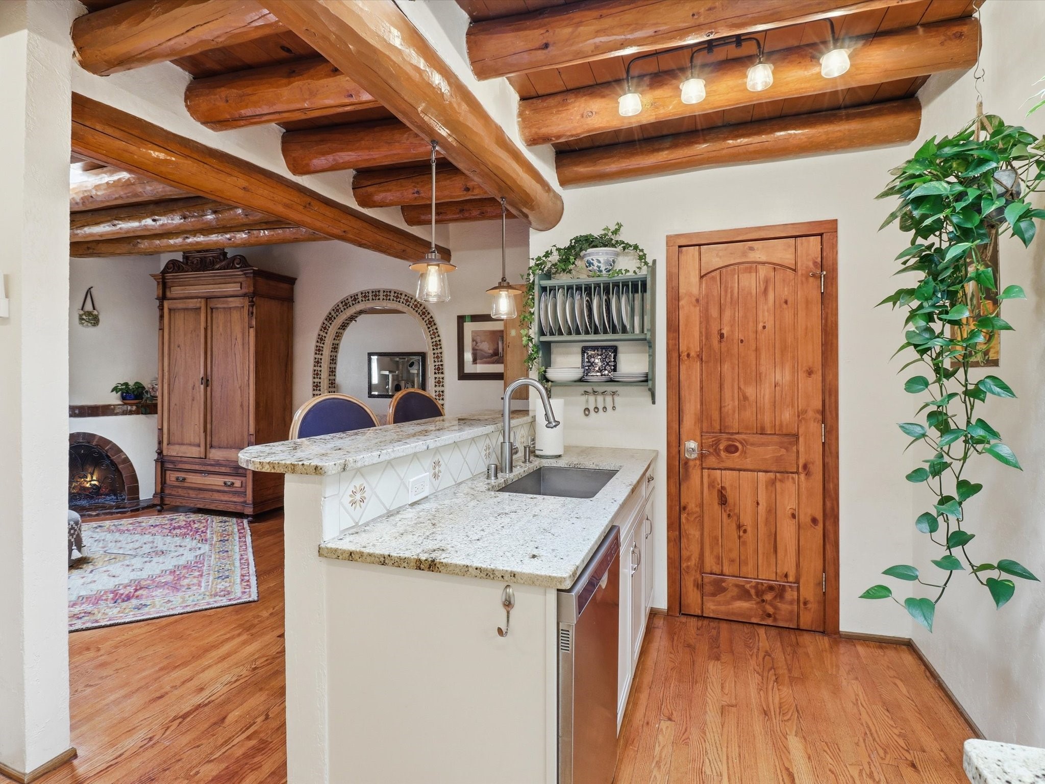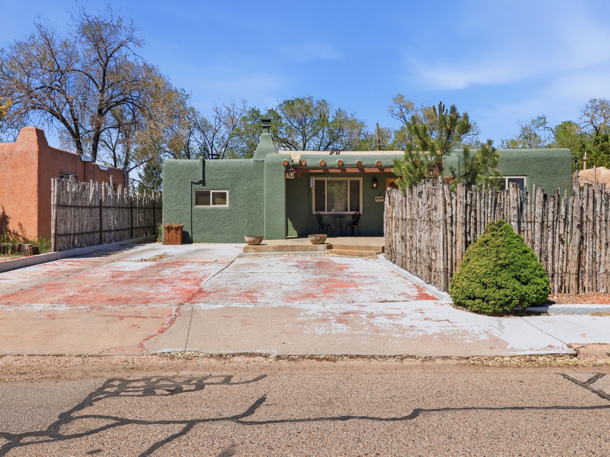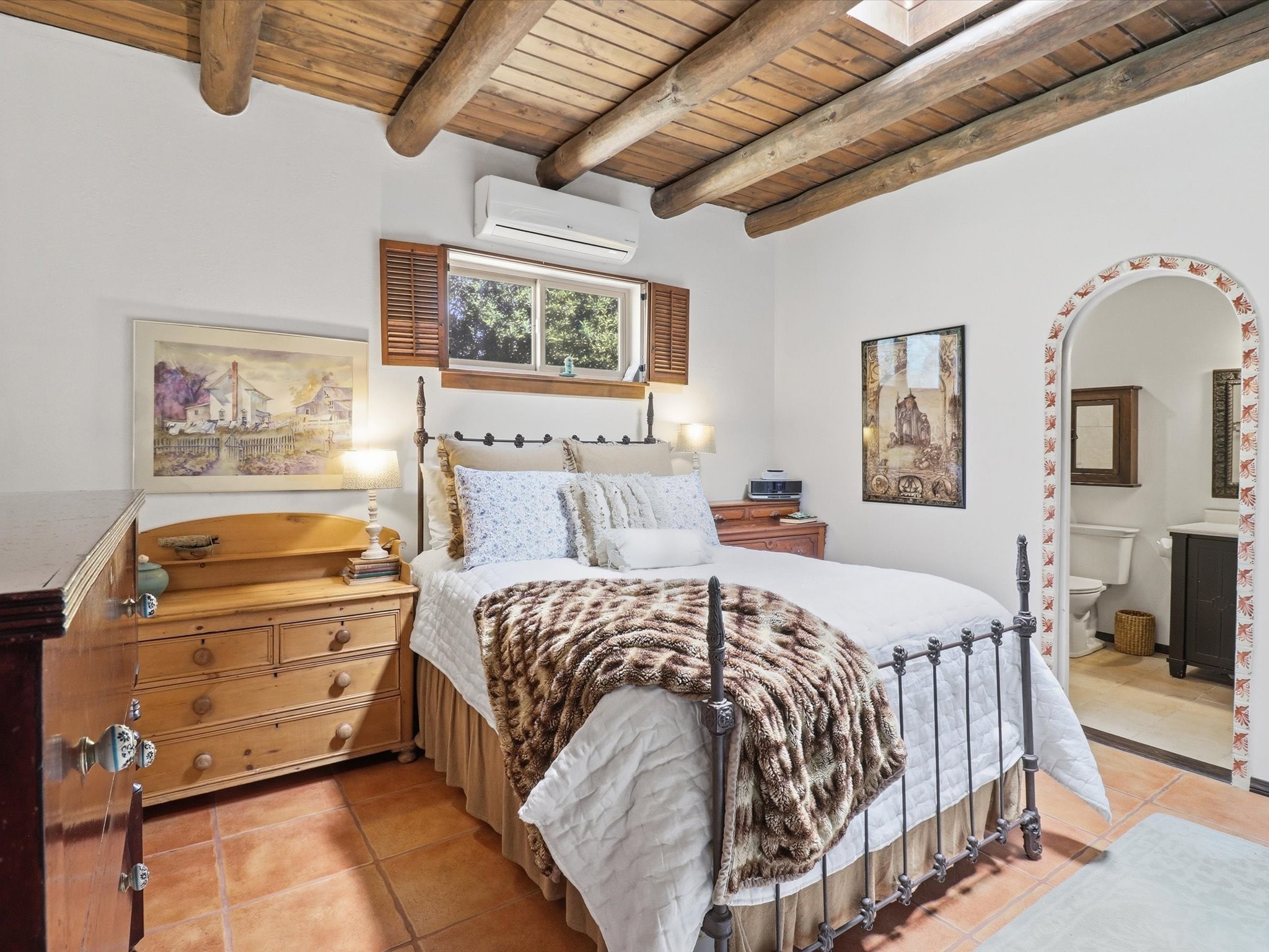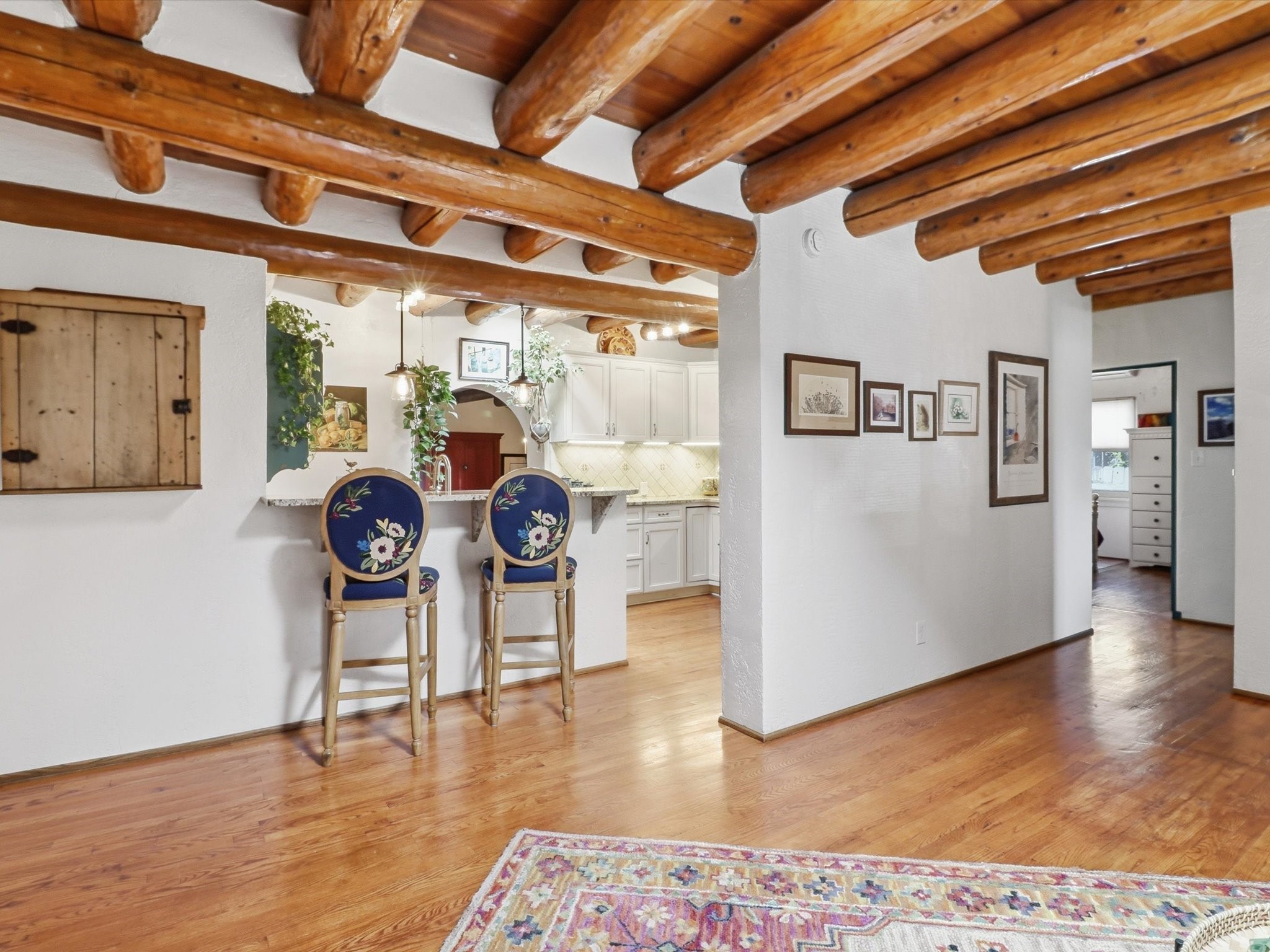 This classic Stamm home is a masterclass in authentic Santa Fe charm, blending historic architectural details with the functional space today's luxury buyers crave. Featuring 4 bedrooms, 3 bathrooms, and a versatile flex room, the residence is defined by traditional vigas that stretch across the ceilings, creating a warm, grounded atmosphere throughout. The interior showcases a rich palette of textures, from original hardwood floors to Saltillo tile and timeless finishes. Distinctive arched doorways accented with Spanish tile lead you through the home, while three wood-burning kiva fireplaces serve as soulful focal points for gathering. Outside, the property transforms into a private desert oasis. The beautifully landscaped grounds are anchored by a covered pergola, perfect for alfresco dining or quiet evenings. Located just minutes from the Santa Fe Rail Trail, this home offers the perfect balance of serene living and active lifestyle access.