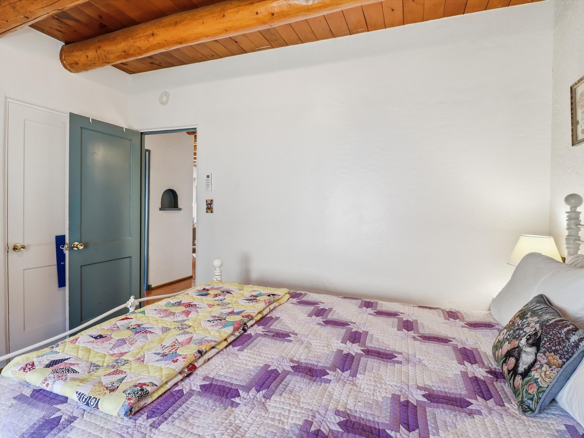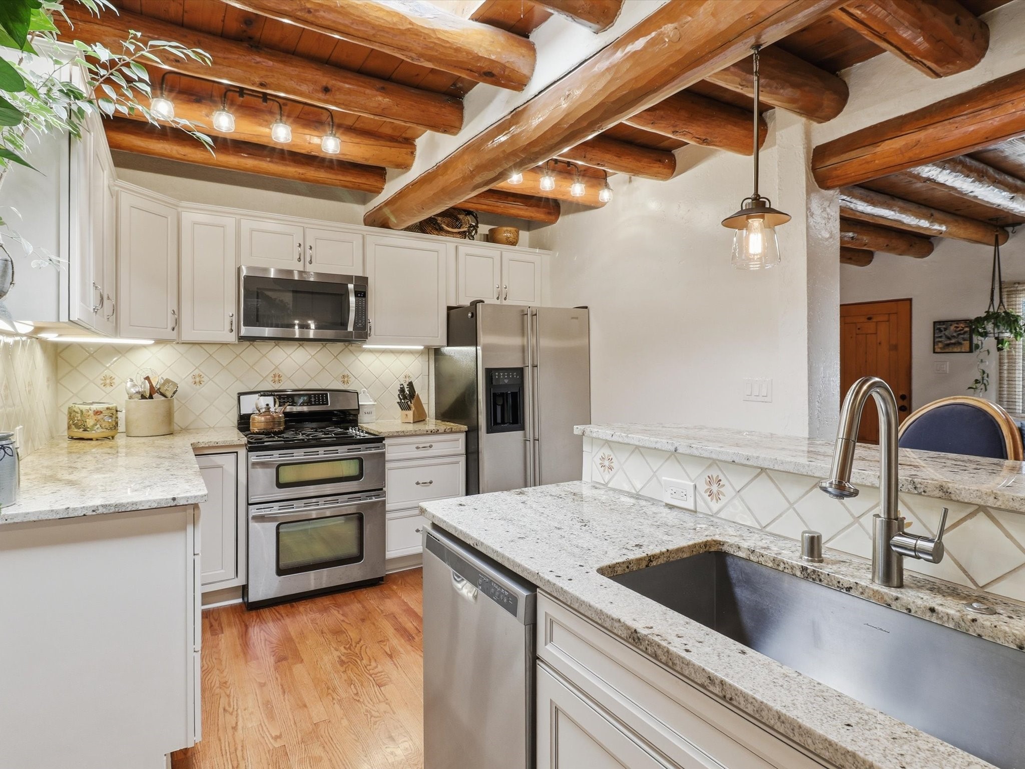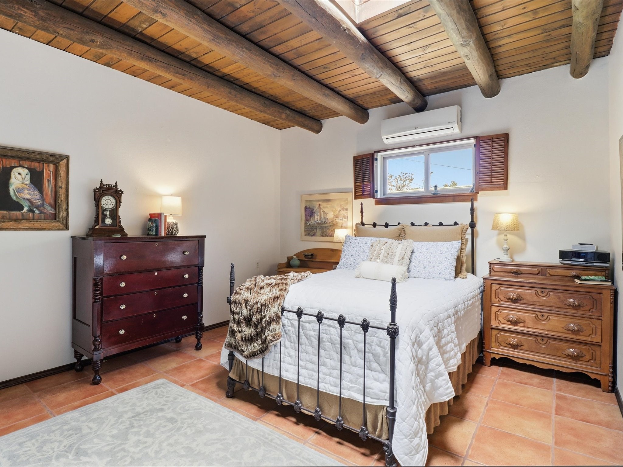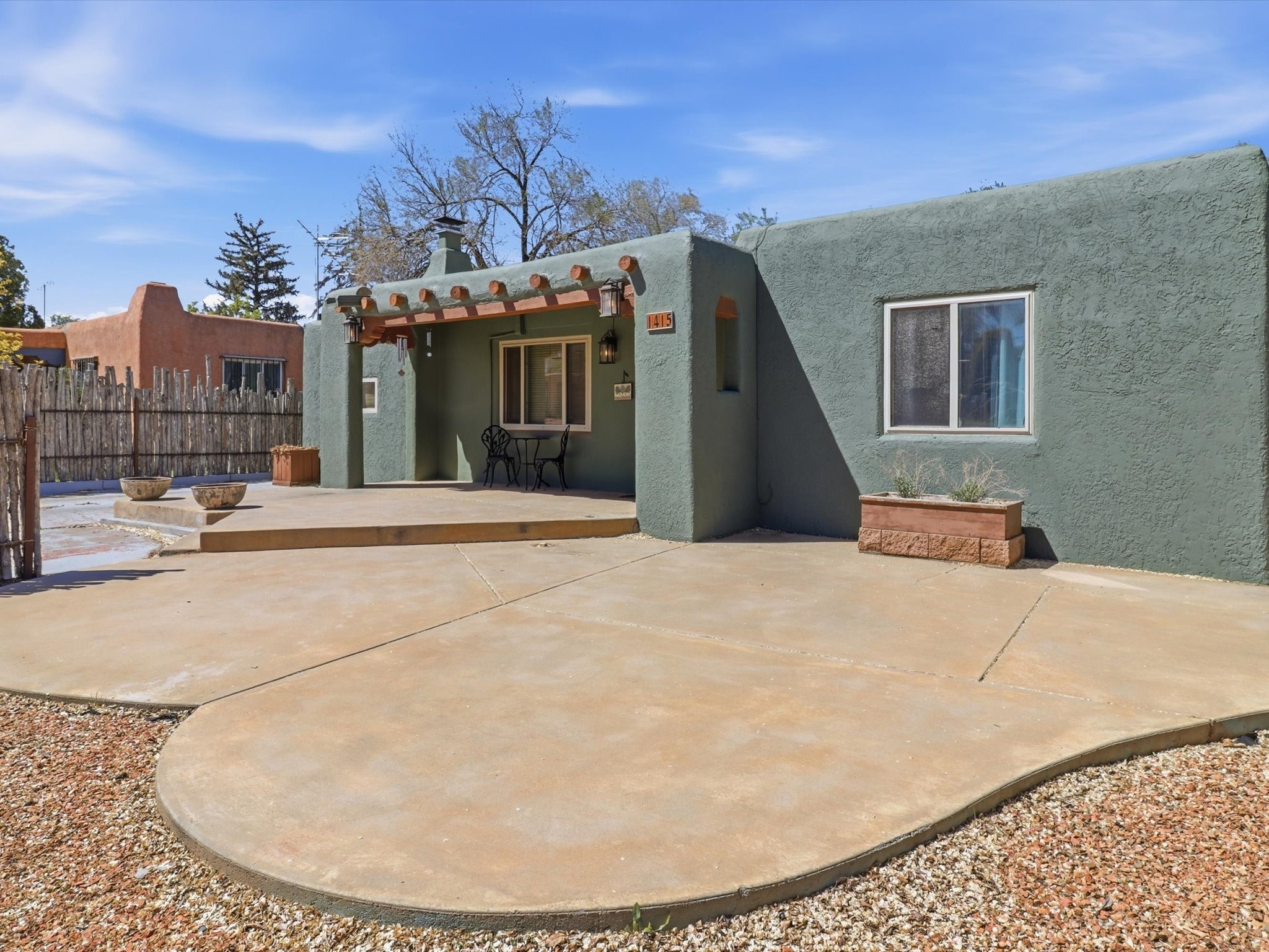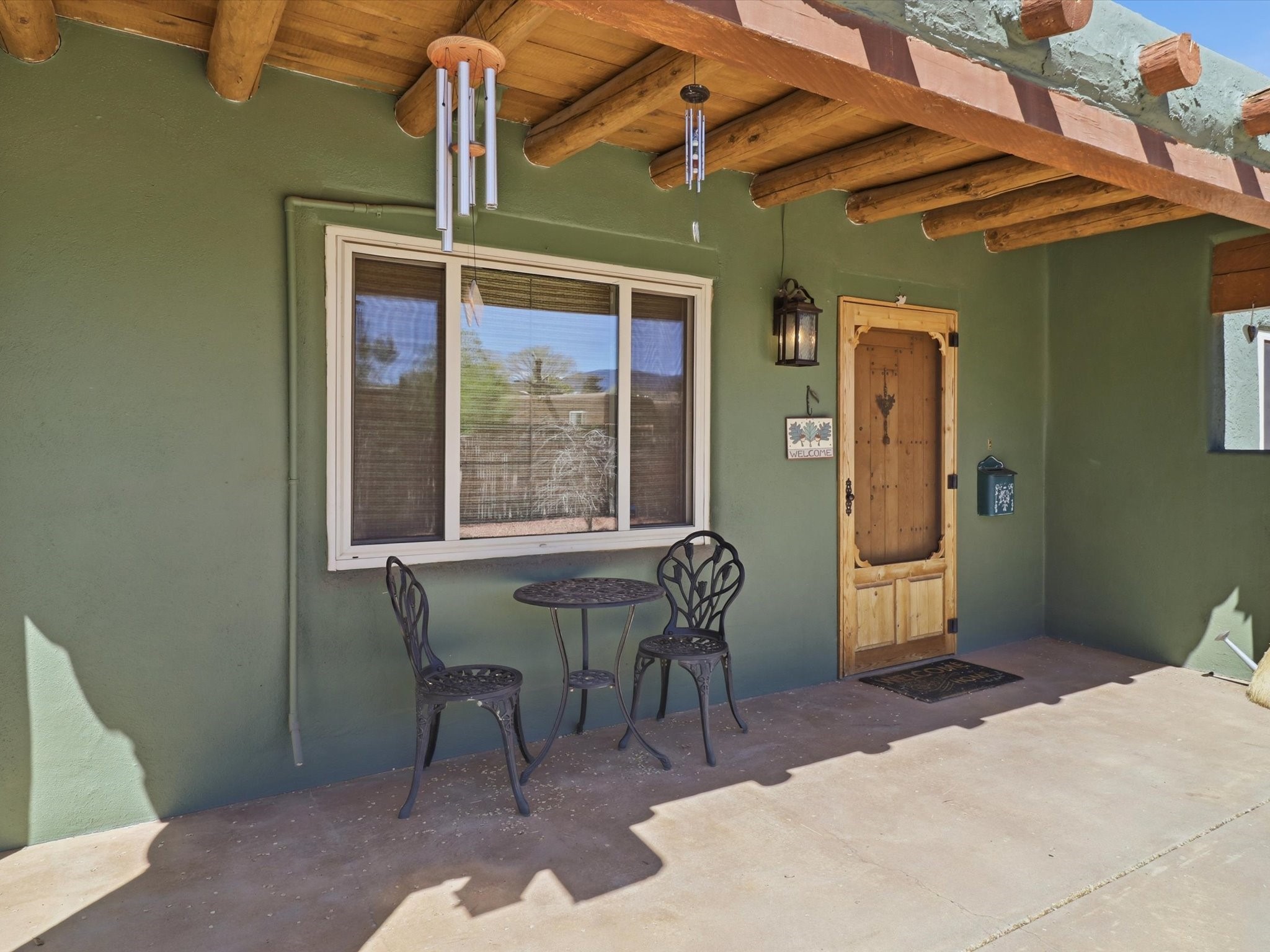 This classic Stamm home is a masterclass in authentic Santa Fe charm, blending historic architectural details with the functional space today's luxury buyers crave. Featuring 4 bedrooms, 3 bathrooms, and a versatile flex room, the residence is defined by traditional vigas that stretch across the ceilings, creating a warm, grounded atmosphere throughout. The interior showcases a rich palette of textures, from original hardwood floors to Saltillo tile and timeless finishes. Distinctive arched doorways accented with Spanish tile lead you through the home, while three wood-burning kiva fireplaces serve as soulful focal points for gathering. Outside, the property transforms into a private desert oasis. The beautifully landscaped grounds are anchored by a covered pergola, perfect for alfresco dining or quiet evenings. Located just minutes from the Santa Fe Rail Trail, this home offers the perfect balance of serene living and active lifestyle access.