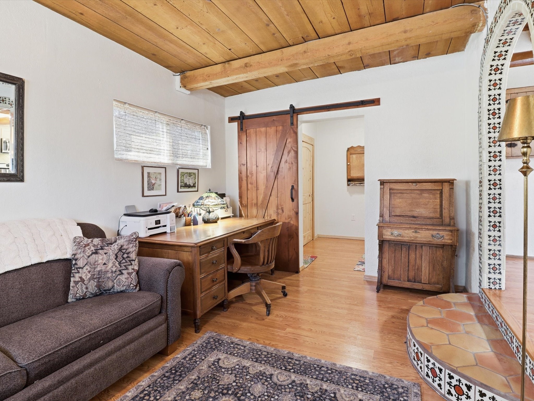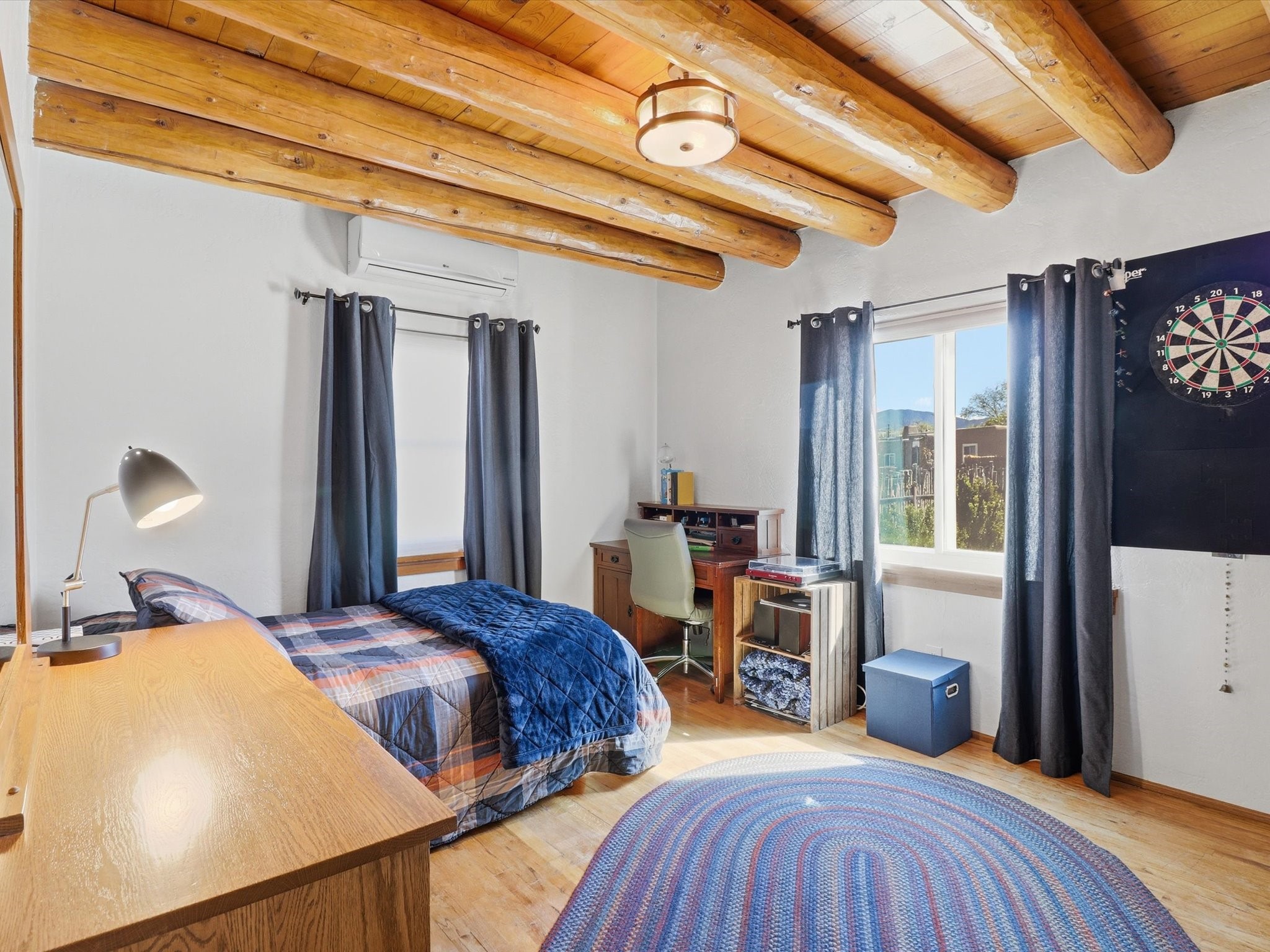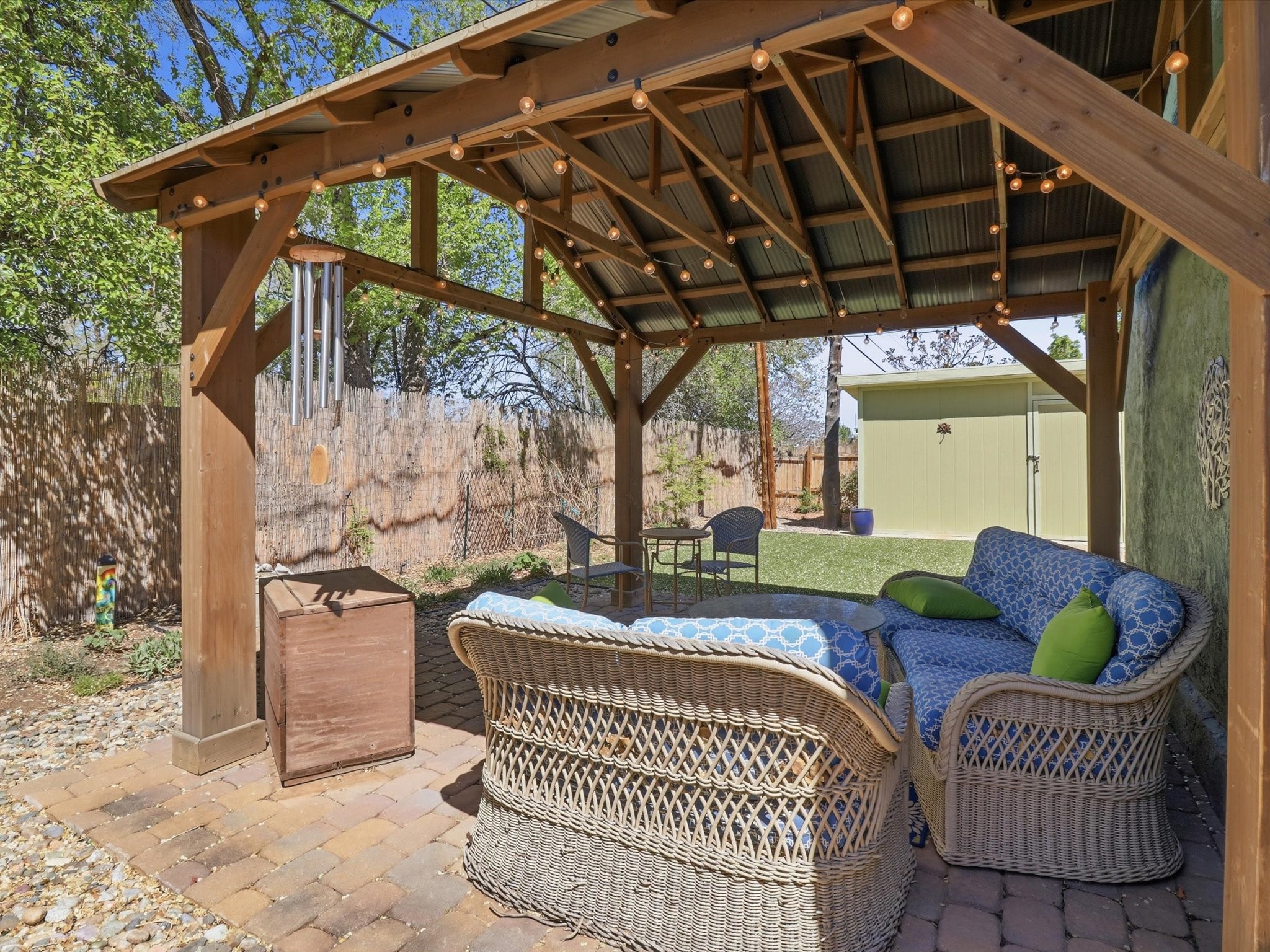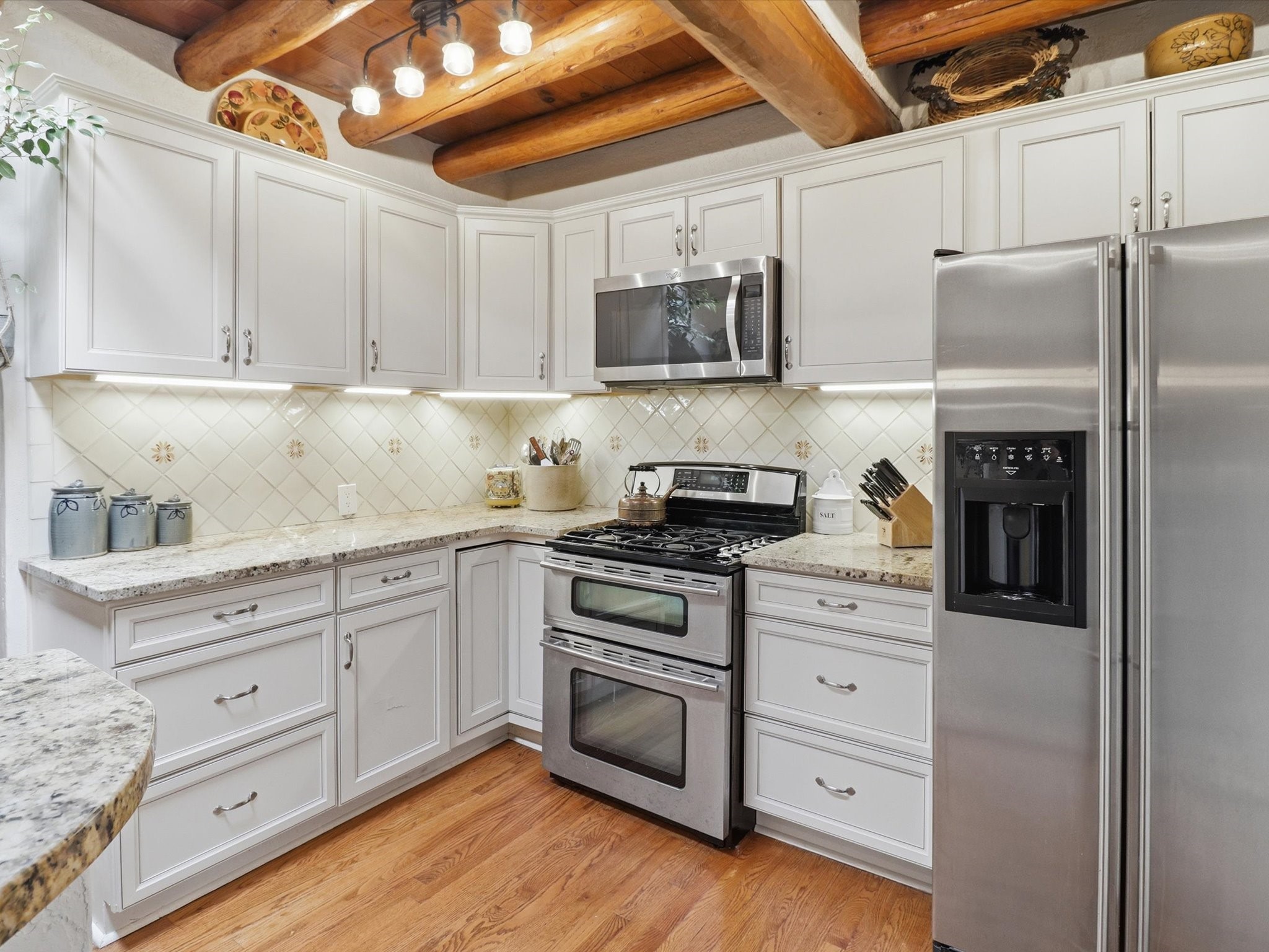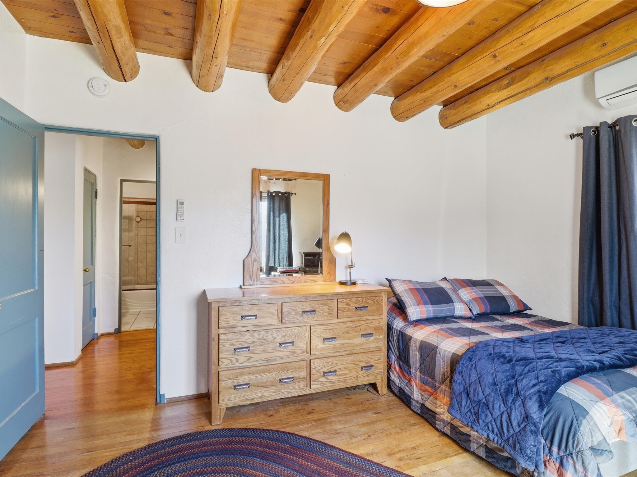 This classic Stamm home is a masterclass in authentic Santa Fe charm, blending historic architectural details with the functional space today's luxury buyers crave. Featuring 4 bedrooms, 3 bathrooms, and a versatile flex room, the residence is defined by traditional vigas that stretch across the ceilings, creating a warm, grounded atmosphere throughout. The interior showcases a rich palette of textures, from original hardwood floors to Saltillo tile and timeless finishes. Distinctive arched doorways accented with Spanish tile lead you through the home, while three wood-burning kiva fireplaces serve as soulful focal points for gathering. Outside, the property transforms into a private desert oasis. The beautifully landscaped grounds are anchored by a covered pergola, perfect for alfresco dining or quiet evenings. Located just minutes from the Santa Fe Rail Trail, this home offers the perfect balance of serene living and active lifestyle access.