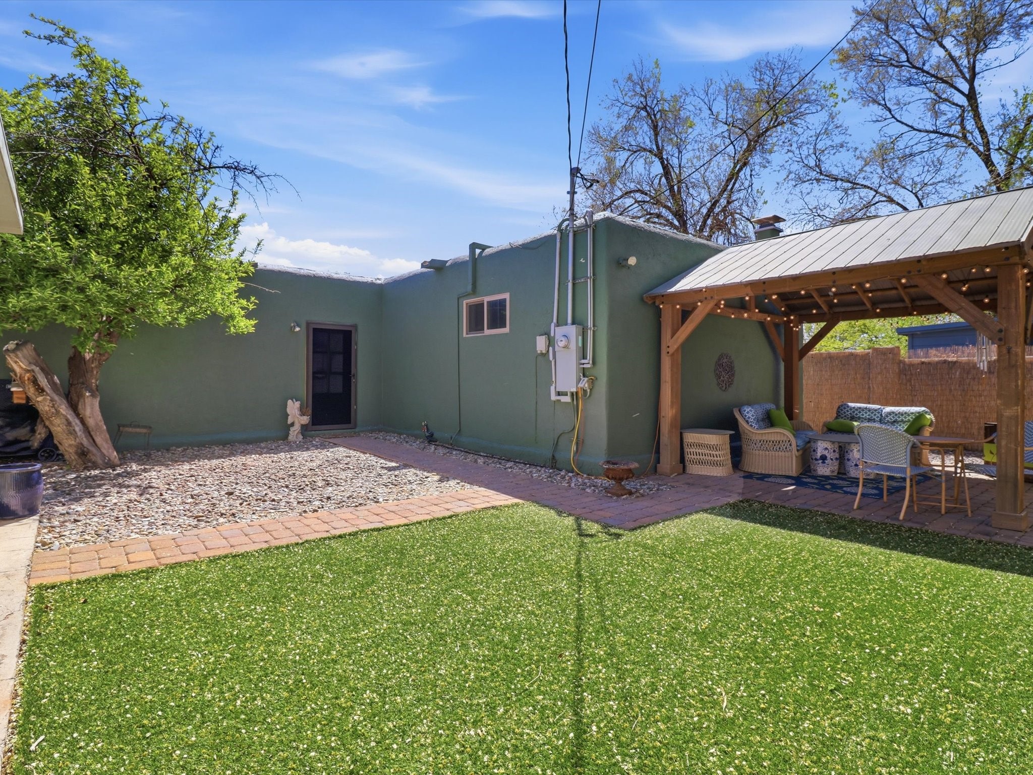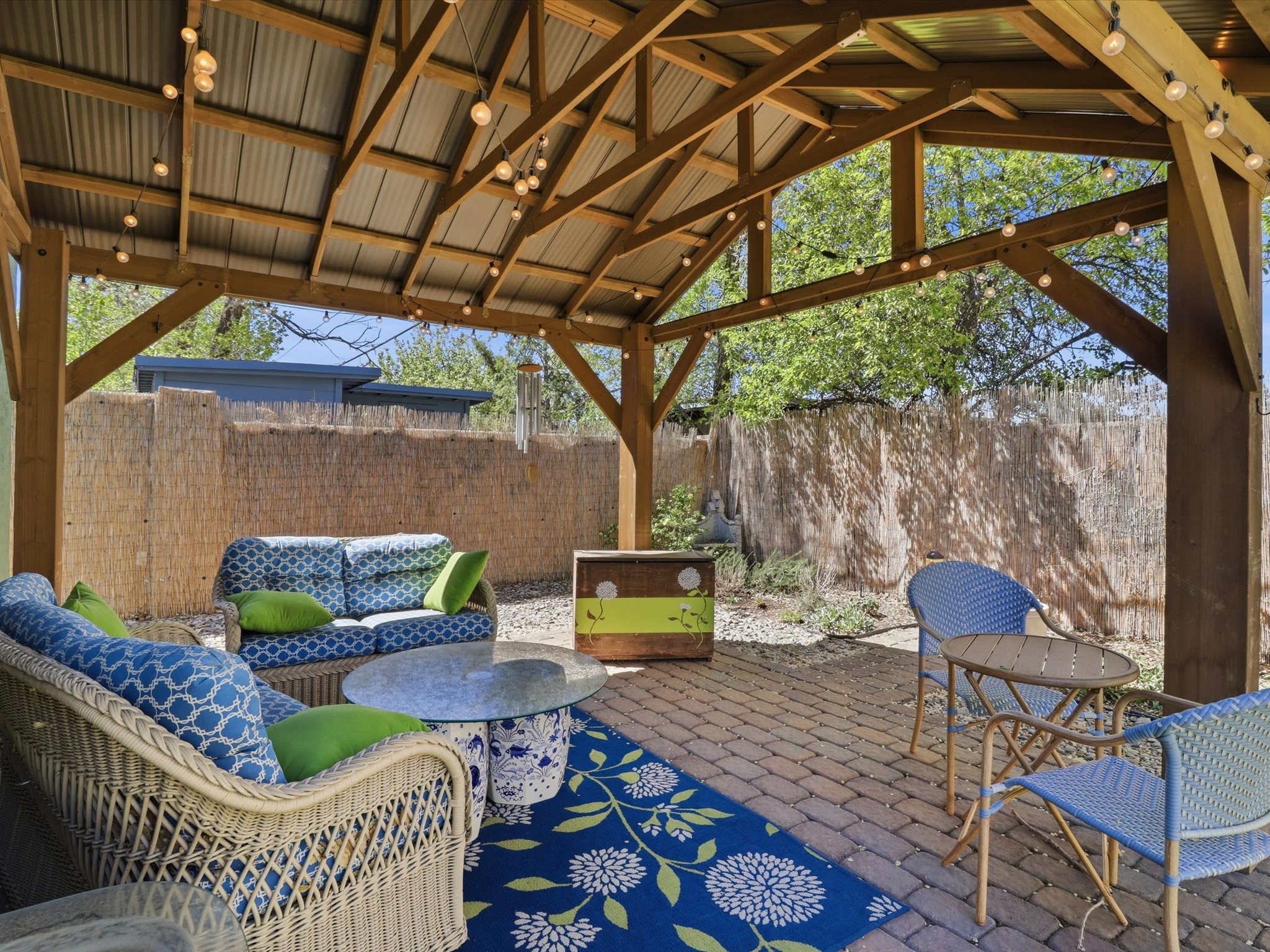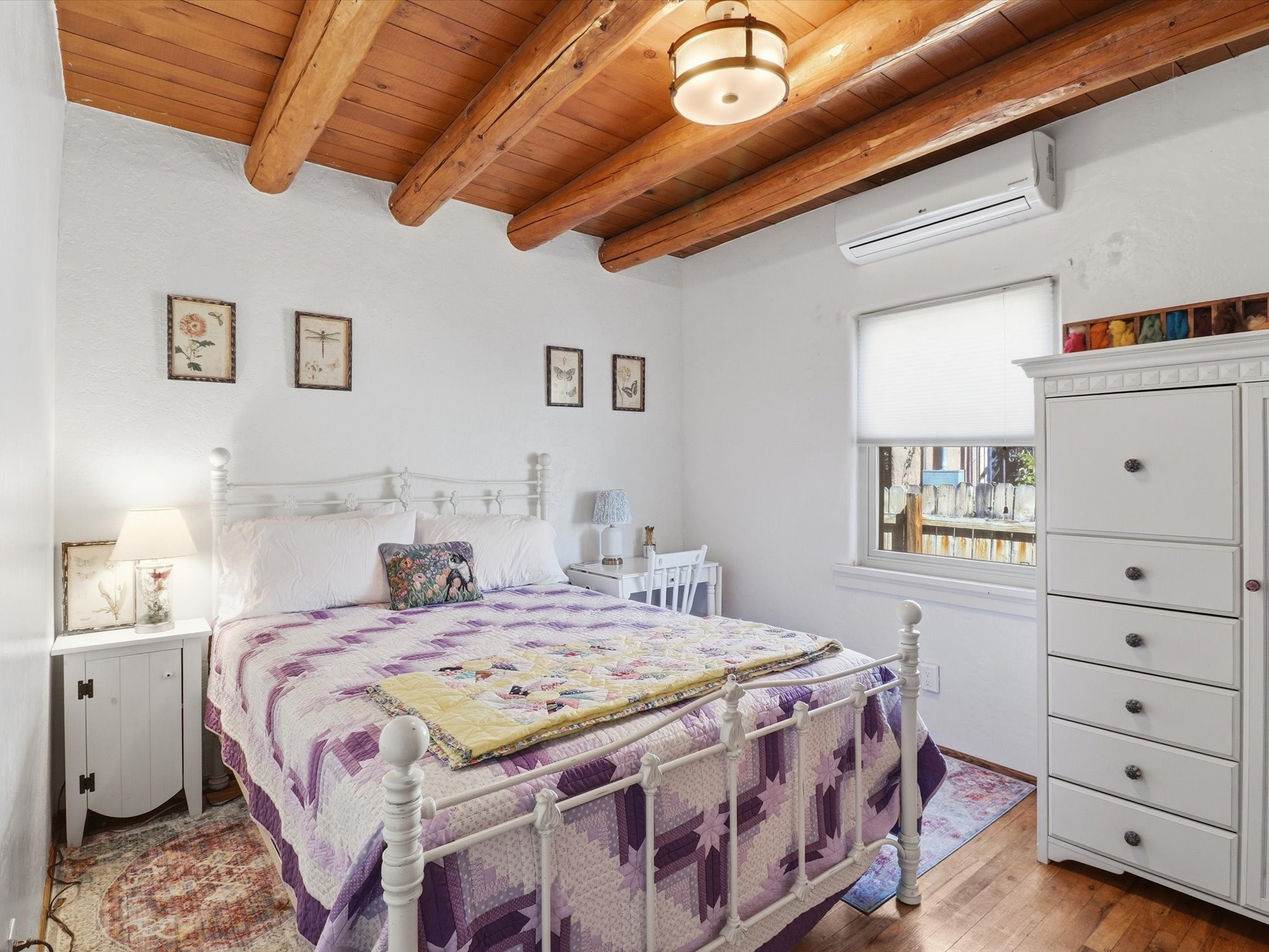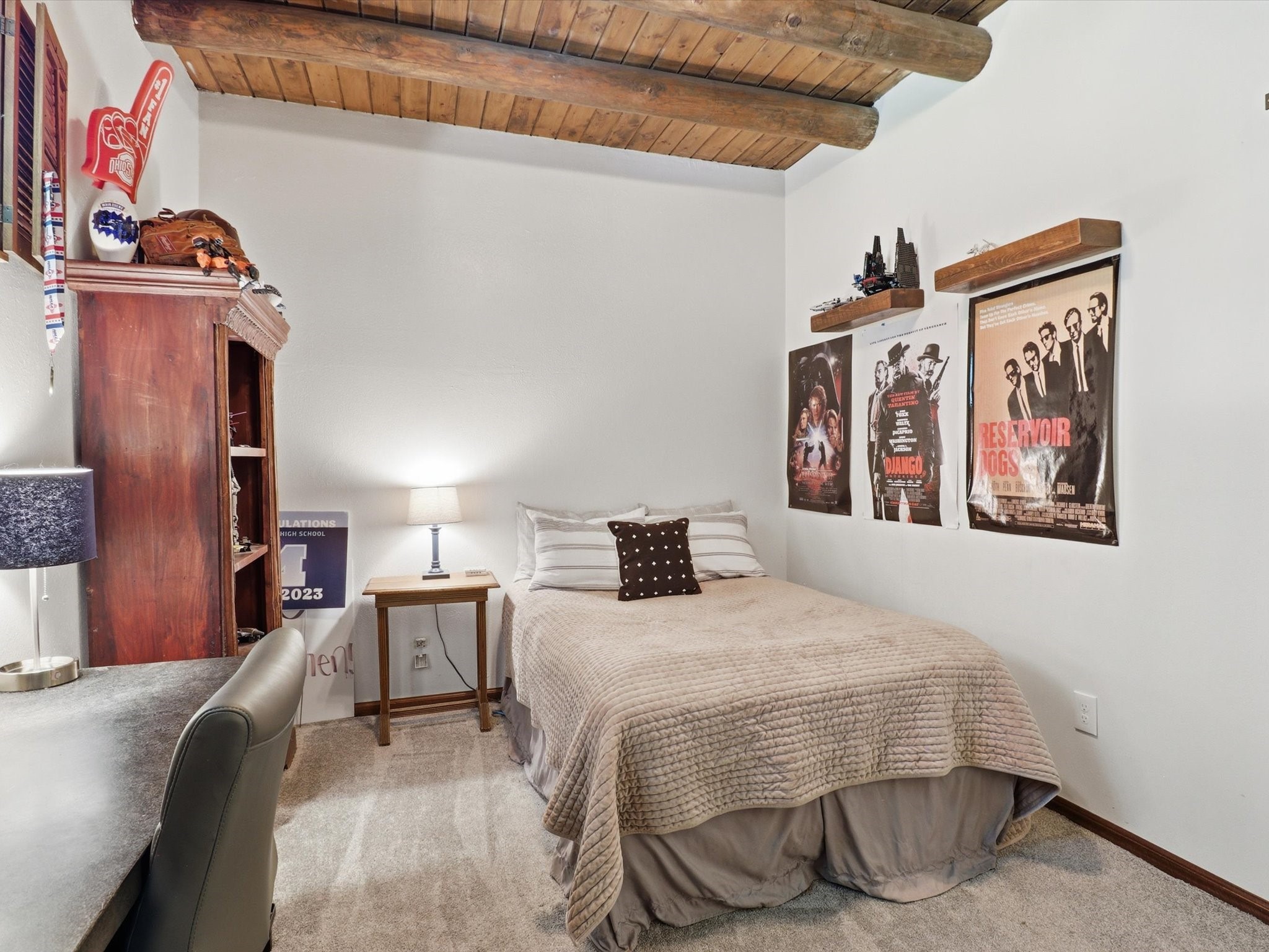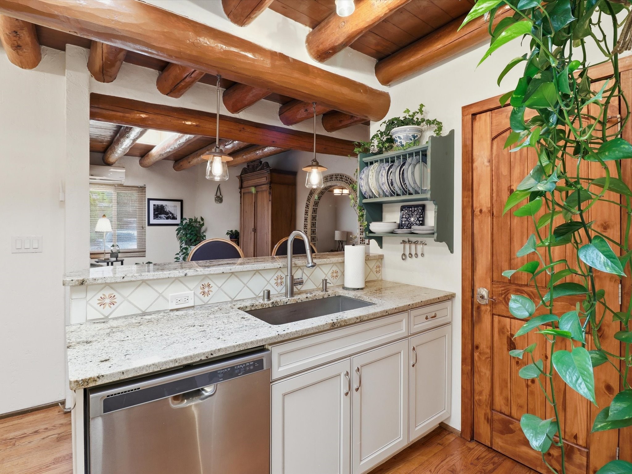 This classic Stamm home is a masterclass in authentic Santa Fe charm, blending historic architectural details with the functional space today's luxury buyers crave. Featuring 4 bedrooms, 3 bathrooms, and a versatile flex room, the residence is defined by traditional vigas that stretch across the ceilings, creating a warm, grounded atmosphere throughout. The interior showcases a rich palette of textures, from original hardwood floors to Saltillo tile and timeless finishes. Distinctive arched doorways accented with Spanish tile lead you through the home, while three wood-burning kiva fireplaces serve as soulful focal points for gathering. Outside, the property transforms into a private desert oasis. The beautifully landscaped grounds are anchored by a covered pergola, perfect for alfresco dining or quiet evenings. Located just minutes from the Santa Fe Rail Trail, this home offers the perfect balance of serene living and active lifestyle access.
